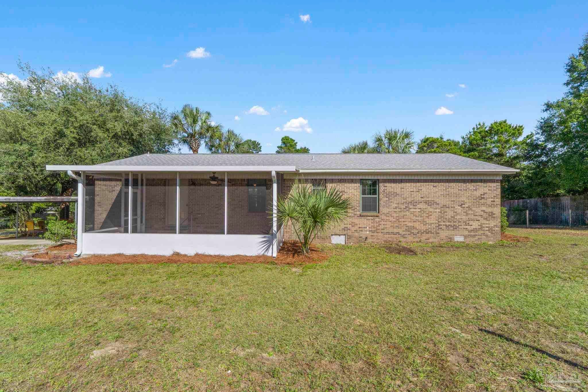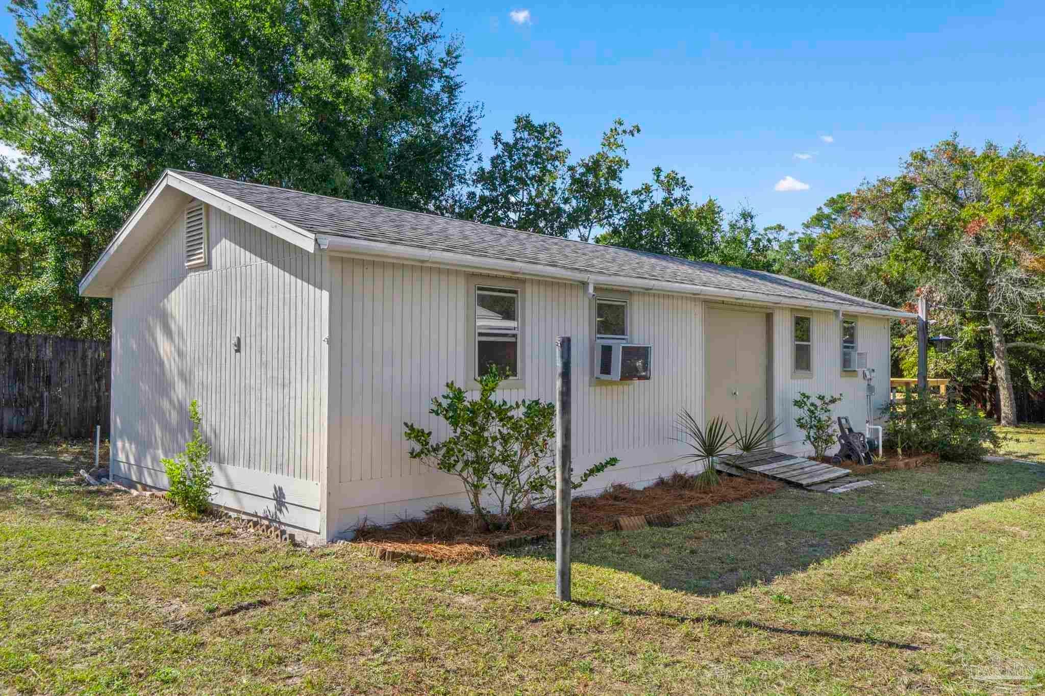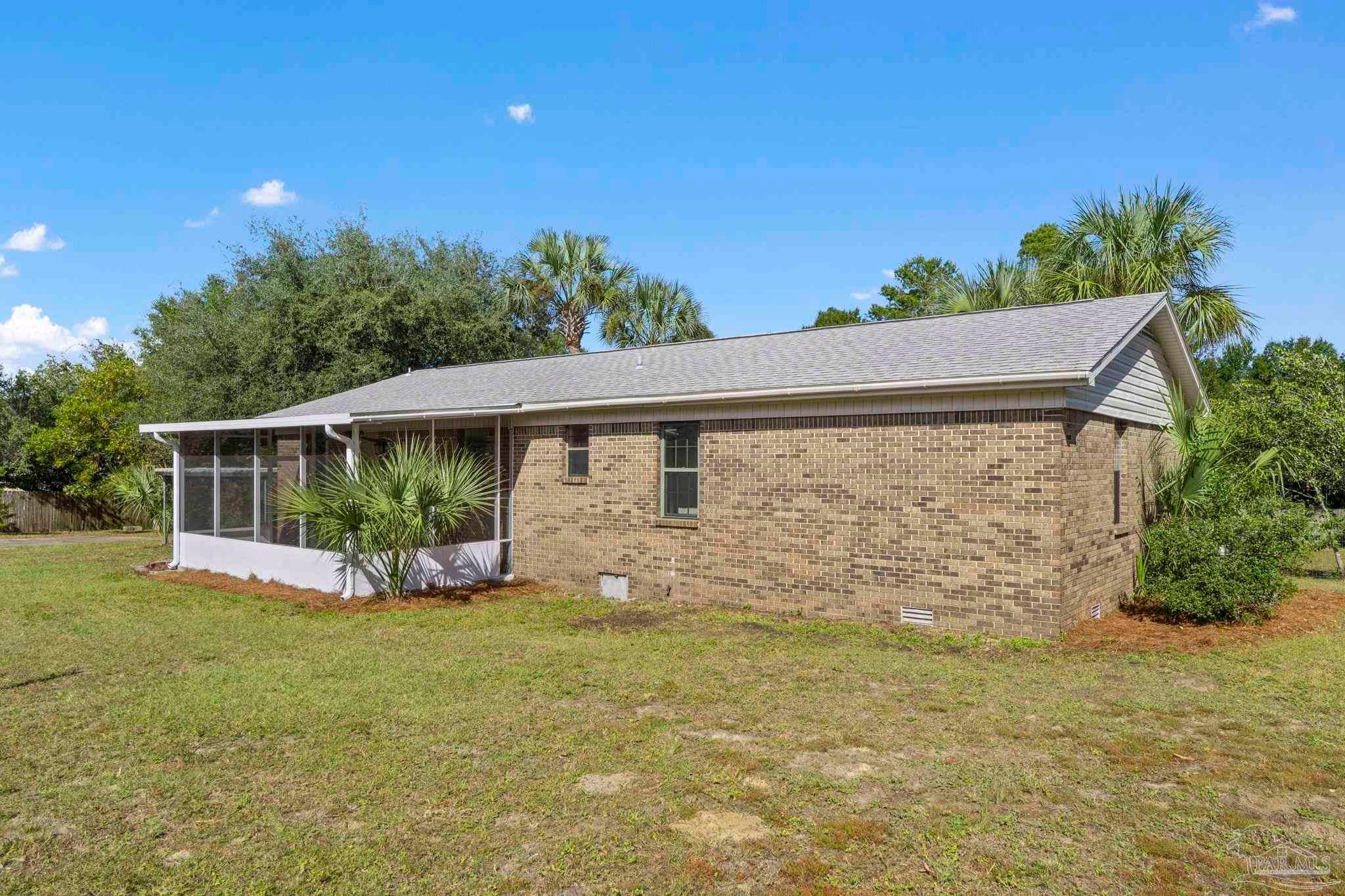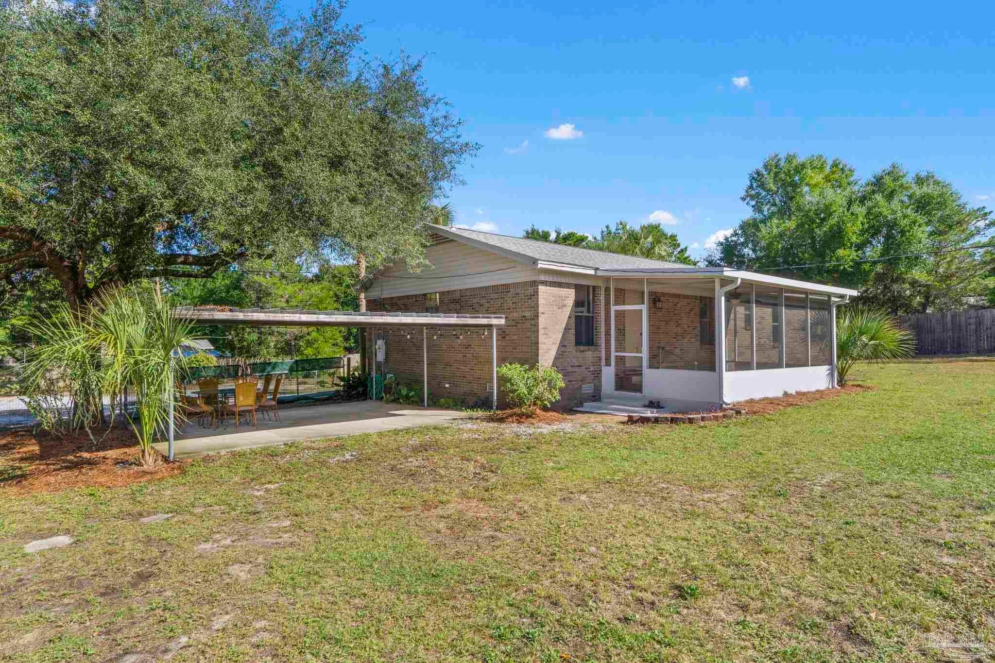 Set on nearly an acre (0.997), this all-brick, 3-bedroom, 2-bath CUL-DE-SAC home with a RECENT ROOF (AUG 2022) and NEW WATER HEATER, offers the rare blend of move-in comfort, PRIVATE, outdoor breathing room, and a HUGE, climate-controlled workshop! Thoughtfully designed across approximately 1,540 square feet, the layout lives large: a generous living room with warm wood floors leads into a refreshed galley kitchen featuring granite counters, subway-tile backsplash, stainless steel appliances, and crisp white cabinetry. The laundry room sits just off the kitchen for everyday convenience. All bedrooms are well-proportioned, and one includes custom Murphy cabinetry that instantly converts from an office to a guest space without sacrificing square footage. Both baths are updated, one with a sleek subway-tile tub/shower and the other with a walk-in shower and modern vanity. Outdoor living expands the experience. Begin mornings on the tiled screened porch, host shaded gatherings beneath the covered patio/carport, or put the expansive fenced backyard to work—garden, play, or plan future amenities with room to spare. A newer front deck adds inviting curb appeal and an extra place to unwind. The standout feature? A 52' x 16' detached building with power and window A/C—unfinished, bright, and versatile—ready to become a workshop, studio, gym, storage hub, or creative retreat. Centrally located between Gulf Breeze and Navarre with quick routes to the Gulf Islands National Seashore, downtown Pensacola, and the Garcon Point Bridge, this property delivers easy coastal access without sacrificing privacy. If you’ve been waiting for elbow room, flexibility, and a real workshop that’s more than an afterthought—this is the one.