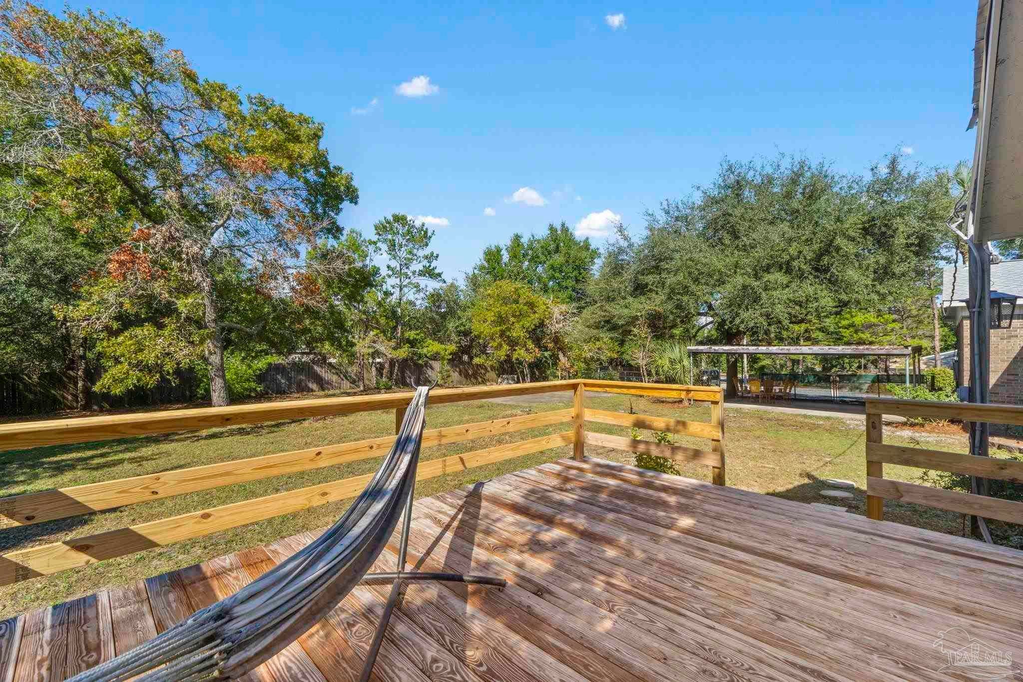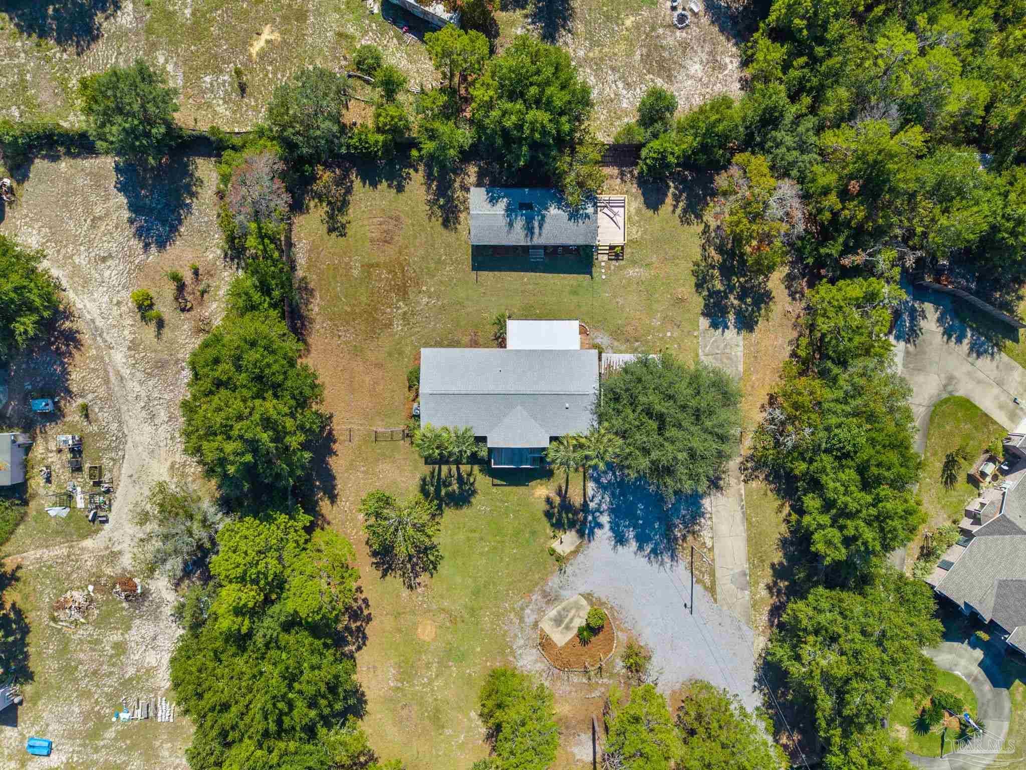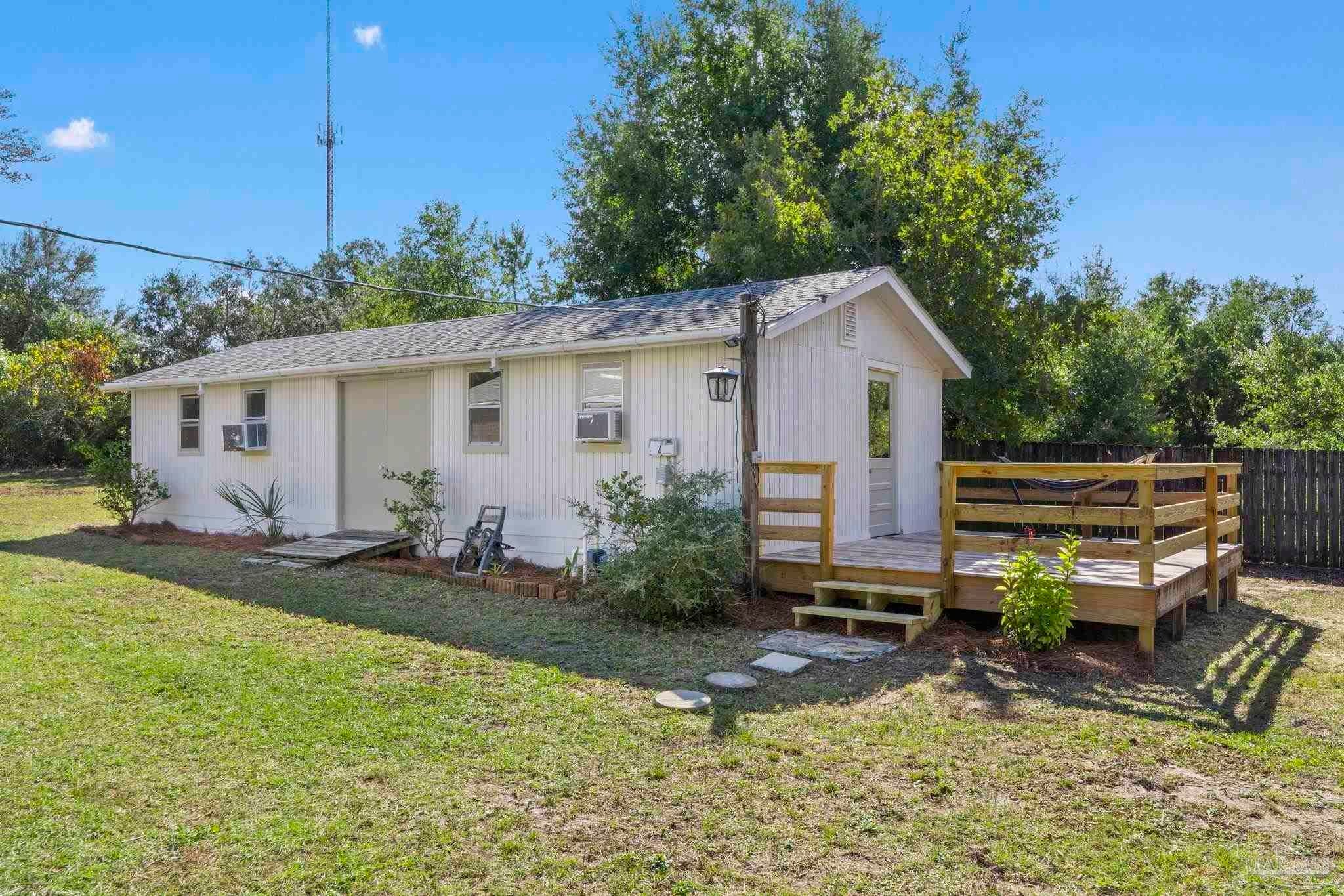 Set on nearly an acre (0.997), this all-brick, 3-bedroom, 2-bath CUL-DE-SAC home with a RECENT ROOF (AUG 2022) and NEW WATER HEATER, offers the rare blend of move-in comfort, PRIVATE, outdoor breathing room, and a HUGE, climate-controlled workshop! Thoughtfully designed across approximately 1,540 square feet, the layout lives large: a generous living room with warm wood floors leads into a refreshed galley kitchen featuring granite counters, subway-tile backsplash, stainless steel appliances, and crisp white cabinetry. The laundry room sits just off the kitchen for everyday convenience. All bedrooms are well-proportioned, and one includes custom Murphy cabinetry that instantly converts from an office to a guest space without sacrificing square footage. Both baths are updated, one with a sleek subway-tile tub/shower and the other with a walk-in shower and modern vanity. Outdoor living expands the experience. Begin mornings on the tiled screened porch, host shaded gatherings beneath the covered patio/carport, or put the expansive fenced backyard to work—garden, play, or plan future amenities with room to spare. A newer front deck adds inviting curb appeal and an extra place to unwind. The standout feature? A 52' x 16' detached building with power and window A/C—unfinished, bright, and versatile—ready to become a workshop, studio, gym, storage hub, or creative retreat. Centrally located between Gulf Breeze and Navarre with quick routes to the Gulf Islands National Seashore, downtown Pensacola, and the Garcon Point Bridge, this property delivers easy coastal access without sacrificing privacy. If you’ve been waiting for elbow room, flexibility, and a real workshop that’s more than an afterthought—this is the one.