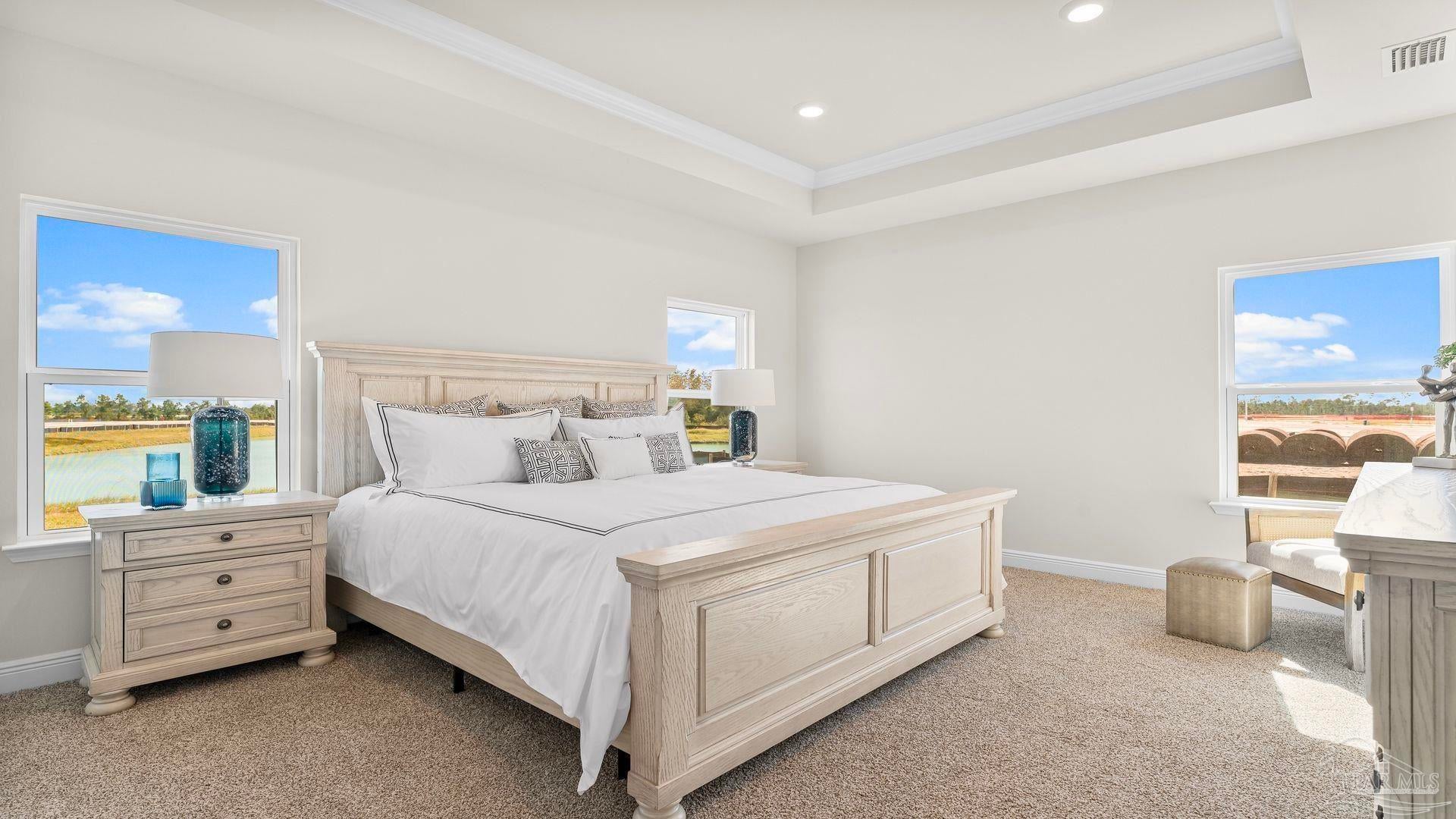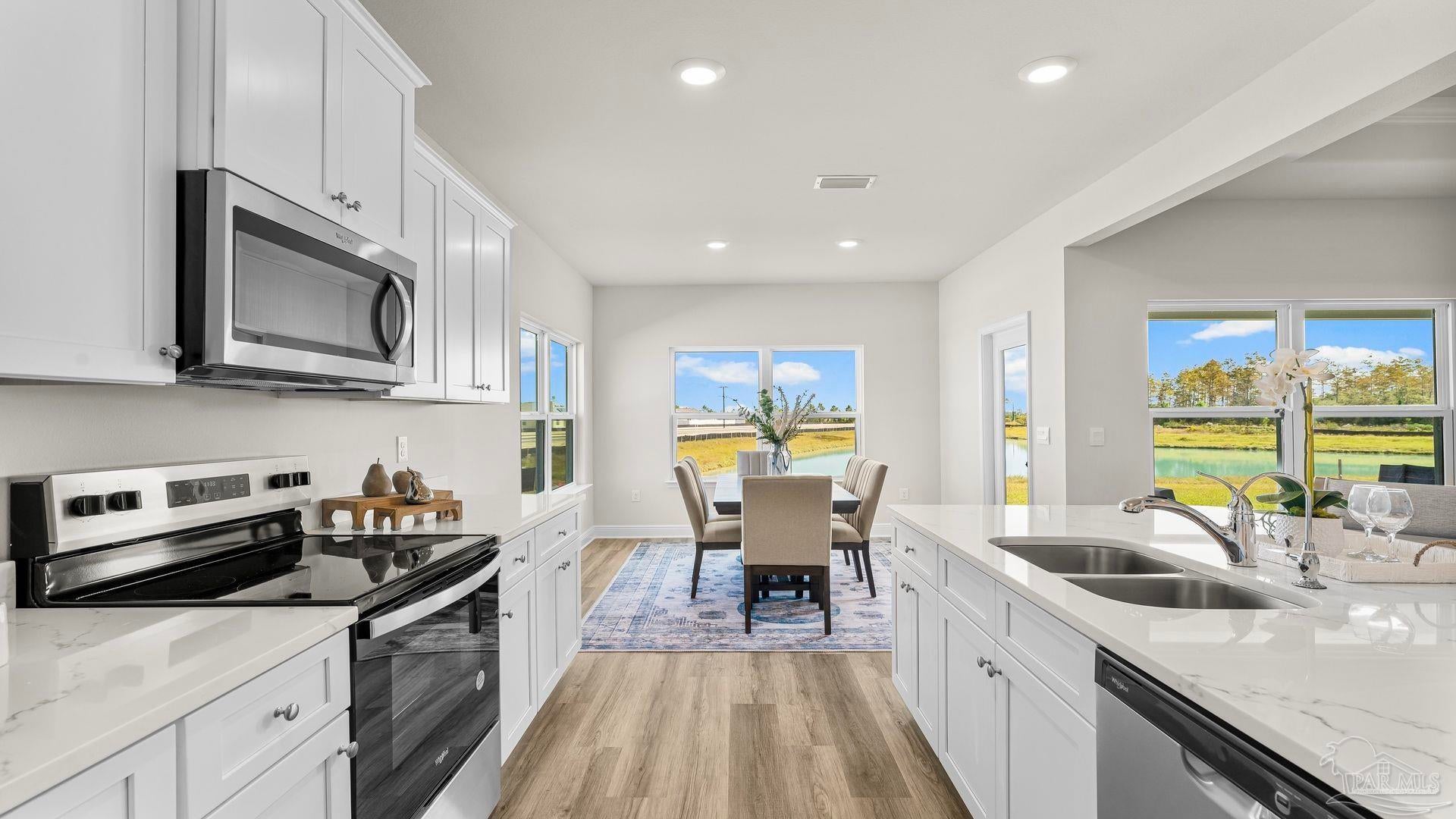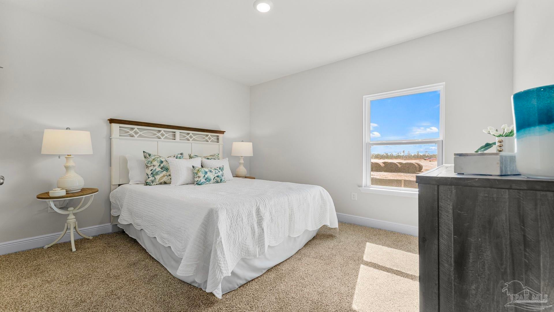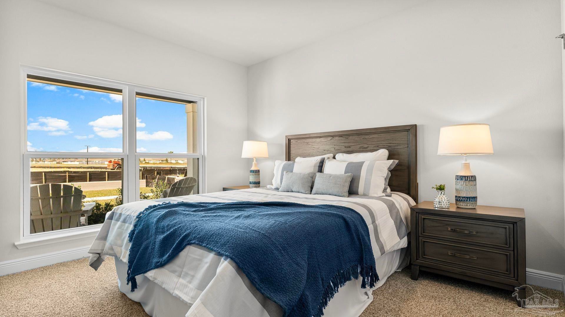 Welcome to the Madison, a new home floor plan at Chase Farms in Pace! When you walk into the home, you are greeted by a long hallway that is the center point for bedrooms, the laundry room and garage, and leads to the open living room and kitchen. The bedroom closest to the garage also comes with its own bathroom, not shared in the main hallway. Entering the kitchen and living room area, you will notice plenty of natural sunlight illuminating the main area. The living room has tray ceilings that open the room, making your living space feel much more comfortable. The kitchen has stainless steel appliances and comes with beautiful white cabinets. The large island has plenty of storage in it and every surface has elegant quartz countertops. The dining area is located by the back door leading to the covered rear patio. Walking into the large primary bedroom, you will also see tray ceilings and three windows that wash the room in natural sunlight. The primary bathroom has a spacious double vanity with white quartz countertops and white cabinetry. The walk-in closet is in the bathroom as well, perfect for when you get out of the separate tub or shower with glass doors. Stop by the model home today to see for yourself and find your next home at Chase Farms!