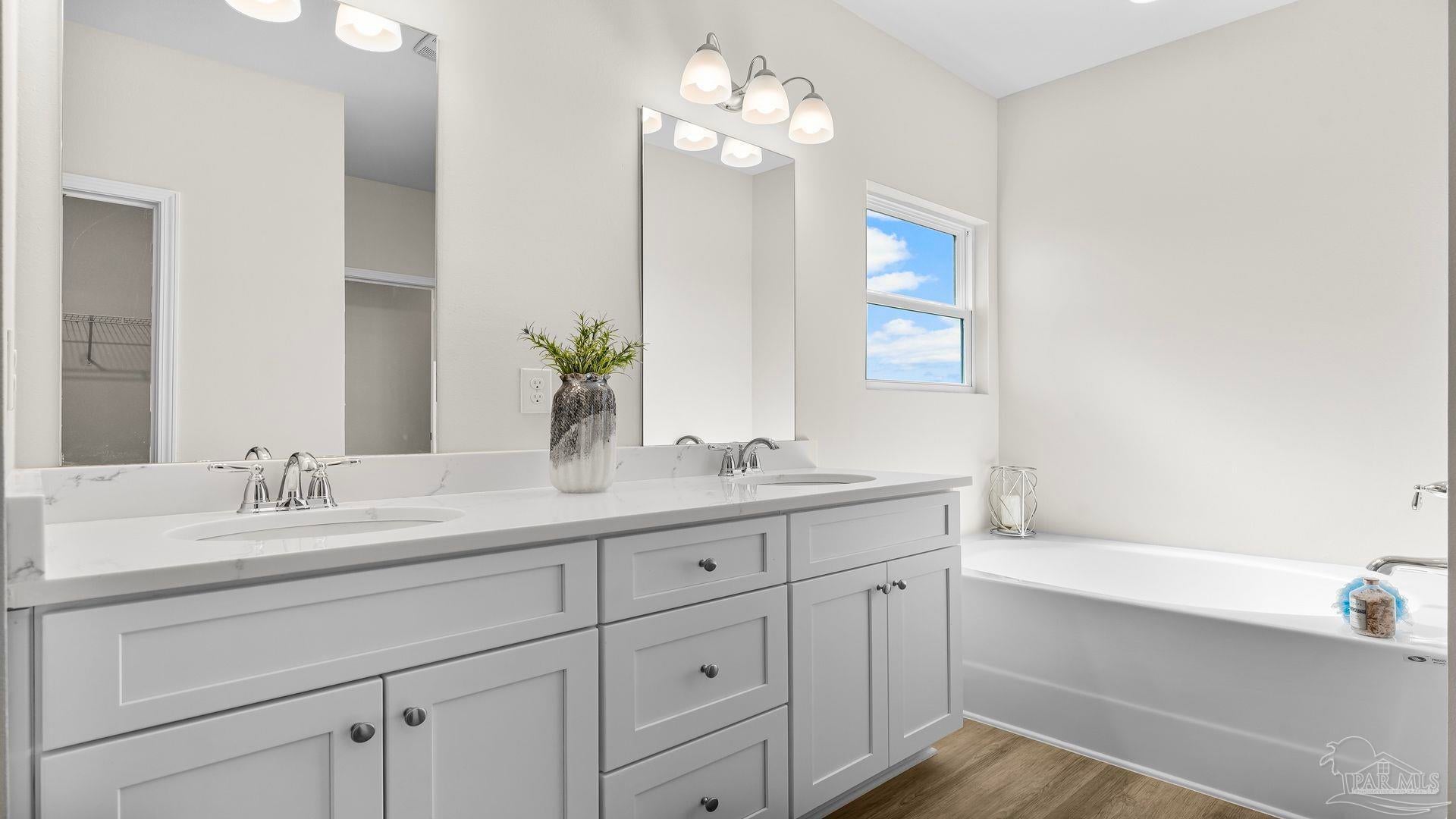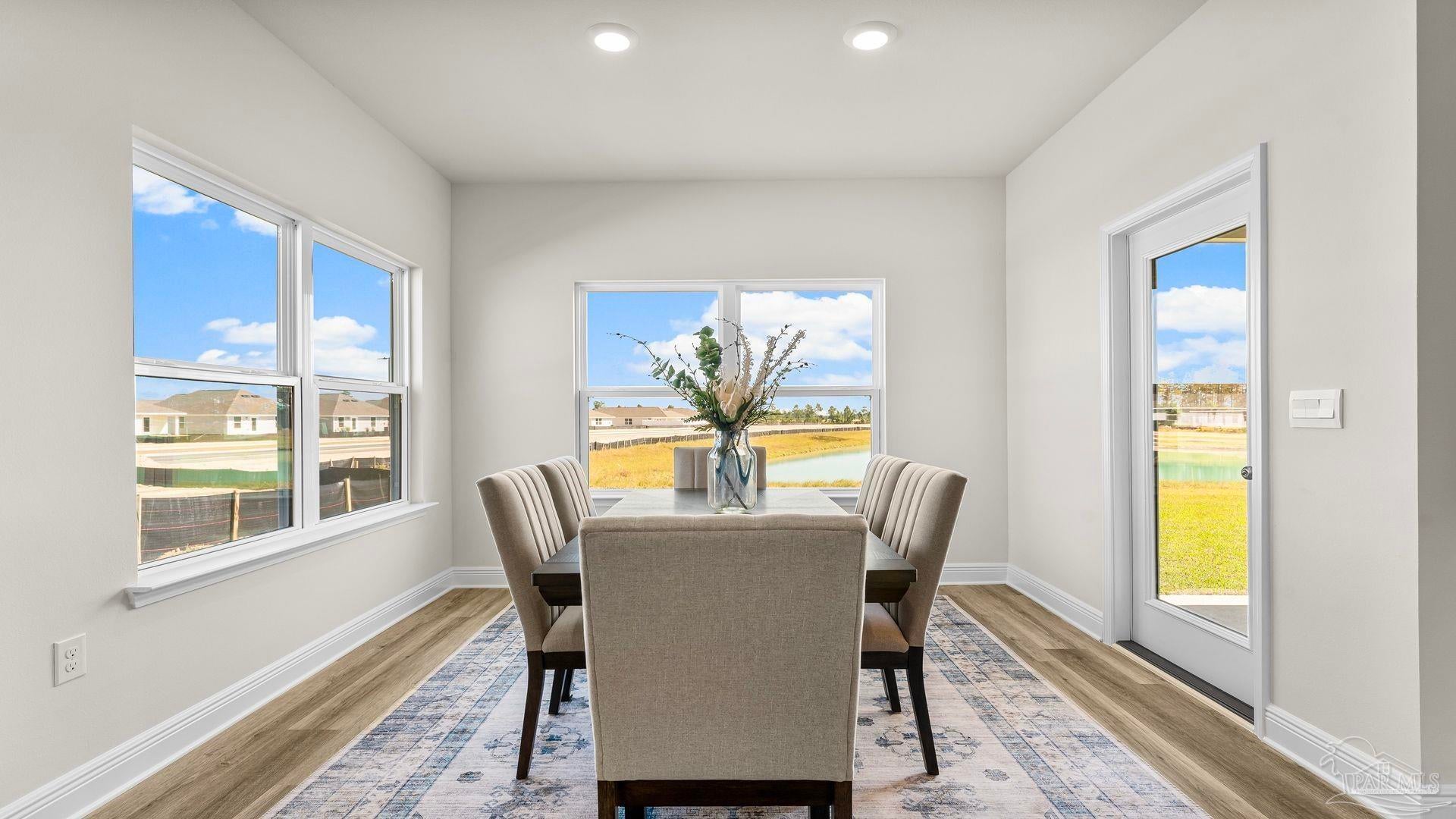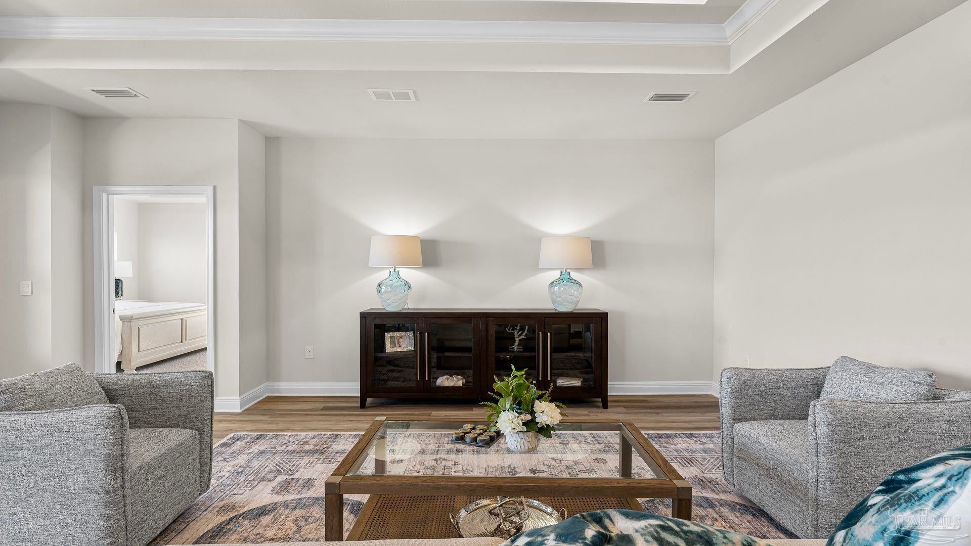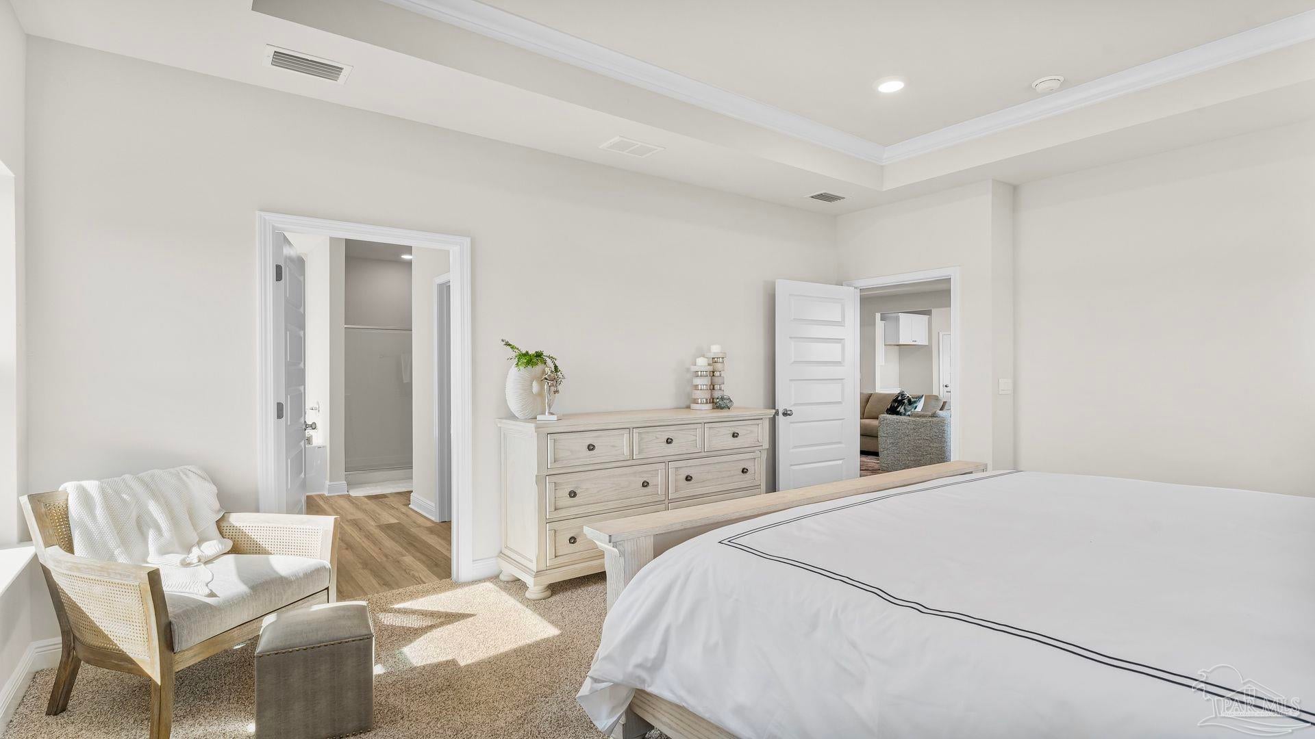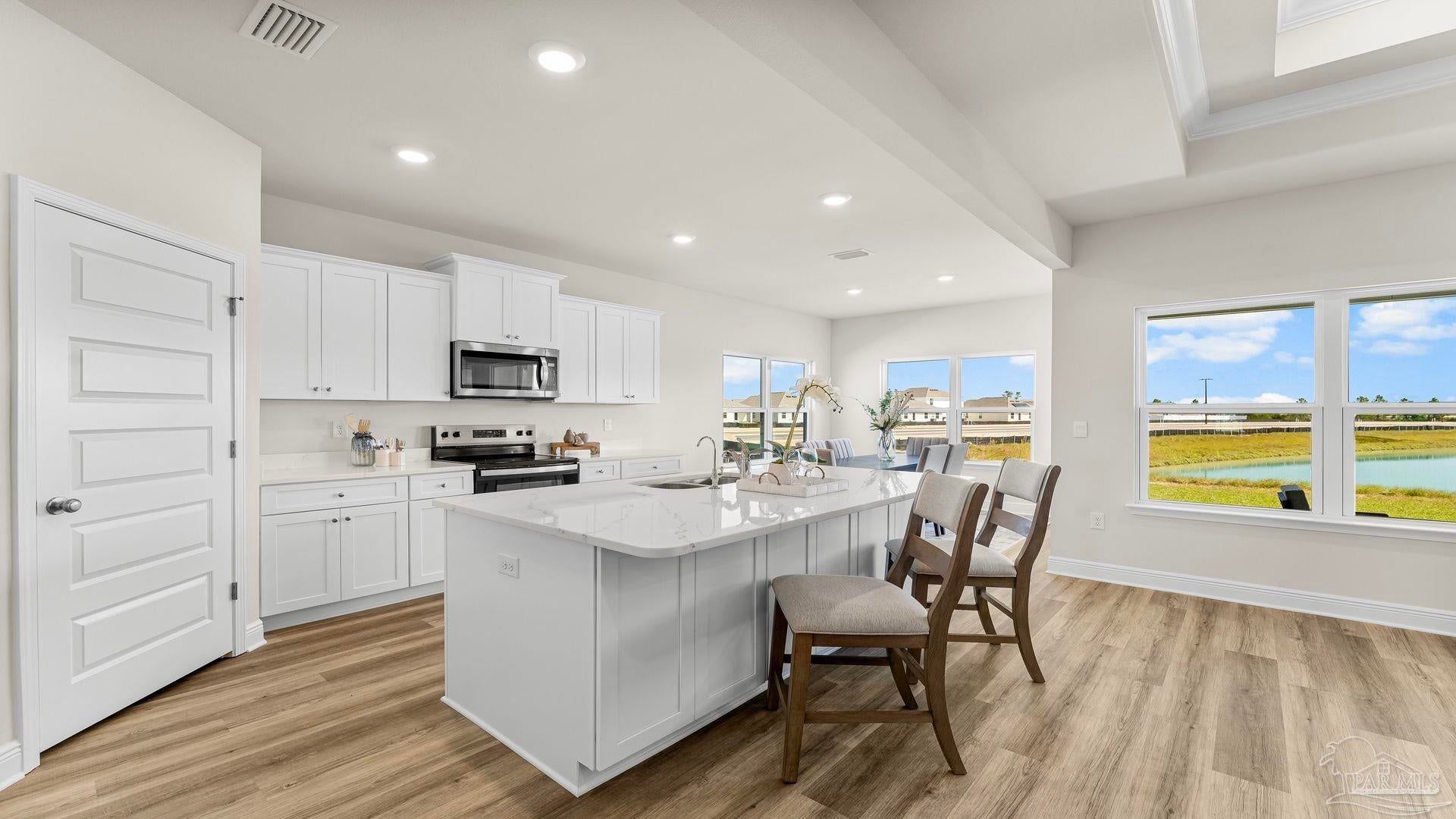 Welcome to the Madison, a new home floor plan at Chase Farms in Pace! When you walk into the home, you are greeted by a long hallway that is the center point for bedrooms, the laundry room and garage, and leads to the open living room and kitchen. The bedroom closest to the garage also comes with its own bathroom, not shared in the main hallway. Entering the kitchen and living room area, you will notice plenty of natural sunlight illuminating the main area. The living room has tray ceilings that open the room, making your living space feel much more comfortable. The kitchen has stainless steel appliances and comes with beautiful white cabinets. The large island has plenty of storage in it and every surface has elegant quartz countertops. The dining area is located by the back door leading to the covered rear patio. Walking into the large primary bedroom, you will also see tray ceilings and three windows that wash the room in natural sunlight. The primary bathroom has a spacious double vanity with white quartz countertops and white cabinetry. The walk-in closet is in the bathroom as well, perfect for when you get out of the separate tub or shower with glass doors. Stop by the model home today to see for yourself and find your next home at Chase Farms!