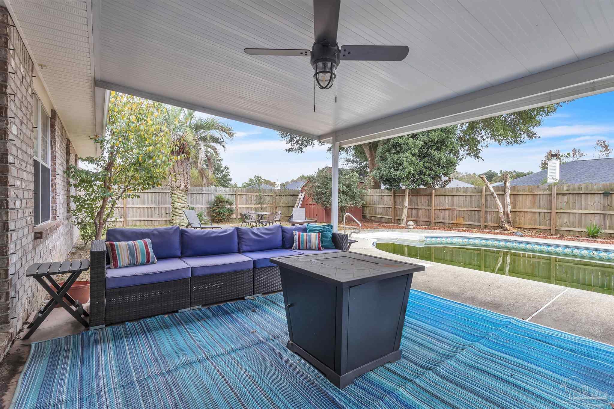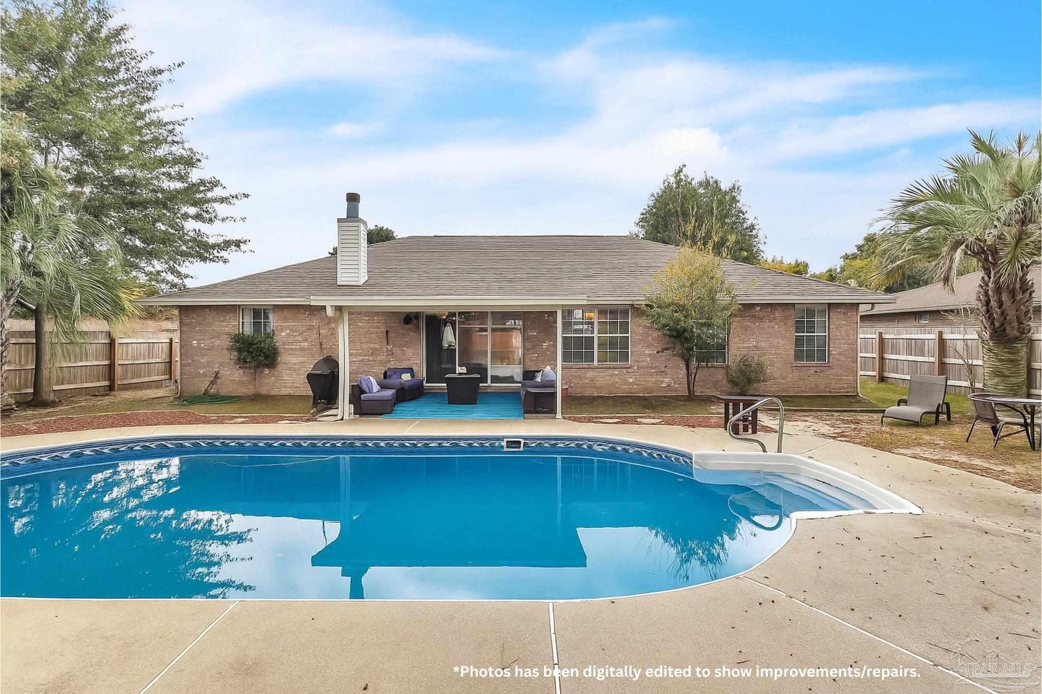 Pace Pool Home 3BR / 2BA with no HOA. Step inside to find an inviting open layout with vaulted ceilings, a cozy wood-burning fireplace, and views of the backyard pool. The kitchen features granite countertops, stainless steel Samsung appliances, tile backsplash, pantry, and an eat-in dining area, perfect for family gatherings. A flexible formal dining room offers the ideal space for entertaining or can easily transition into a home office, playroom, or creative nook to suit your lifestyle. The spacious primary suite with en-suite bath features dual walk-in closets with custom built-ins, a double vanity, and an updated shower with a glass door. Enjoy outdoor living under the covered patio surrounded by mature landscaping, a privacy fence, and two storage buildings. Roof replaced in 2021 with Rebuild Northwest Florida upgrades for added peace of mind, plus newer gutters, lighting, and fixtures throughout. The pool is in need of repair but holds amazing potential to bring this backyard oasis back to life. A fantastic opportunity for buyers with vision in one of Pace’s most convenient locations, and a price that can’t be beat!