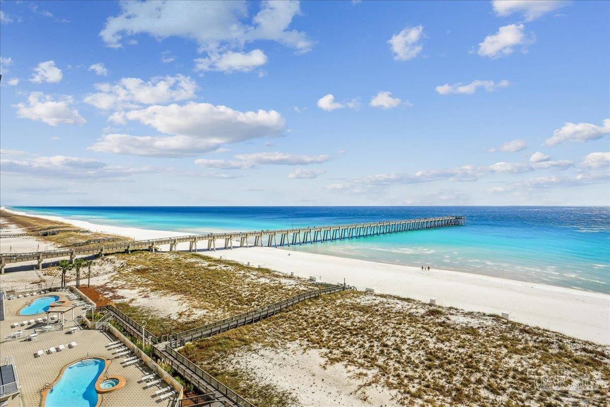 Experience breathtaking 7th-floor views of the Gulf and Navarre Pier from your private waterfront balcony. This fully furnished vacation residence also presents an excellent vacation rental investment opportunity, comfortably sleeping 8 guests with 3 vacation rental bedrooms designed for ultimate relaxation. Tiled flooring flows throughout the condominium, complemented by soaring 10-ft ceilings with elegant crown molding. The open concept living and dining area extends to the expansive balcony, offering the perfect space for indoor-outdoor living. The kitchen has breakfast bar, quartz countertops, a convenient pantry, and a smooth-top range. The luxurious primary suite features private balcony access, a generous walk-in closet, and an en-suite bath with a double vanity. The guest bath offering dual access from both the living area and a guest bedroom, ensures comfort and convenience for all. The Summerwind complex boasts 450 feet of pristine beachfront access, three Gulf-side pools (one heated for winter use), three hot tubs, a private walkover to the beach, exercise facilities, grills, and on-site security for peace of mind. Navarre Beach is a hidden gem, offering stunning white sand beaches and an array of activities including swimming, scuba diving, snorkeling, kayaking, jet skiing, fishing, as well as scenic walking and biking paths. Plus, you will have easy access to the Gulf Island National Seashore for outdoor exploration. Whether you are looking for a vacation home or an ideal vacation rental investment, this property is your gateway to an unparalleled coastal lifestyle. Schedule your showing today and begin your journey to beachside bliss!
