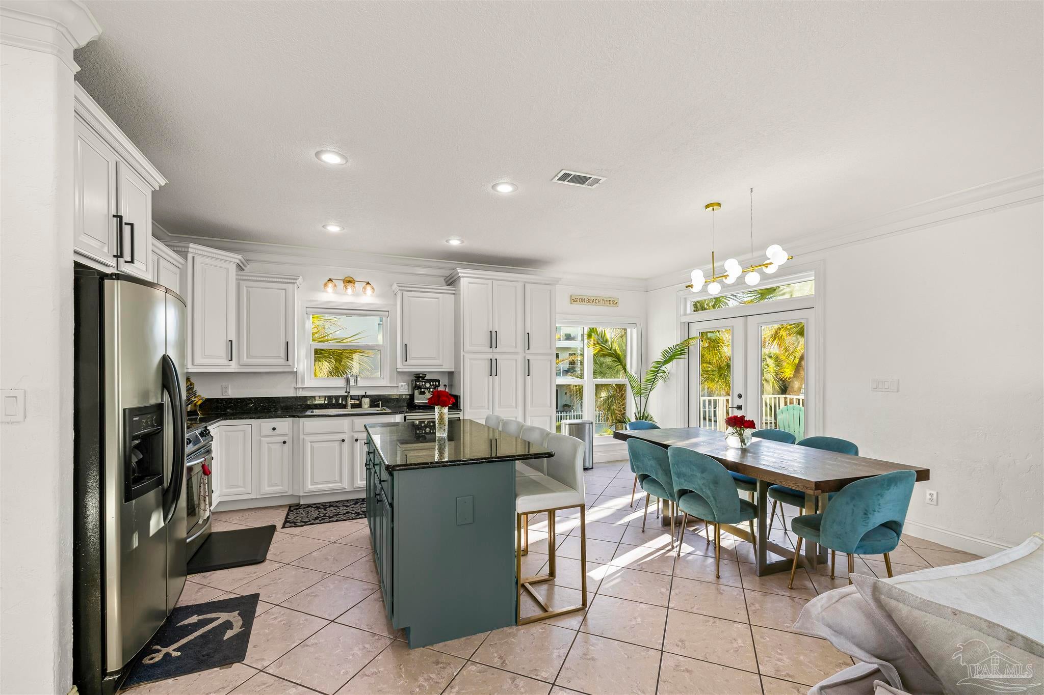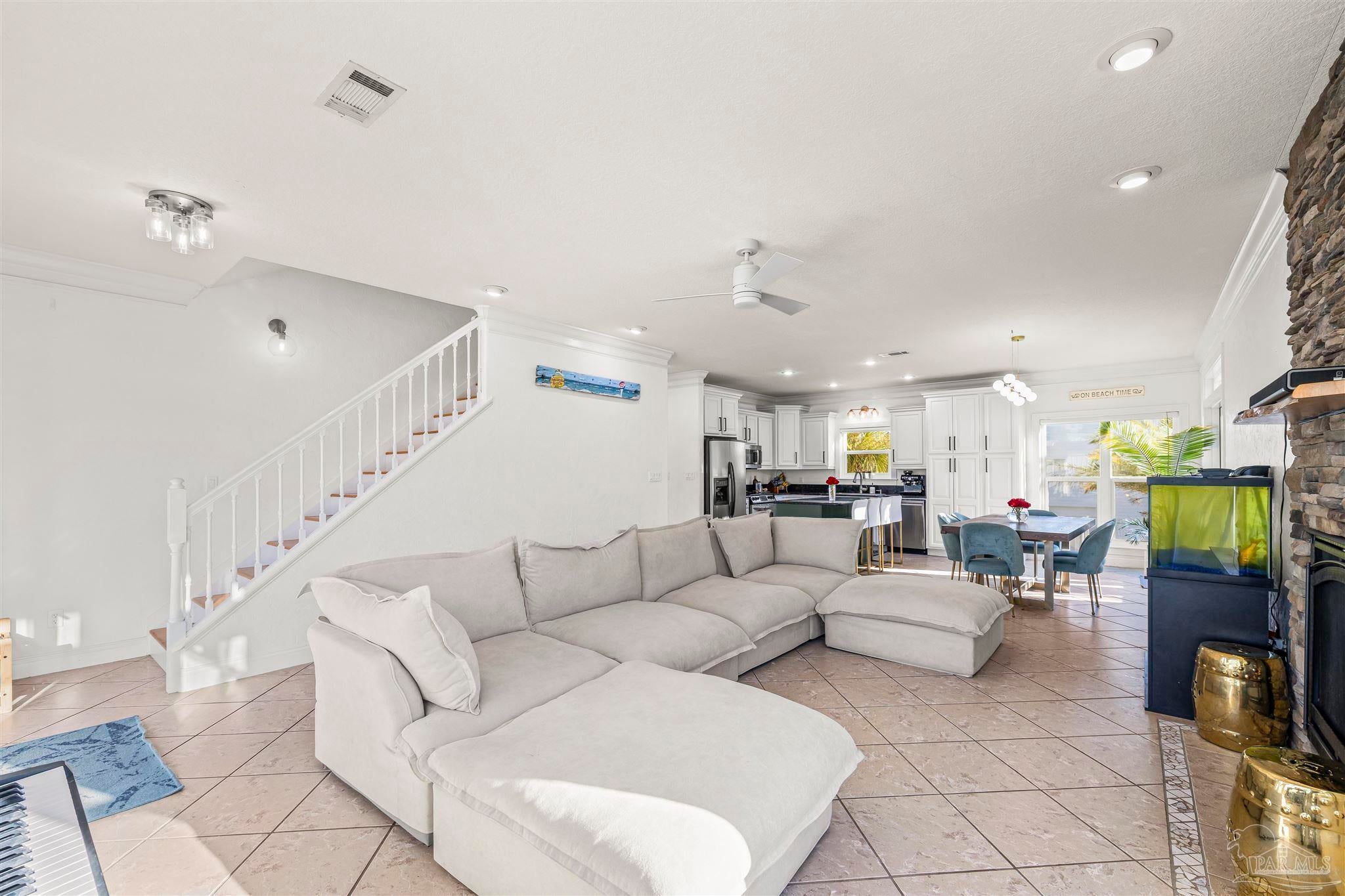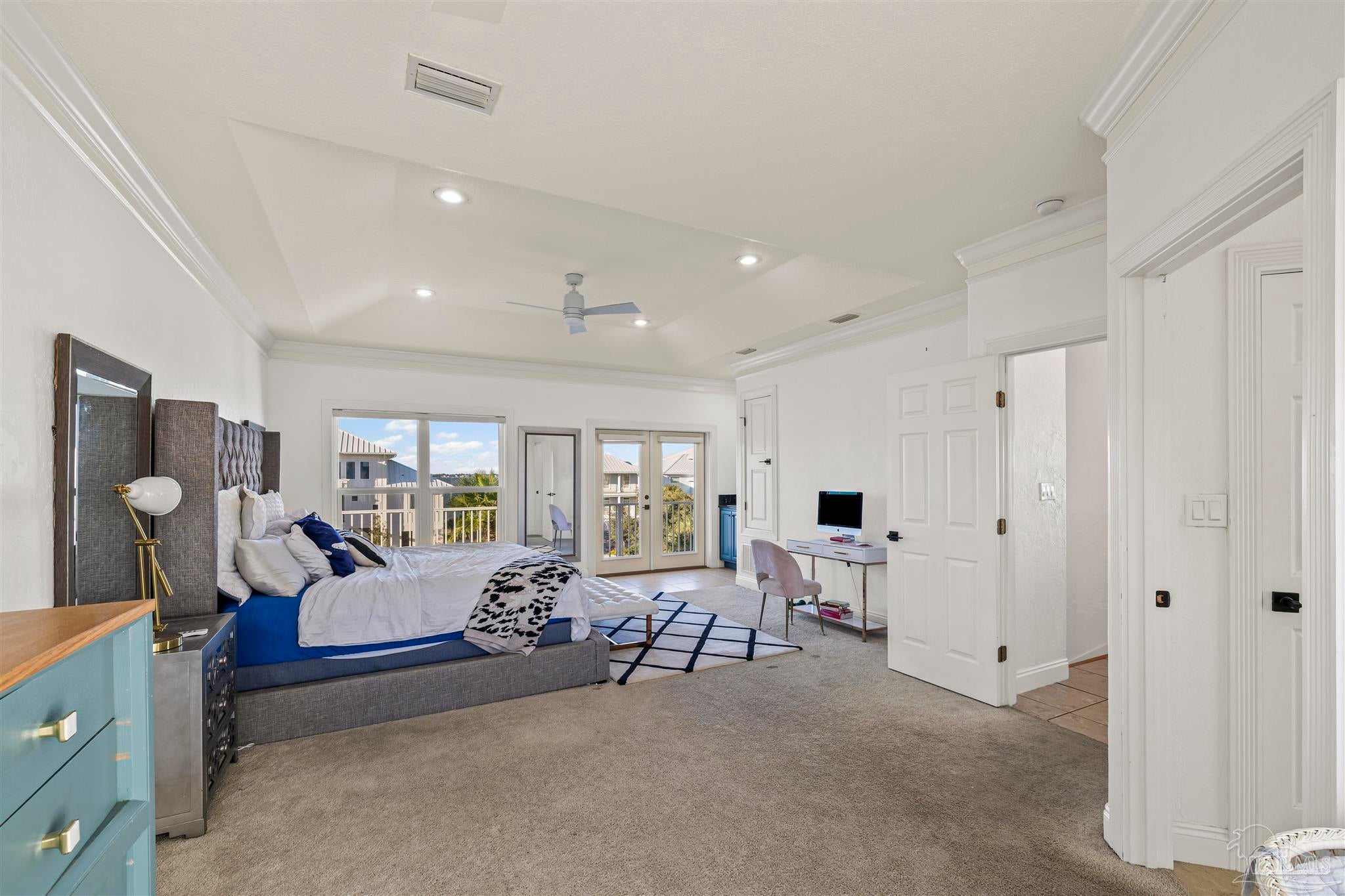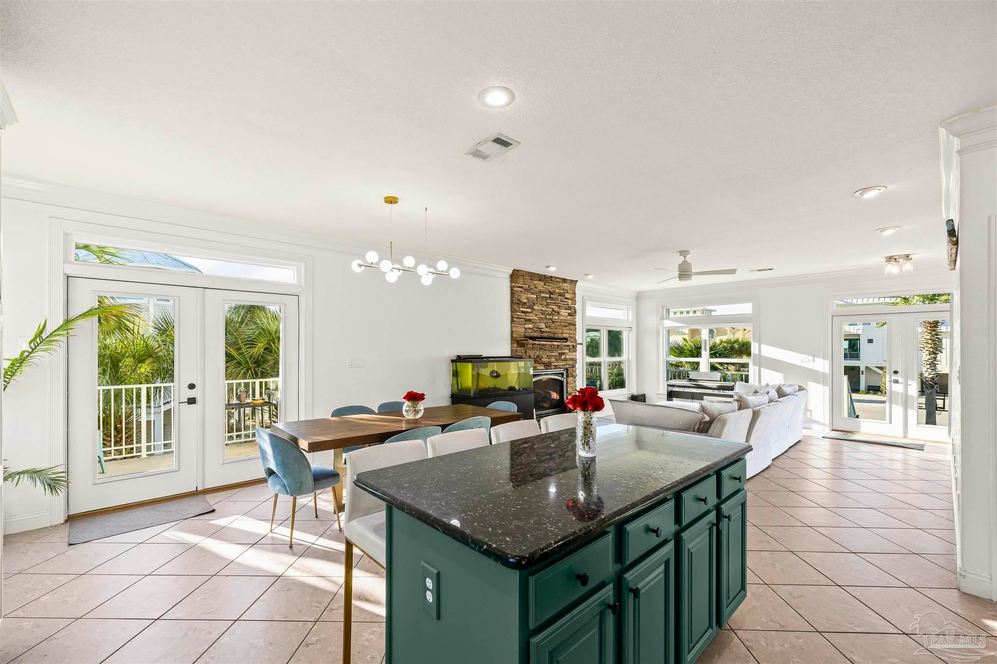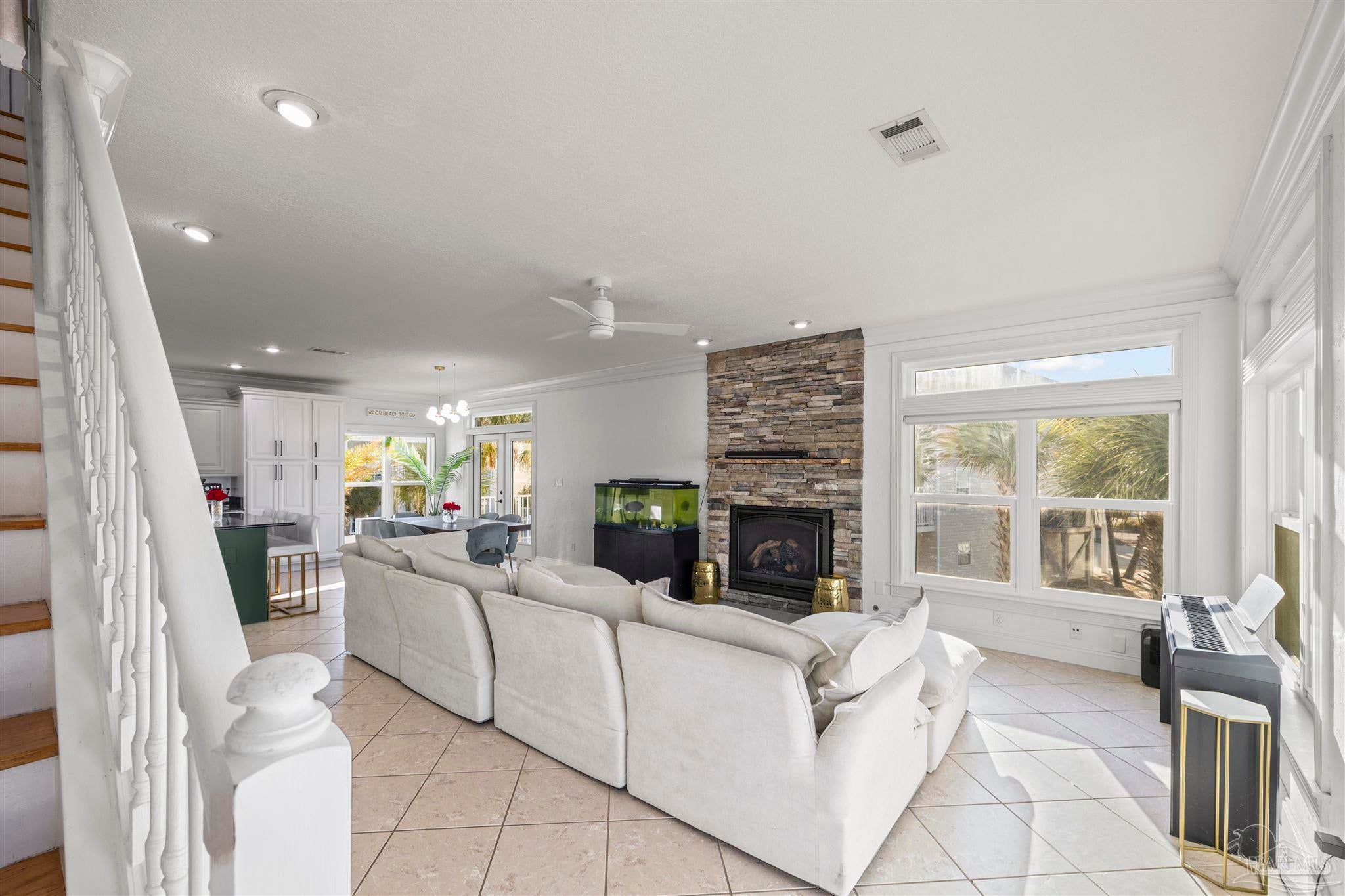 Beautifully updated and move-in ready, 22 Seashore Dr offers a rare opportunity to own a waterview retreat in the exclusive Seashore Village community of Pensacola Beach. Nestled on a quiet cul-de-sac just steps from the Gulf and Santa Rosa Sound, this 4-bedroom, 3-bathroom home blends coastal charm with thoughtful upgrades and panoramic water views. Built in 2002 and meticulously maintained, the home features hurricane-rated windows, a metal roof and a freshwater well for irrigation ensuring peace of mind and low-maintenance living. Step inside to an open-concept main level where the kitchen, dining, and living areas flow seamlessly, all oriented to capture stunning sound and Gulf views. The spacious master suite is a true sanctuary, complete with a private balcony, wet bar, and a spa-like bath with a jetted tub. The third-floor laundry room adds everyday convenience, while the oversized garage has plenty of room for a workshop, ample storage, and a bay large enough for boat and golf cart storage. Outdoor living is elevated with access to a private sound-side beach and dock, all exclusive to Seashore Village residents. Enjoy morning walks across the street to the unobstructed Gulf, or walk along the sound to nearby Portofino Island Resort amenities—optional membership includes five clay tennis courts, indoor and outdoor pools, a state-of-the-art gym, and on-site dining. With a no short-term rental policy, Seashore Village maintains a serene, residential atmosphere ideal for full-time living or a second home. Zoned for one of the nation’s top-rated Blue Ribbon schools, this home offers both luxury and lifestyle in one of Pensacola Beach’s most desirable enclaves.