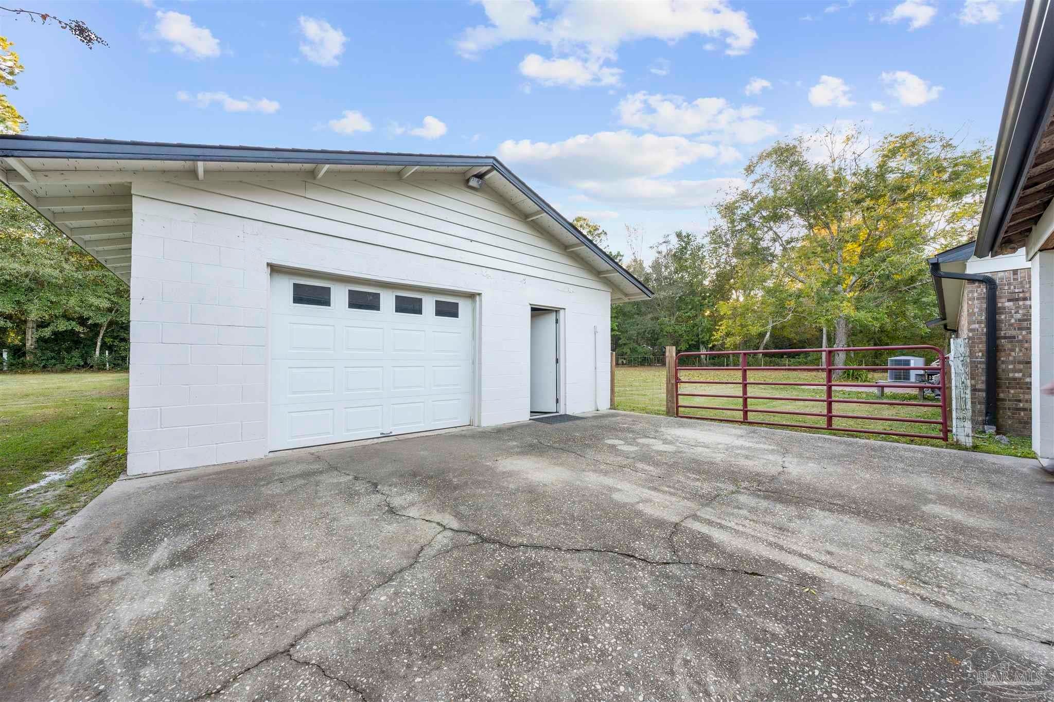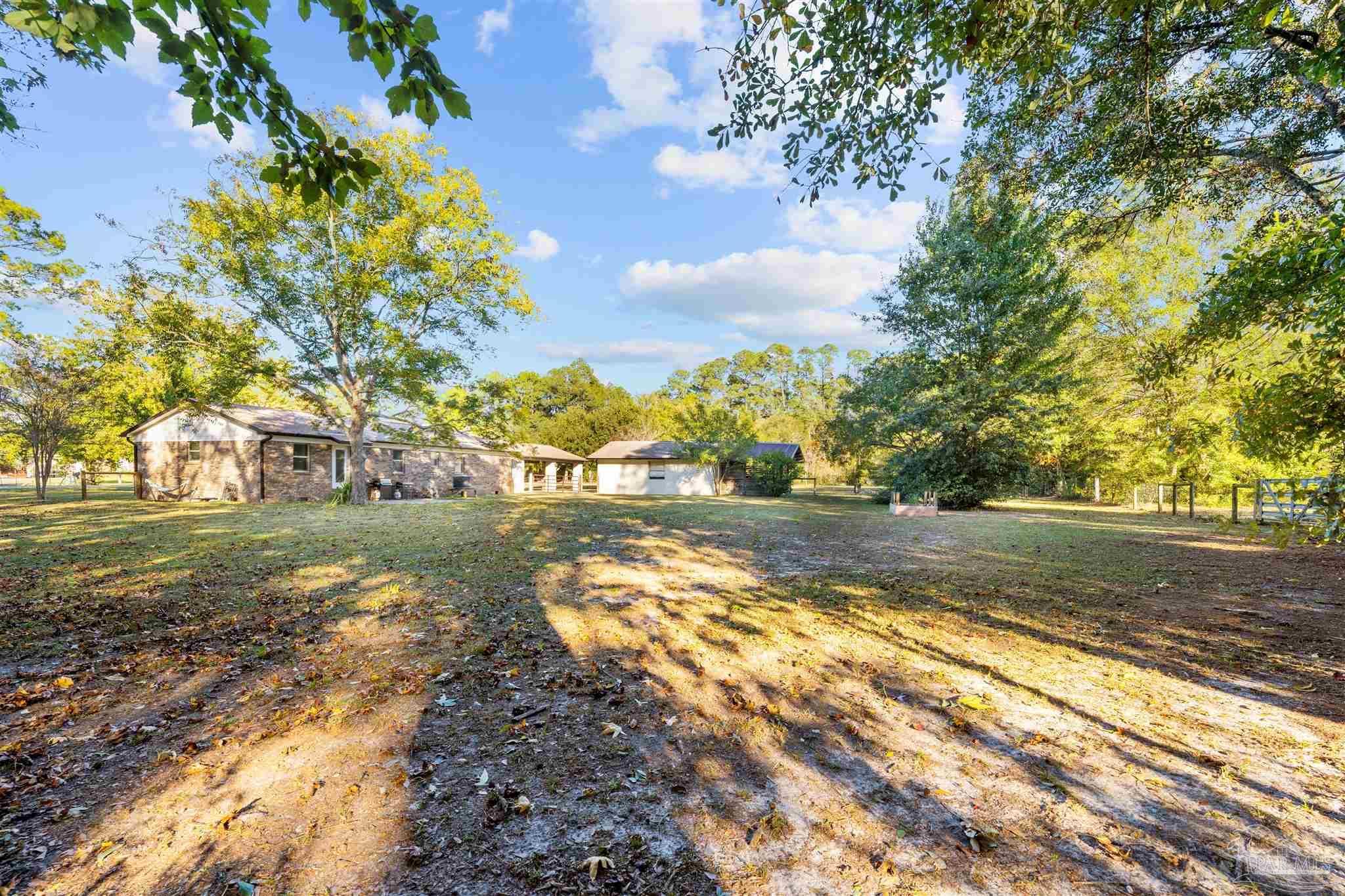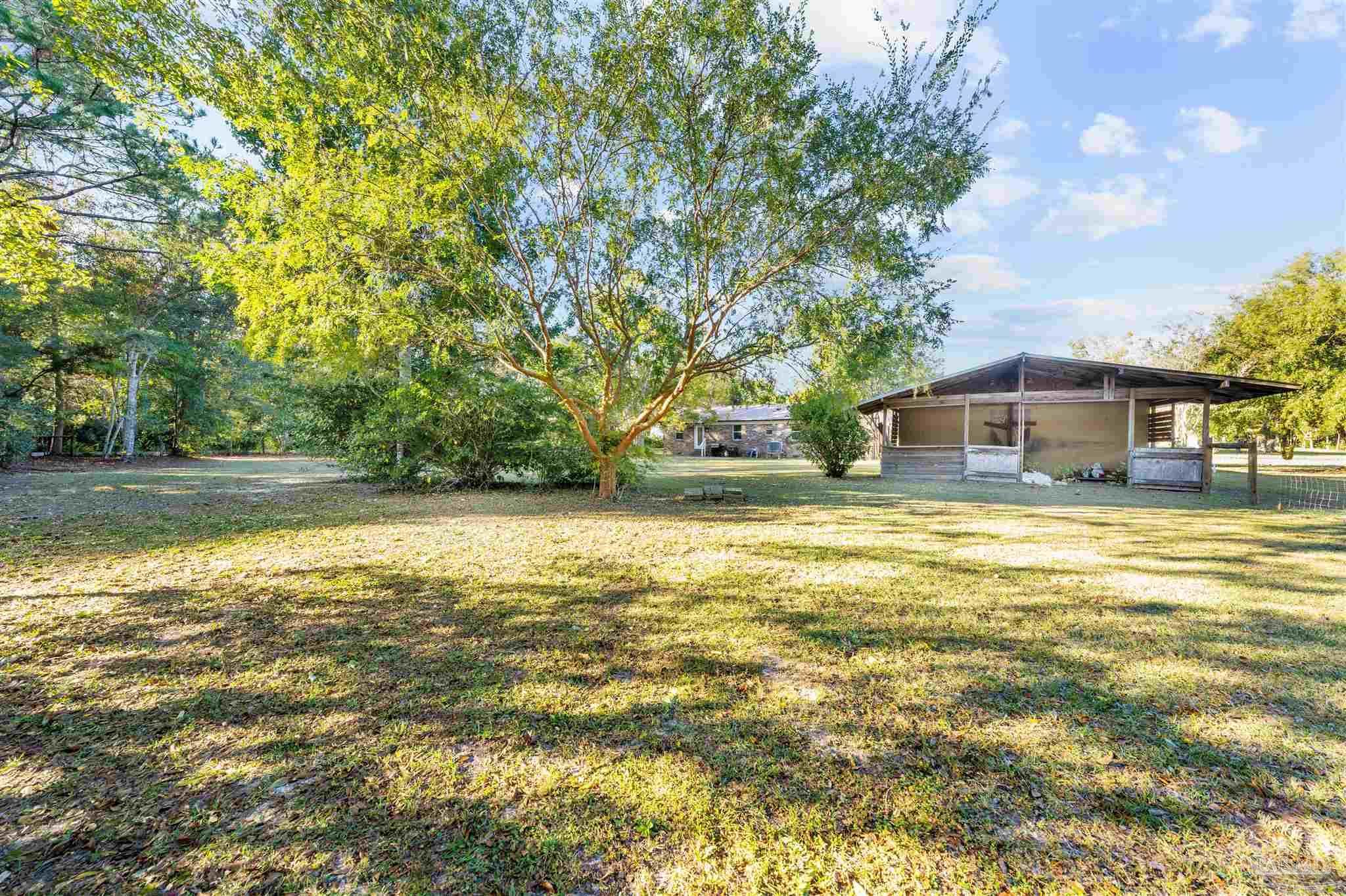 Set on a 1.16-acre corner lot, this beautifully updated ranch-style home offers the perfect blend of modern comfort and country living. The 3-bedroom, 2-bath layout features recent updates including fresh paint, new flooring, lighting, and a newer roof (2022). The kitchen is a true highlight with quartz countertops, custom cabinetry, a pine bar top, stainless steel appliances, and a wine cooler—perfect for cooking and entertaining. The spacious living area flows easily throughout the home, while the primary suite includes a fully renovated bath with marble tile and upscale finishes. Step outside and enjoy the space this property offers. The fenced-in backyard provides room for pets or outdoor gatherings, while the detached 2-car carport and oversized garage/workshop add ample space for storage, hobbies, or larger projects. Two horse stables are also located on-site, offering flexible use for equestrian needs or extra storage. Mature trees add shade and privacy, creating a peaceful outdoor setting with room to grow. Conveniently located less than two miles from the NAS Pensacola West Gate and under a mile from Walmart, Target, and Aldi, this property offers the best of both worlds—plenty of space with quick access to everyday conveniences. Plus, it’s just a short 15-minute drive to local beaches, making it easy to enjoy the coastal lifestyle Pensacola is known for. Whether you’re looking for room to spread out or a move-in ready home close to everything, this one checks all the boxes.