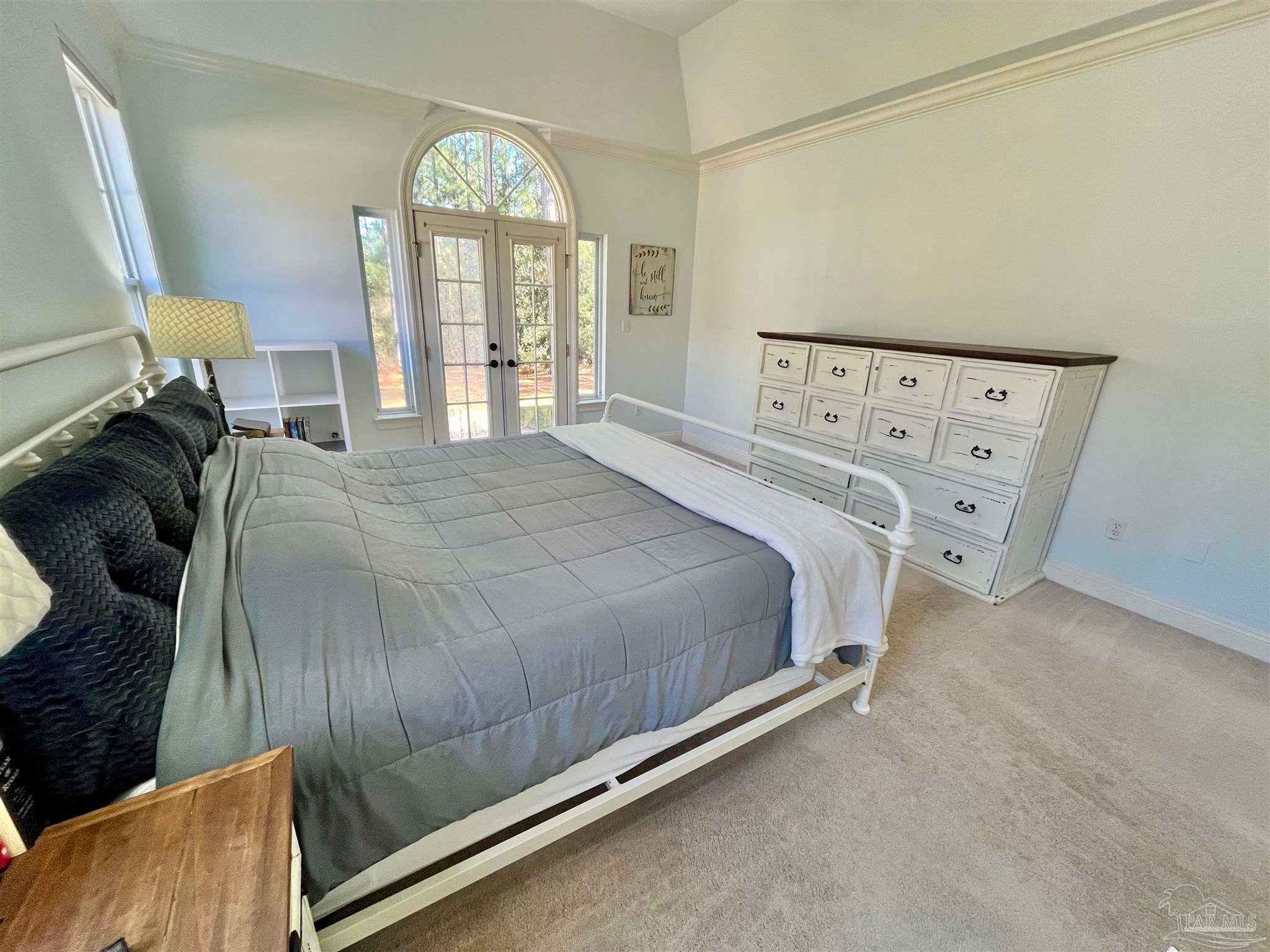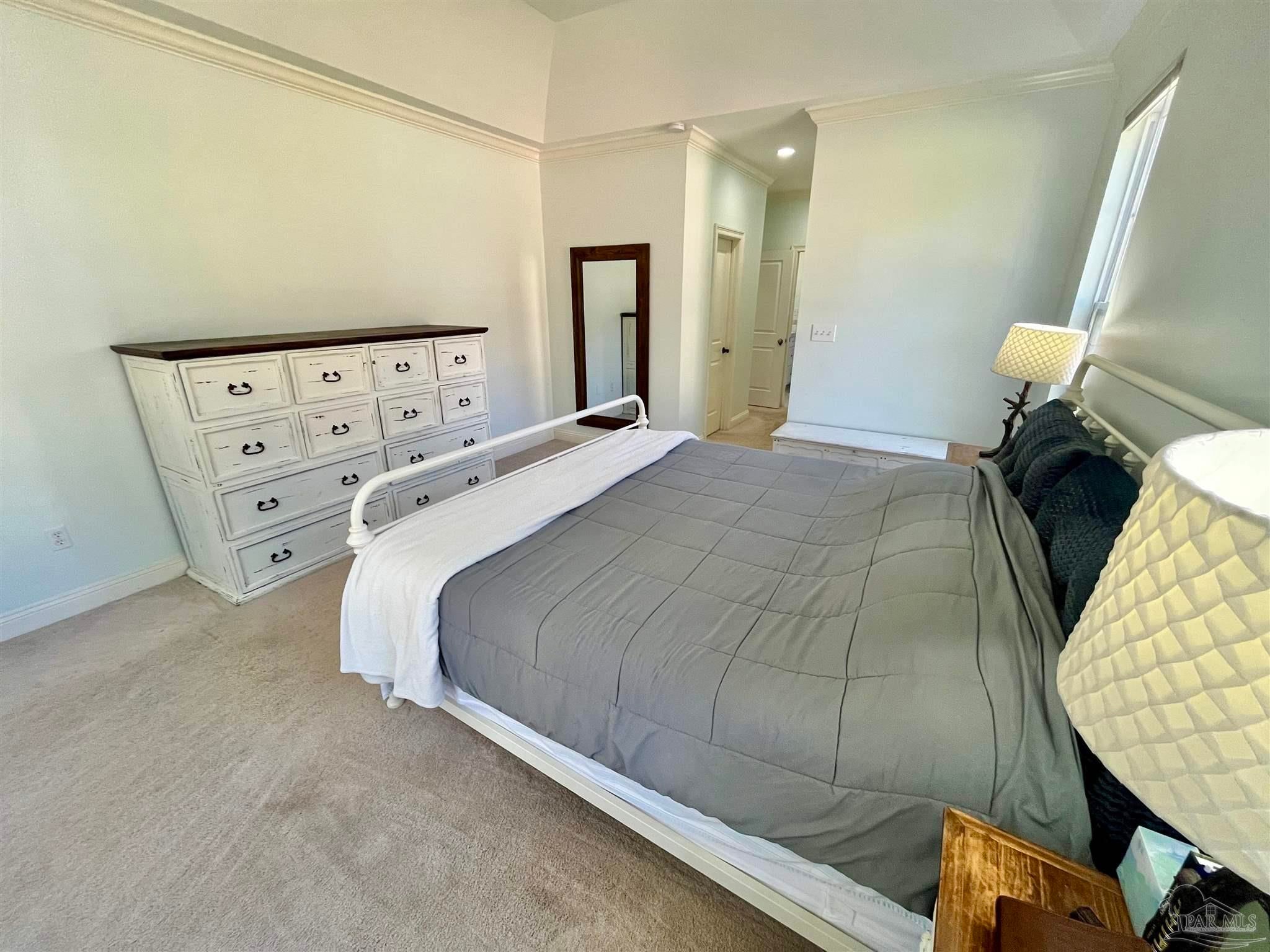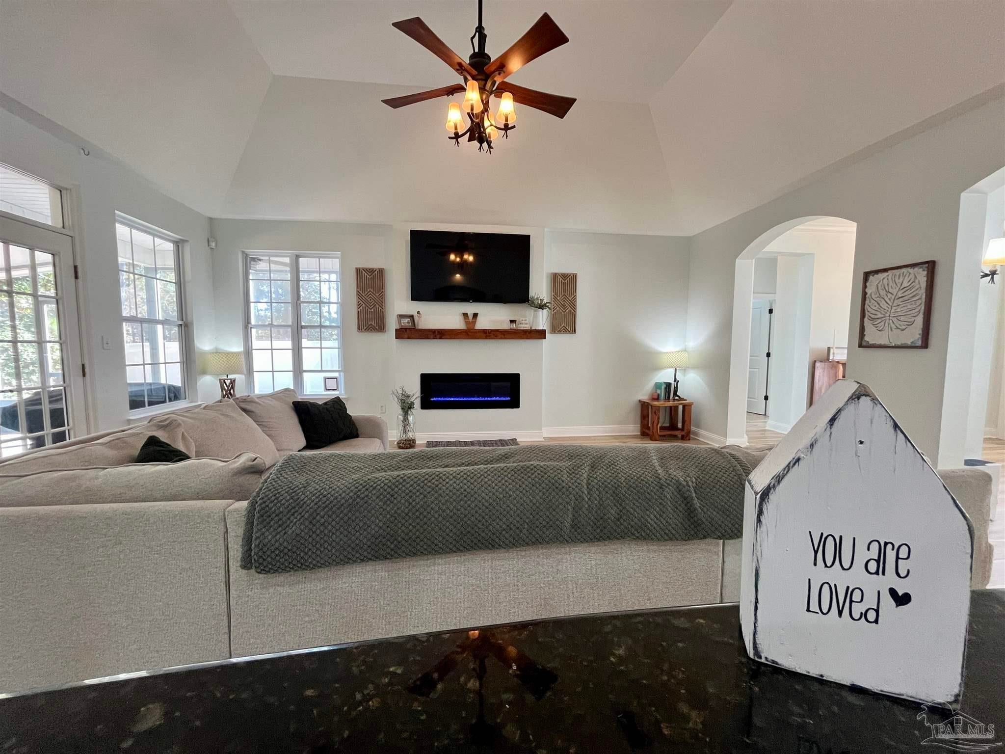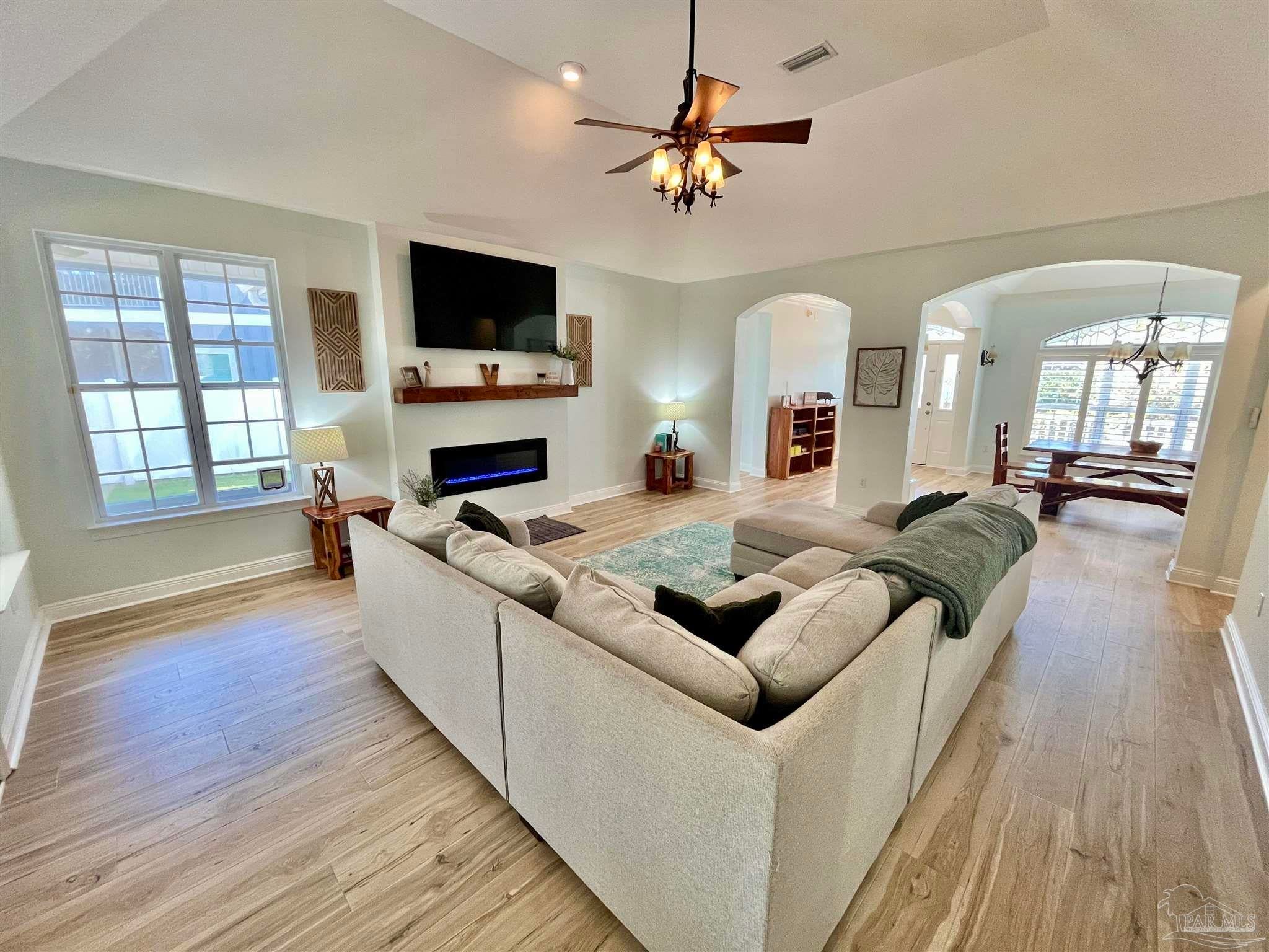 Come see this large, charming home, located near Perdido Key in the highly desired Windward Cove neighborhood. This 4 bedroom, 2 bathroom, 2388 sqft house offers all the space a family needs, from the large gathering rooms to the preserve-lined back yard. Windward Cove is a gated, waterfront community that sits right on Perdido Bay and adjoins the Bayou Tarkiln State Park, offering you a plethora of nature right out your back door and all around the community. The home was built in 2005 and includes many high end finishings throughout, including vaulted ceilings, crown molding, granite counters, upgraded cabinets, and more. In 2024, a new roof was put on, the interior repainted, new vinyl floors installed, and the living was renovated with a brand new electric fireplace and mantle. The HVAC was fully replaced in 2021, and includes a transferable 10 year parts warranty. The home provides a large master suite with double walk-in closets, plus 2 additional bedrooms and full bathroom across the home, AND a large bonus room over the garage, perfect for a guest bedroom, office, game room, etc. The home also offers a large 2 car garage and a sweeping, expanded back porch, looking out to the woods. Watch from the comfort of your porch or dinette windows as birds, deer, and more pass by. When you're ready to venture out, the neighborhood offers several fun options. Fish in the stocked neighborhood ponds, meet up with neighbors at the community pool, or go watch the sunset on the pier! The pier is accessible to all residents, offering steps down to the water, a kayak launch, and benches at the end for relaxing or fishing. Boats slips are private and can be purchased separately as they become available. Of course, just outside the Windward Gates, you are minutes from Perdido Key Beaches, the Naval Base, and many wonderful dining locations, groceries, and more. Don't miss this one of a kind home!