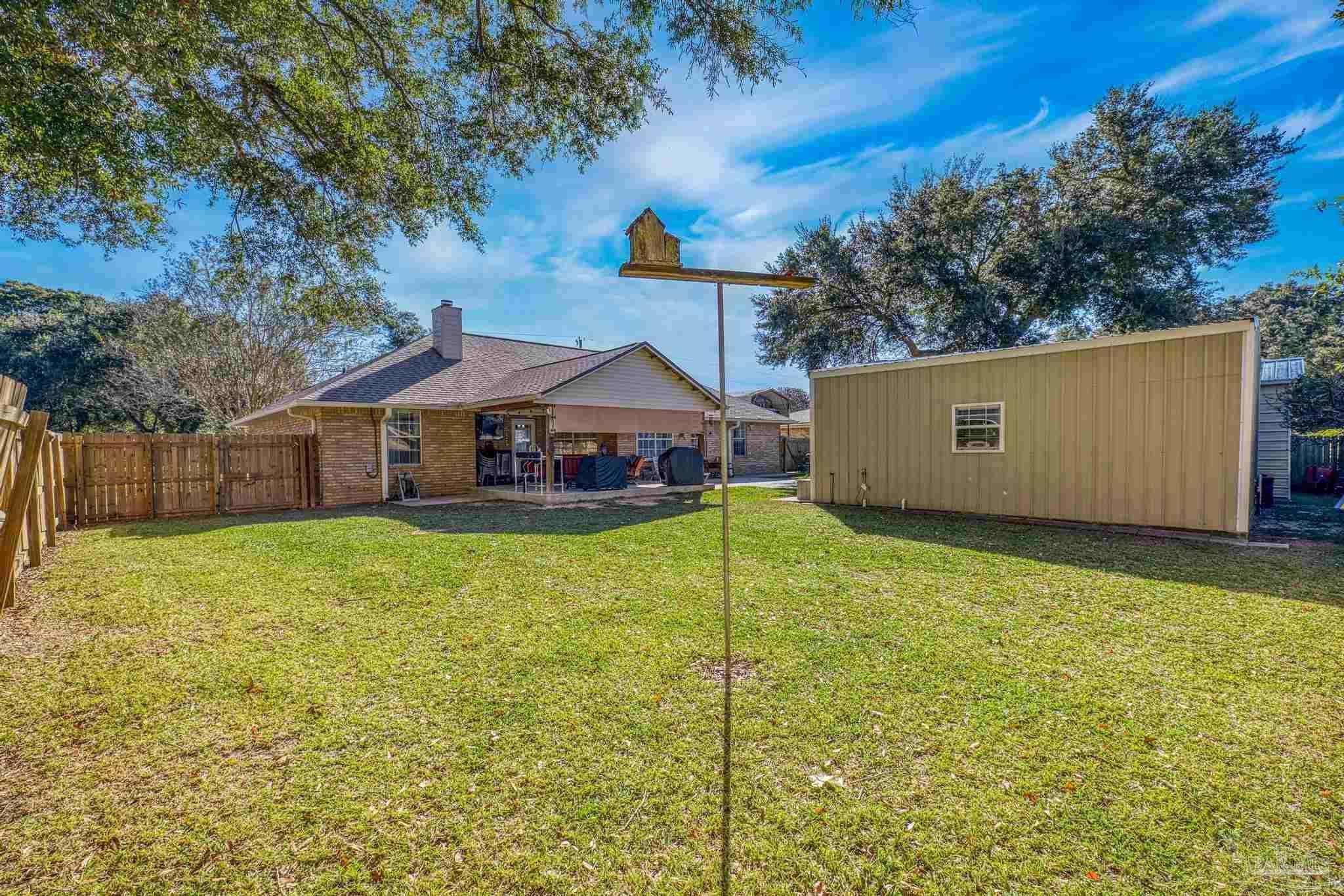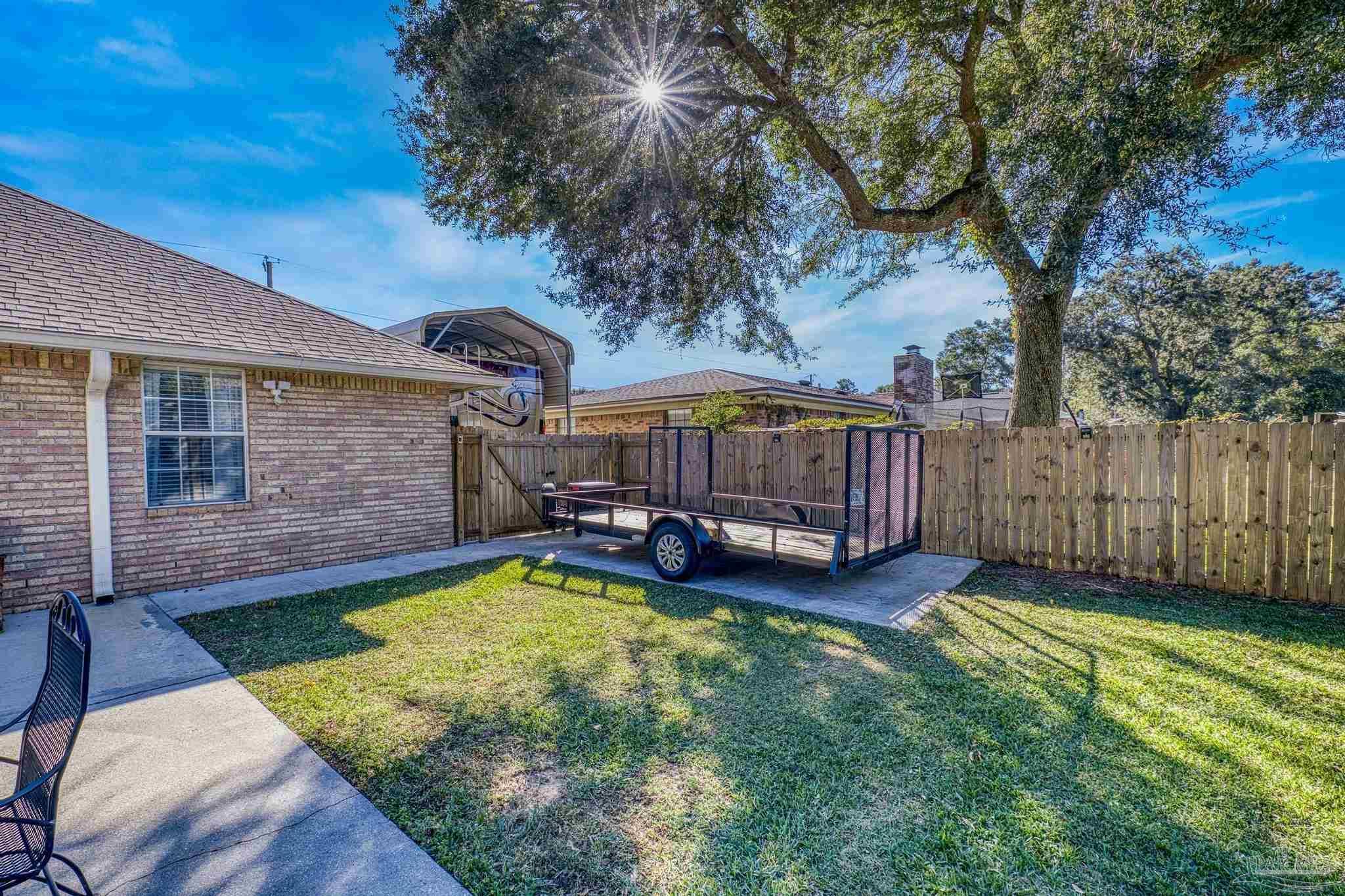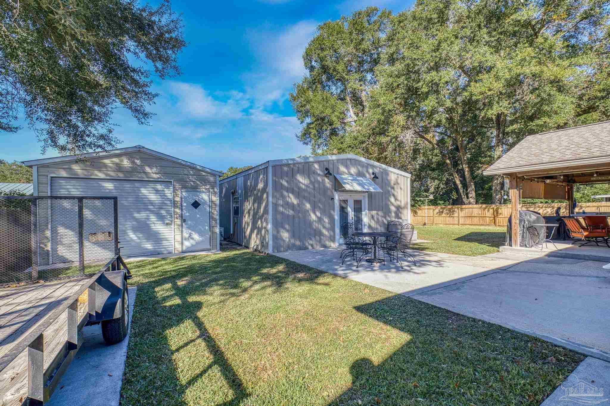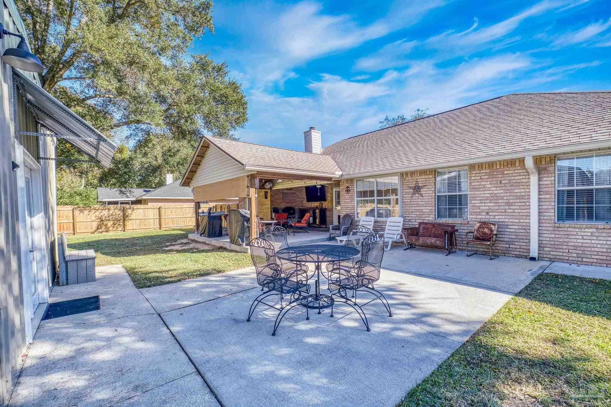 Welcome to this stunning brick family home in Pensacola, featuring 3 bedrooms, 2 bathrooms, and a spacious detached guest suite — perfect for extended family, visitors, or potential short-term rental income. Inside, you’ll find wood-look tile floors throughout, an open and inviting living area with a fireplace, and a fully renovated kitchen with granite countertops, stainless steel appliances, soft-close cabinets, and decorative tile flooring. Enjoy both a breakfast nook and a formal dining space, ideal for everyday living or entertaining. The primary bedroom suite offers a large walk-in closet, soaking tub, glass-enclosed tiled shower, and granite vanity. Two additional bedrooms and a second full bath provide comfortable space for family or guests. Step outside to your expansive covered patio with electrical, ceiling fans, and TV hookup — perfect for outdoor dining and relaxing. The fenced backyard features lush green space plus a 625 sq. ft. detached living unit with a kitchenette, full bathroom, dining and seating area, and its own mini-split HVAC system for heating and cooling. This versatile space has proven successful as a rental opportunity through third-party hosting platforms, offering excellent flexibility and added value. Additional features include a covered RV pad with full electrical hookups, a metal workshop building with power and roll-up door, and recent upgrades such as a new roof and hot water heater (2023) for worry-free ownership. This move-in ready Pensacola family home delivers it all — modern updates, outdoor living, guest or rental flexibility, and a prime location close to schools, shopping, and local beaches. Don’t miss the chance to make this your next home in Pensacola, FL.