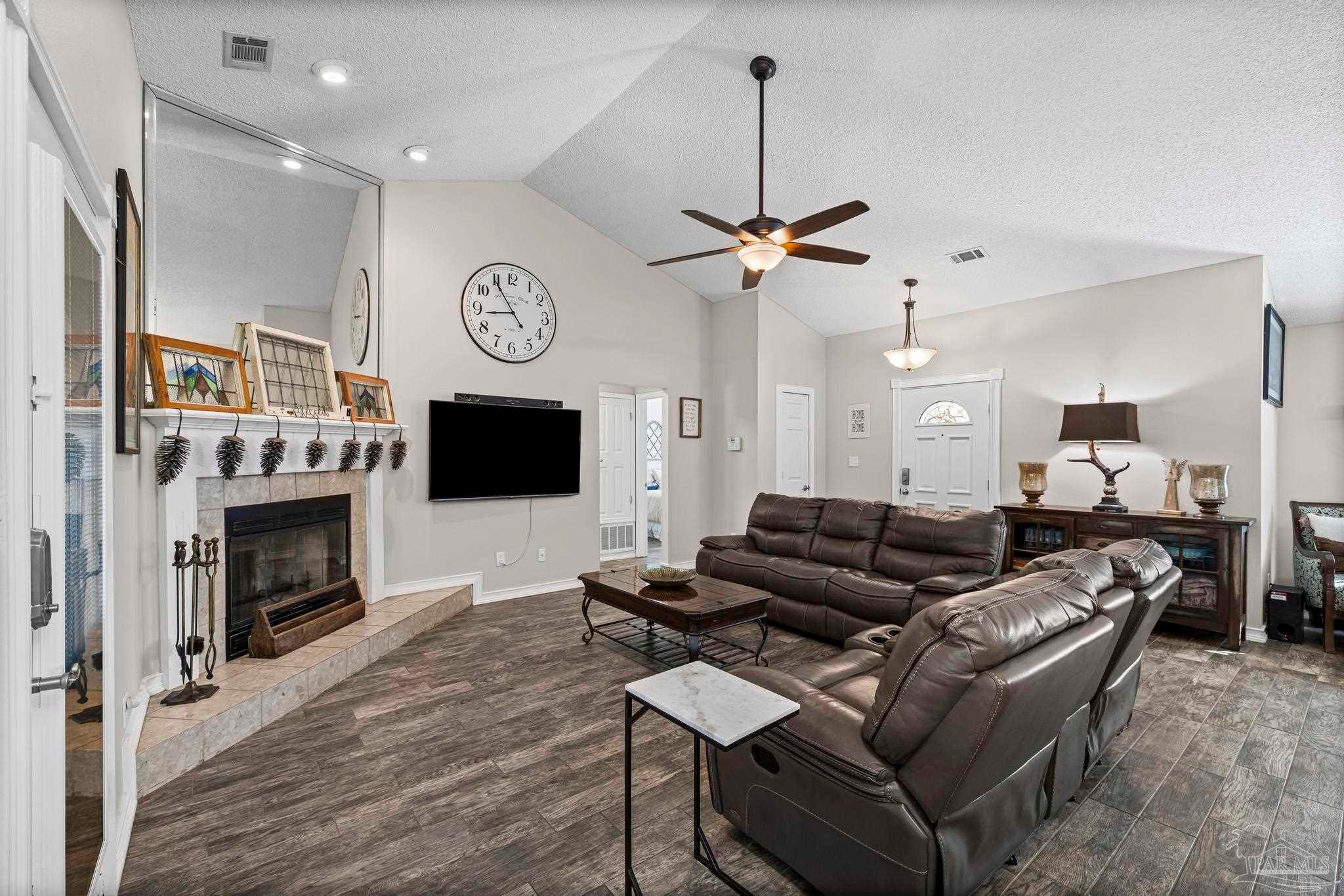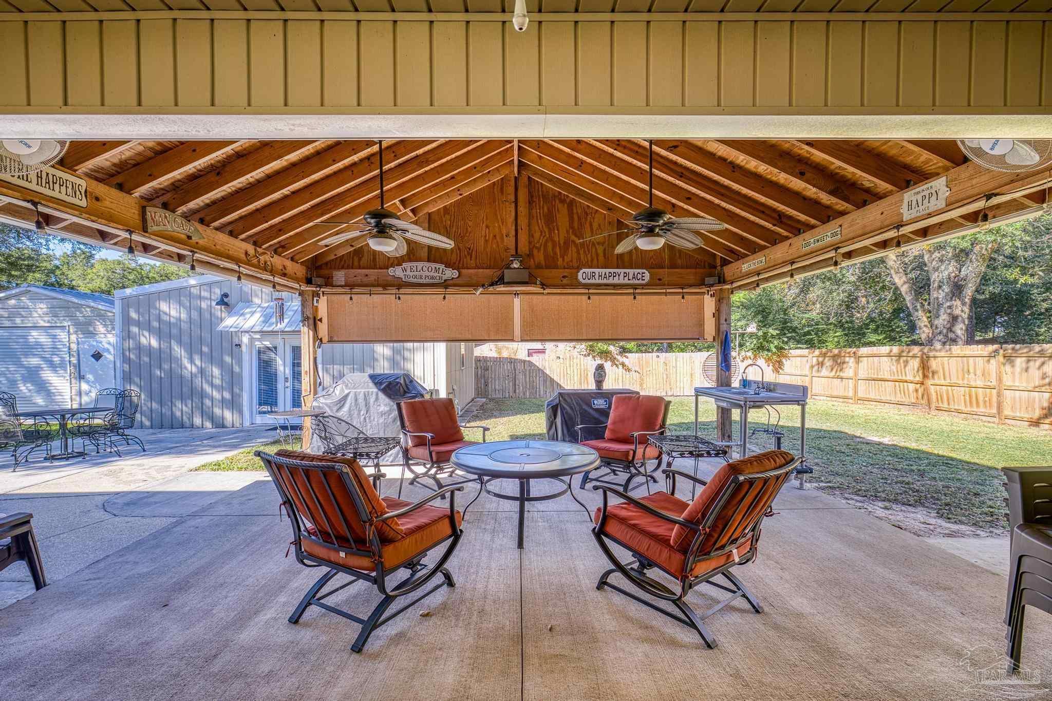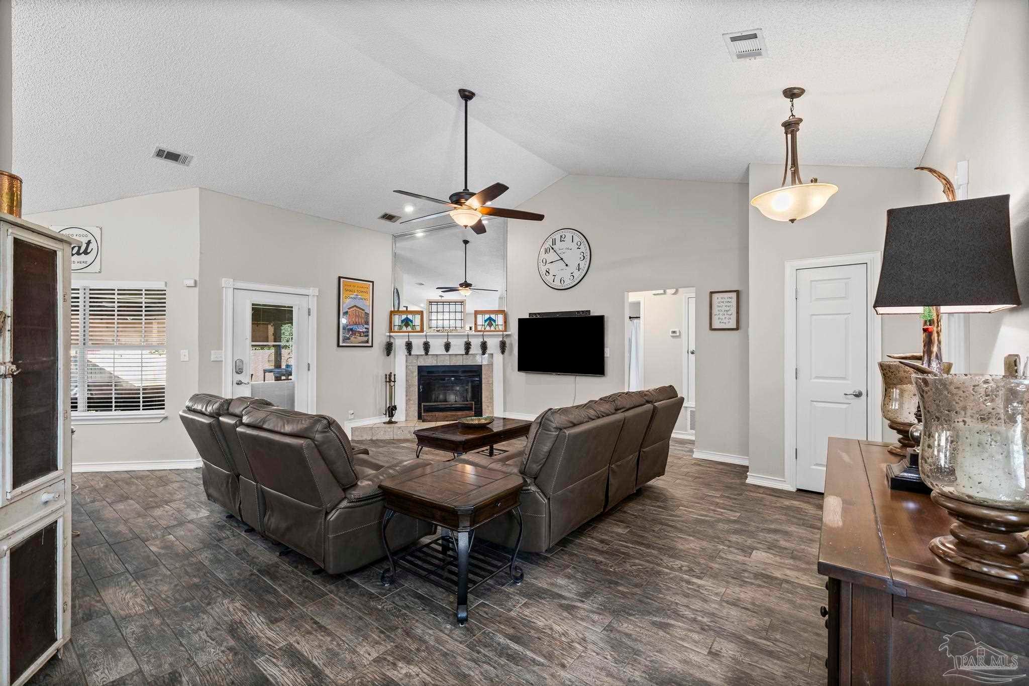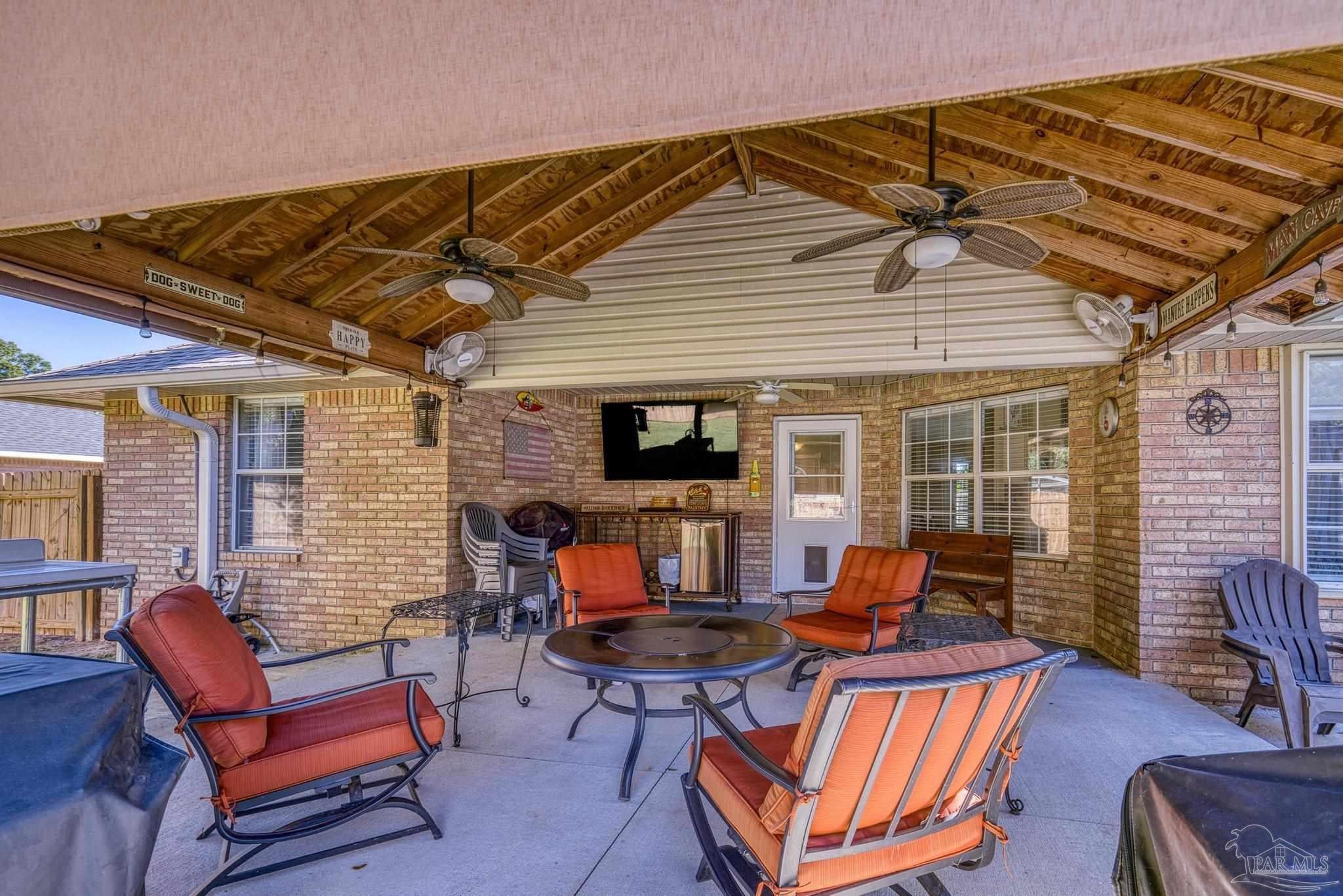 Welcome to this stunning brick family home in Pensacola, featuring 3 bedrooms, 2 bathrooms, and a spacious detached guest suite — perfect for extended family, visitors, or potential short-term rental income. Inside, you’ll find wood-look tile floors throughout, an open and inviting living area with a fireplace, and a fully renovated kitchen with granite countertops, stainless steel appliances, soft-close cabinets, and decorative tile flooring. Enjoy both a breakfast nook and a formal dining space, ideal for everyday living or entertaining. The primary bedroom suite offers a large walk-in closet, soaking tub, glass-enclosed tiled shower, and granite vanity. Two additional bedrooms and a second full bath provide comfortable space for family or guests. Step outside to your expansive covered patio with electrical, ceiling fans, and TV hookup — perfect for outdoor dining and relaxing. The fenced backyard features lush green space plus a 625 sq. ft. detached living unit with a kitchenette, full bathroom, dining and seating area, and its own mini-split HVAC system for heating and cooling. This versatile space has proven successful as a rental opportunity through third-party hosting platforms, offering excellent flexibility and added value. Additional features include a covered RV pad with full electrical hookups, a metal workshop building with power and roll-up door, and recent upgrades such as a new roof and hot water heater (2023) for worry-free ownership. This move-in ready Pensacola family home delivers it all — modern updates, outdoor living, guest or rental flexibility, and a prime location close to schools, shopping, and local beaches. Don’t miss the chance to make this your next home in Pensacola, FL.
