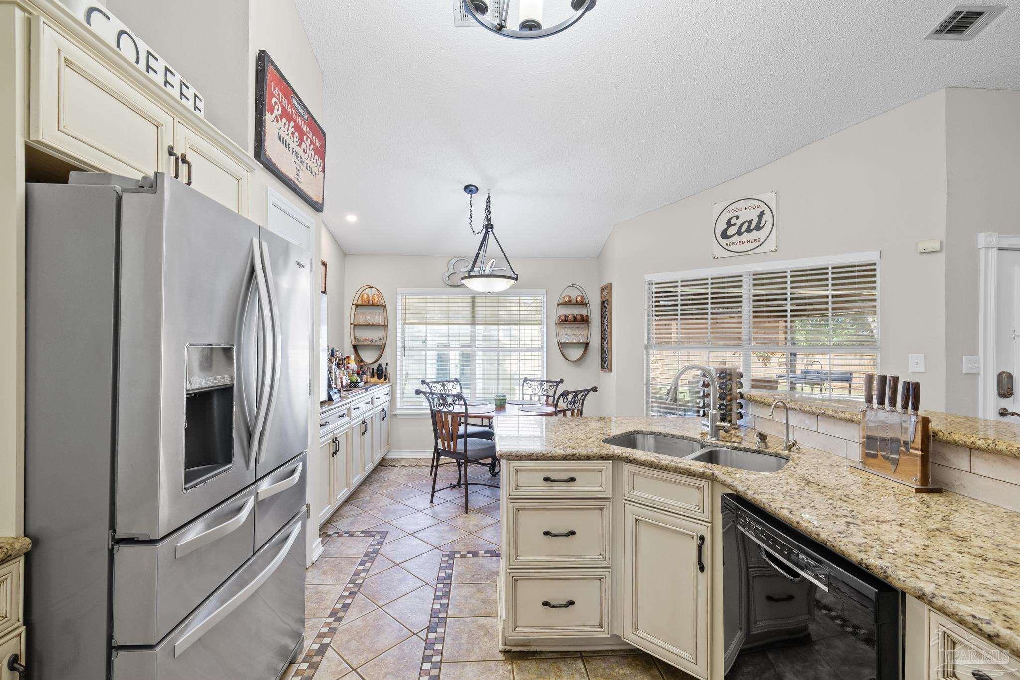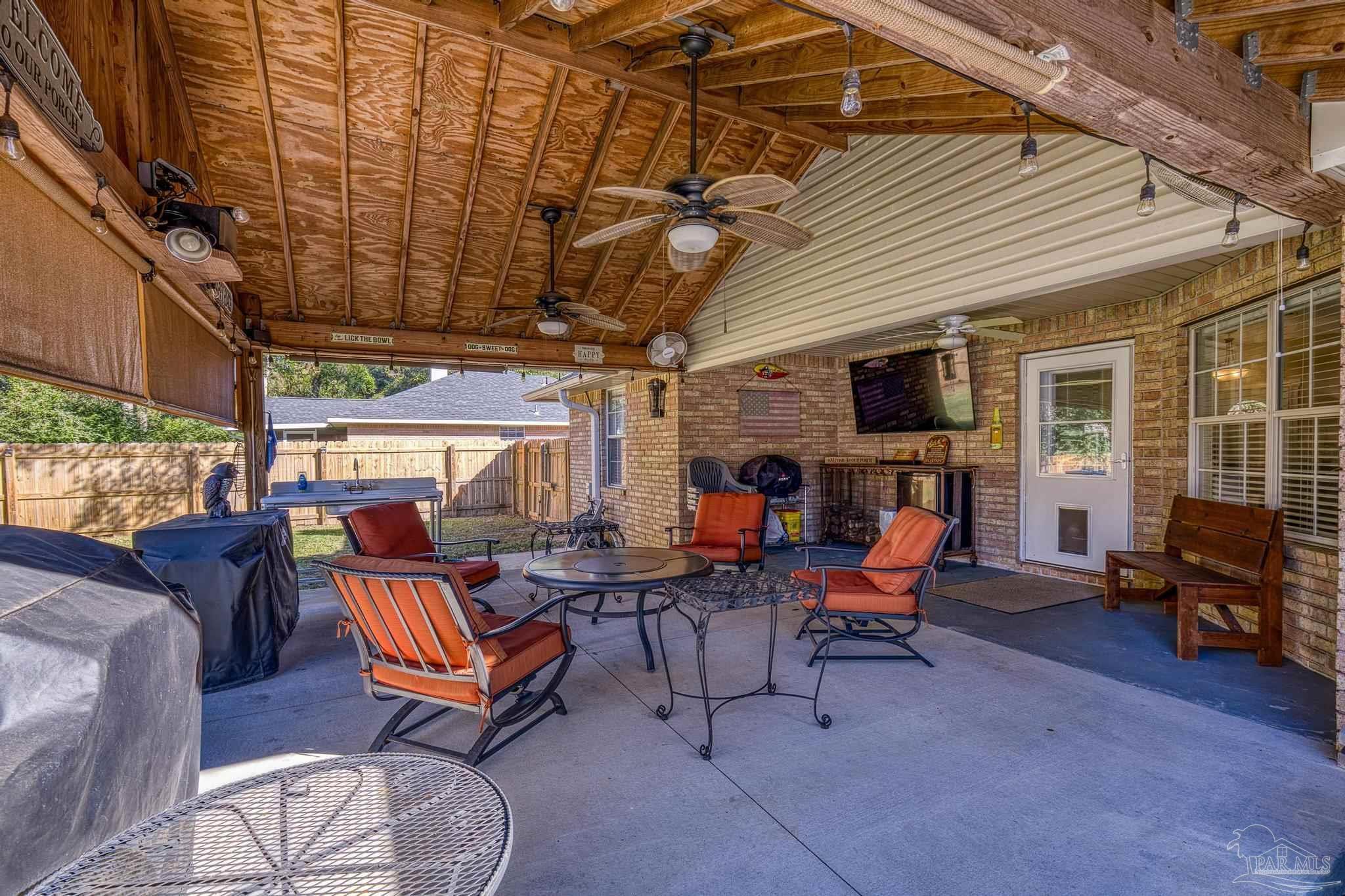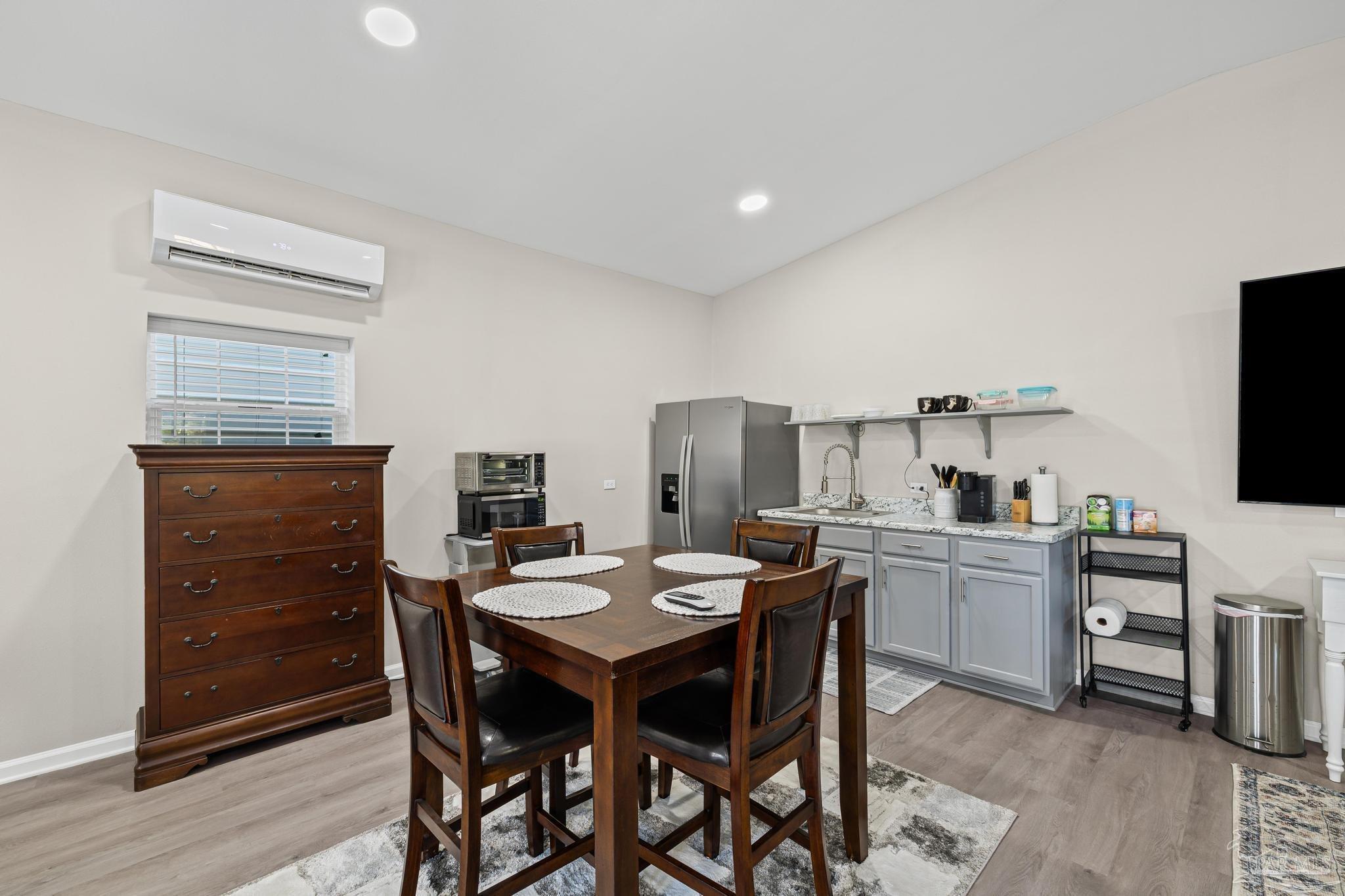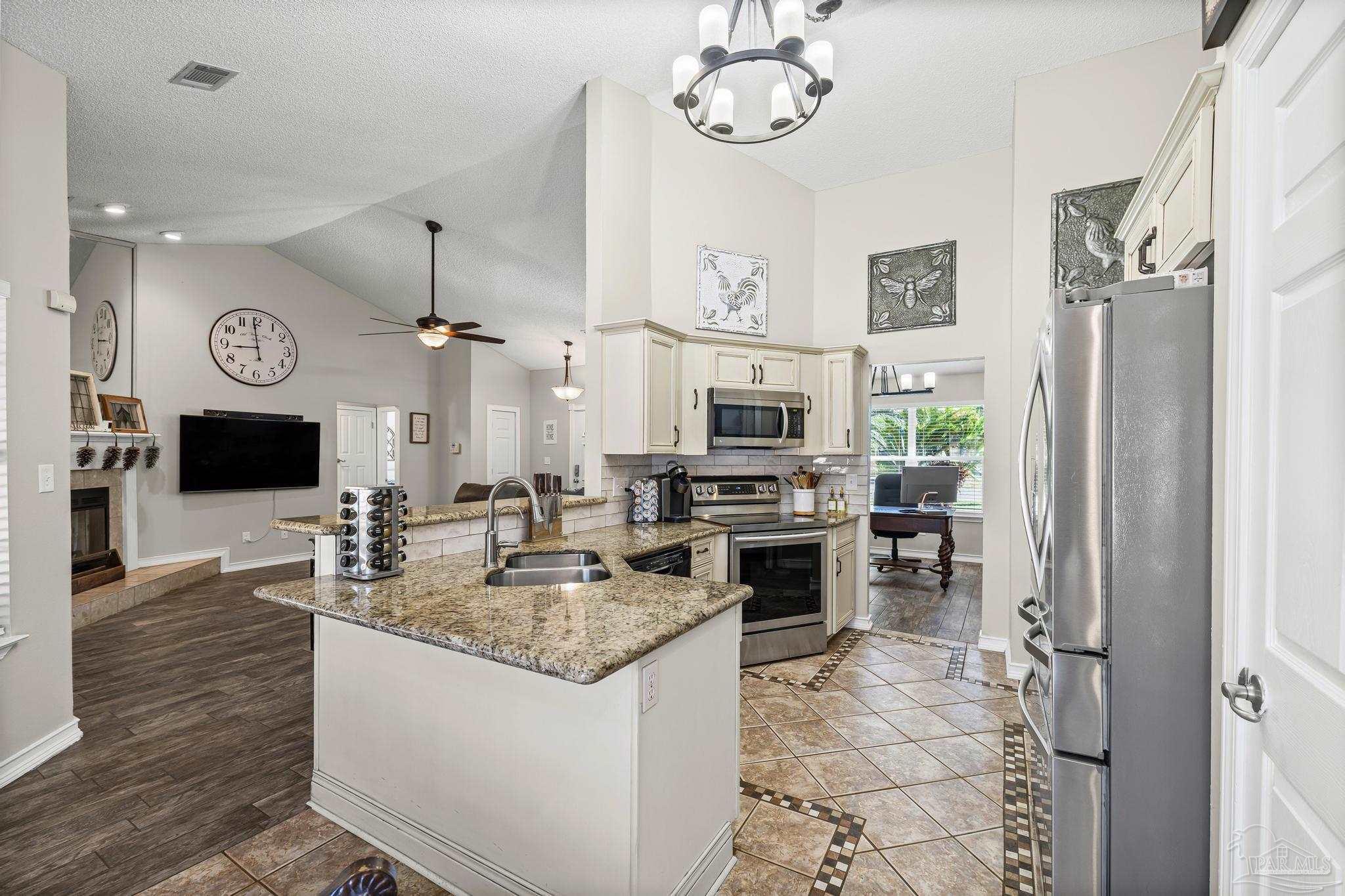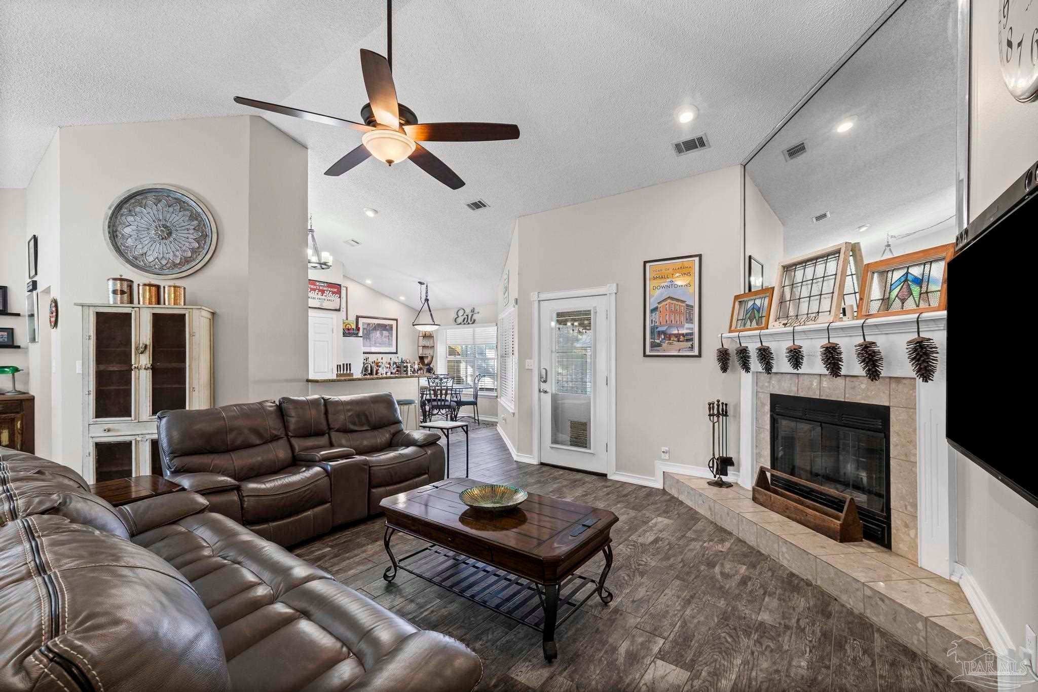 Welcome to this stunning brick family home in Pensacola, featuring 3 bedrooms, 2 bathrooms, and a spacious detached guest suite — perfect for extended family, visitors, or potential short-term rental income. Inside, you’ll find wood-look tile floors throughout, an open and inviting living area with a fireplace, and a fully renovated kitchen with granite countertops, stainless steel appliances, soft-close cabinets, and decorative tile flooring. Enjoy both a breakfast nook and a formal dining space, ideal for everyday living or entertaining. The primary bedroom suite offers a large walk-in closet, soaking tub, glass-enclosed tiled shower, and granite vanity. Two additional bedrooms and a second full bath provide comfortable space for family or guests. Step outside to your expansive covered patio with electrical, ceiling fans, and TV hookup — perfect for outdoor dining and relaxing. The fenced backyard features lush green space plus a 625 sq. ft. detached living unit with a kitchenette, full bathroom, dining and seating area, and its own mini-split HVAC system for heating and cooling. This versatile space has proven successful as a rental opportunity through third-party hosting platforms, offering excellent flexibility and added value. Additional features include a covered RV pad with full electrical hookups, a metal workshop building with power and roll-up door, and recent upgrades such as a new roof and hot water heater (2023) for worry-free ownership. This move-in ready Pensacola family home delivers it all — modern updates, outdoor living, guest or rental flexibility, and a prime location close to schools, shopping, and local beaches. Don’t miss the chance to make this your next home in Pensacola, FL.