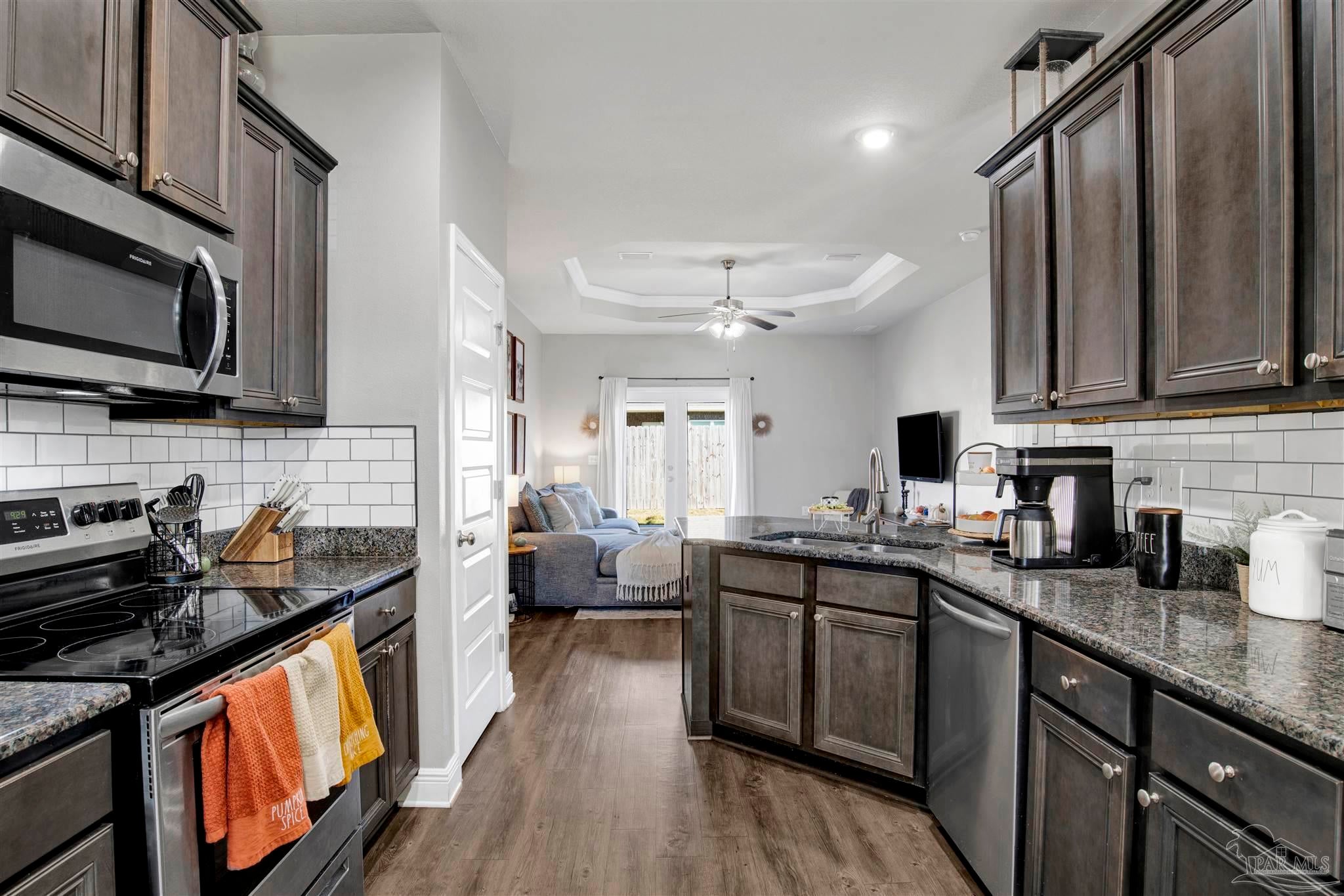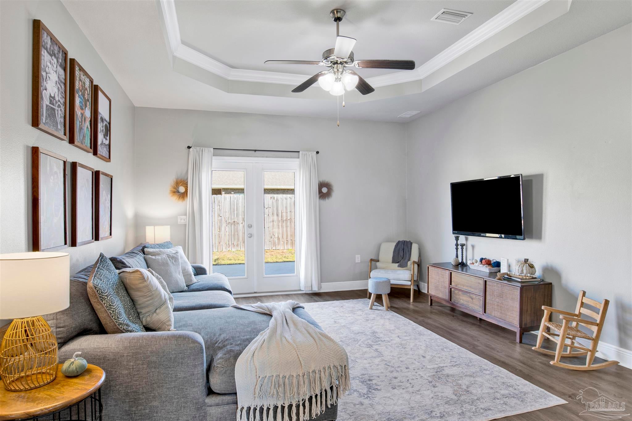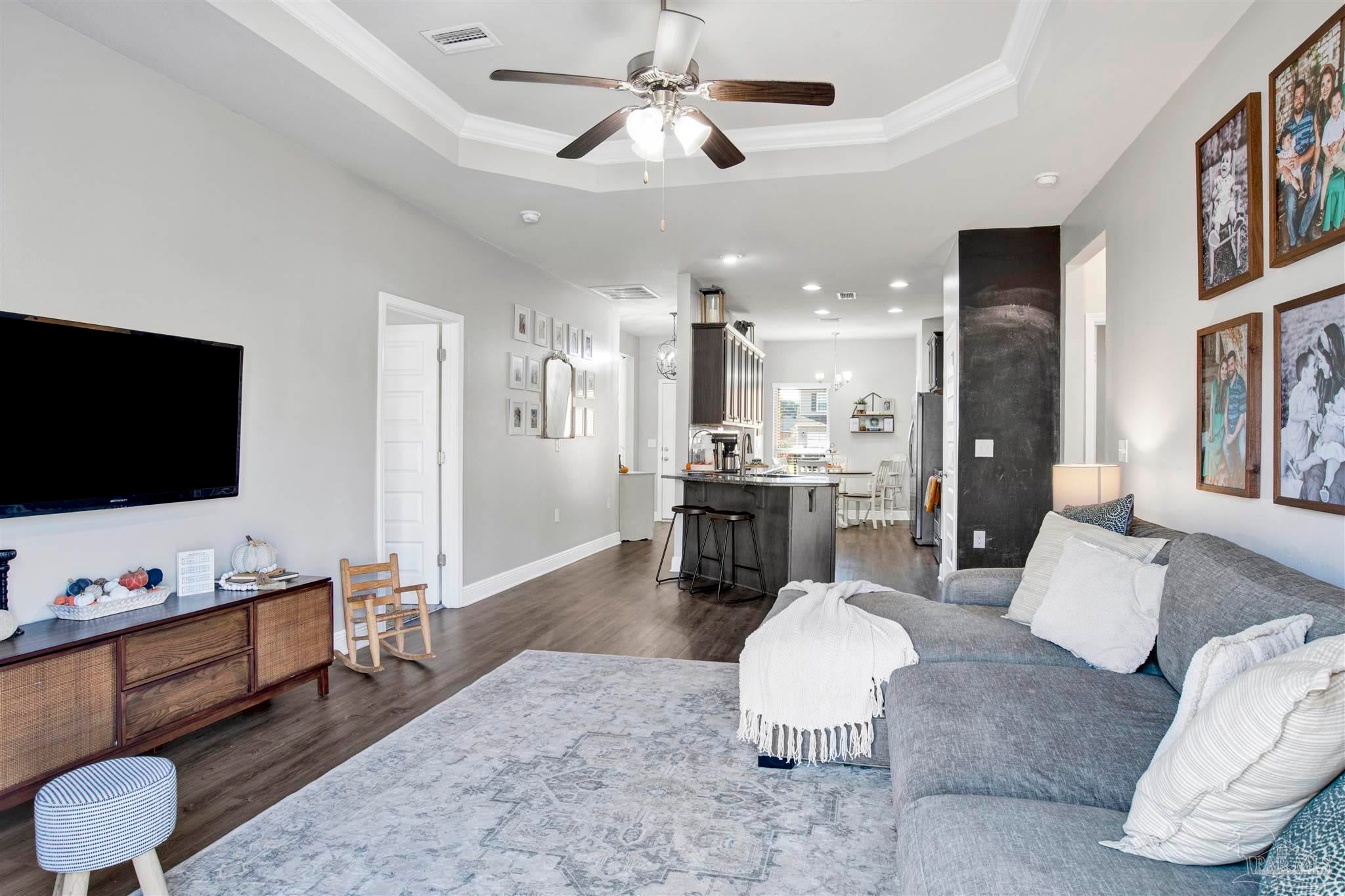 Welcome to this beautifully situated cul-de-sac home in the desirable Hawks Landing community. The neighborhood offers sidewalks and convenient proximity to local schools and nearby businesses, enhancing everyday ease and accessibility. Inside, you’ll discover an open, spacious floor plan anchored by a wrap-around granite kitchen with abundant cabinetry, stainless steel appliances, and a true pantry. The primary suite provides refined comfort with a tray ceiling enhanced by elegant crown molding, a walk-in closet, dual granite vanities, a separate garden tub and shower, and a private water closet. The versatile formal dining room can seamlessly function as a den, home office, study, playroom, or hobby space—tailored to your lifestyle. This all-brick home also includes Fabric Shield hurricane protection for added peace of mind. Schedule your private showing today.