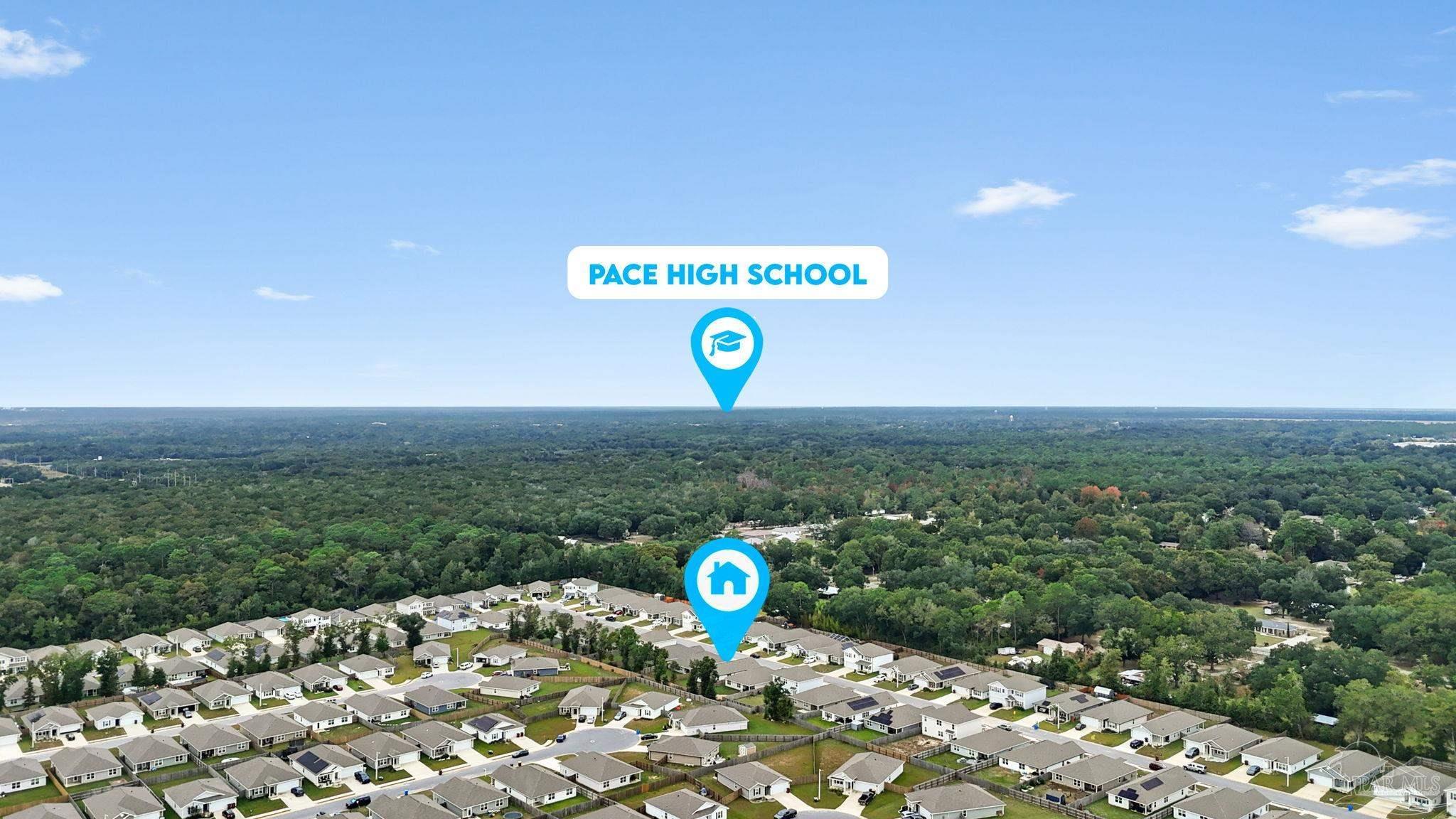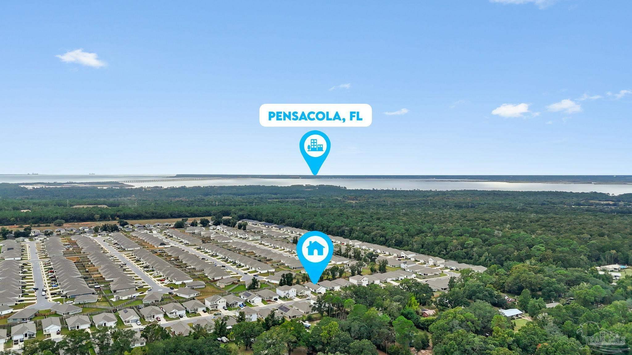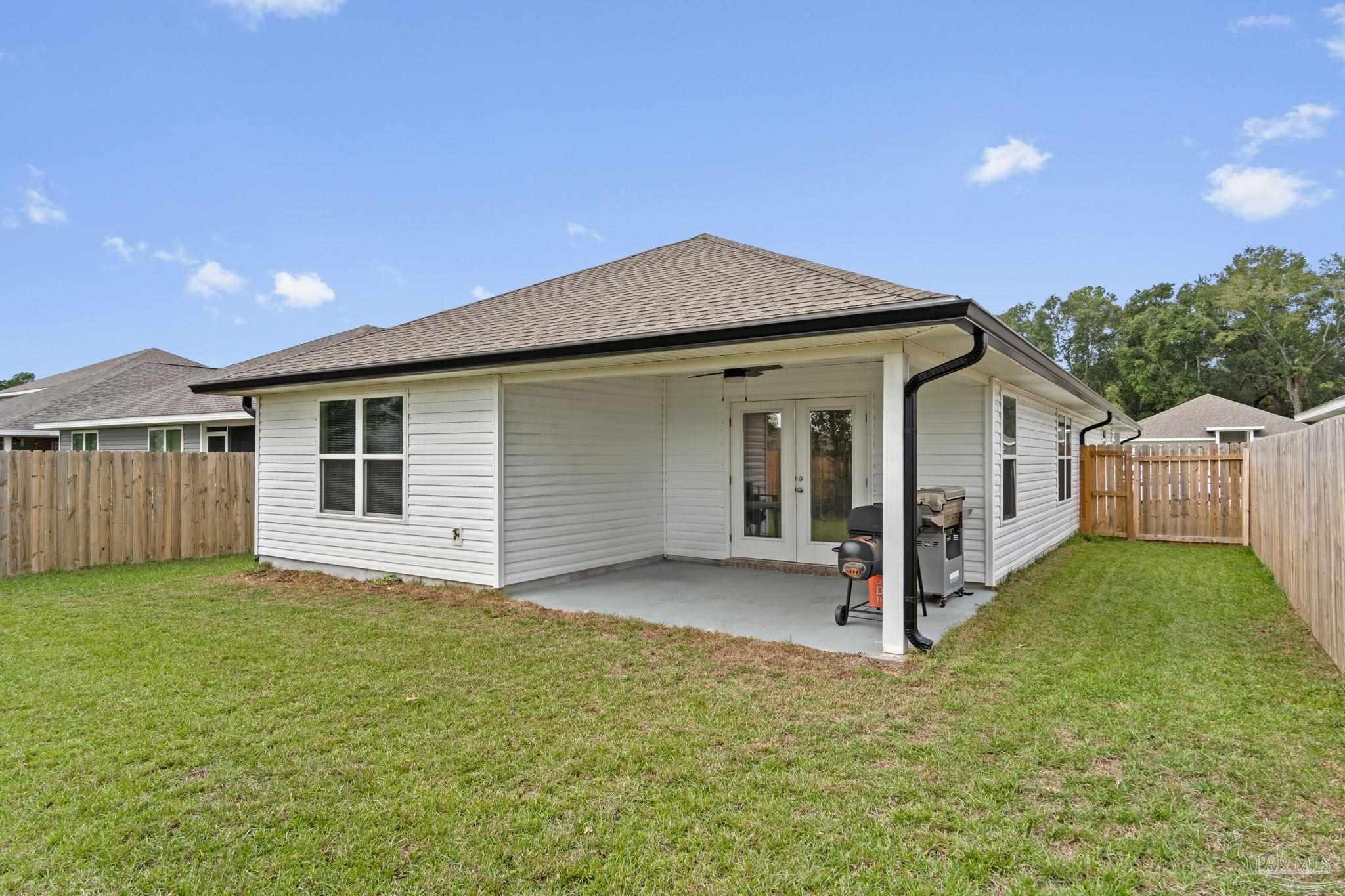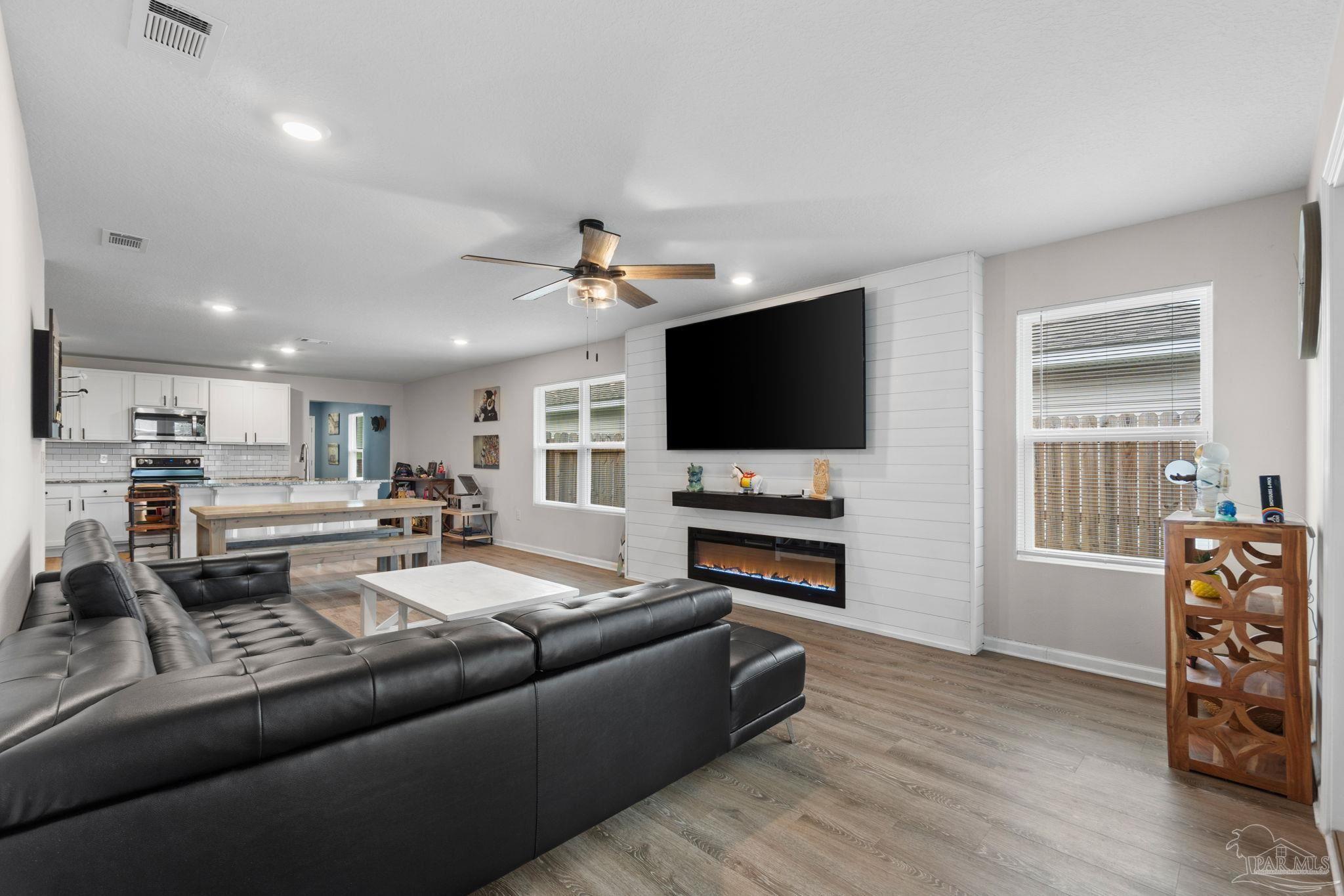 Welcome home to this beautifully updated 3 bedroom, 2 bathroom home in the sought-after Woodlands community, centrally located in Pace and just minutes from I-10, Hwy 90, NAS Whiting Field, UWF, shopping, restaurants, and the Emerald Coast’s stunning beaches. As you enter the neighborhood, you’ll appreciate the inviting sidewalks, streetlights, underground utilities, and access to a community park, playground, and splash pad - perfect for enjoying warm Florida days. Built in 2022, this home feels better than new and features a desirable split floor plan and luxury vinyl plank flooring throughout the main living areas. The spacious kitchen is a showstopper with upgraded granite countertops, a stylish subway tile backsplash, stainless steel appliances, a large walk-in pantry, and a generously sized island ideal for meal prep and gathering. The open layout flows seamlessly into the living room, where you’ll find a built-in electric fireplace surrounded by floor to ceiling shiplap and a massive 85” mounted smart TV that conveys with the home. The primary suite offers a peaceful retreat with space for a king-sized bed and an ensuite bathroom featuring double vanities, a walk-in shower, private water closet, and a large walk-in closet. Two additional guest bedrooms share a full bathroom, providing comfort and flexibility for family or visitors. The interior laundry room includes a conveying washer and dryer for added convenience. Step outside to a covered back patio overlooking the fully fenced backyard, an ideal spot for relaxing or entertaining. This move-in ready home combines modern style, thoughtful upgrades, and an unbeatable location. Schedule your showing today! (living room tv, washer, dryer, and cameras all convey, all other furniture negotiable!)