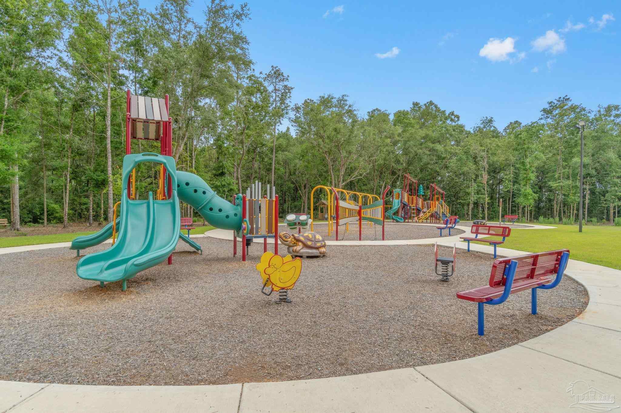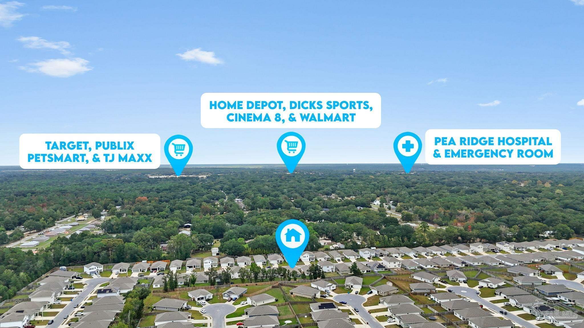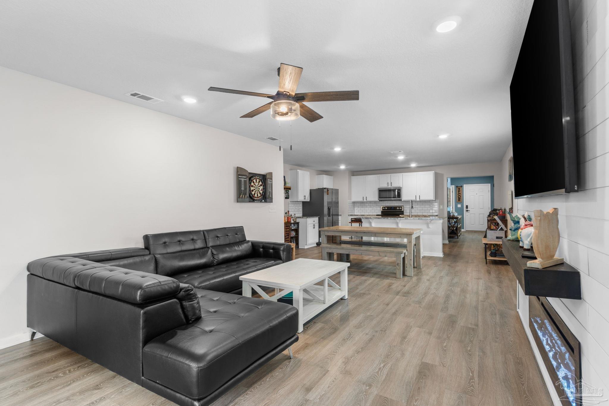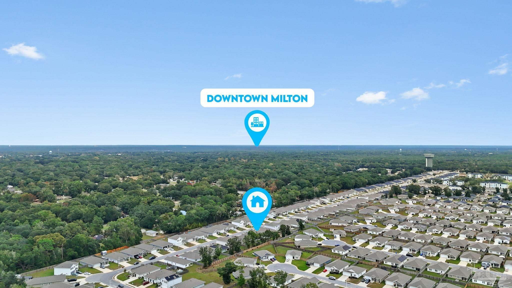 Welcome home to this beautifully updated 3 bedroom, 2 bathroom home in the sought-after Woodlands community, centrally located in Pace and just minutes from I-10, Hwy 90, NAS Whiting Field, UWF, shopping, restaurants, and the Emerald Coast’s stunning beaches. As you enter the neighborhood, you’ll appreciate the inviting sidewalks, streetlights, underground utilities, and access to a community park, playground, and splash pad - perfect for enjoying warm Florida days. Built in 2022, this home feels better than new and features a desirable split floor plan and luxury vinyl plank flooring throughout the main living areas. The spacious kitchen is a showstopper with upgraded granite countertops, a stylish subway tile backsplash, stainless steel appliances, a large walk-in pantry, and a generously sized island ideal for meal prep and gathering. The open layout flows seamlessly into the living room, where you’ll find a built-in electric fireplace surrounded by floor to ceiling shiplap and a massive 85” mounted smart TV that conveys with the home. The primary suite offers a peaceful retreat with space for a king-sized bed and an ensuite bathroom featuring double vanities, a walk-in shower, private water closet, and a large walk-in closet. Two additional guest bedrooms share a full bathroom, providing comfort and flexibility for family or visitors. The interior laundry room includes a conveying washer and dryer for added convenience. Step outside to a covered back patio overlooking the fully fenced backyard, an ideal spot for relaxing or entertaining. This move-in ready home combines modern style, thoughtful upgrades, and an unbeatable location. Schedule your showing today! (living room tv, washer, dryer, and cameras all convey, all other furniture negotiable!)