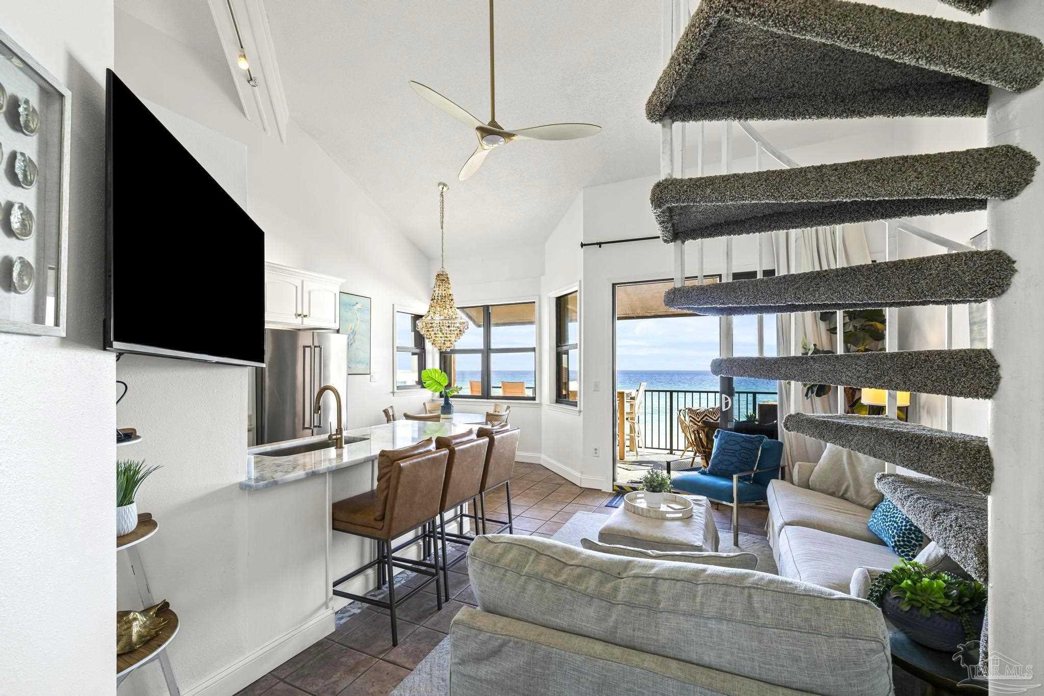 Welcome to your luxury Gulf-front escape at 1199 Fort Pickens Road, Unit 402, perfectly positioned along the sugar-white sands of Pensacola Beach. This top-floor, loft-style residence captures sweeping views of the Gulf of Mexico from nearly every angle and offers the ideal blend of personal retreat and investment performance. Step inside to an airy open-concept living space with soaring ceilings, walls of glass, and a private balcony where you can watch dolphins play and sunsets paint the horizon. The updated kitchen features stainless steel appliances, new stone countertops, and bar seating, seamlessly connecting to the dining and living areas for effortless entertaining. Upstairs, the lofted primary suite serves as a tranquil retreat with a spacious en-suite bath and dual vanities. A comfortable guest bedroom and full bath on the main level provide privacy and flexibility for family or guests. Offered fully furnished and turn-key, this residence is an established short-term rental generating over $90,000 in annual gross income, making it an exceptional opportunity for those seeking both lifestyle and return. Guests love the split-level design, high ceilings, and panoramic Gulf views that make every stay unforgettable. The Gulf Winds community offers resort-style amenities including a sparkling beachfront pool, sundeck, elevator, and private beach access directly to the Gulf of Mexico. A dedicated covered parking space, additional guest parking, metal roof, newer sliding glass doors, and hurricane shutters provide added peace of mind. Located just minutes from Casino Beach, Peg Leg Pete’s, and historic downtown Pensacola, this residence offers the ultimate coastal lifestyle. Whether a private beachfront haven or proven investment property, Unit 402 delivers the best of Gulf-front living—where every sunrise feels like your own private escape. MORE PICTURES TO BE UPLOADED. LENDER PAID BUY-DOWN AVAILABLE