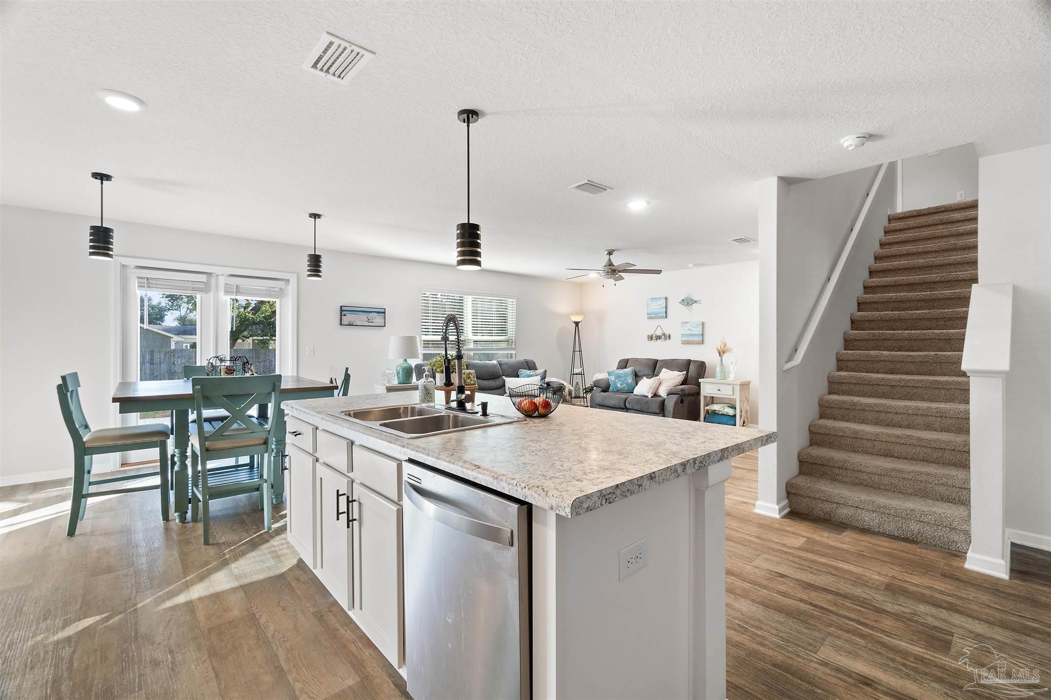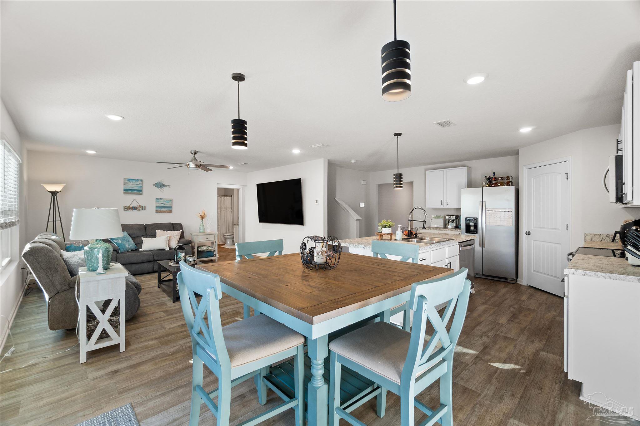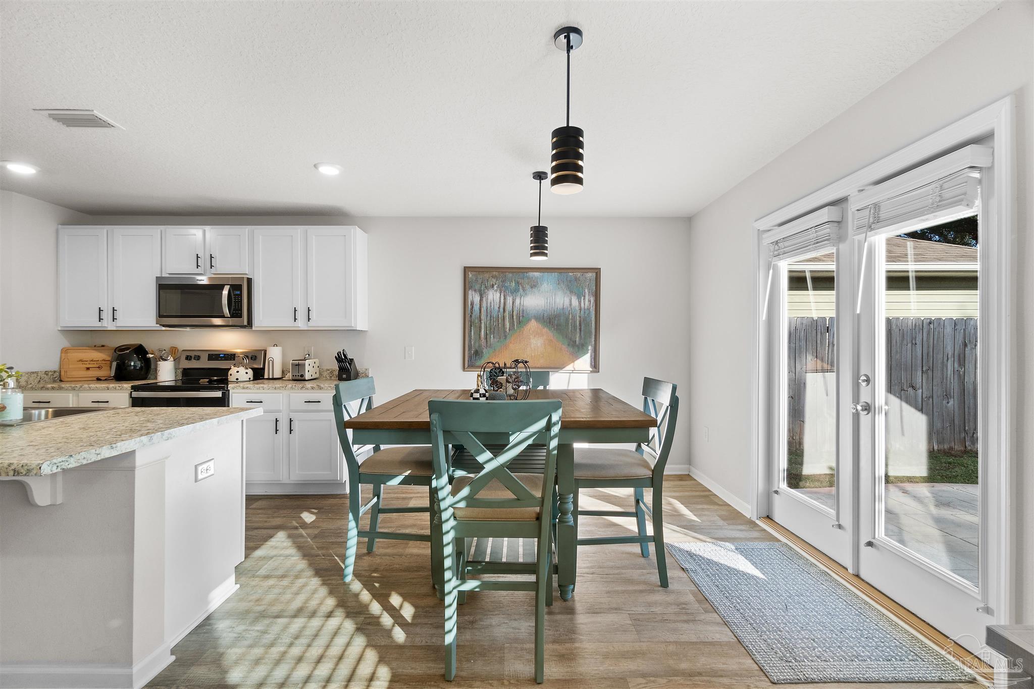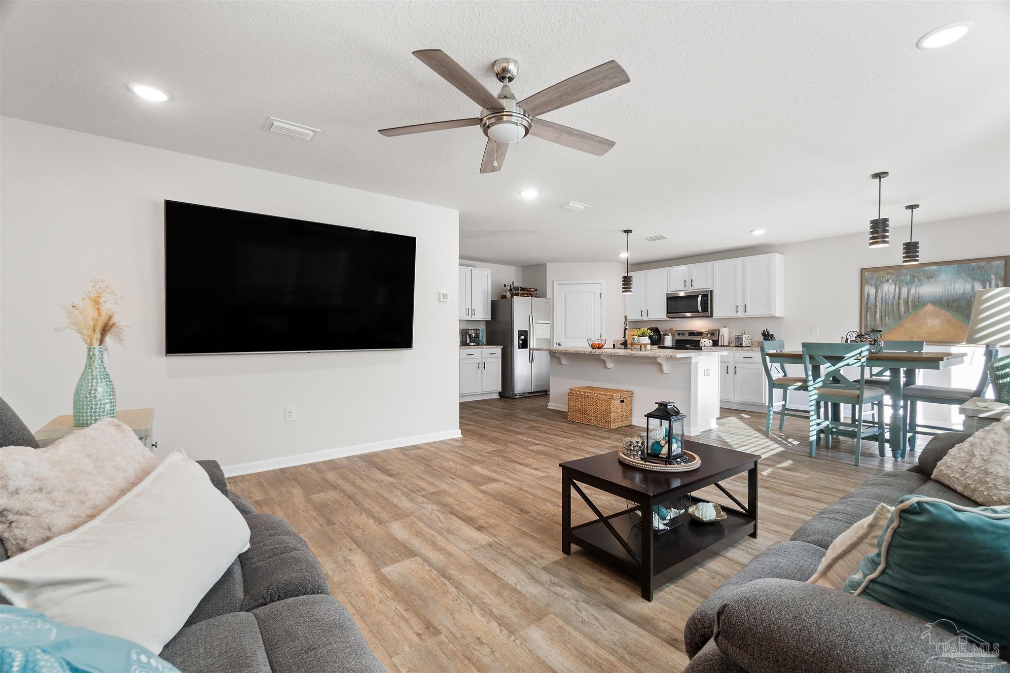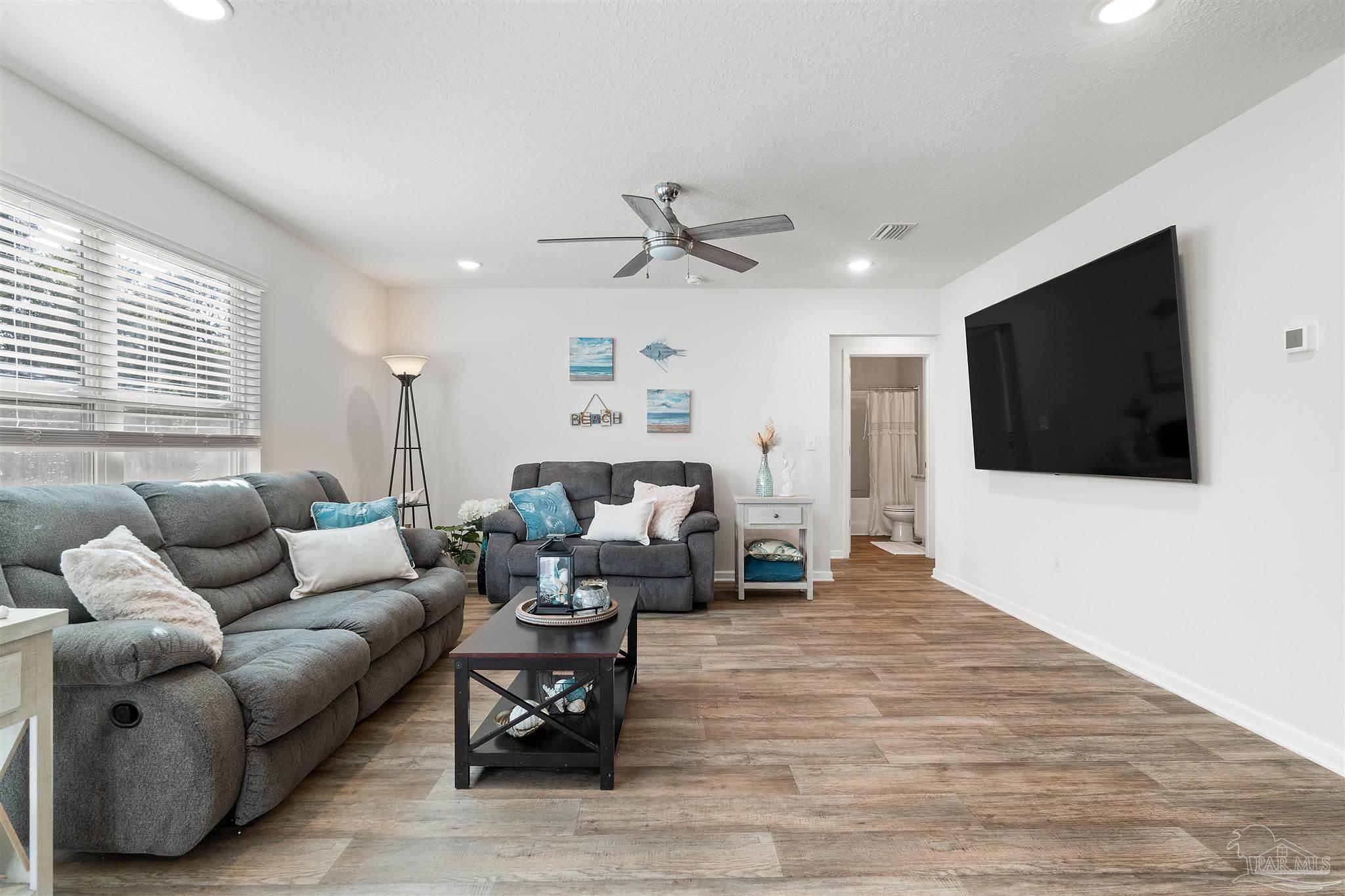 Discover the perfect blend of comfort and convenience in this well-maintained 5-bedroom, 3-bathroom home, located in the heart of Pensacola. Enjoy unmatched proximity to pristine beaches, vibrant shopping, military bases, and the airport—everything you need is just moments away. Step inside to an expansive open-concept floor plan crafted for seamless entertaining. Dual living rooms—one on each level—offers abundant space, complemented by another versatile bonus room perfect for a home office, playroom, or media center. Host unforgettable game days: whip up snacks in the gourmet kitchen while staying fully engaged with guests and the action. The kitchen boasts modern updated lighting, a spacious center island, large corner pantry, sleek stainless-steel appliances, and ample storage. Escape to the outdoors in your private backyard oasis, designed for year-round enjoyment of Florida’s sunshine. Fire up the grill, challenge friends to corn hole, and gather on the expanded patio, all within the security of a fully enclosed privacy fence. Unwind in the luxurious primary suite—your personal retreat—featuring an en-suite bath with double vanity, separate shower, and generous walk-in closet. Four additional bedrooms provide flexibility for family, guests, or home gyms, including one conveniently located on the main floor for easy accessibility. This exceptional home won’t last—schedule your private showing today and step into your Pensacola dream!