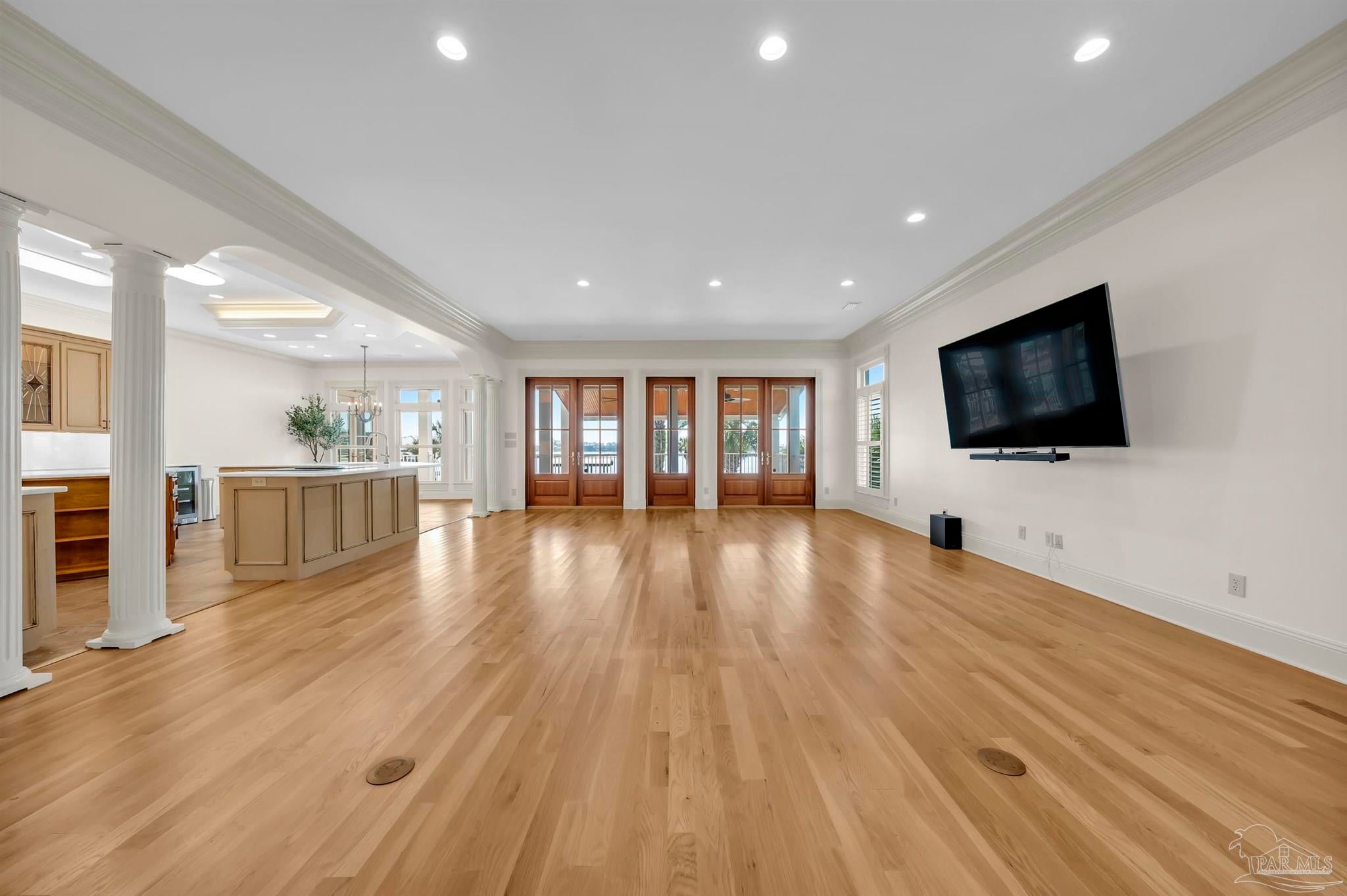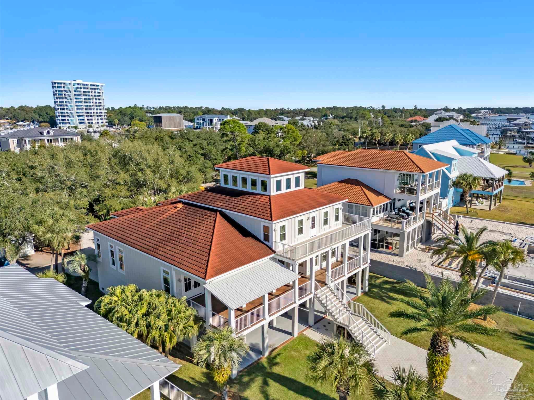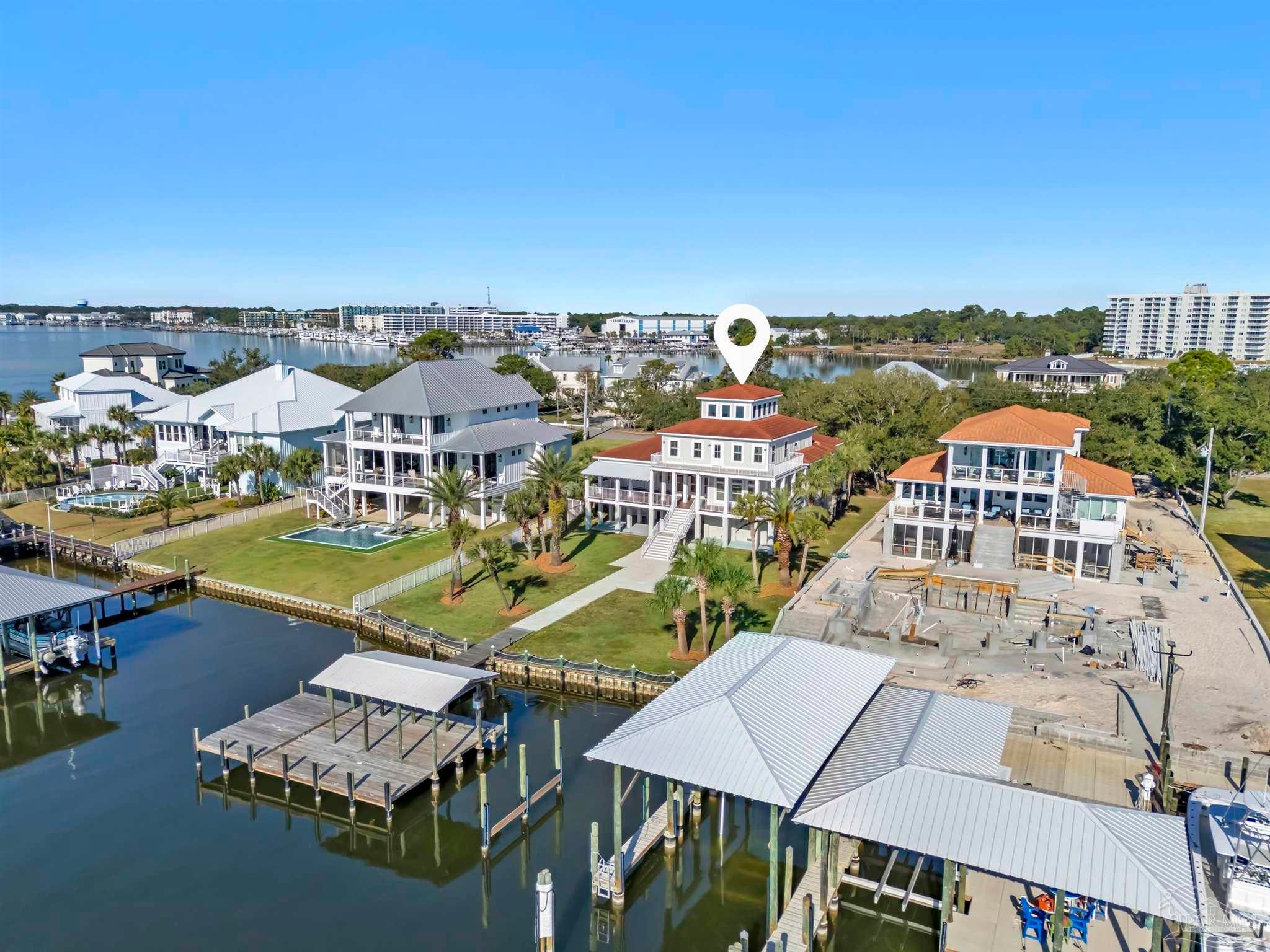 Very rare opportunity on deep, open water with easy access to Perdido Pass and the Gulf of Mexico! Luxury abounds in this one-of-a-kind coastal retreat where no detail has been overlooked. This expansive 4-bedroom, 4-full and 2-half-bath home (potential for 5th bedroom) is set on a beautifully landscaped lot with approx. 90 ft of waterfront on Bayou St. John and features a new deep-water boat dock with slip. Enjoy real wood floors, custom crown molding, and a third-floor observation room offering 360° views of Terry Cove, Johnson Cove, and the Gulf. Impact windows and doors throughout. Spacious bedrooms include a private en-suite and balcony with stunning water views. The elegant wood-paneled elevator accommodates multiple passengers and is handicap accessible. A bonus room with vaulted wood ceiling and arched window enhances the coastal character. The chef’s kitchen boasts imported Brazilian white marble counters, under-counter wine cooler, abundant prep space, and breathtaking water views—ideal for gatherings or entertaining. The 3300 sq ft., 6-car heated and cooled garage offers epoxy floors, half bath, extensive storage, space for rod room, boats, and in-home gym. Step outside to enjoy waterfront activities, outdoor shower, and reinforced bulkhead. The first-floor primary suite features a Bain Swedish spa tub, multi-head shower with exceptional water pressures. Additional highlights include a formal dining room (or study), custom “Birds of Paradise” wrought iron staircase inspired by the Pontalba Building in New Orleans, central vac system, and dedicated laundry and cleaning closet with utility sink. A true coastal masterpiece built for comfort, elegance, and the ultimate waterfront lifestyle.