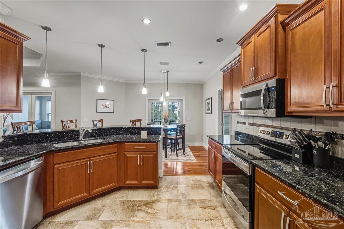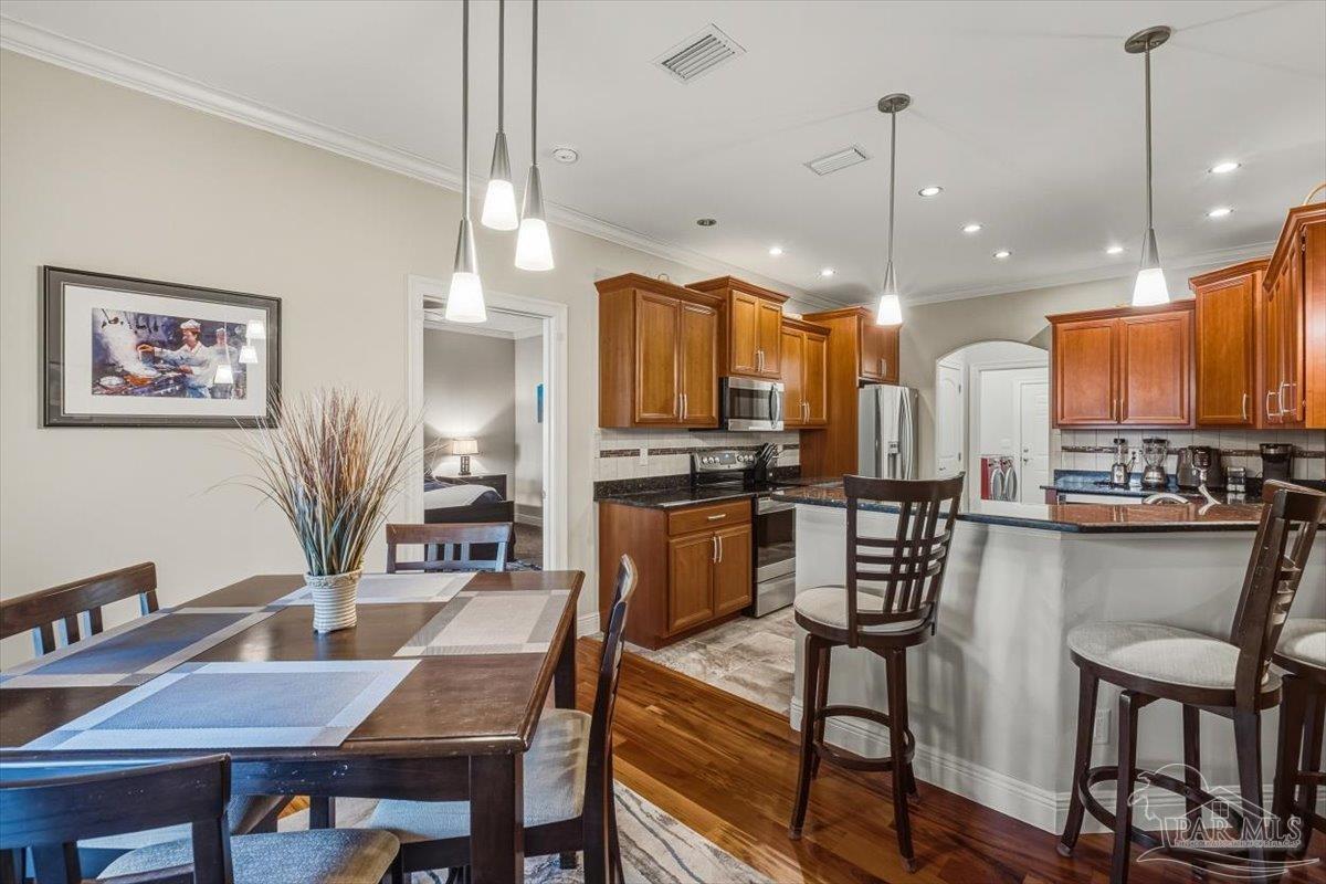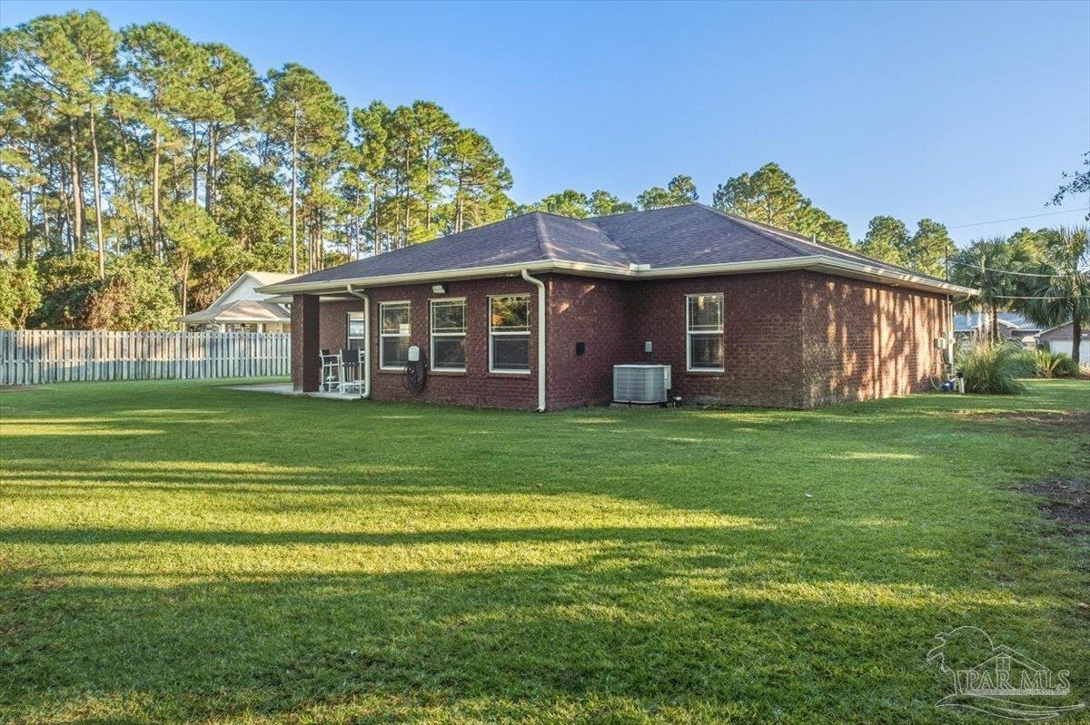 Custom Quality East Navarre! Attention to every detail has been given to this 4 bedroom all brick on one half acre with impact windows and high-end custom features throughout. Spacious living room has high 10-ft trey ceiling, crown molding, double French doors to Florida room, electric fireplace and imported Brazilian wood flooring throughout the living room, Florida room, and dining room. High 9-ft and 10-ft ceilings with crown molding throughout the home give a feeling of space and elegance. The Florida room has a wall of windows overlooking wooded back yard and has access to the covered porch. The dining area has French doors with access to the backyard. The kitchen will delight the chef with expansive breakfast bar, custom cut granite counter tops, custom made tall all wood cherry soft close cabinets, beverage cooler, high end Kenmore Elite stainless appliances including refrigerator, and pantry. The generous Master has high 10-ft trey ceiling with crown, sitting area and luxury bath with floor to ceiling tiled shower, tiled garden tub, granite top double vanity, custom cabinets, walk in closet and water closet. One of the guest bedrooms is off the foyer and serves as a flex area for office, fitness, or playroom. The other two guest bedrooms share a bath with granite top vanity. Impact windows, solid core doors, laundry with laundry sink washer & dryer, surround sound in Florida room, Led lighting fixtures, 4 zone irrigation system, efficient 50-gallon heat pump water heater, spray foam insulation, plus much more. Located in East Navarre convenient to bases, schools, shopping and Navarre Beach with white sugar sand beaches and turquoise water. Opportunity for those who appreciate top quality.