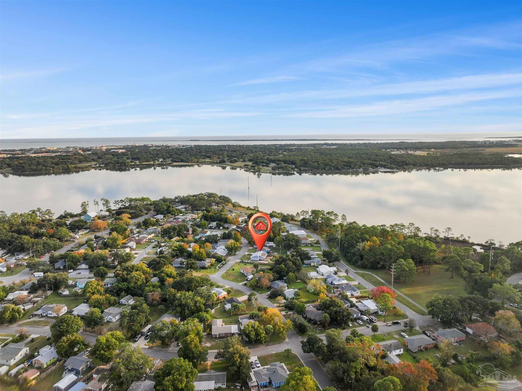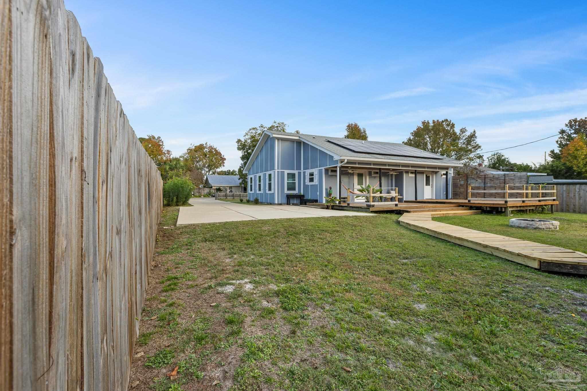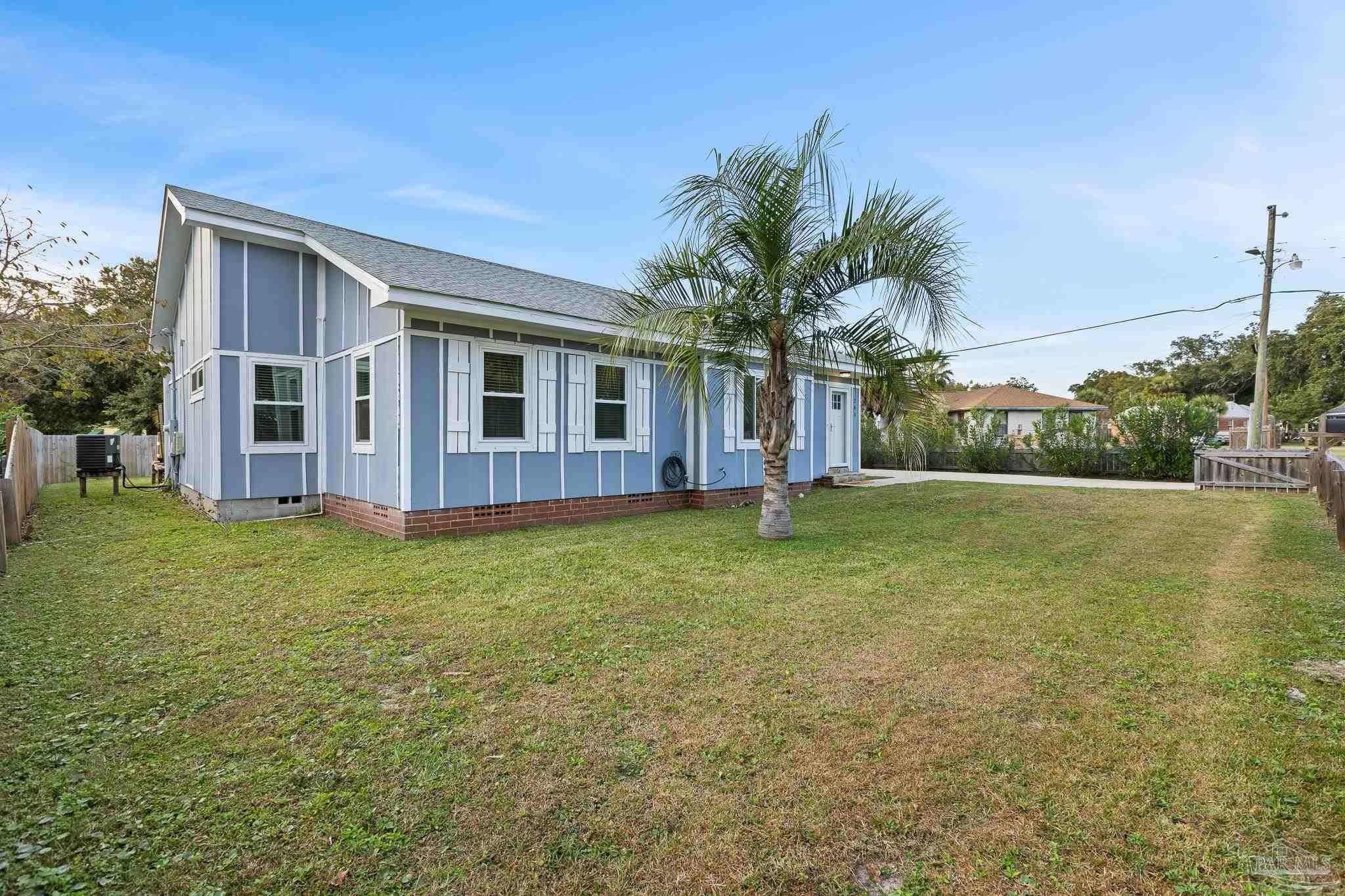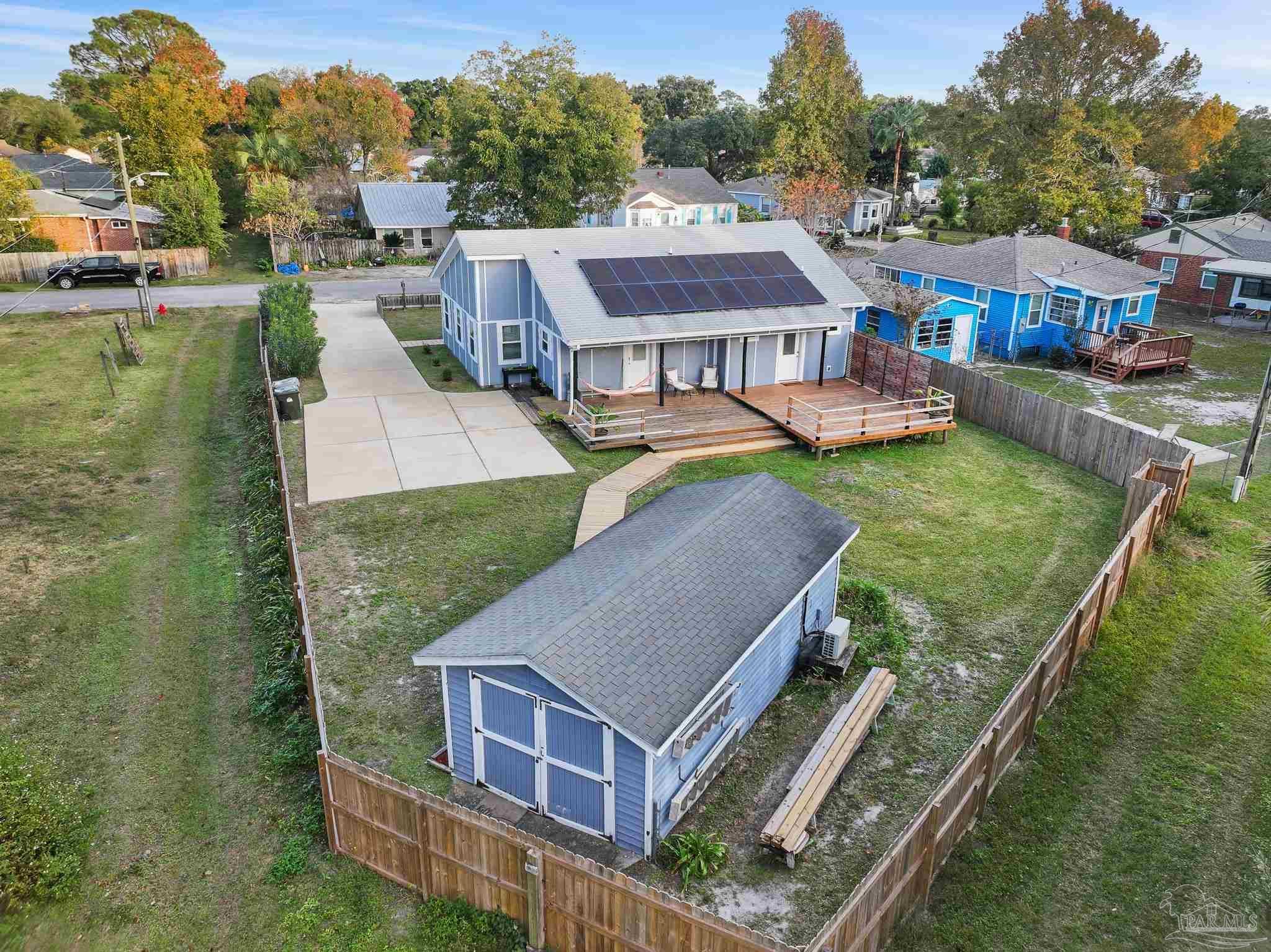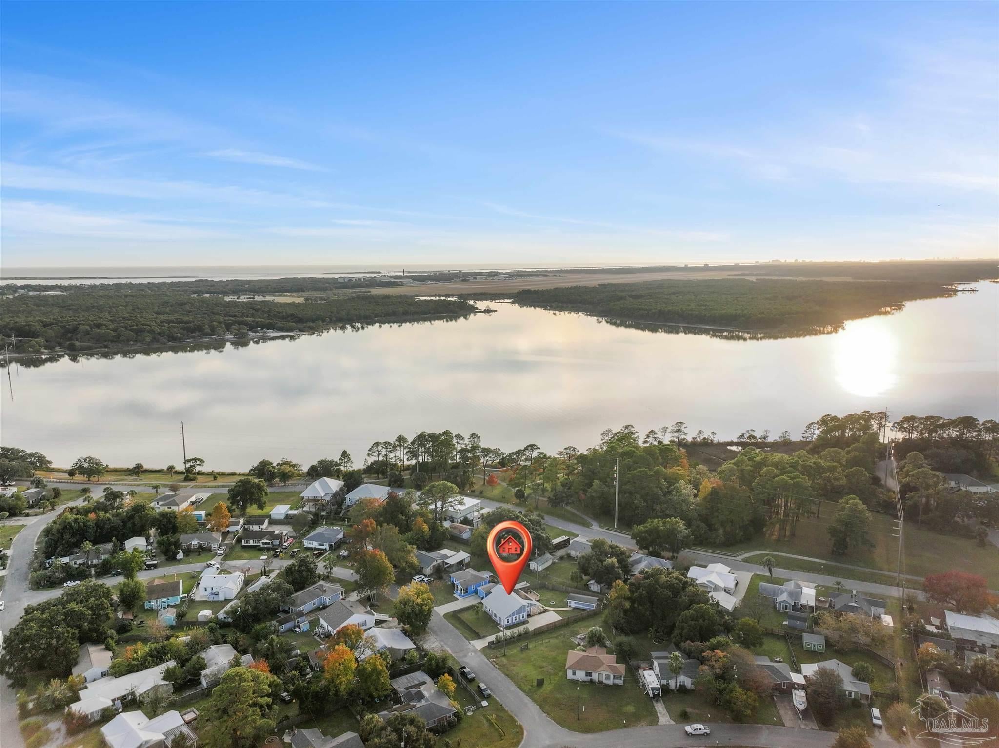 Gorgeous Navy Point home just one block from the beautiful waters of Bayou Grande, Pensacola Bay, and the Gulf! This 2 bedroom, 2 bath home was completely rebuilt in 2015 with new roof, plumbing, HVAC, and electrical. Since then, the owners have added new solar panels, hurricane-resistant windows, new exterior doors with a front storm door, and metal hurricane shutters. Inside, you’ll find an open floor plan with 20-ft ceilings and hardwood floors throughout. The kitchen features granite countertops, stainless steel appliances, and double ovens, along with a walk-in pantry and separate laundry room. spacious primary suite offers dual vanities, two walk-in closets, and an oversized custom-tiled walk-in shower. The attic was built with a potential third bedroom and bathroom in mind, complete with vaulted ceilings and plumbing. A detached building with a closet makes an ideal office or guest space. Enjoy exceptional privacy in the oversized fenced backyard with an end-to-end deck, fire pit, and partial water view. The long driveway and reinforced parking pad are ready for a future carport or garage. Living in Navy Point means access to a waterfront walking and biking trail, boat launch, playground, and multiple beach access points—all maintained by Escambia County. This highly sought-after neighborhood offers a true coastal lifestyle.