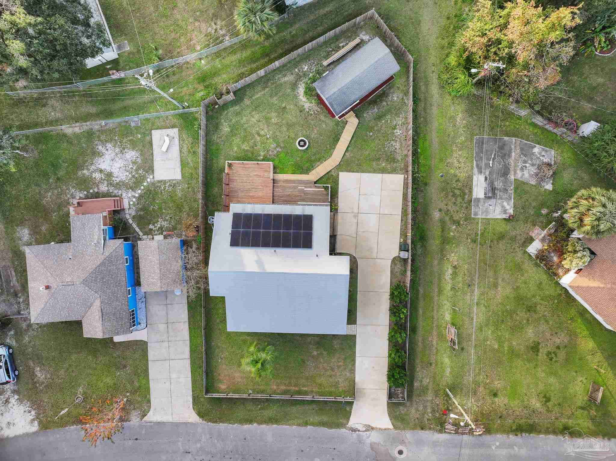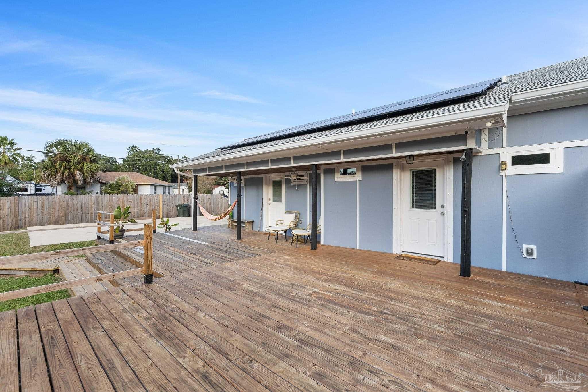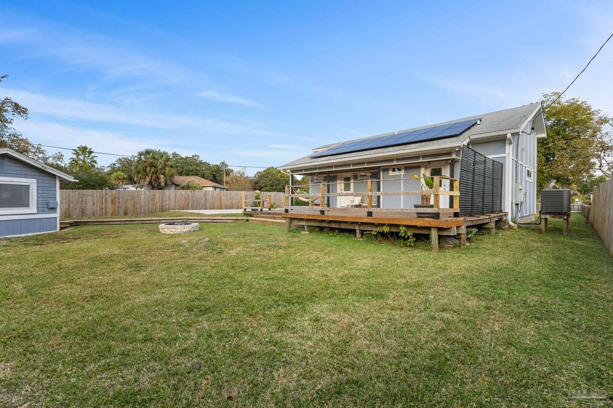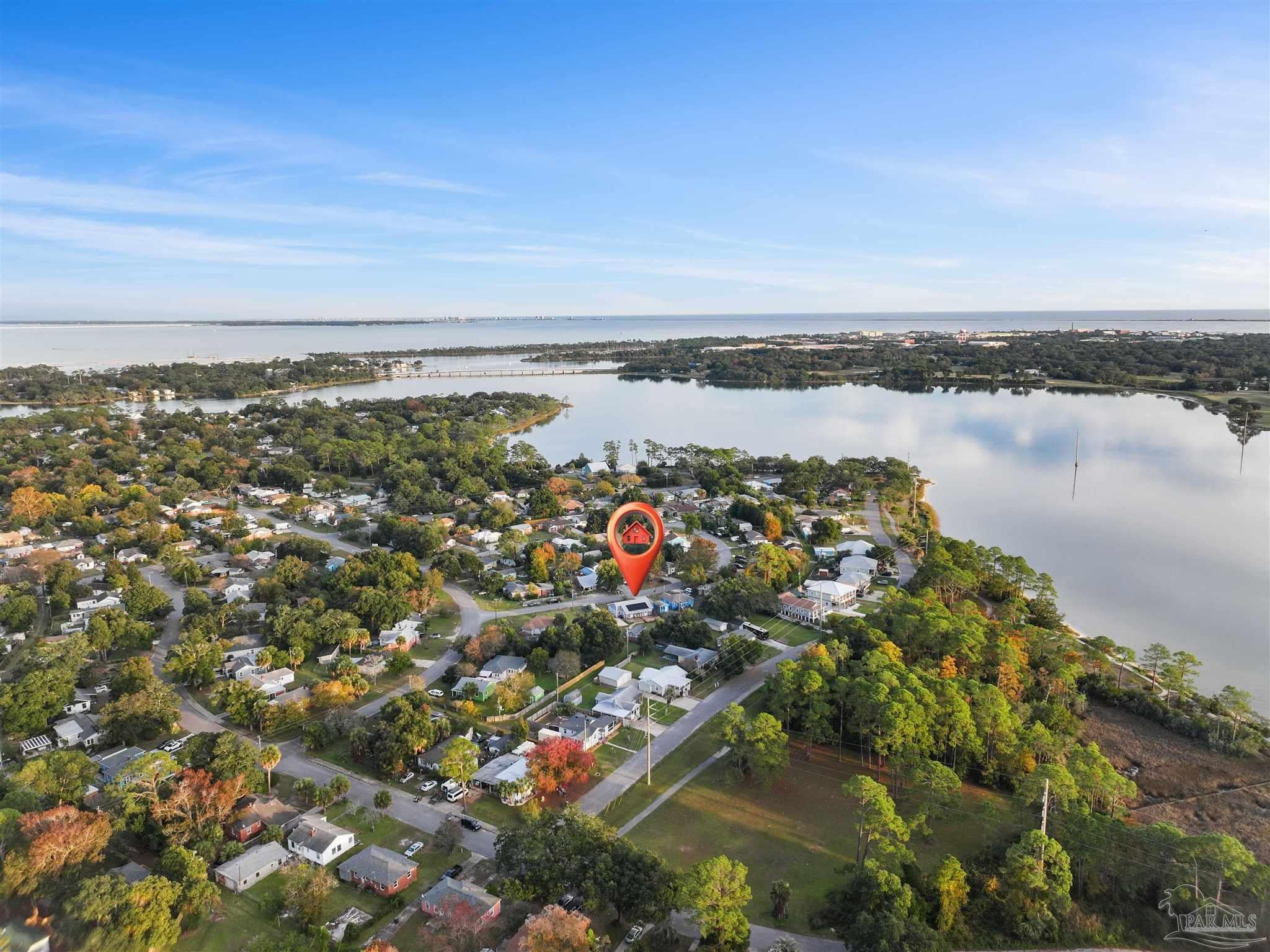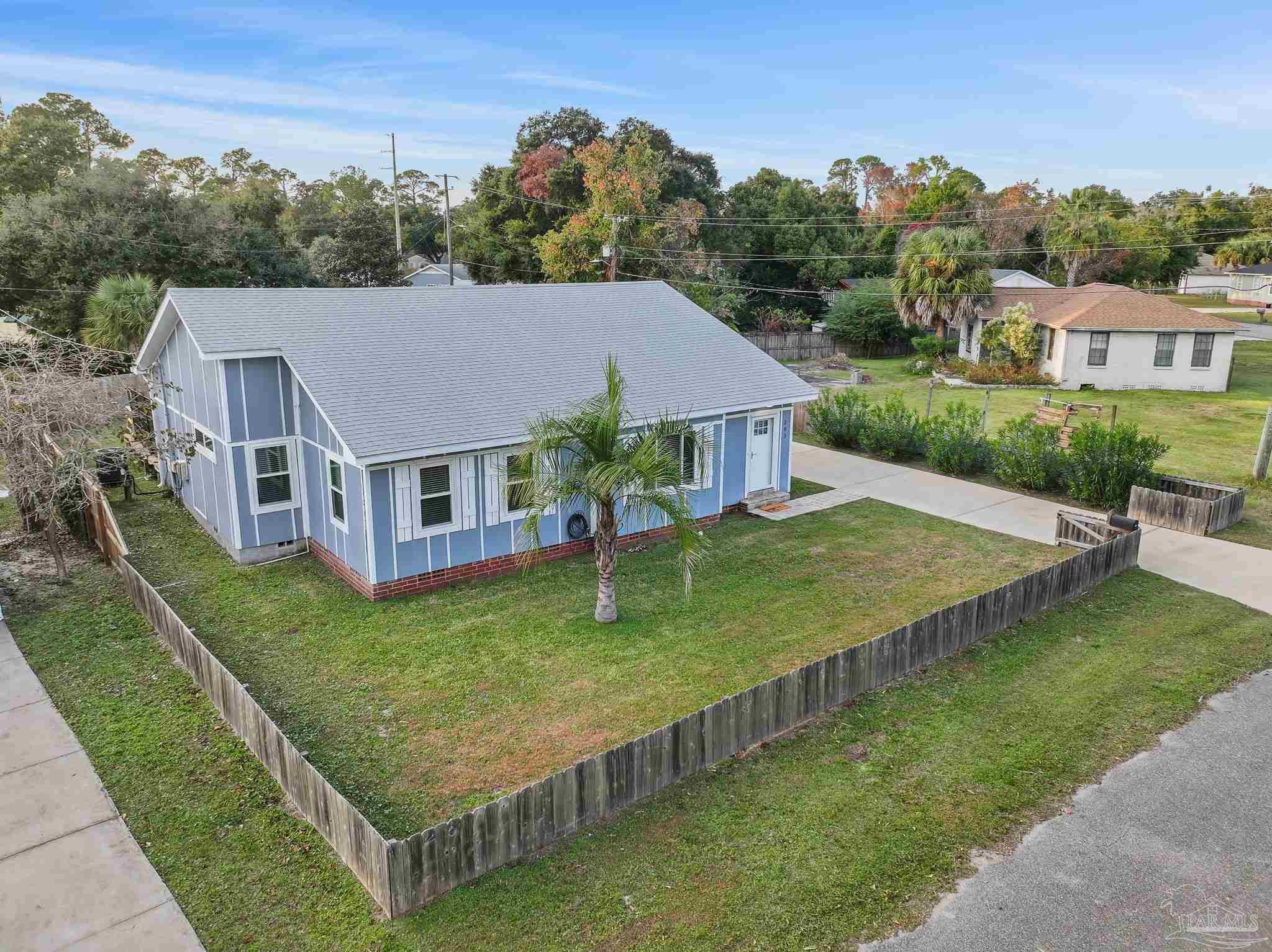 Gorgeous Navy Point home just one block from the beautiful waters of Bayou Grande, Pensacola Bay, and the Gulf! This 2 bedroom, 2 bath home was completely rebuilt in 2015 with new roof, plumbing, HVAC, and electrical. Since then, the owners have added new solar panels, hurricane-resistant windows, new exterior doors with a front storm door, and metal hurricane shutters. Inside, you’ll find an open floor plan with 20-ft ceilings and hardwood floors throughout. The kitchen features granite countertops, stainless steel appliances, and double ovens, along with a walk-in pantry and separate laundry room. spacious primary suite offers dual vanities, two walk-in closets, and an oversized custom-tiled walk-in shower. The attic was built with a potential third bedroom and bathroom in mind, complete with vaulted ceilings and plumbing. A detached building with a closet makes an ideal office or guest space. Enjoy exceptional privacy in the oversized fenced backyard with an end-to-end deck, fire pit, and partial water view. The long driveway and reinforced parking pad are ready for a future carport or garage. Living in Navy Point means access to a waterfront walking and biking trail, boat launch, playground, and multiple beach access points—all maintained by Escambia County. This highly sought-after neighborhood offers a true coastal lifestyle.