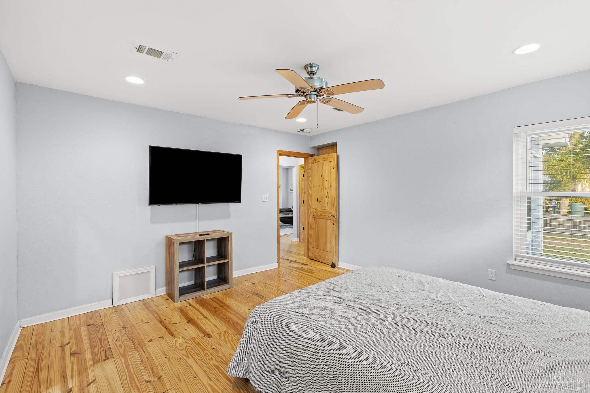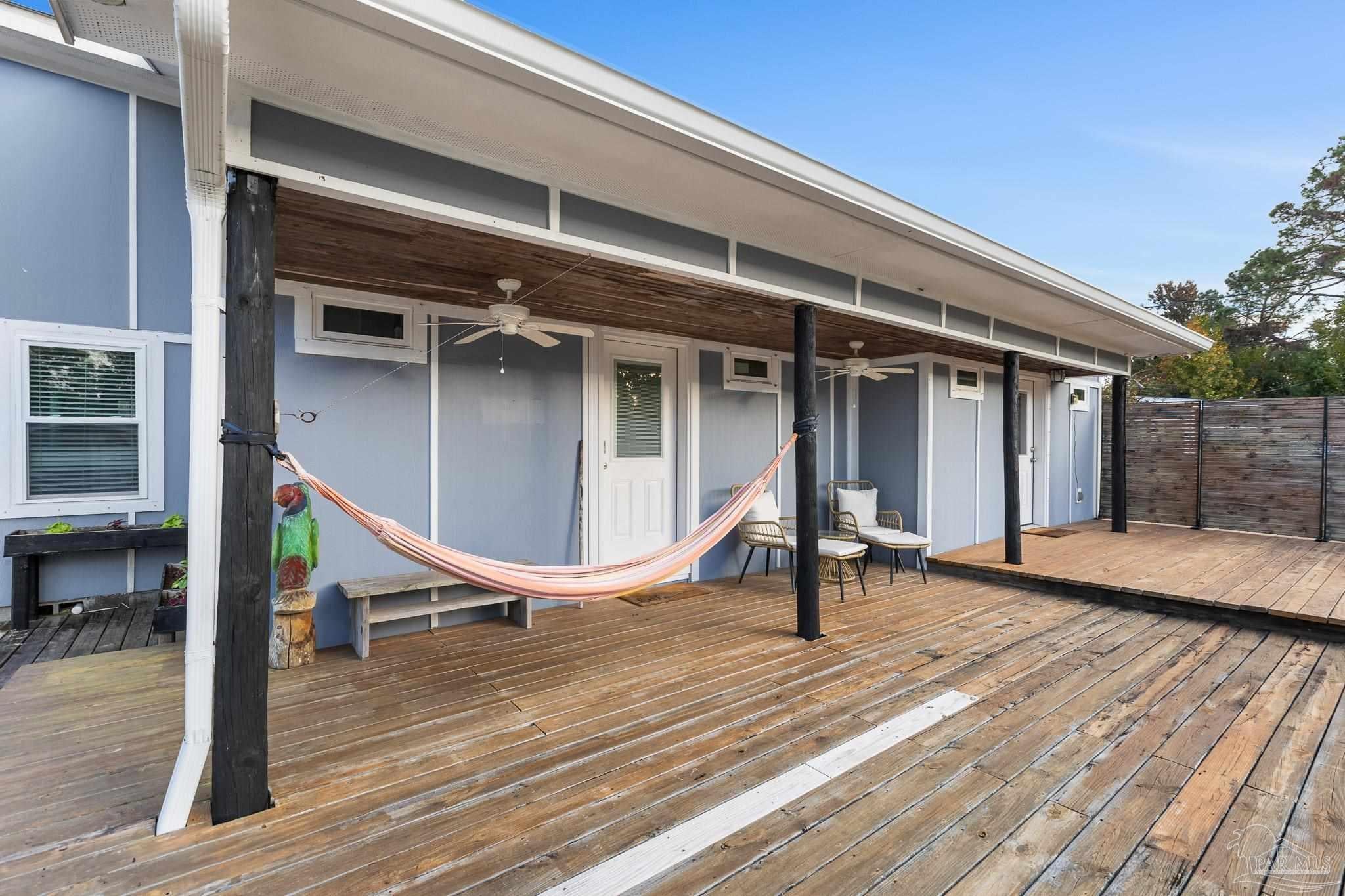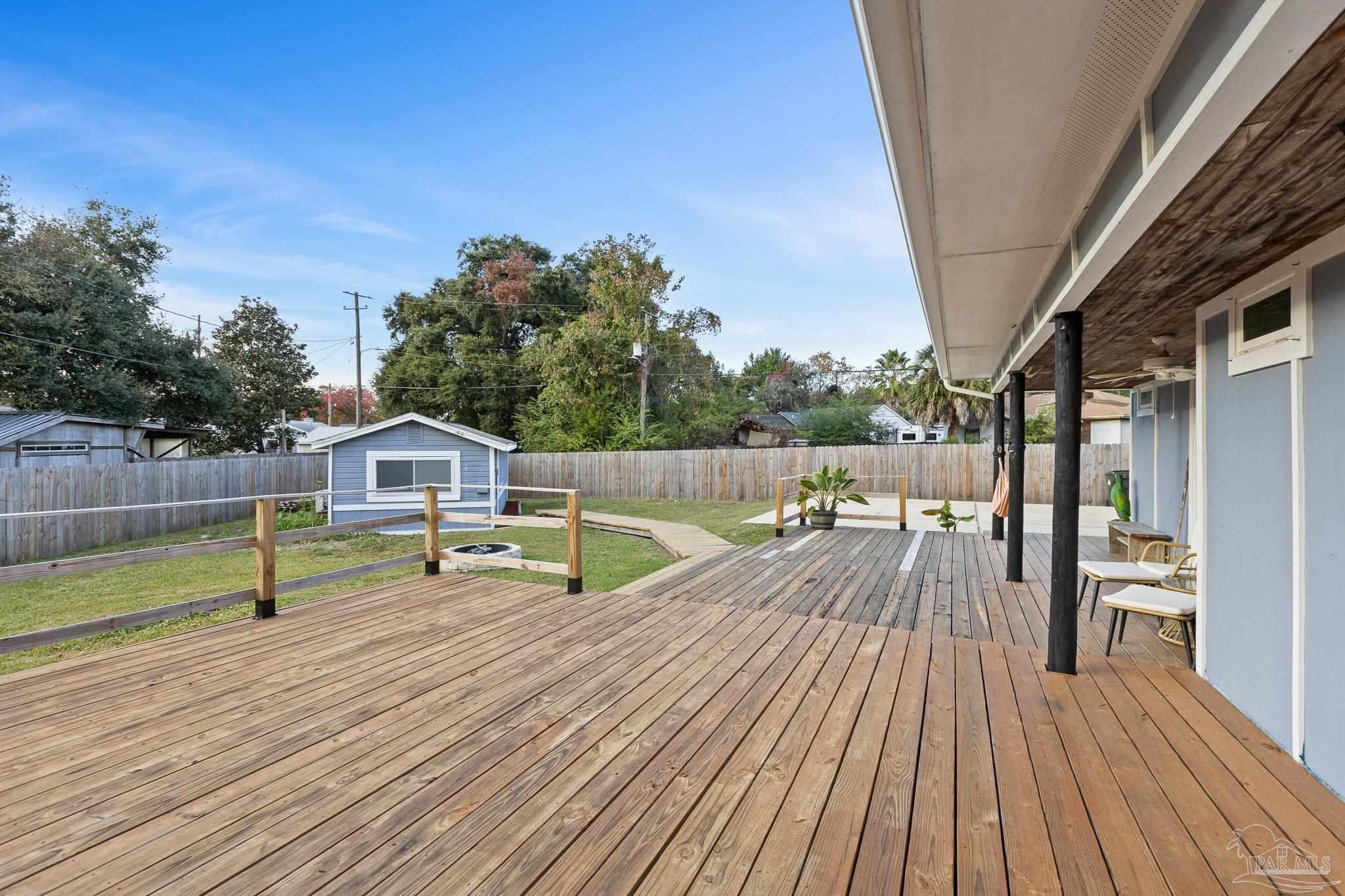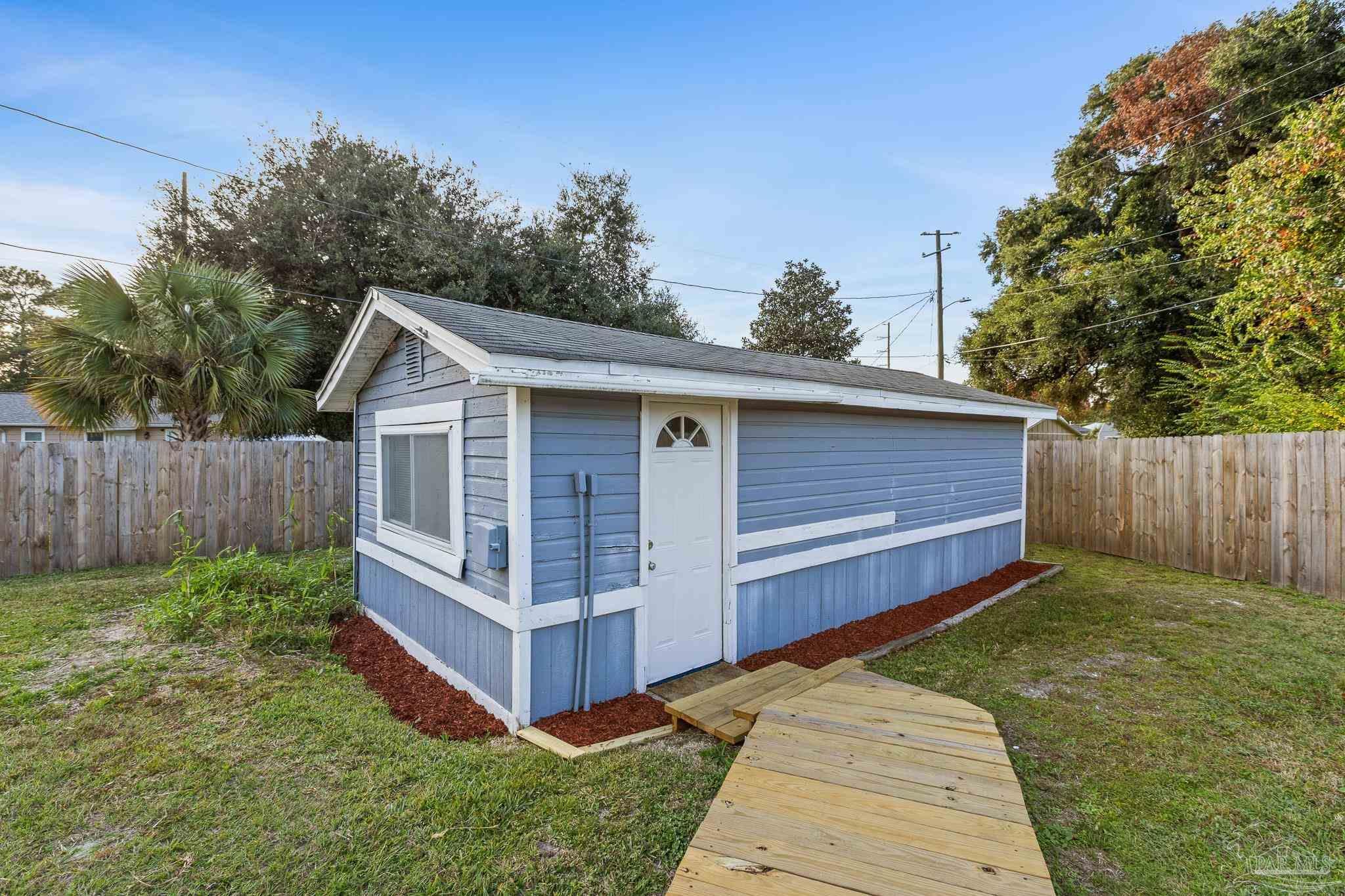 Gorgeous Navy Point home just one block from the beautiful waters of Bayou Grande, Pensacola Bay, and the Gulf! This 2 bedroom, 2 bath home was completely rebuilt in 2015 with new roof, plumbing, HVAC, and electrical. Since then, the owners have added new solar panels, hurricane-resistant windows, new exterior doors with a front storm door, and metal hurricane shutters. Inside, you’ll find an open floor plan with 20-ft ceilings and hardwood floors throughout. The kitchen features granite countertops, stainless steel appliances, and double ovens, along with a walk-in pantry and separate laundry room. spacious primary suite offers dual vanities, two walk-in closets, and an oversized custom-tiled walk-in shower. The attic was built with a potential third bedroom and bathroom in mind, complete with vaulted ceilings and plumbing. A detached building with a closet makes an ideal office or guest space. Enjoy exceptional privacy in the oversized fenced backyard with an end-to-end deck, fire pit, and partial water view. The long driveway and reinforced parking pad are ready for a future carport or garage. Living in Navy Point means access to a waterfront walking and biking trail, boat launch, playground, and multiple beach access points—all maintained by Escambia County. This highly sought-after neighborhood offers a true coastal lifestyle.