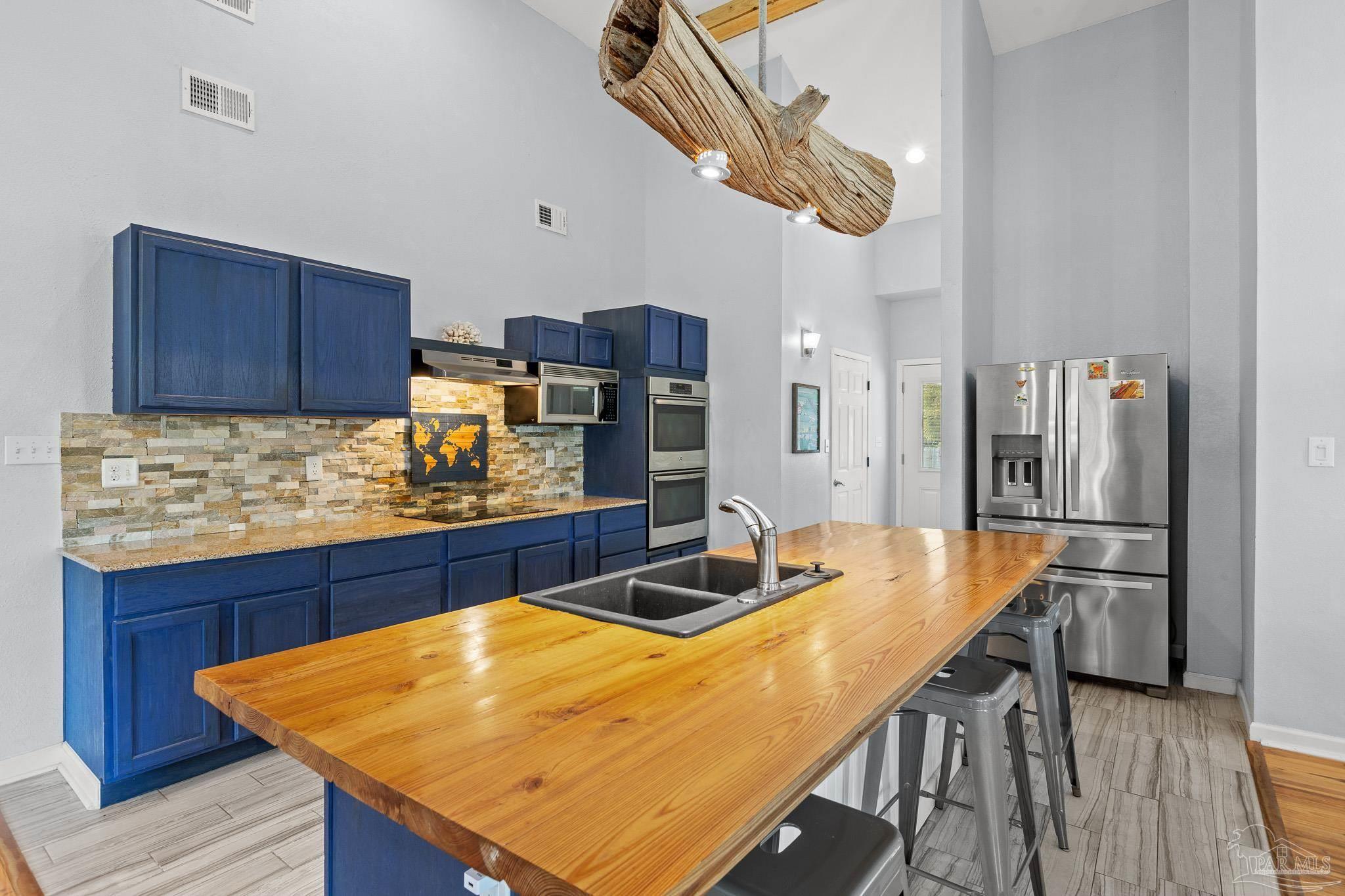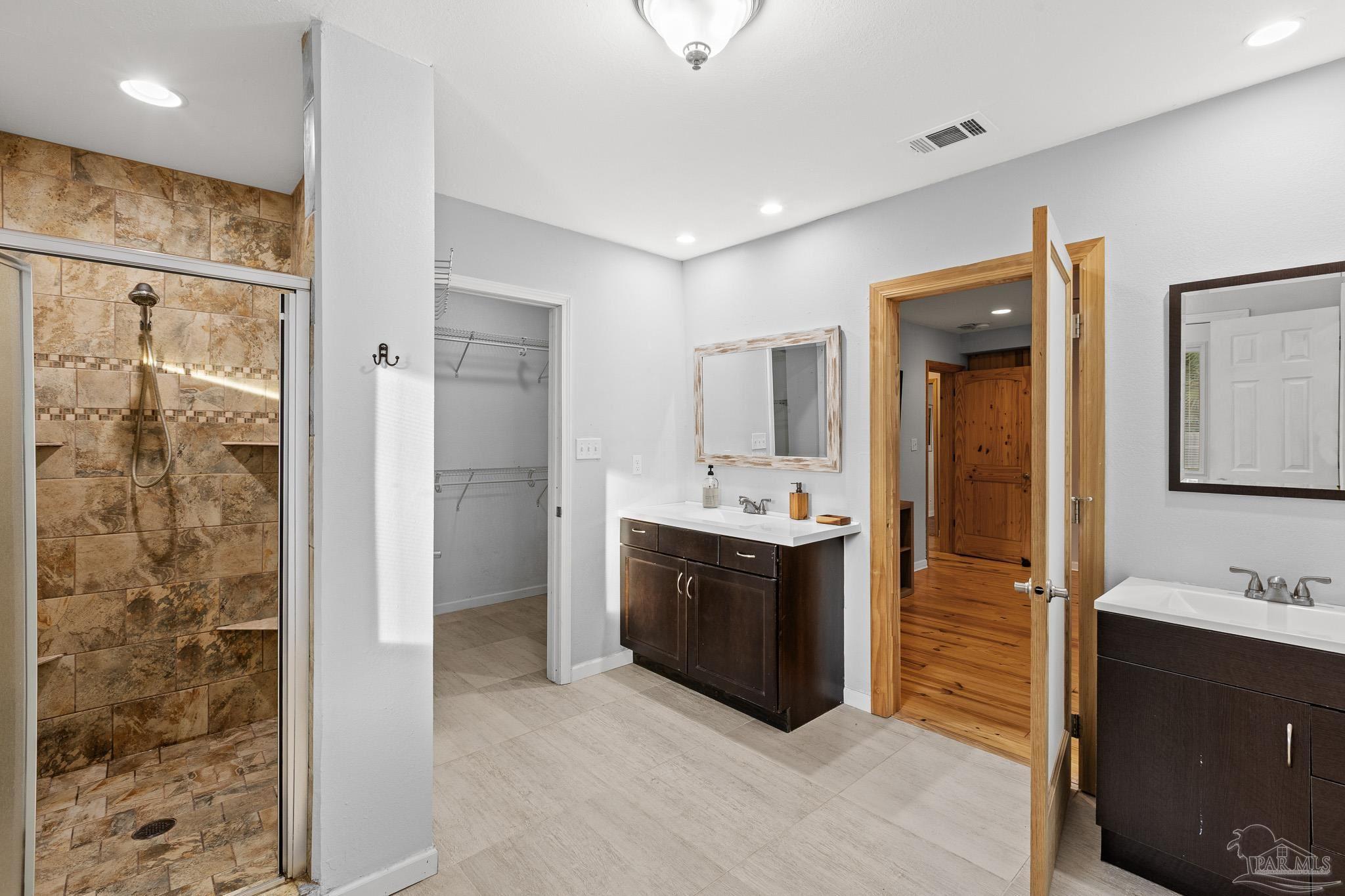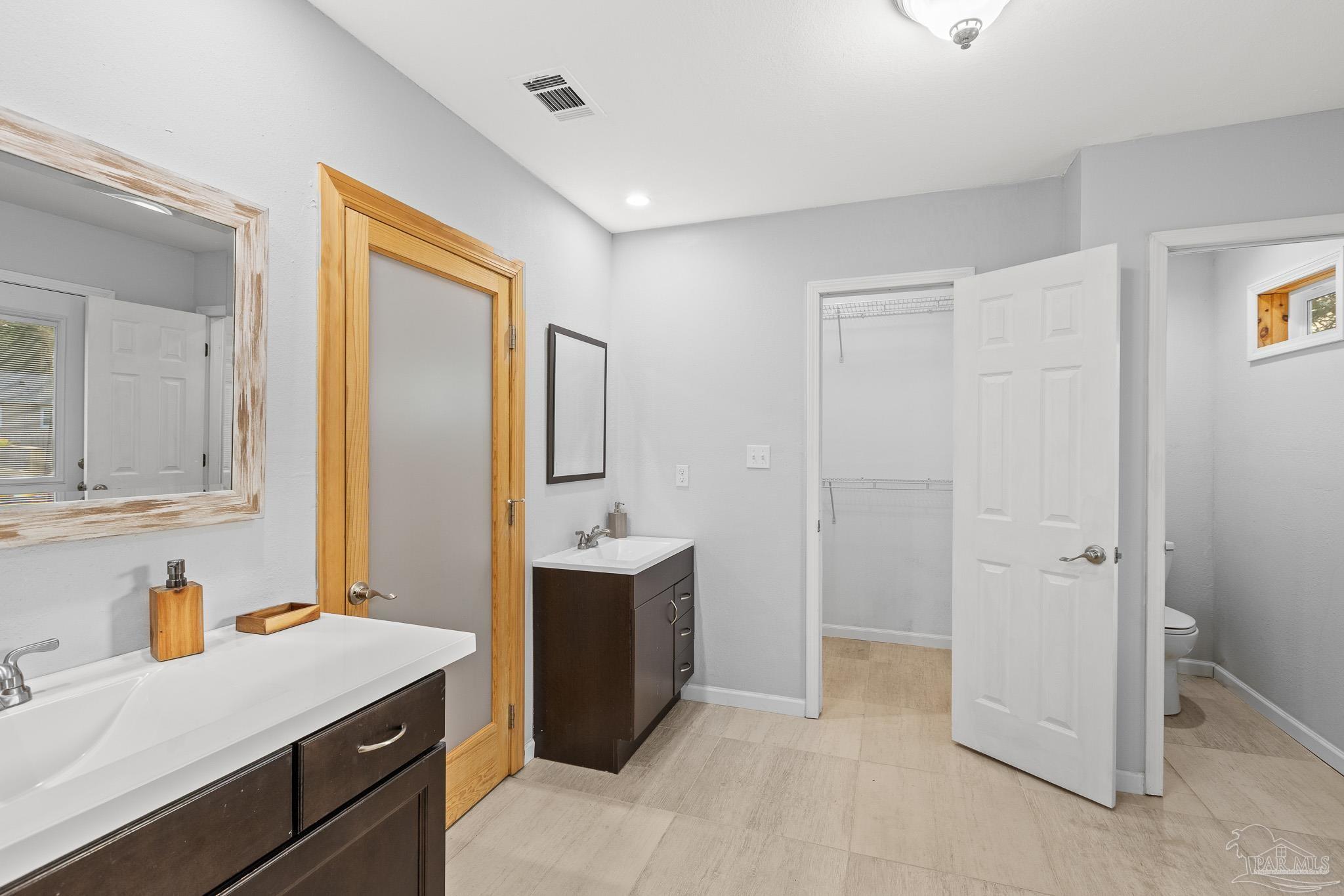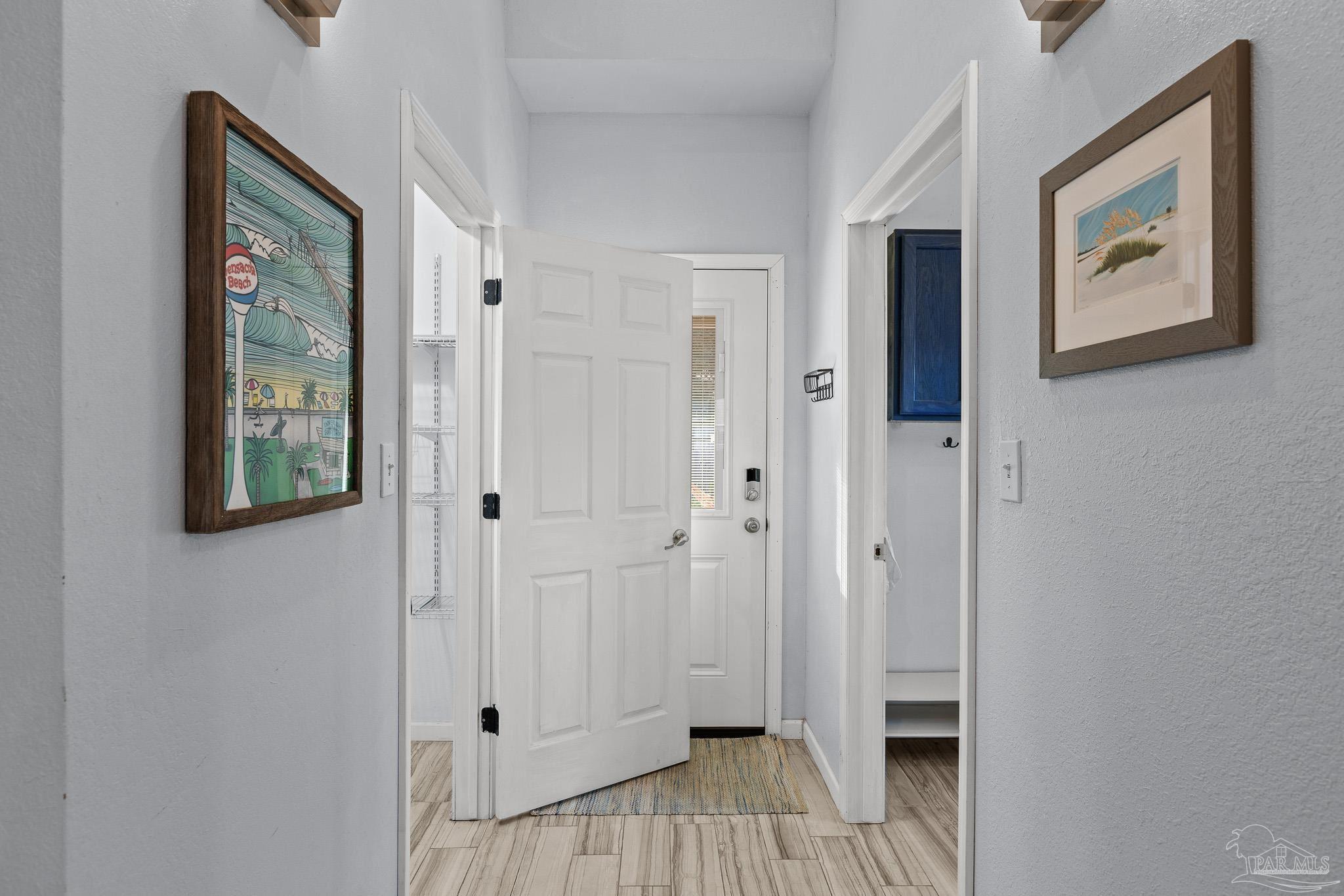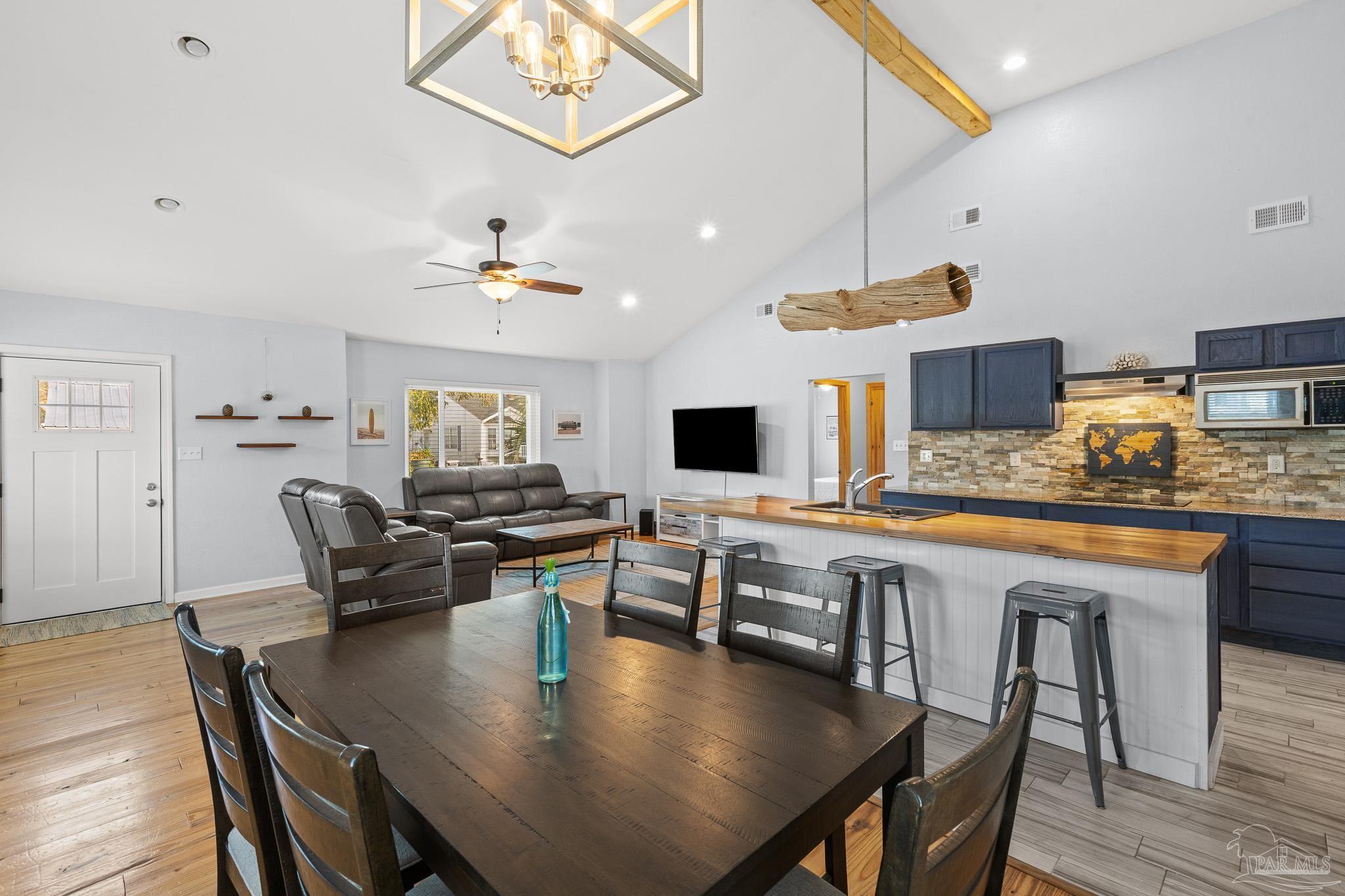 Gorgeous Navy Point home just one block from the beautiful waters of Bayou Grande, Pensacola Bay, and the Gulf! This 2 bedroom, 2 bath home was completely rebuilt in 2015 with new roof, plumbing, HVAC, and electrical. Since then, the owners have added new solar panels, hurricane-resistant windows, new exterior doors with a front storm door, and metal hurricane shutters. Inside, you’ll find an open floor plan with 20-ft ceilings and hardwood floors throughout. The kitchen features granite countertops, stainless steel appliances, and double ovens, along with a walk-in pantry and separate laundry room. spacious primary suite offers dual vanities, two walk-in closets, and an oversized custom-tiled walk-in shower. The attic was built with a potential third bedroom and bathroom in mind, complete with vaulted ceilings and plumbing. A detached building with a closet makes an ideal office or guest space. Enjoy exceptional privacy in the oversized fenced backyard with an end-to-end deck, fire pit, and partial water view. The long driveway and reinforced parking pad are ready for a future carport or garage. Living in Navy Point means access to a waterfront walking and biking trail, boat launch, playground, and multiple beach access points—all maintained by Escambia County. This highly sought-after neighborhood offers a true coastal lifestyle.