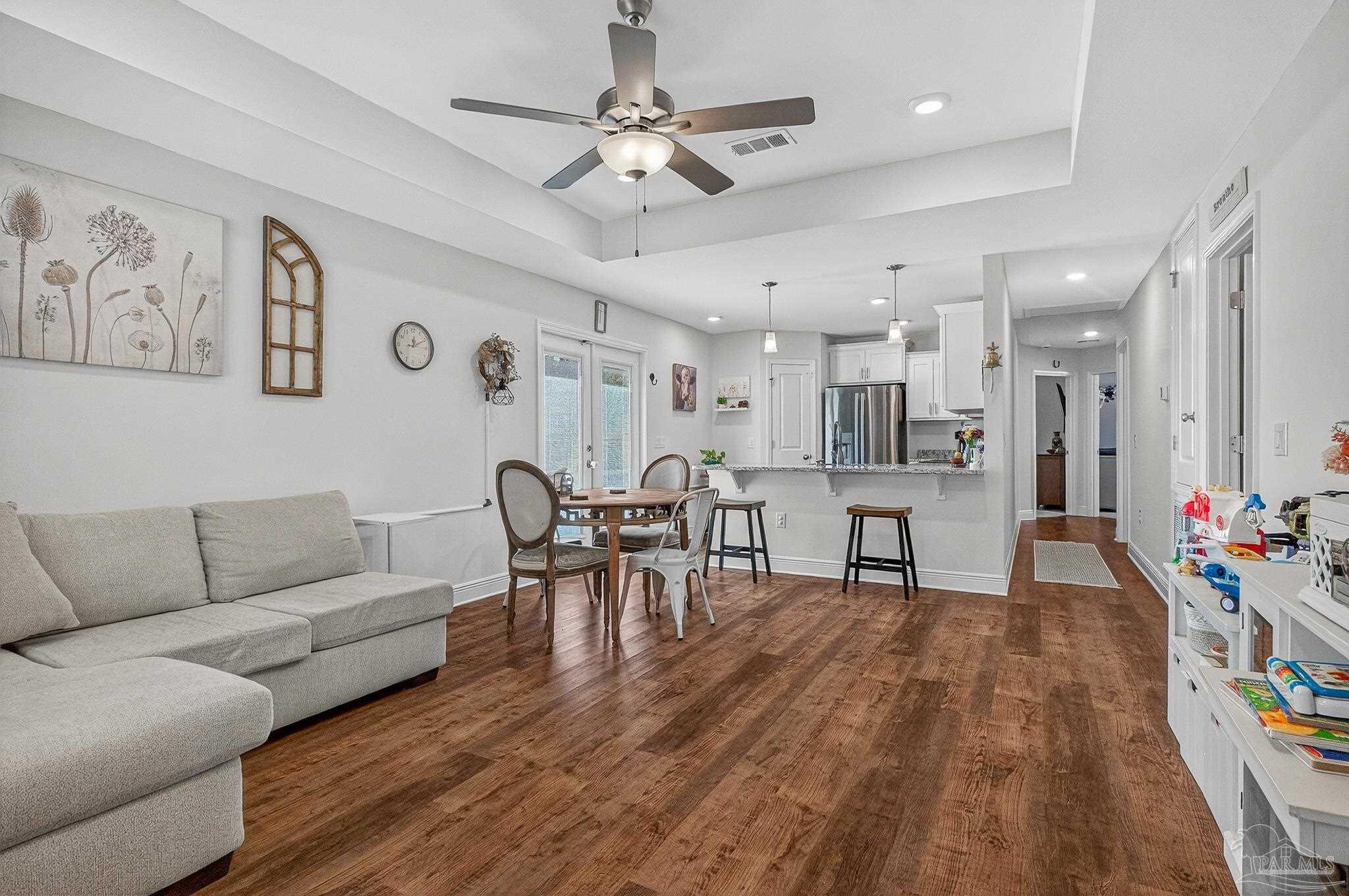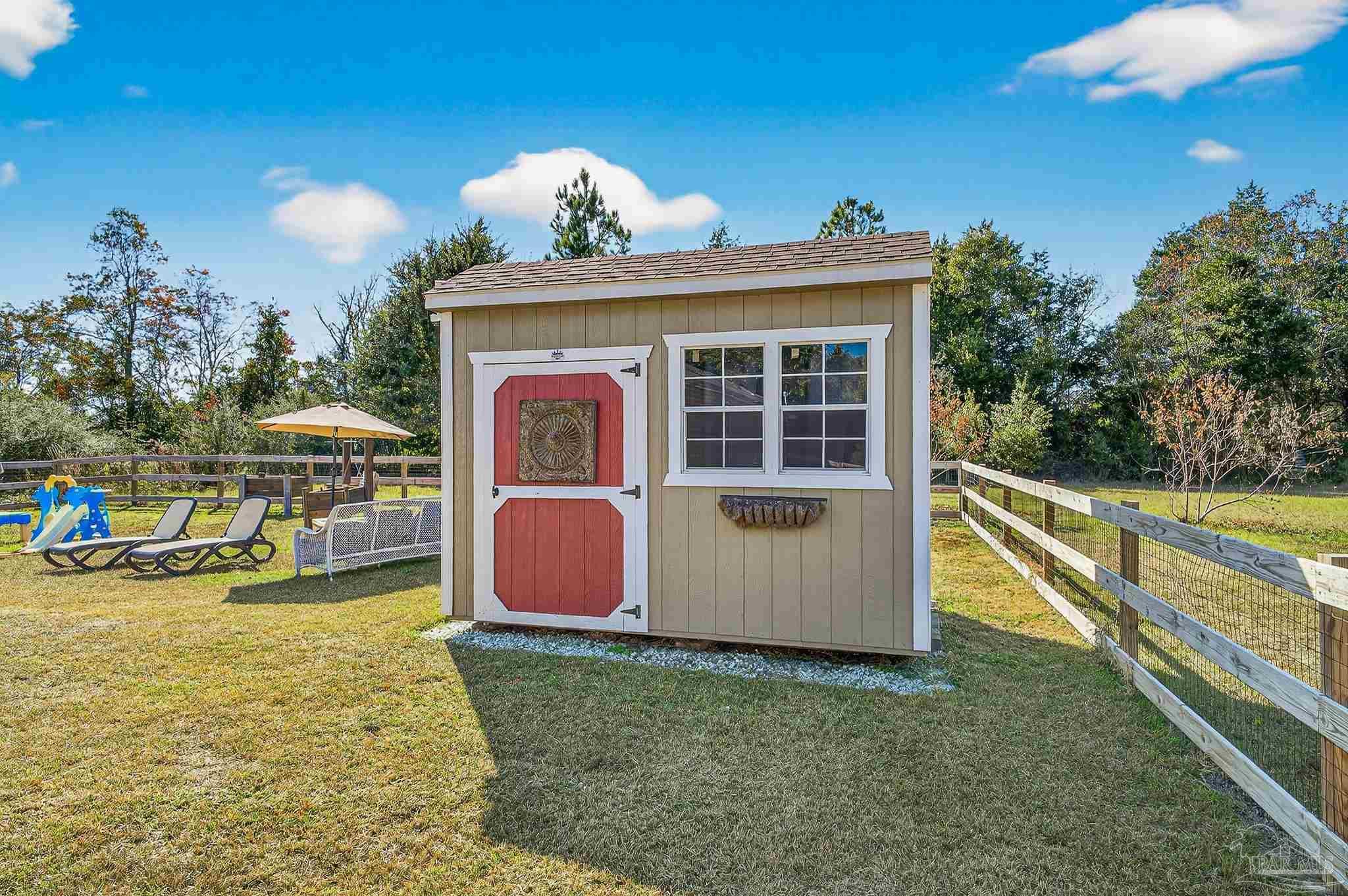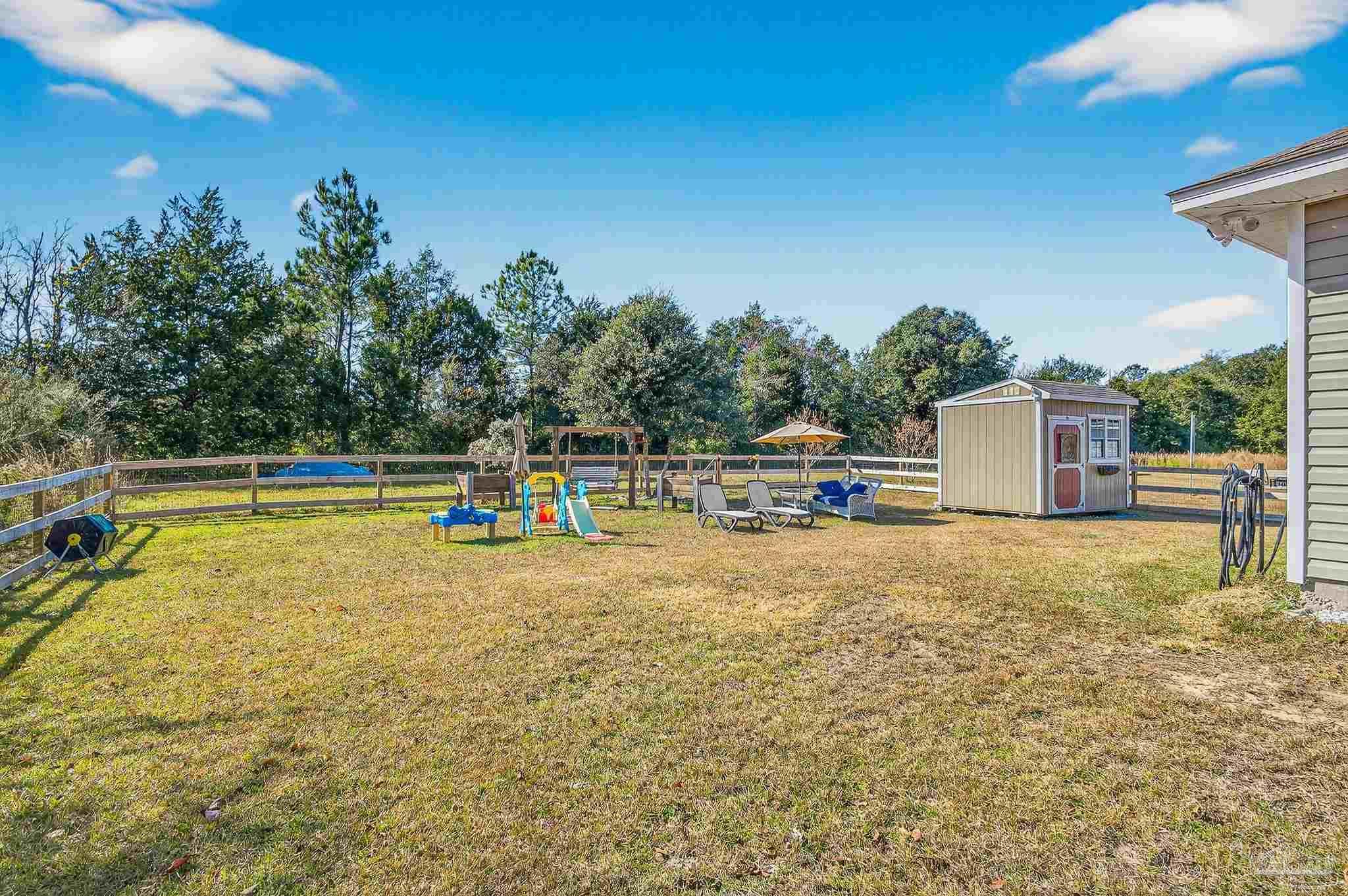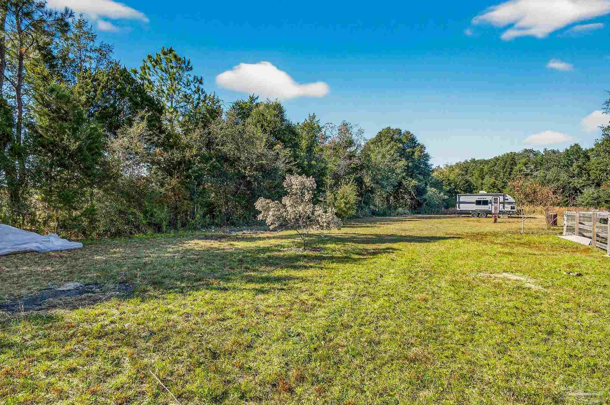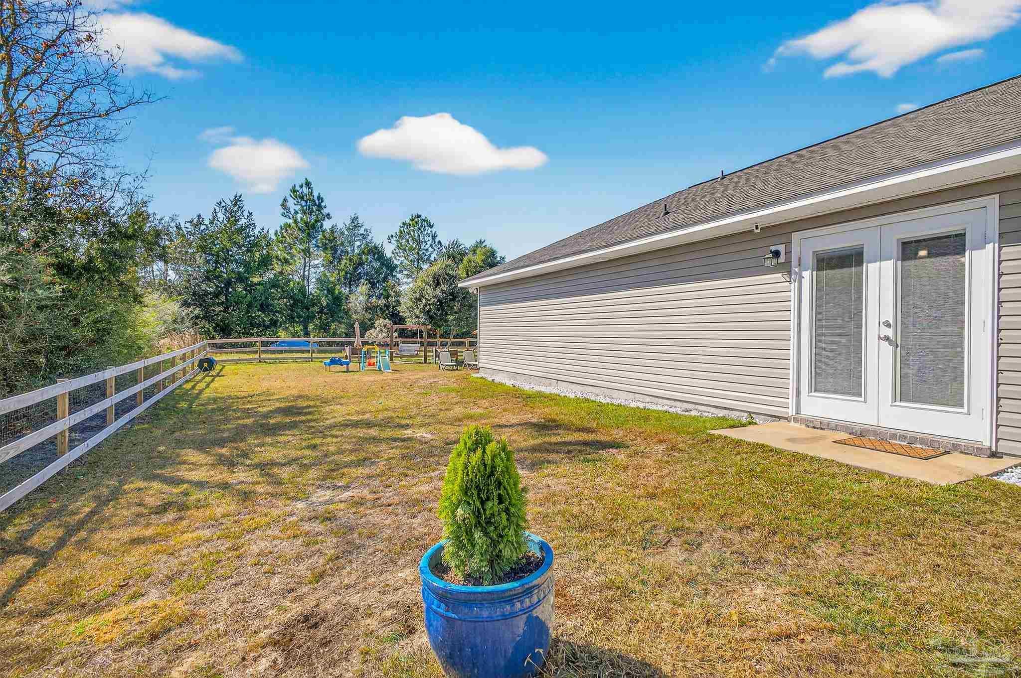 Welcome to this like-new home—just two years old (built 2023) on nearly a half-acre lot in a quiet subdivision. With 3 bedrooms and 2 bathrooms across 1,165 sq. ft. of finished living space, the floor plan is thoughtfully laid out for both comfort and ease. Step inside to an open living room/kitchen/dining area where modern finishes abound: granite countertops, shaker-style cabinets, a walk-in pantry, stainless-steel kitchen appliances, and a convenient breakfast bar. Luxury vinyl plank flooring spans all of the common areas while the bedrooms offer plush carpet for comfort. The master suite enjoys a large walk-in closet and a private bath with granite vanity. Outside, the home sits on a nicely sized 0.46-acre parcel giving you both space and privacy. A recently installed fence encloses a generous portion of the yard — ideal for children, pets, or outdoor entertaining — while beyond the fenced area the lot continues, opening up exciting possibilities: a large garden, play area, or even potential for a pool and outdoor living. This property combines the ease of move-in with the benefits of extra outdoor space seldom found in newer homes. Don’t miss this opportunity for a virtually brand-new home with extra land and flexibility in one of Santa Rosa County’s suburbs.