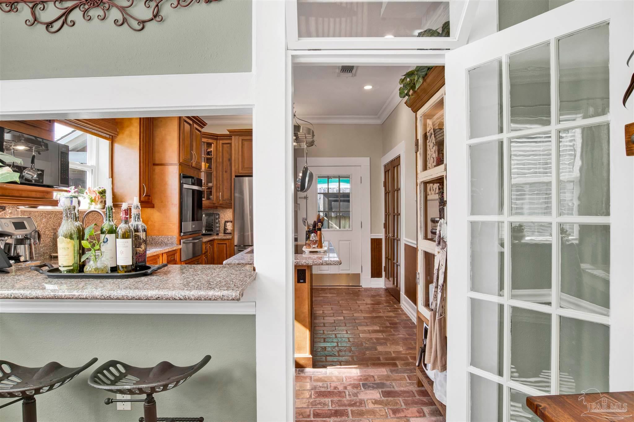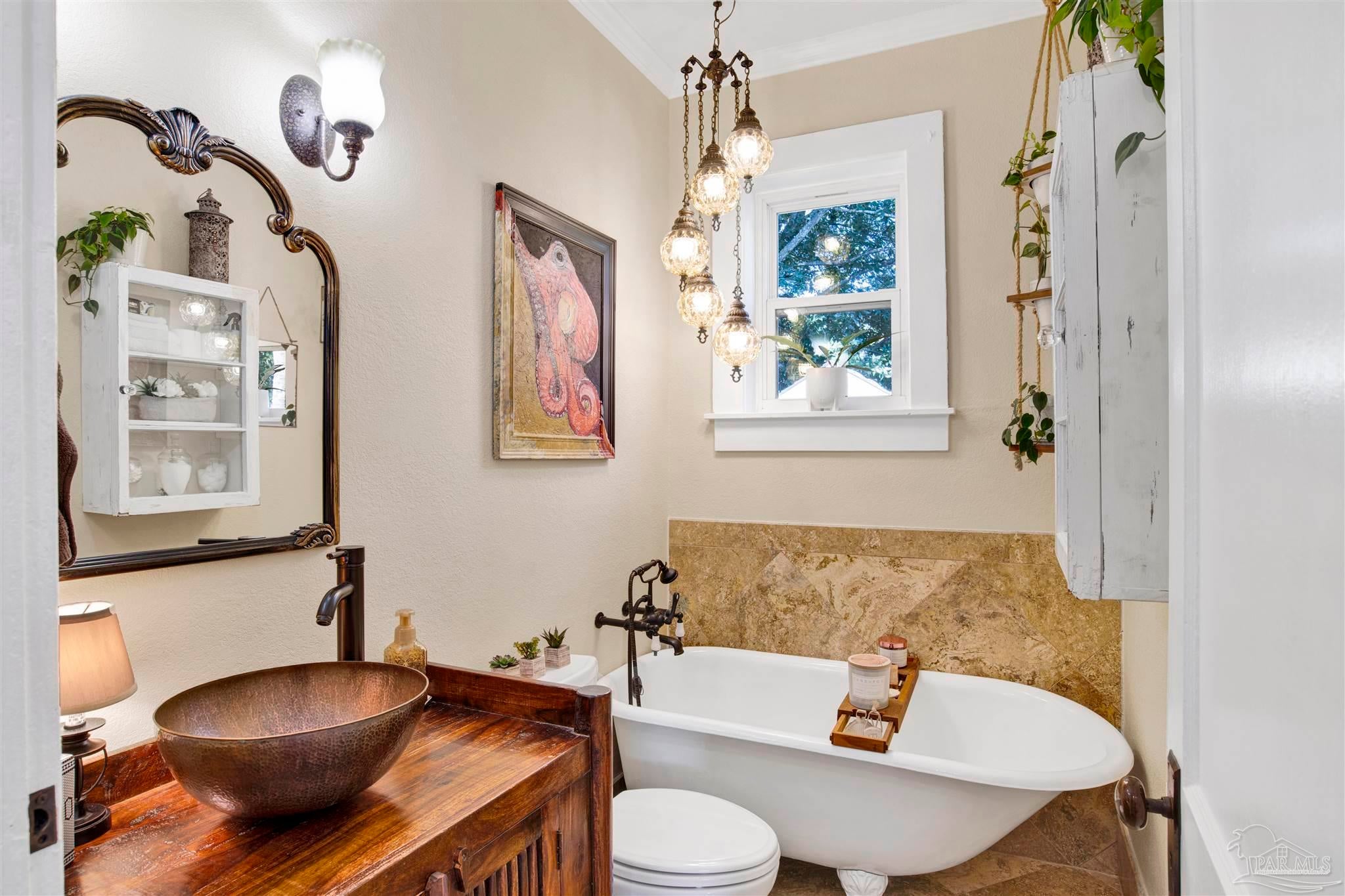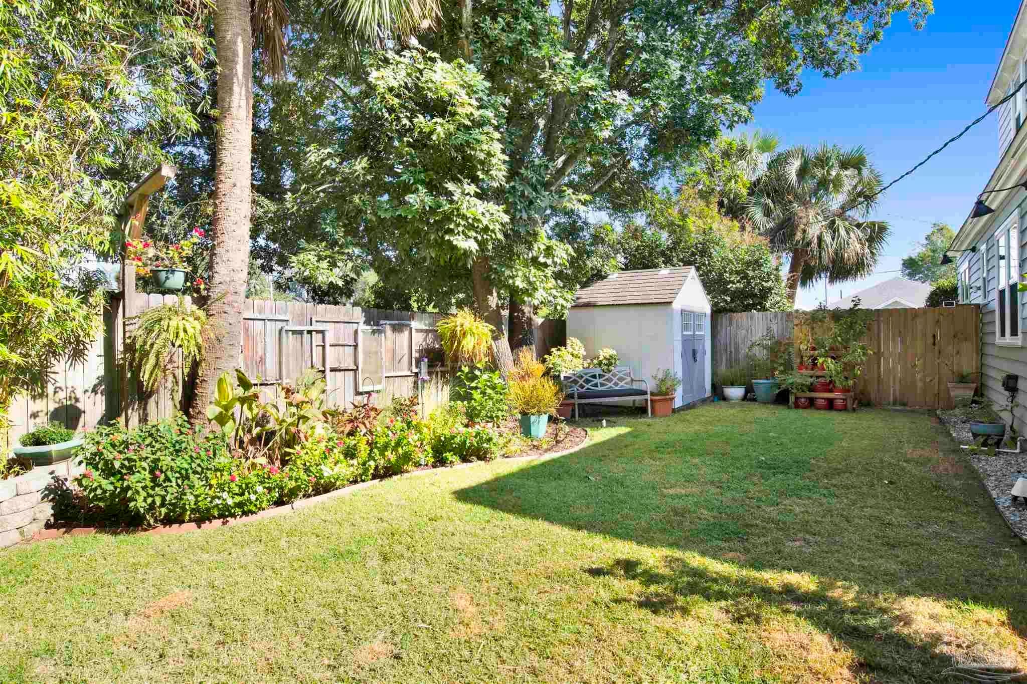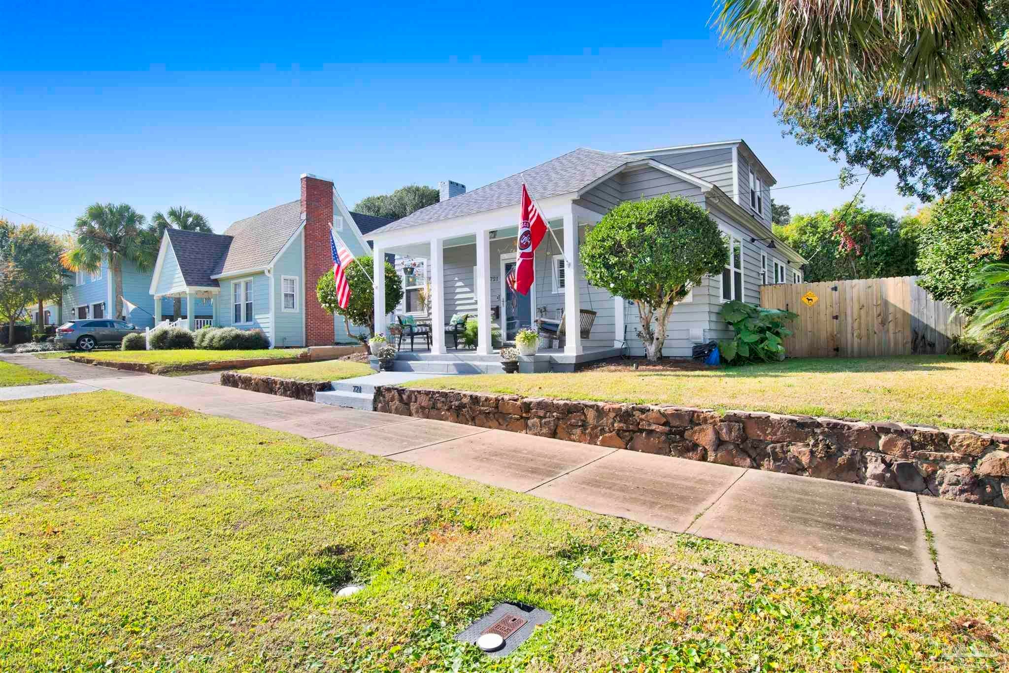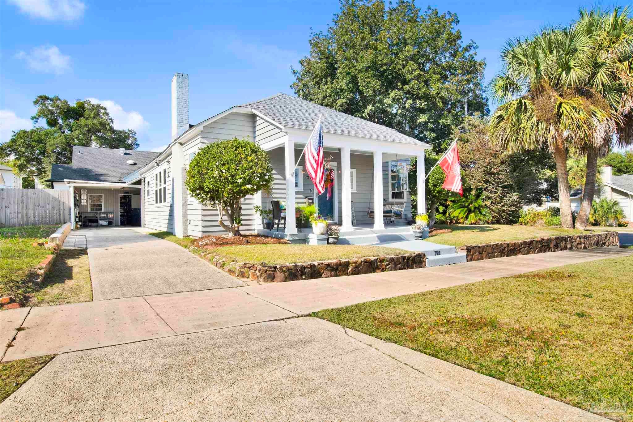 Built in 1928 and thoughtfully updated for modern living, this East Hill cottage blends historic character with contemporary comfort. From the inviting covered front porch, step into a light and bright living room showcasing luxury vinyl plank flooring, high ceilings, built-in bookcase, decorative fireplace, and substantial crown molding—classic architectural elements that define the era. The adjacent dining area offers a built-in bar with wine rack and glass-front cabinets, creating an elegant space for entertaining. The chef’s kitchen is truly exceptional, boasting charming brick flooring, granite counters, a pass-through bar to the dining area, center island, and an array of beautiful cabinetry with specialty drawers. Stainless appliances include an oversized cooktop and an oven with warming drawer. Off the kitchen, obscured-glass French doors lead to the laundry room, where the washer and dryer convey. The primary suite, located on the main level, features a spacious bedroom with two closets—one a walk-in. The primary bath offers travertine flooring, a walk-in shower, and a teak vanity topped with a vessel sink. Also on the main level is a large guest bedroom and a full bath complete with a charming claw-foot tub. Upstairs, beautifully restored original hardwood floors lead to a generous guest bedroom with its own attached half bath—ideal for visitors or a private retreat. Step outside to a privacy-fenced backyard sanctuary, where a large open patio is framed by mature bamboo that softens the landscape and creates a serene, secluded atmosphere. A workshop sits just beyond the single-car carport, along with an additional yard building for extra storage. This thoughtfully updated cottage is the perfect blend of East Hill charm and modern convenience—move-in ready and truly one of a kind.