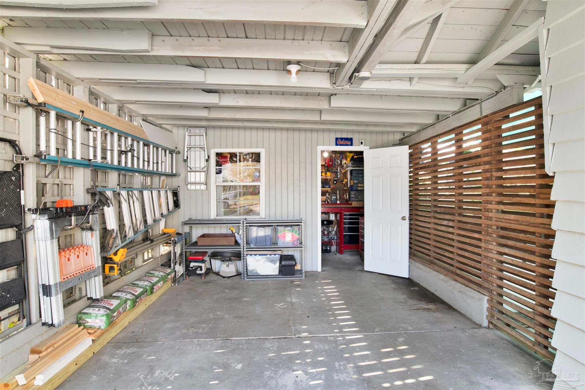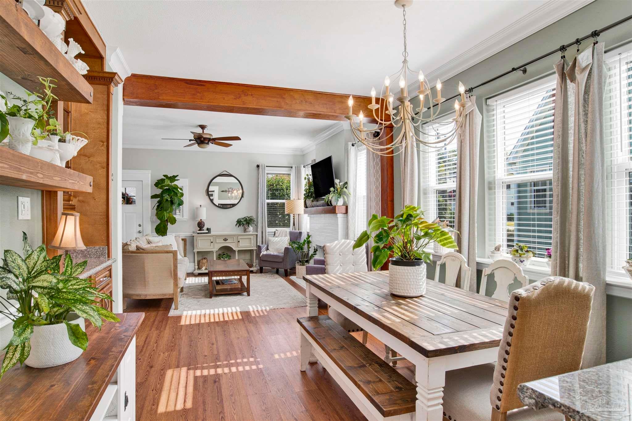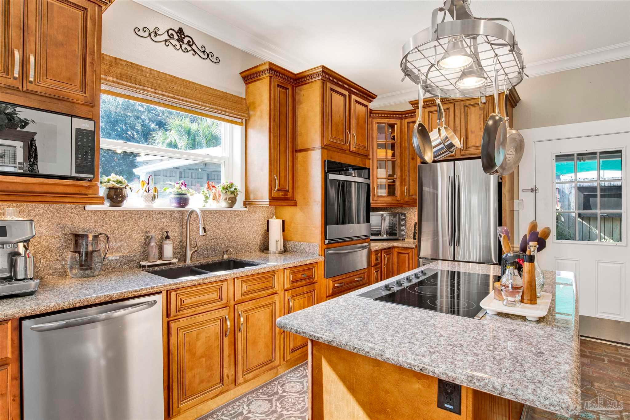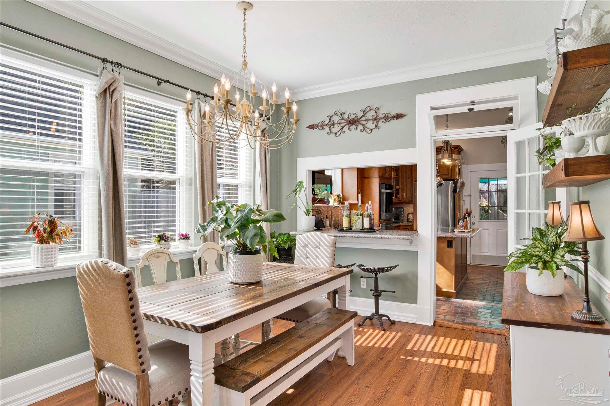 Built in 1928 and thoughtfully updated for modern living, this East Hill cottage blends historic character with contemporary comfort. From the inviting covered front porch, step into a light and bright living room showcasing luxury vinyl plank flooring, high ceilings, built-in bookcase, decorative fireplace, and substantial crown molding—classic architectural elements that define the era. The adjacent dining area offers a built-in bar with wine rack and glass-front cabinets, creating an elegant space for entertaining. The chef’s kitchen is truly exceptional, boasting charming brick flooring, granite counters, a pass-through bar to the dining area, center island, and an array of beautiful cabinetry with specialty drawers. Stainless appliances include an oversized cooktop and an oven with warming drawer. Off the kitchen, obscured-glass French doors lead to the laundry room, where the washer and dryer convey. The primary suite, located on the main level, features a spacious bedroom with two closets—one a walk-in. The primary bath offers travertine flooring, a walk-in shower, and a teak vanity topped with a vessel sink. Also on the main level is a large guest bedroom and a full bath complete with a charming claw-foot tub. Upstairs, beautifully restored original hardwood floors lead to a generous guest bedroom with its own attached half bath—ideal for visitors or a private retreat. Step outside to a privacy-fenced backyard sanctuary, where a large open patio is framed by mature bamboo that softens the landscape and creates a serene, secluded atmosphere. A workshop sits just beyond the single-car carport, along with an additional yard building for extra storage. This thoughtfully updated cottage is the perfect blend of East Hill charm and modern convenience—move-in ready and truly one of a kind.