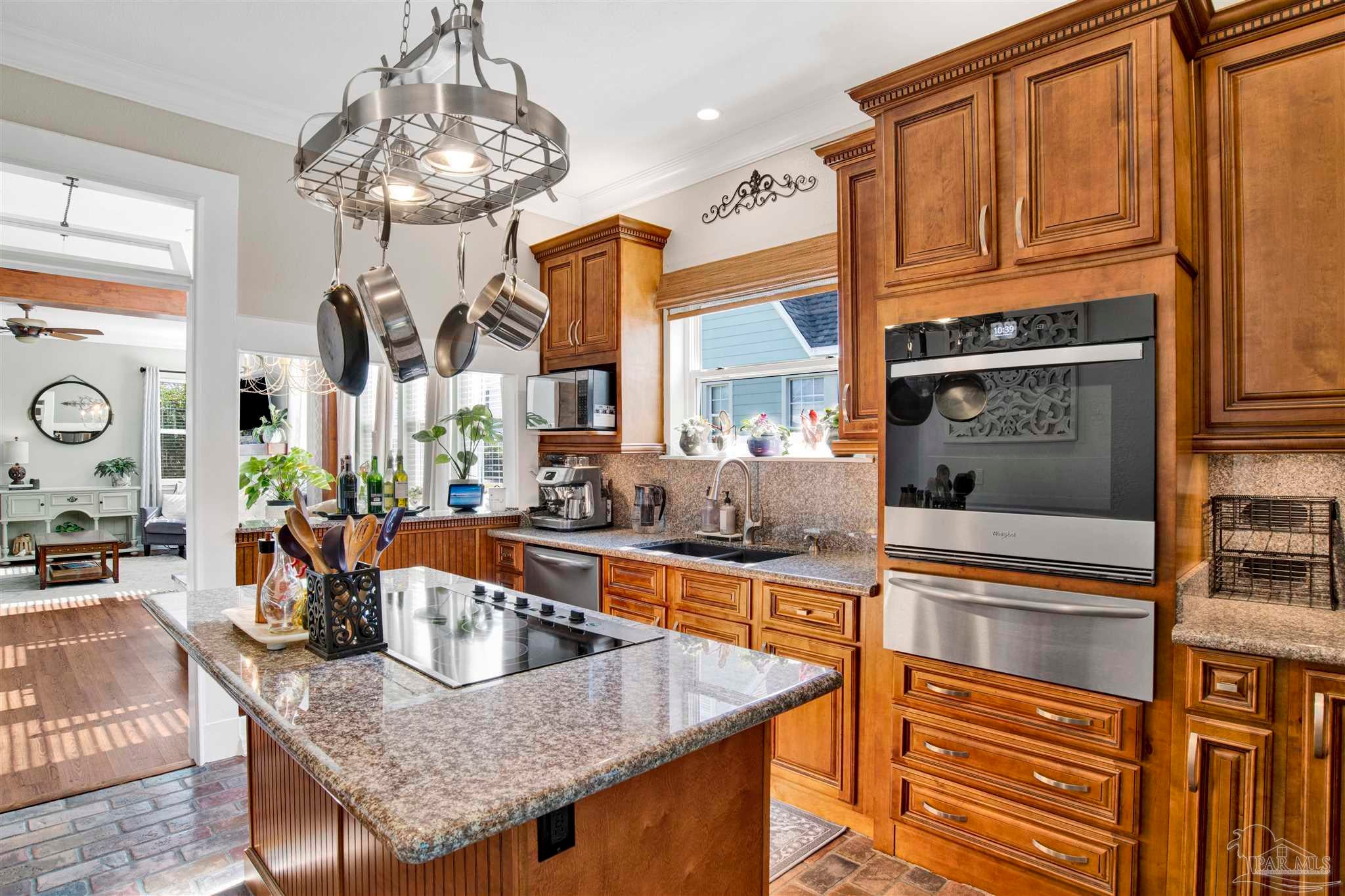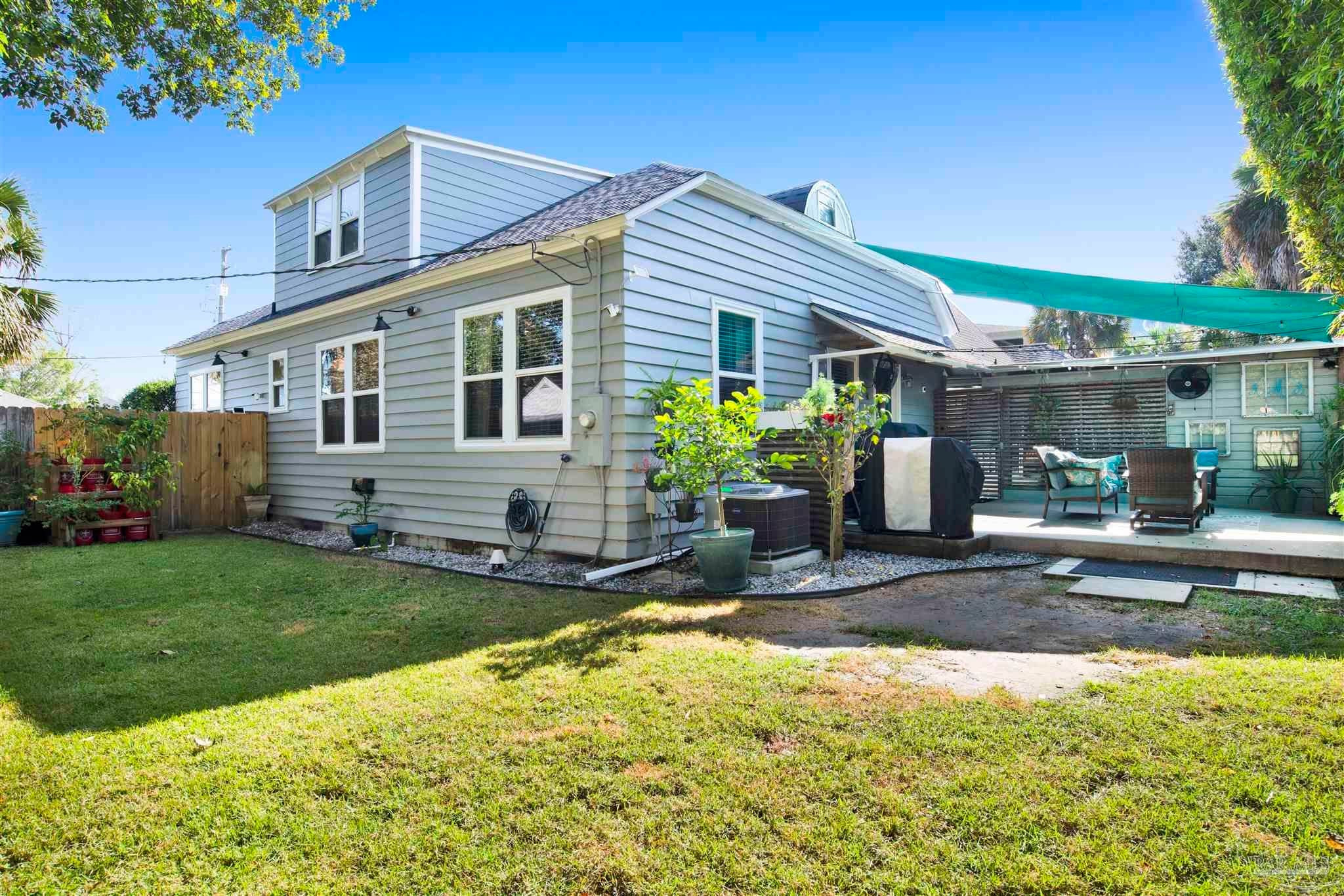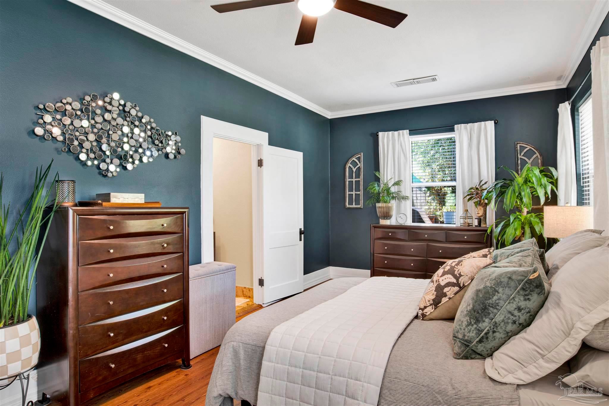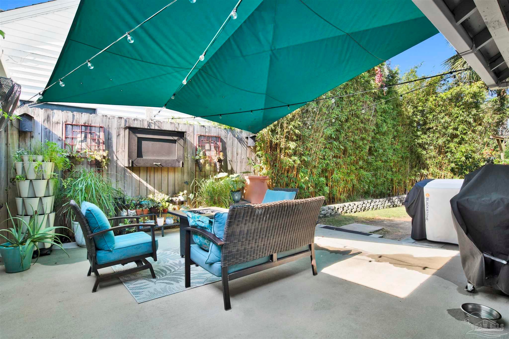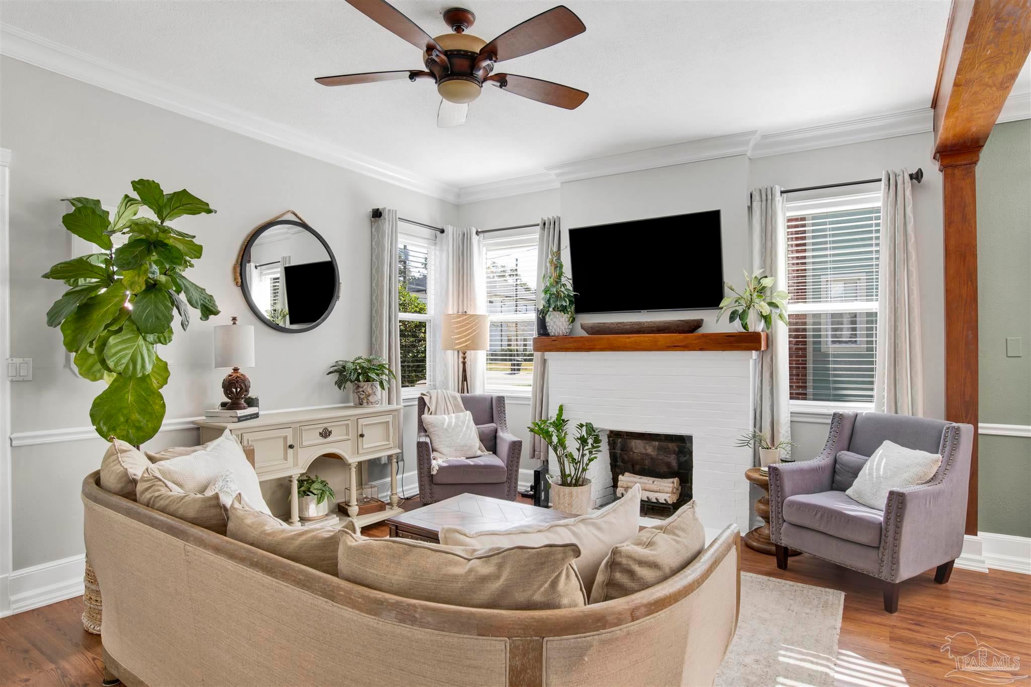 Built in 1928 and thoughtfully updated for modern living, this East Hill cottage blends historic character with contemporary comfort. From the inviting covered front porch, step into a light and bright living room showcasing luxury vinyl plank flooring, high ceilings, built-in bookcase, decorative fireplace, and substantial crown molding—classic architectural elements that define the era. The adjacent dining area offers a built-in bar with wine rack and glass-front cabinets, creating an elegant space for entertaining. The chef’s kitchen is truly exceptional, boasting charming brick flooring, granite counters, a pass-through bar to the dining area, center island, and an array of beautiful cabinetry with specialty drawers. Stainless appliances include an oversized cooktop and an oven with warming drawer. Off the kitchen, obscured-glass French doors lead to the laundry room, where the washer and dryer convey. The primary suite, located on the main level, features a spacious bedroom with two closets—one a walk-in. The primary bath offers travertine flooring, a walk-in shower, and a teak vanity topped with a vessel sink. Also on the main level is a large guest bedroom and a full bath complete with a charming claw-foot tub. Upstairs, beautifully restored original hardwood floors lead to a generous guest bedroom with its own attached half bath—ideal for visitors or a private retreat. Step outside to a privacy-fenced backyard sanctuary, where a large open patio is framed by mature bamboo that softens the landscape and creates a serene, secluded atmosphere. A workshop sits just beyond the single-car carport, along with an additional yard building for extra storage. This thoughtfully updated cottage is the perfect blend of East Hill charm and modern convenience—move-in ready and truly one of a kind.