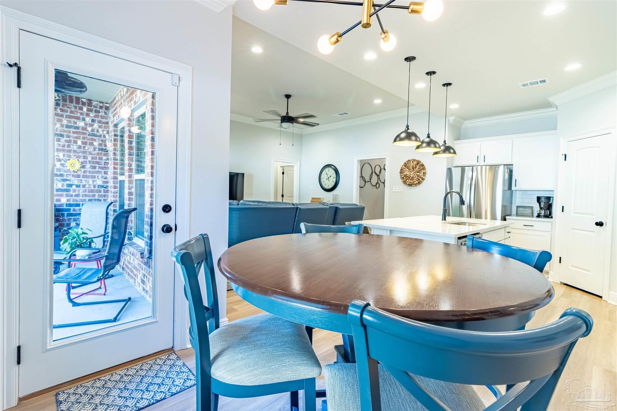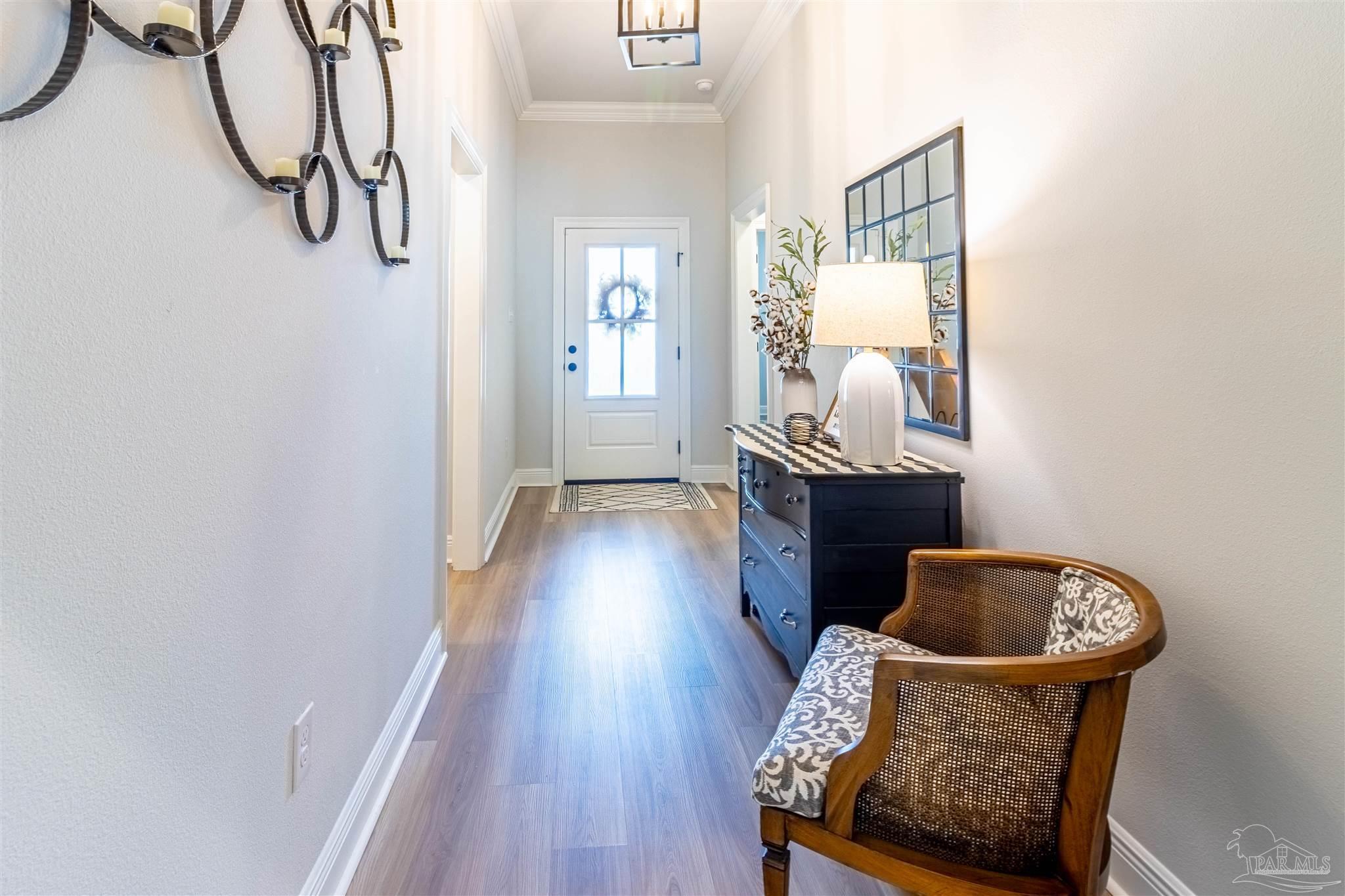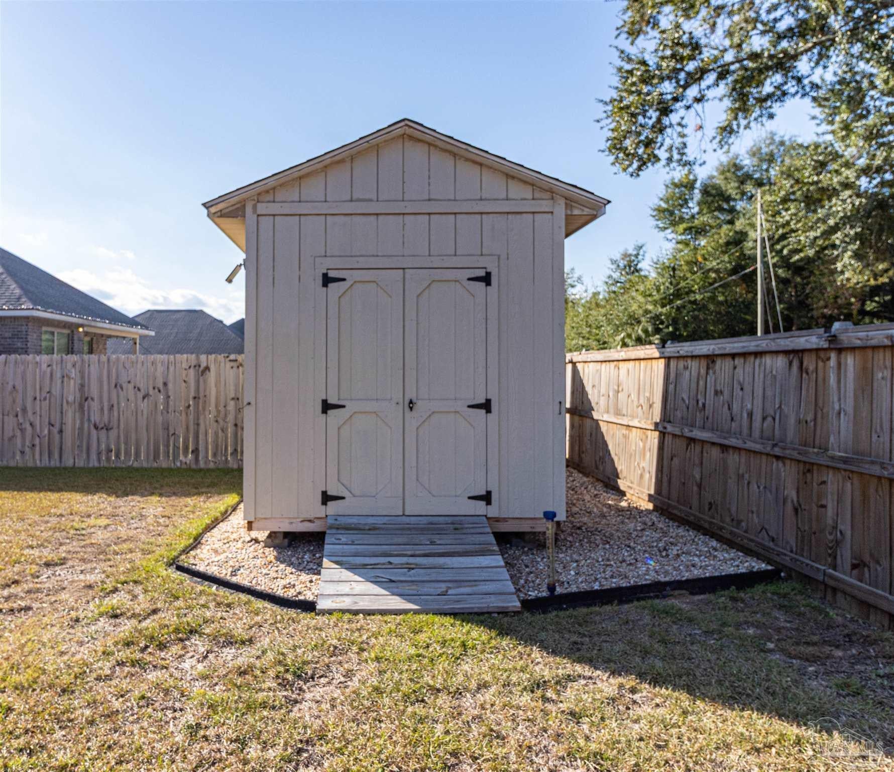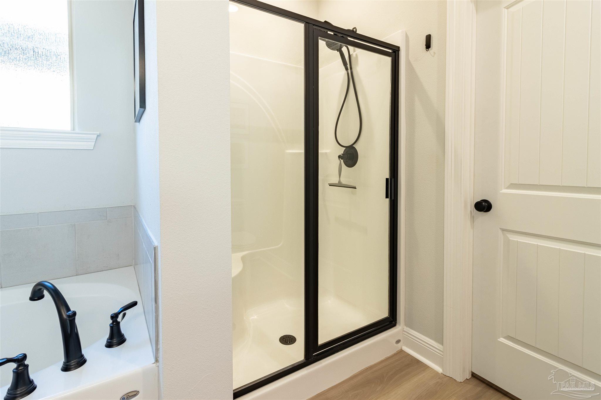 Welcome to this beautifully designed 3 bedroom, 2 bathroom home featuring an open layout with a desirable split floor plan. Luxury vinyl plank flooring extends throughout the entire home for a clean and cohesive look. The kitchen includes quartz countertops, a large island, subway tile backsplash, walk in pantry, stainless appliances, undermount sink, cabinet hardware, and recessed lighting. The spacious primary suite offers a double vanity, garden tub, separate shower, and a generous walk-in closet. Both bathrooms include framed mirrors, and the home features upgraded lighting throughout including pendant lighting and canned lighting. A mud room with its own walk-in closet adds valuable storage space. Outdoor features include a covered rear patio, LED coach lights on each side of the garage. Additional highlights include vinyl low E MI windows, smoke and carbon monoxide detectors, architectural 30 year shingles, and established landscaping with lawn shed. Energy conscious features such as the water heater and efficient windows add everyday comfort. This home offers a modern design and thoughtful finishes throughout.