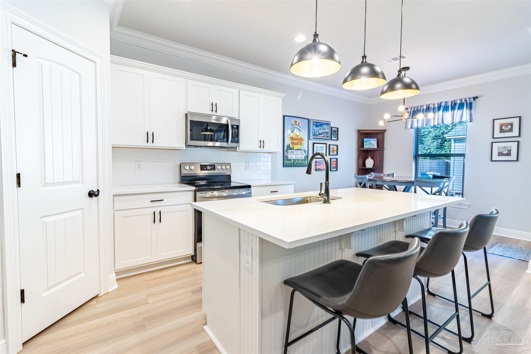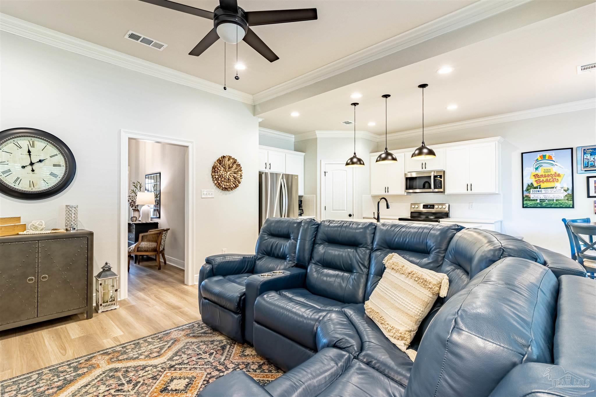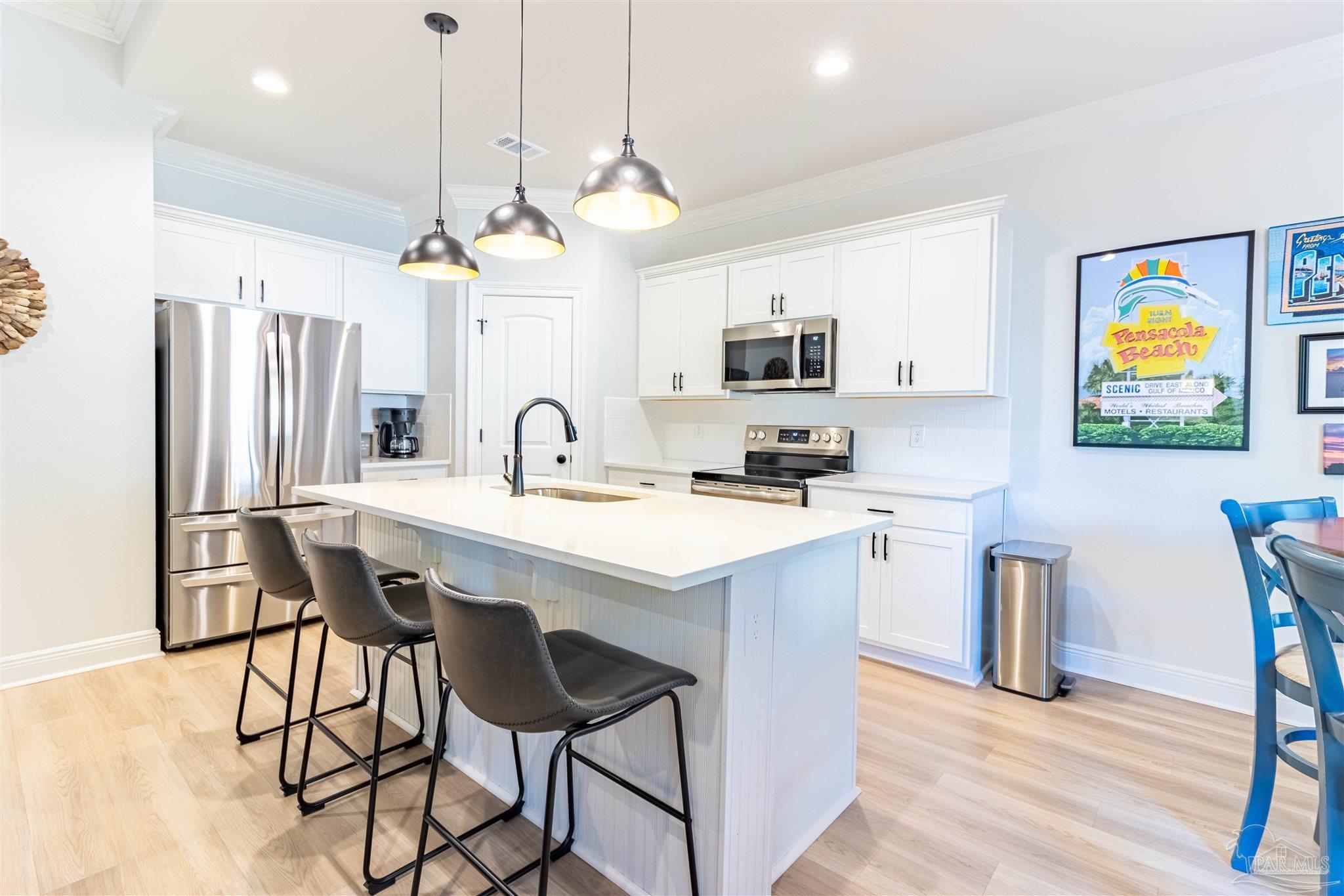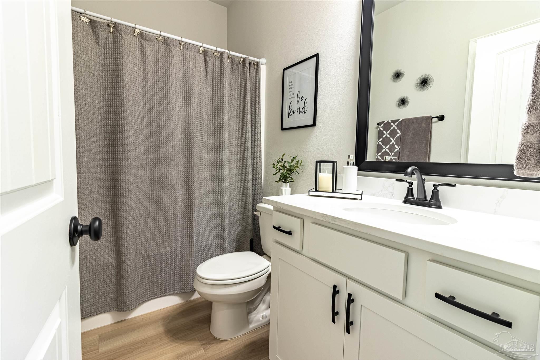 Welcome to this beautifully designed 3 bedroom, 2 bathroom home featuring an open layout with a desirable split floor plan. Luxury vinyl plank flooring extends throughout the entire home for a clean and cohesive look. The kitchen includes quartz countertops, a large island, subway tile backsplash, walk in pantry, stainless appliances, undermount sink, cabinet hardware, and recessed lighting. The spacious primary suite offers a double vanity, garden tub, separate shower, and a generous walk-in closet. Both bathrooms include framed mirrors, and the home features upgraded lighting throughout including pendant lighting and canned lighting. A mud room with its own walk-in closet adds valuable storage space. Outdoor features include a covered rear patio, LED coach lights on each side of the garage. Additional highlights include vinyl low E MI windows, smoke and carbon monoxide detectors, architectural 30 year shingles, and established landscaping with lawn shed. Energy conscious features such as the water heater and efficient windows add everyday comfort. This home offers a modern design and thoughtful finishes throughout.