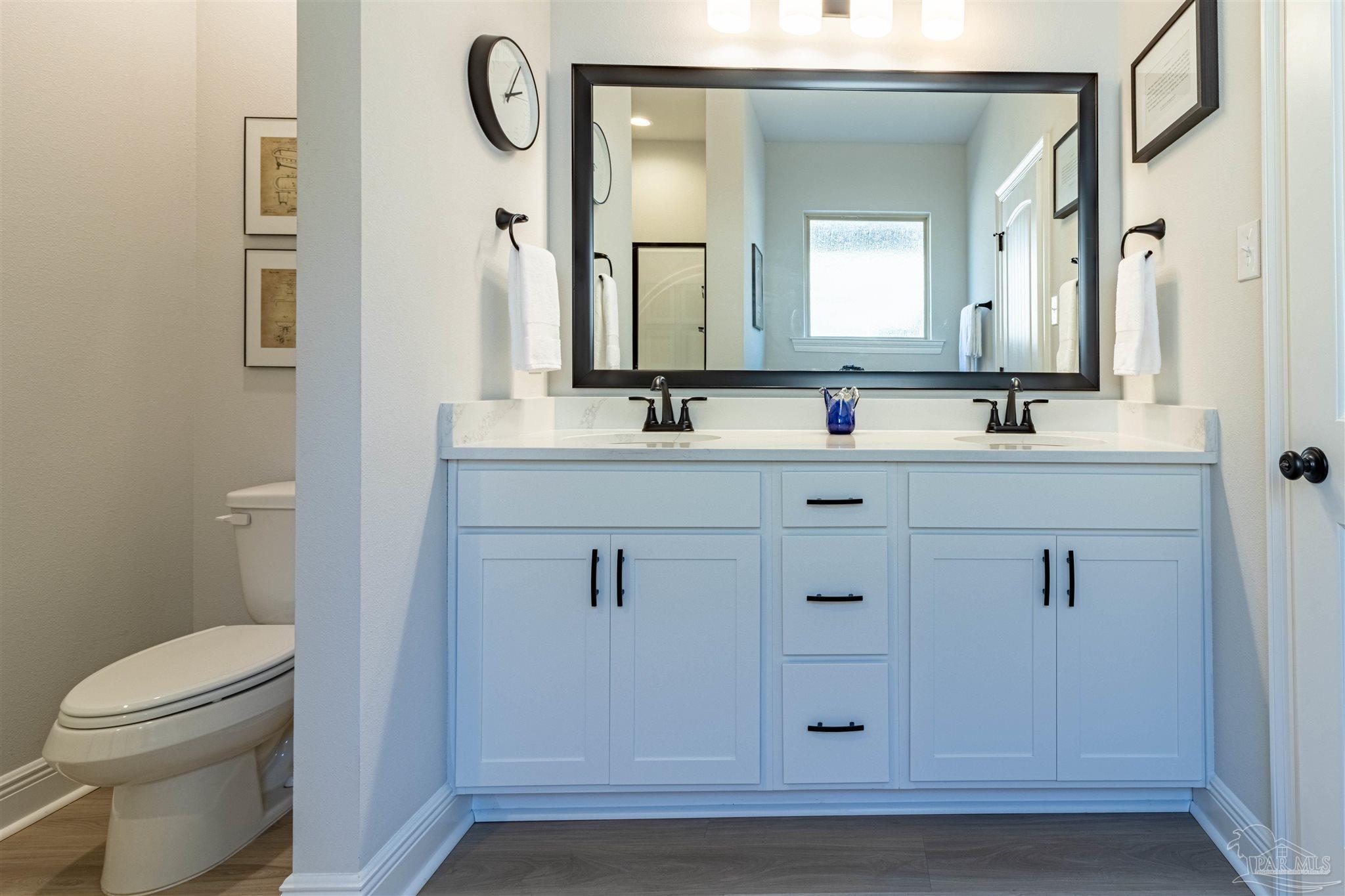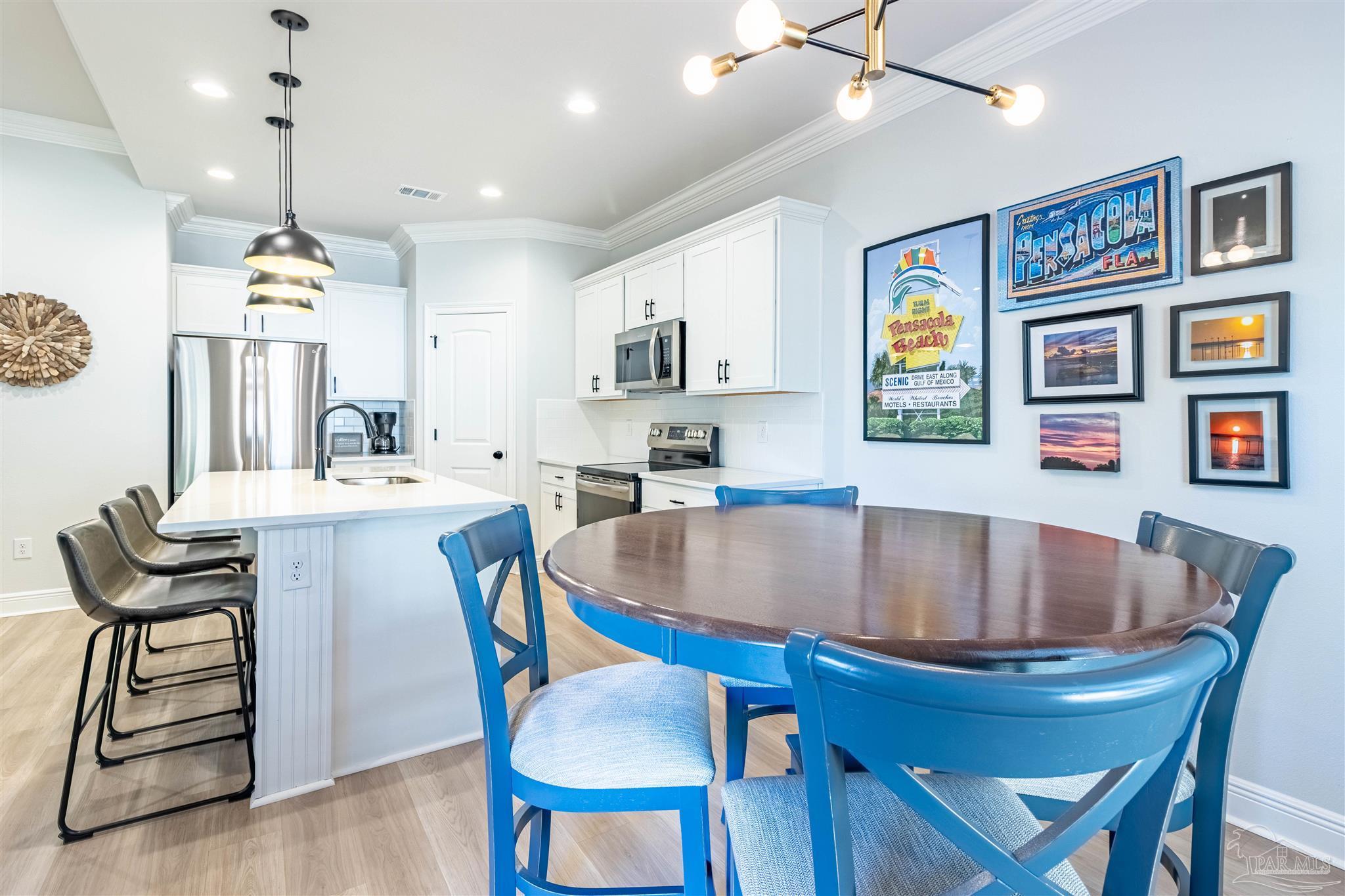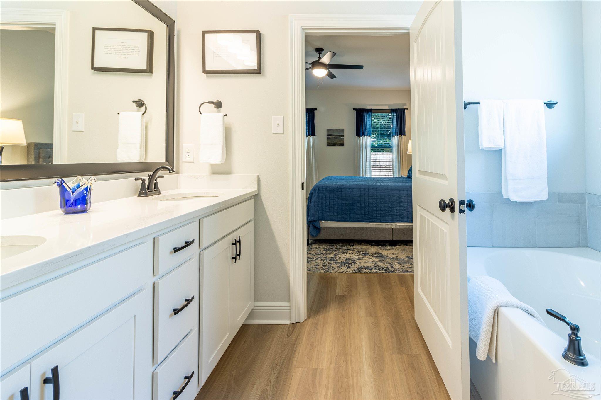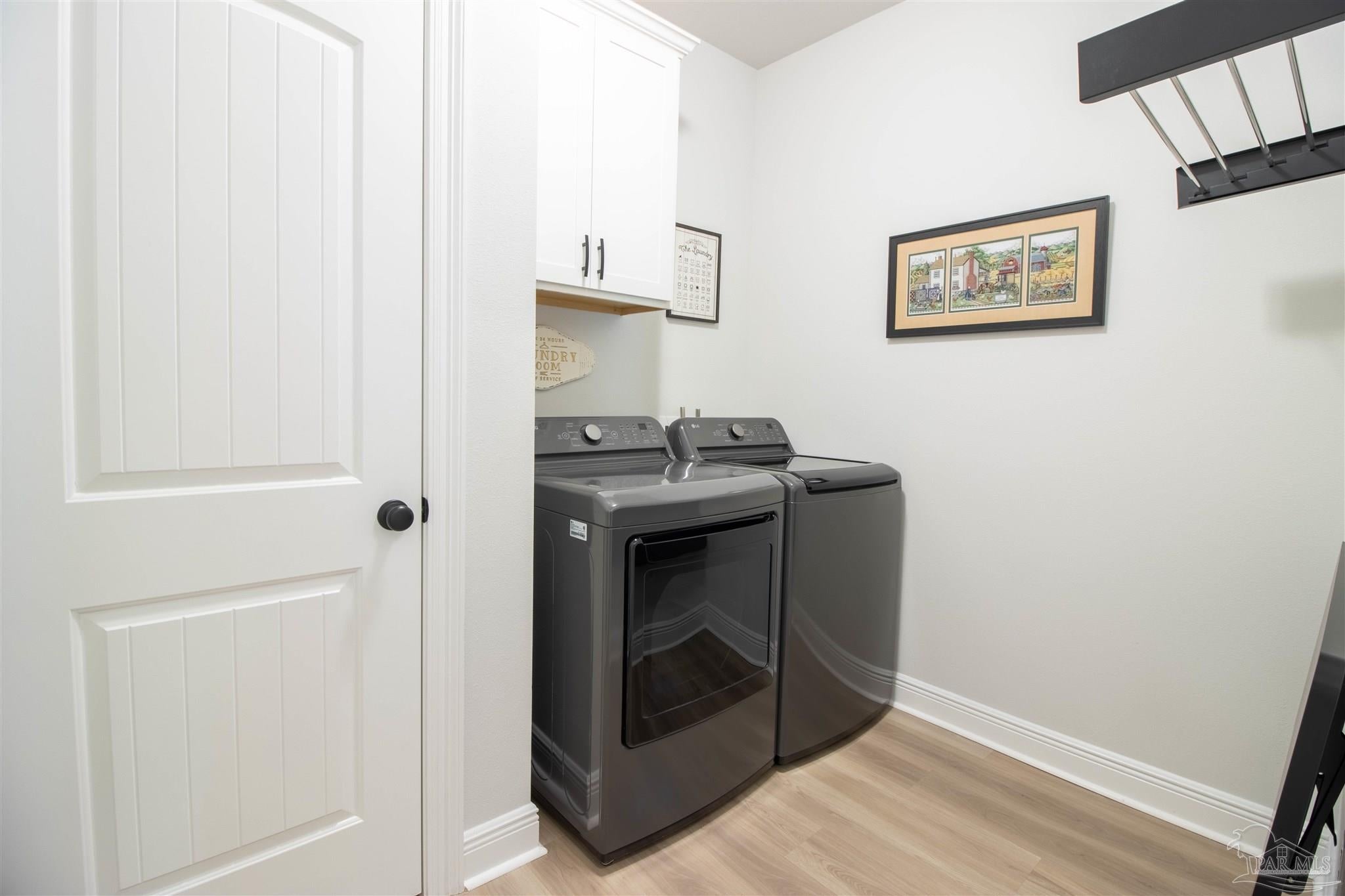 Welcome to this beautifully designed 3 bedroom, 2 bathroom home featuring an open layout with a desirable split floor plan. Luxury vinyl plank flooring extends throughout the entire home for a clean and cohesive look. The kitchen includes quartz countertops, a large island, subway tile backsplash, walk in pantry, stainless appliances, undermount sink, cabinet hardware, and recessed lighting. The spacious primary suite offers a double vanity, garden tub, separate shower, and a generous walk-in closet. Both bathrooms include framed mirrors, and the home features upgraded lighting throughout including pendant lighting and canned lighting. A mud room with its own walk-in closet adds valuable storage space. Outdoor features include a covered rear patio, LED coach lights on each side of the garage. Additional highlights include vinyl low E MI windows, smoke and carbon monoxide detectors, architectural 30 year shingles, and established landscaping with lawn shed. Energy conscious features such as the water heater and efficient windows add everyday comfort. This home offers a modern design and thoughtful finishes throughout.