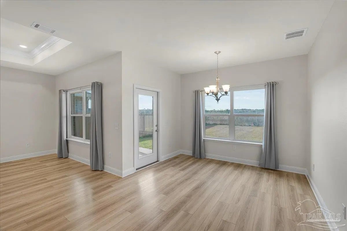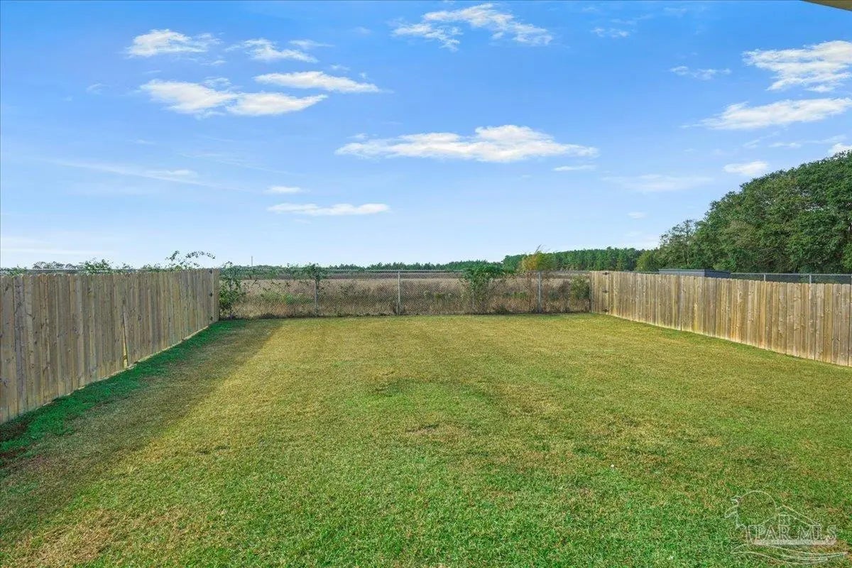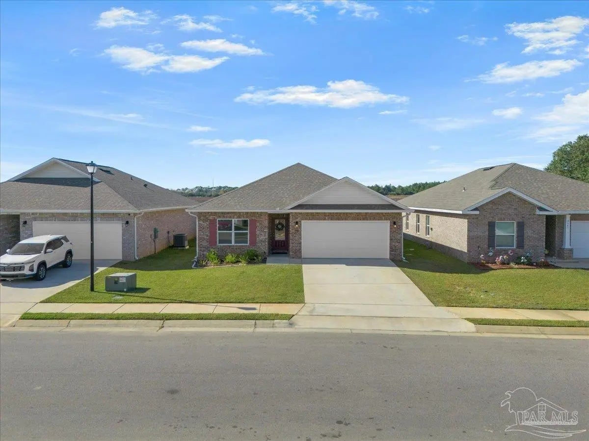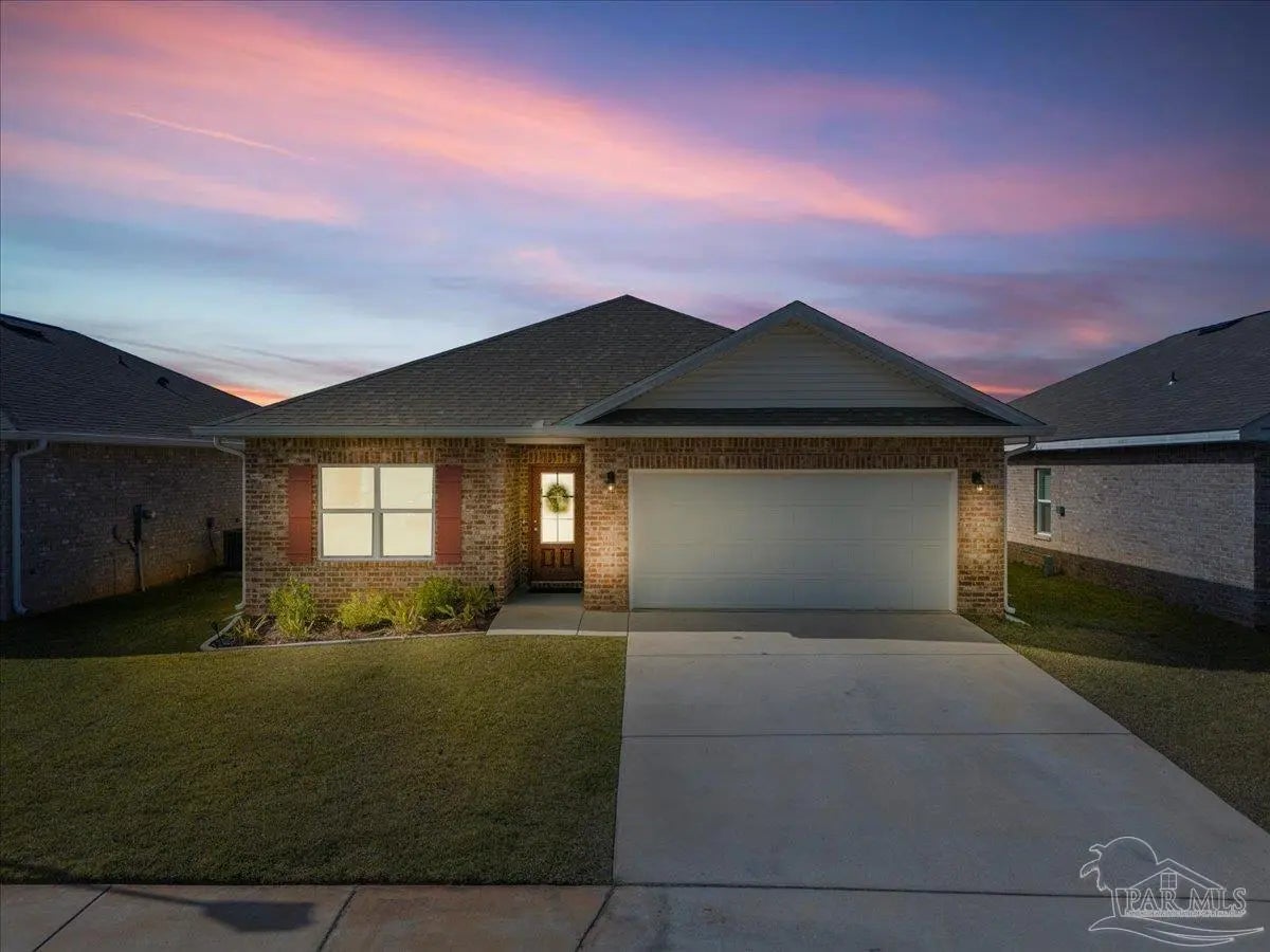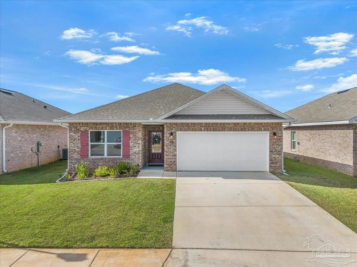 Fully fenced back yard, in ground sprinkler system, rain gutters, granite countertops throughout, LVP throughout, ceiling fans throughout, all appliances including refrigerator, washer and dryer & drapes. This home offers the perfect blend of style, convenience, and community in the highly sought-after Bentley Oaks neighborhood, complete with sidewalks throughout, a pickleball court, and a beautiful community park. This all-brick home sits on a peaceful lot with no neighbors behind you, offering privacy and tranquility just minutes from I-10, providing an easy commute to local bases, downtown Pensacola, and the beach. Step inside the popular Juniper floor plan, a thoughtfully designed 3-bedroom, 2-bath layout that feels spacious and inviting. The open-concept kitchen is the heart of the home, featuring real birch wood shaker-style cabinets with soft-close drawers, granite countertops, a large prep island, stainless steel appliances, and a built-in microwave. The breakfast nook flows seamlessly to the covered patio, perfect for morning coffee or evening entertaining. The primary suite is a private retreat with tray ceilings, a ceiling fan, and a deluxe bathroom offering a large walk-in shower, framed mirrors, LED lighting, and a spacious walk-in closet. Durable luxury LPV flooring extends through the main living areas and bedrooms. NO CARPET IN THIS HOME. Built with quality craftsmanship, this home includes a two car garage, 30-year architectural shingles, energy-efficient double-pane vinyl windows, and storm shutter protection for peace of mind. Enjoy low-maintenance living in one of the area’s most desirable communities — Bentley Oaks — where elegance, comfort, and convenience come together.