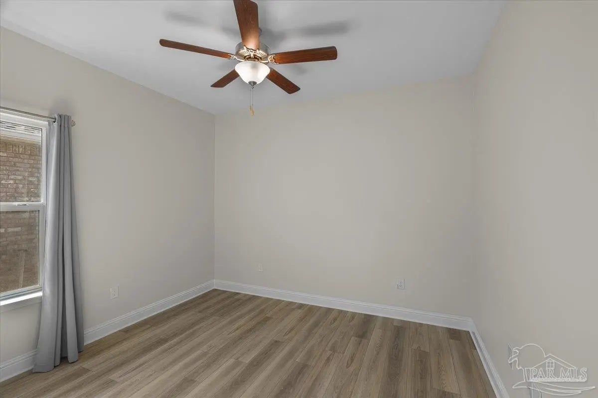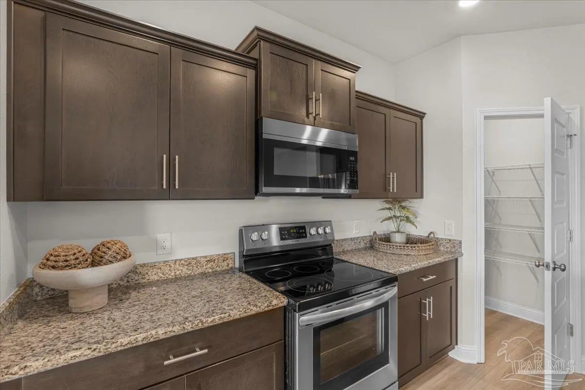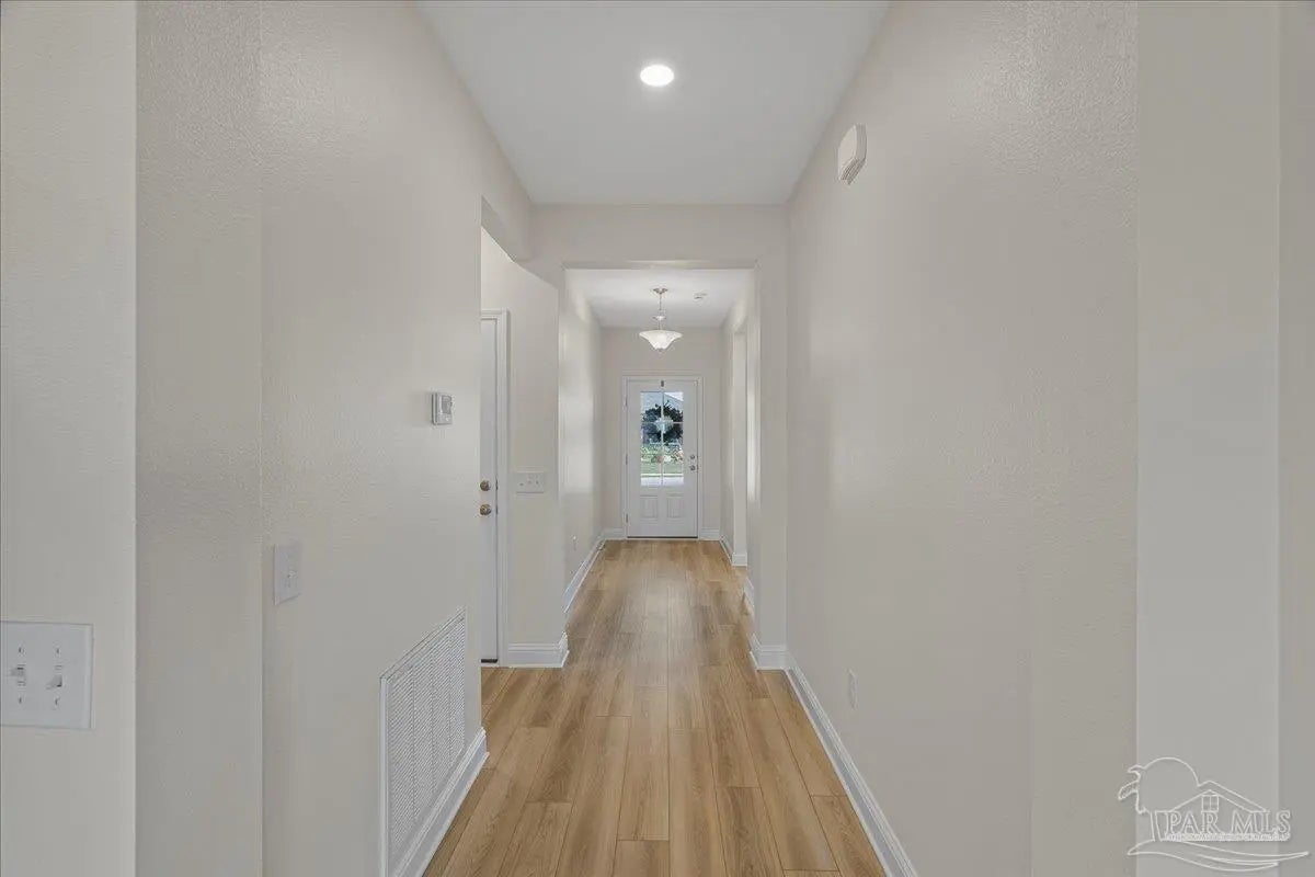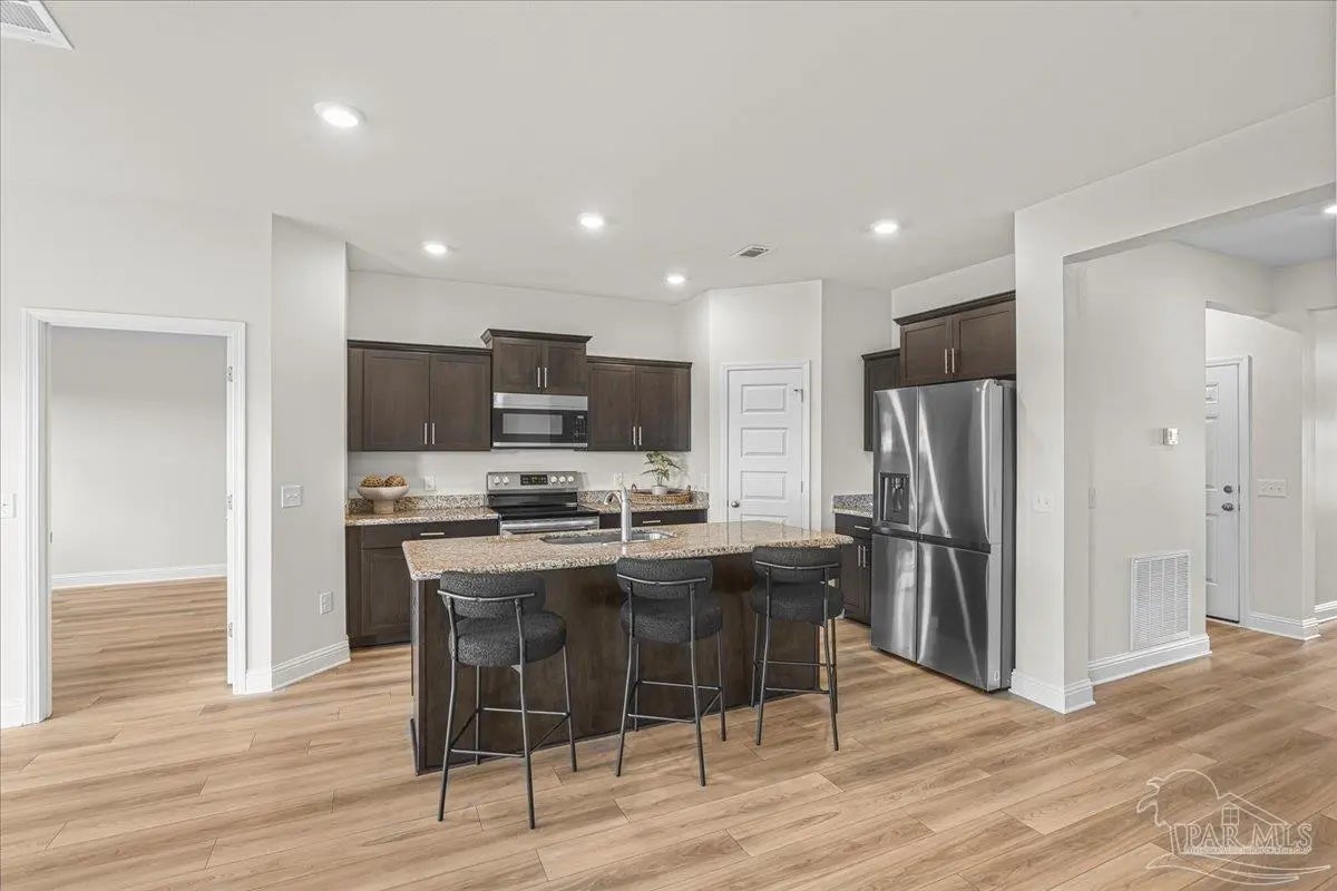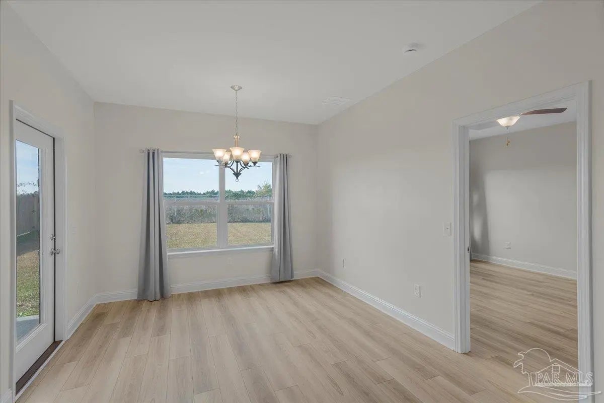 Fully fenced back yard, in ground sprinkler system, rain gutters, granite countertops throughout, LVP throughout, ceiling fans throughout, all appliances including refrigerator, washer and dryer & drapes. This home offers the perfect blend of style, convenience, and community in the highly sought-after Bentley Oaks neighborhood, complete with sidewalks throughout, a pickleball court, and a beautiful community park. This all-brick home sits on a peaceful lot with no neighbors behind you, offering privacy and tranquility just minutes from I-10, providing an easy commute to local bases, downtown Pensacola, and the beach. Step inside the popular Juniper floor plan, a thoughtfully designed 3-bedroom, 2-bath layout that feels spacious and inviting. The open-concept kitchen is the heart of the home, featuring real birch wood shaker-style cabinets with soft-close drawers, granite countertops, a large prep island, stainless steel appliances, and a built-in microwave. The breakfast nook flows seamlessly to the covered patio, perfect for morning coffee or evening entertaining. The primary suite is a private retreat with tray ceilings, a ceiling fan, and a deluxe bathroom offering a large walk-in shower, framed mirrors, LED lighting, and a spacious walk-in closet. Durable luxury LPV flooring extends through the main living areas and bedrooms. NO CARPET IN THIS HOME. Built with quality craftsmanship, this home includes a two car garage, 30-year architectural shingles, energy-efficient double-pane vinyl windows, and storm shutter protection for peace of mind. Enjoy low-maintenance living in one of the area’s most desirable communities — Bentley Oaks — where elegance, comfort, and convenience come together.