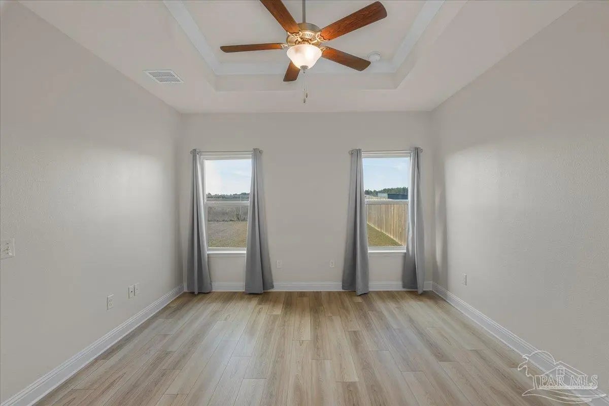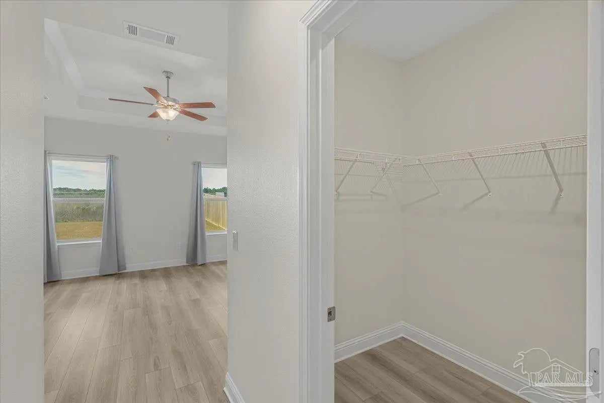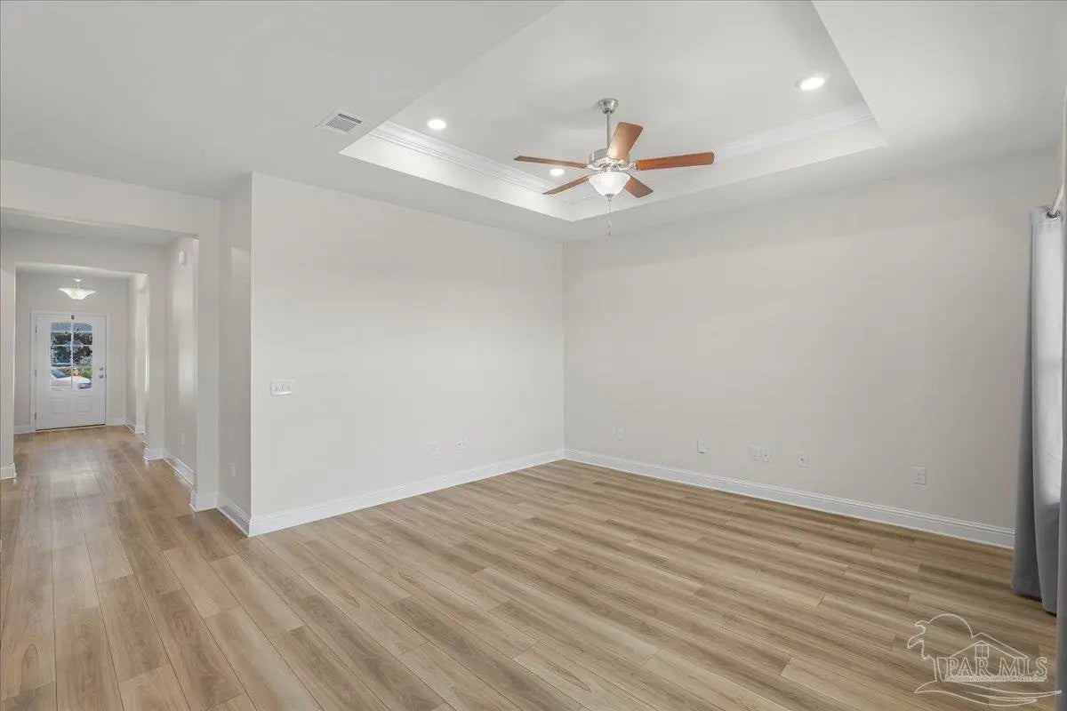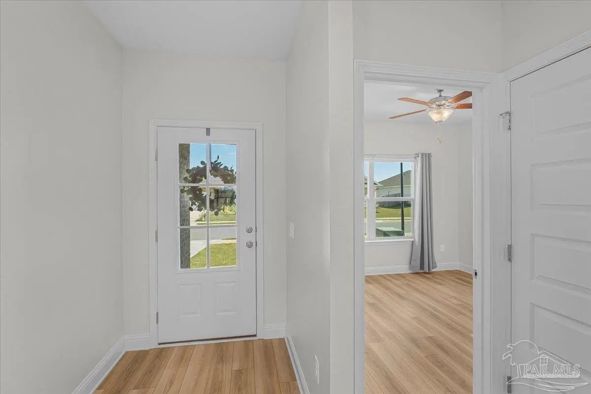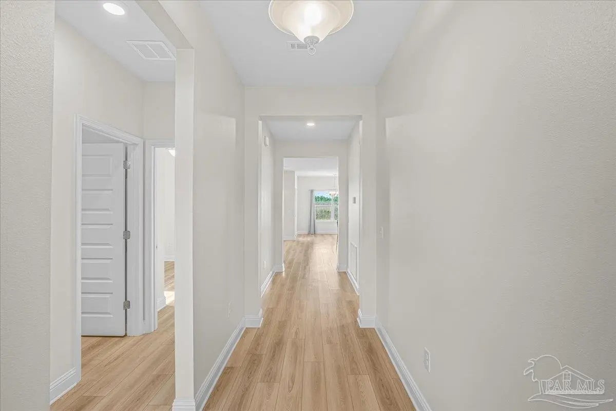 Fully fenced back yard, in ground sprinkler system, rain gutters, granite countertops throughout, LVP throughout, ceiling fans throughout, all appliances including refrigerator, washer and dryer & drapes. This home offers the perfect blend of style, convenience, and community in the highly sought-after Bentley Oaks neighborhood, complete with sidewalks throughout, a pickleball court, and a beautiful community park. This all-brick home sits on a peaceful lot with no neighbors behind you, offering privacy and tranquility just minutes from I-10, providing an easy commute to local bases, downtown Pensacola, and the beach. Step inside the popular Juniper floor plan, a thoughtfully designed 3-bedroom, 2-bath layout that feels spacious and inviting. The open-concept kitchen is the heart of the home, featuring real birch wood shaker-style cabinets with soft-close drawers, granite countertops, a large prep island, stainless steel appliances, and a built-in microwave. The breakfast nook flows seamlessly to the covered patio, perfect for morning coffee or evening entertaining. The primary suite is a private retreat with tray ceilings, a ceiling fan, and a deluxe bathroom offering a large walk-in shower, framed mirrors, LED lighting, and a spacious walk-in closet. Durable luxury LPV flooring extends through the main living areas and bedrooms. NO CARPET IN THIS HOME. Built with quality craftsmanship, this home includes a two car garage, 30-year architectural shingles, energy-efficient double-pane vinyl windows, and storm shutter protection for peace of mind. Enjoy low-maintenance living in one of the area’s most desirable communities — Bentley Oaks — where elegance, comfort, and convenience come together.
