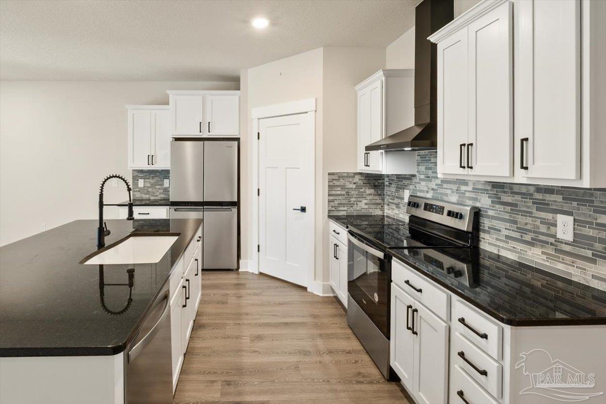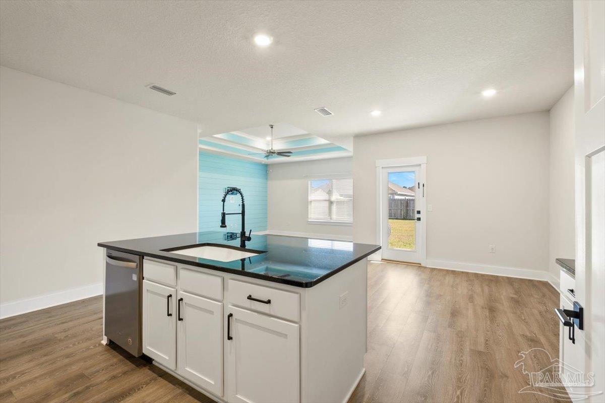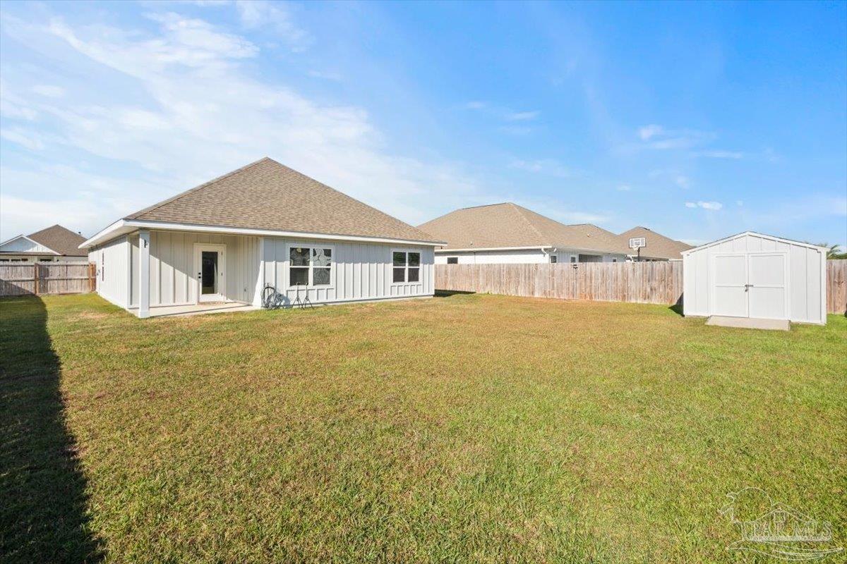 Upgraded 4-bedroom open-concept home in desirable Forest Bay Estates with access to a community pool! The great room features a high boxed ceiling, recessed lighting, and luxury vinyl plank flooring for both style and functionality. The kitchen showcases a granite-topped island with breakfast bar, abundant cabinetry, glass tile backsplash, custom range hood, deep sink with touchless aerator sprayer, stainless steel appliances (including refrigerator), and a pantry with custom shelving. The primary suite offers a high tray ceiling, walk-in closet with extra shelving, dual granite vanity, and an upgraded tiled shower with glass sliding doors. Guest bedrooms share a full bath with a granite vanity and elegant waterfall faucets. Additional highlights include recessed lighting and custom shelving in the garage, aluminum folding attic stairs with attic flooring, a covered back porch perfect for relaxing, and a fenced backyard with solar motion lights, a 10’ x 10’ storage shed, and fabric shield window protection. Conveniently located near shopping, schools, and beautiful beaches!