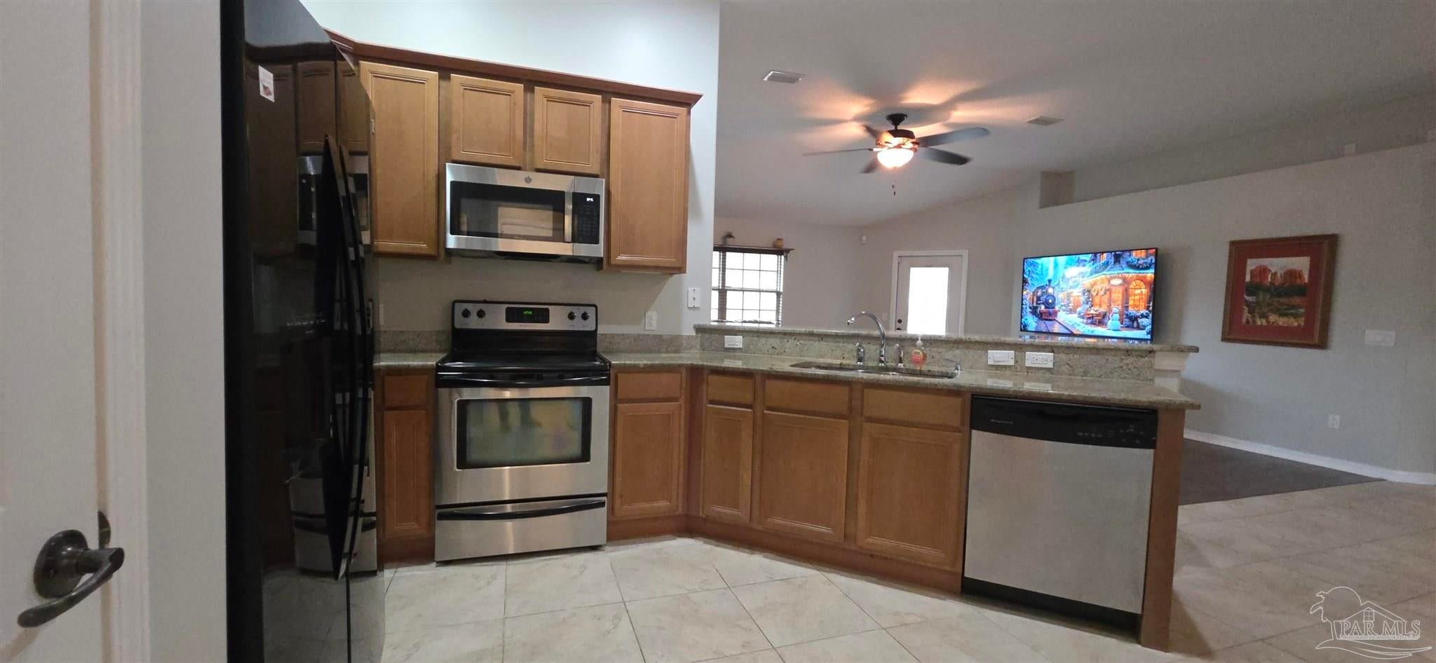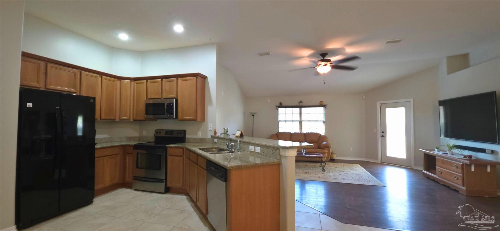 Just minutes from beautiful Navarre Beach, this charming home sits in an established, sound-side neighborhood and is comfortably located in a no-flood zone. Step onto the spacious screened front porch—an ideal spot to enjoy a gentle breeze, sip your morning coffee, or unwind after a long day. Inside, you’re greeted by soaring ceilings and an open floor plan that creates a bright, airy feel throughout the main living area. This thoughtfully designed home features three bedrooms and three full bathrooms, including two walk-in showers and a relaxing garden tub in the main suite. The kitchen offers beautiful granite countertops and comes fully equipped with a refrigerator, stove, dishwasher, and microwave. The main bedroom features its own private entrance to the patio, which is already wired for a hot tub—the perfect place to create your own backyard oasis. Outside, you’ll also enjoy a privacy-fenced backyard, RV parking pad, oversized driveway, and a convenient storage shed. The home is also equipped with hurricane shields for added peace of mind. Some of the updates are: Vinyl plank flooring (2022), Tankless water heater (2023), Pump for sprinkler system (2024). The roof is approximately 5 years old, according to the seller. With comfort, functionality, and a fantastic location near the white-sand beaches and emerald-green waters of the Gulf, and shopping close by, this inviting home truly has it all!