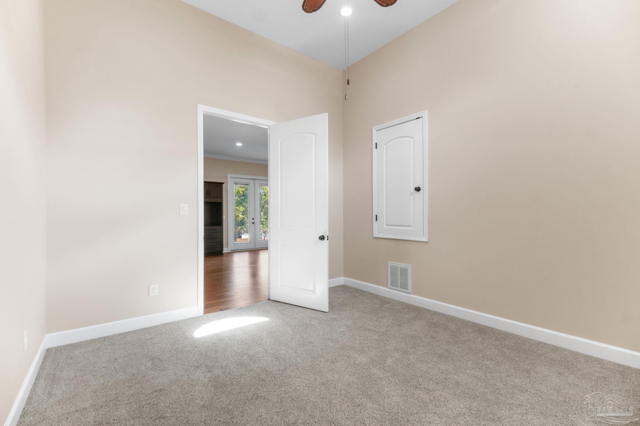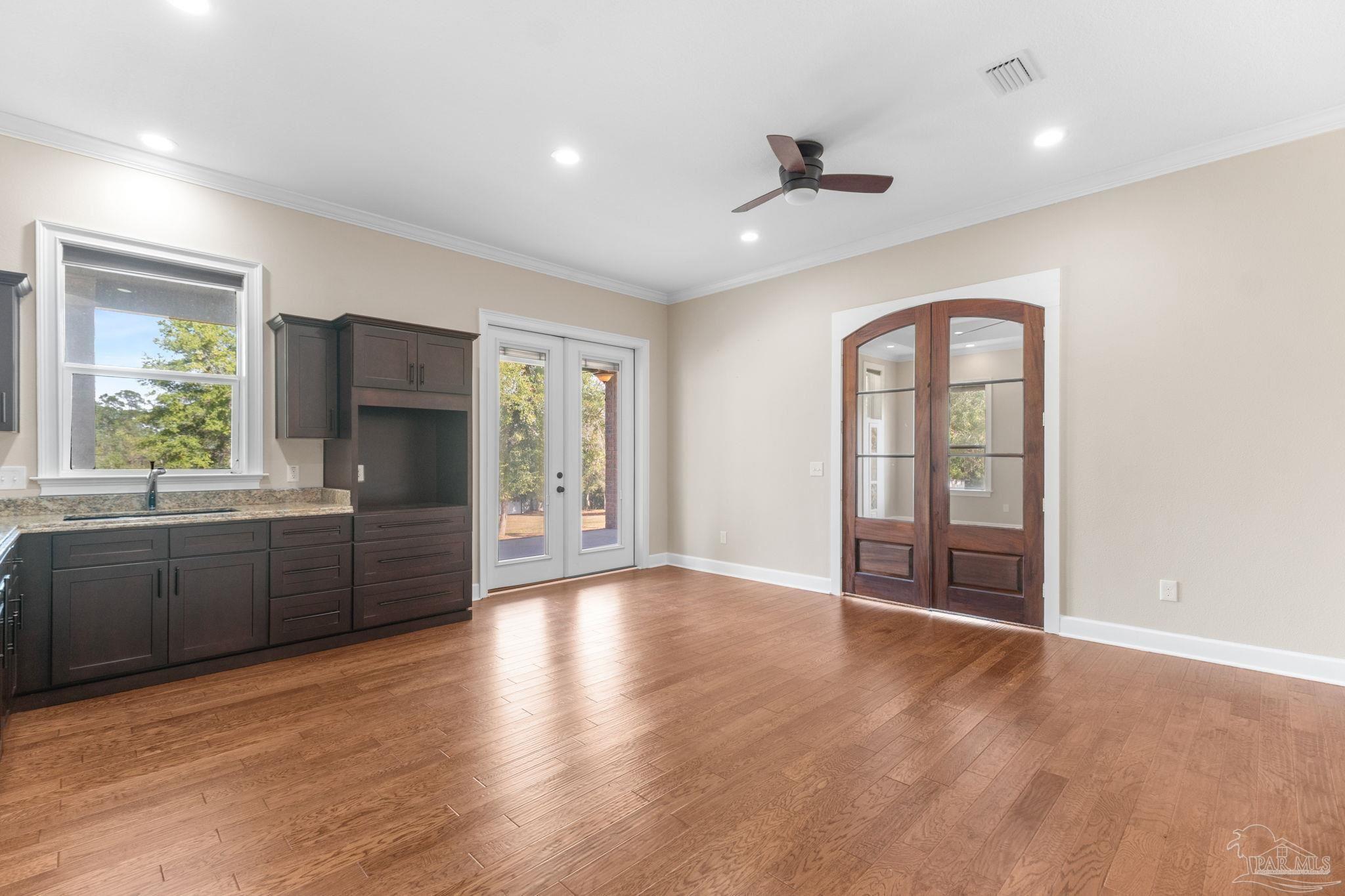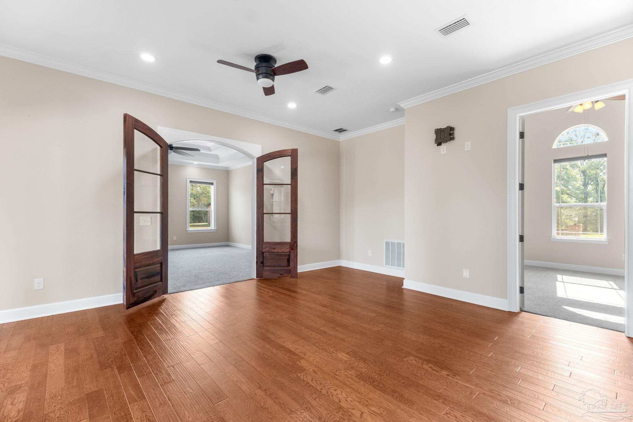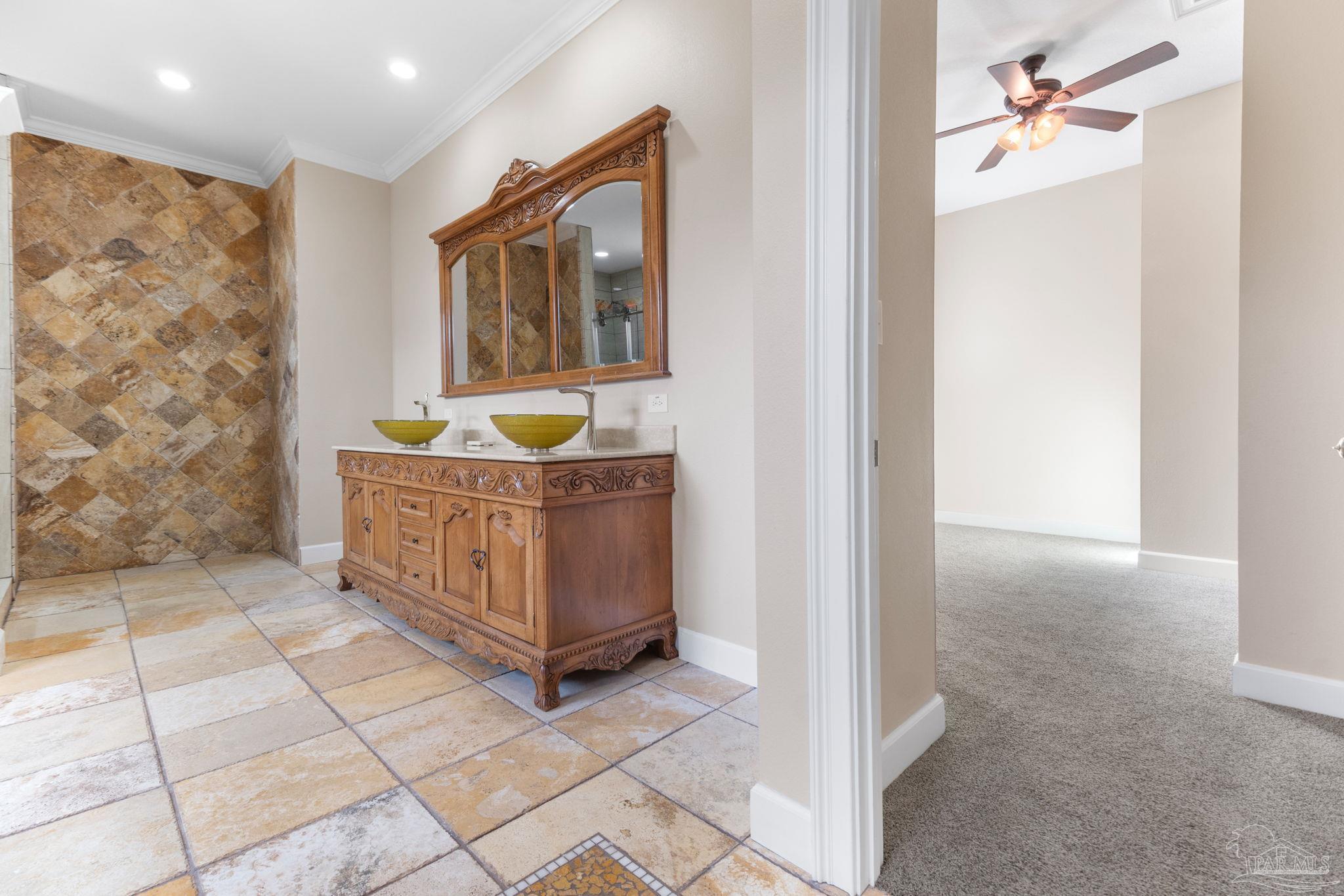 Discover refined living on this over-five-acre estate, featuring two residences and a private-entry guest cottage/studio ideal for extended stays, multi-generational living, or creative use. A travertine and sandstone courtyard welcomes you to the primary 4,499-sq-ft home, introduced by a hand-crafted, double front door. Inside, a grand foyer sets the tone with a custom barrel ceiling, mosaic tile, and crystal chandeliers. Marble floors and wood columns lead to an elegant formal living room with a coffered ceiling and wood-framed bay windows. The formal dining room features engineered wood flooring, a tray ceiling, and 6" crown molding. The main gourmet kitchen is a chef’s dream with soft-close maple cabinetry, exotic Bengal granite, an island, recessed and pendant lighting, and a lighted eat-in breakfast bar. A Blue Star gas range and double ovens complete the space. Hallways span four feet wide, trimmed in crown molding with detailed door and window casings. The expansive primary suite is a retreat of its own, complete with its own private kitchen, sitting area, office, and oversized walk-in closet. The luxurious bath showcases an 8-person custom travertine shower with mosaic inlay, dual benches, rain and jet heads, and back-lit onyx. A stainless steel clawfoot tub, waterfall faucet, and Turkish bowl vanities add spa-level elegance. Connected by a breezeway, the 24x24 guest cottage/studio includes its own entrance, travertine and carpet flooring, washer/dryer hookup, stainless stove, granite surfaces, and a bath with marble shower, single vanity, and closet. The second residence—a charming 1,566-sq-ft, 3-bed/2-bath home—offers brick flooring, a formal dining room with brick accents, a full kitchen with hickory cabinetry and marble countertops, and a generous utility closet. With so much this exceptional property has to offer, one must simply see it to believe it. Opportunities like this are rare. Claim your private viewing of this remarkable estate today.