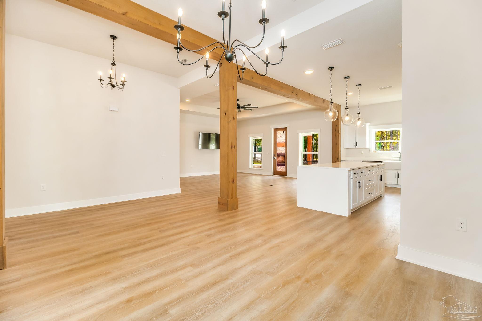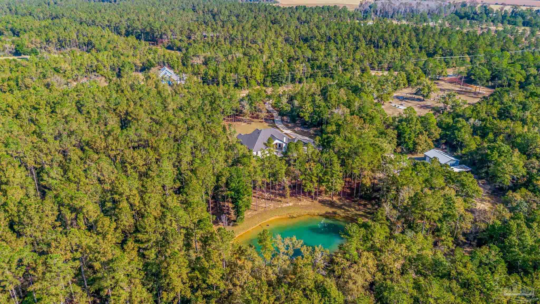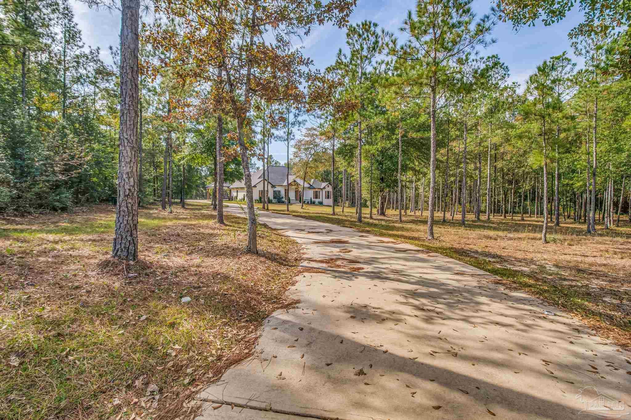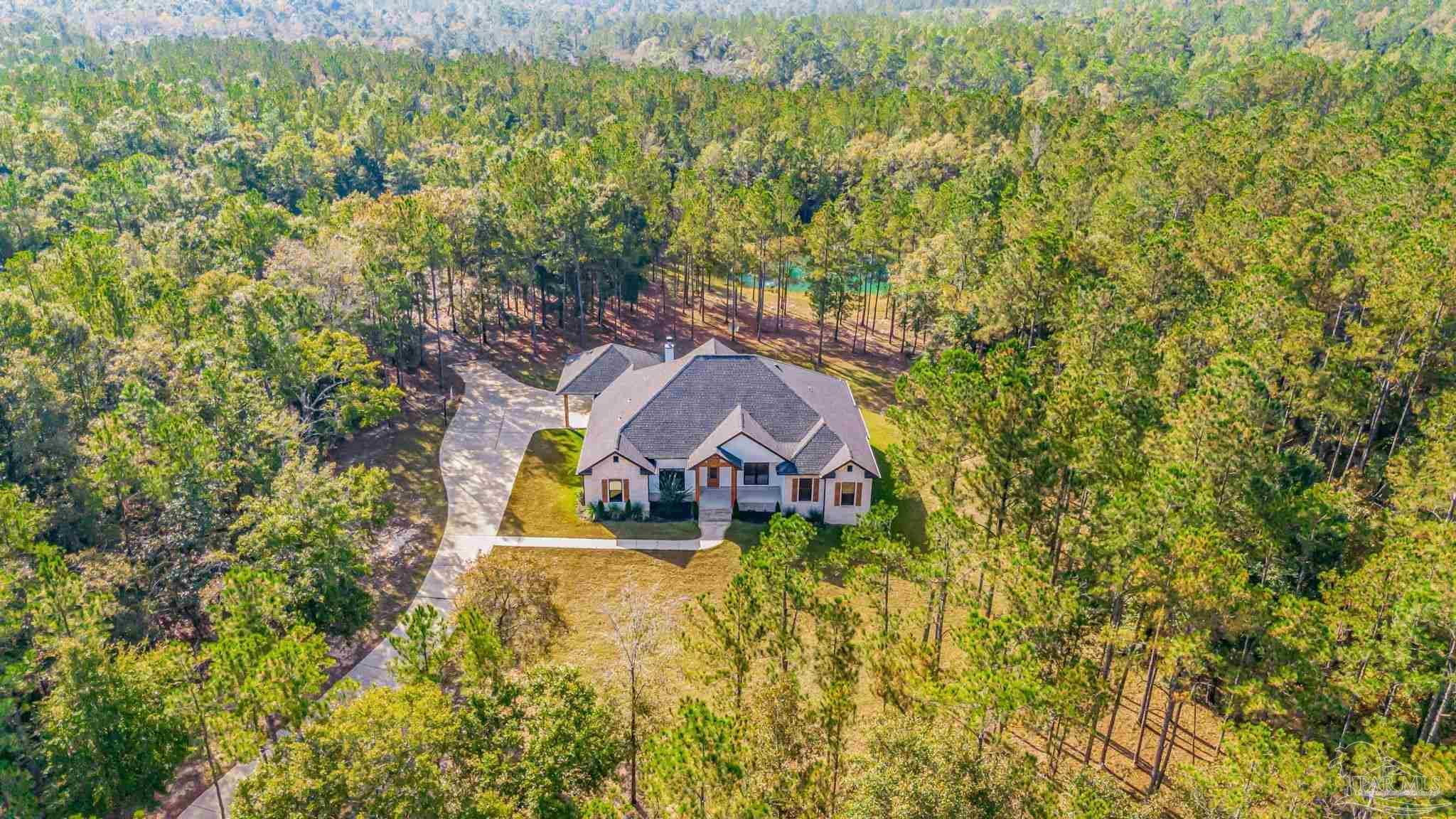 Introducing a stunning custom home on 5.27 acres in the heart of Pace. This newer-construction property offers the perfect blend of modern comfort, timeless finishes, and peaceful country living — all in a centrally located, highly desirable area. Step inside to an open, split floor plan with luxury vinyl plank flooring throughout. The kitchen features quartz countertops, white cabinetry, stainless-steel appliances, and a spacious island overlooking the dining area and living room. The living room is bright and inviting with recessed lighting and a tray ceiling accented by beautiful wood beams. The primary suite is a true retreat with natural light, tray ceiling detail, and an electric fireplace. The spa-like primary bath offers a walk-in tiled shower, separate garden tub, and double vanity. One of the standout features of this home is the oversized master closet with direct access to the laundry room, which also leads straight out to the back porch for everyday convenience. Outside, you’ll find brick and Hardi-plank siding with gutters, along with a large back porch designed for year-round enjoyment. This outdoor living space includes a brick fireplace and outdoor kitchen, creating the perfect spot for entertaining or relaxing after a long day. A 2-car carport sits on the left side of the home, offering convenient access to the back porch, laundry room, and main living area. Additional property features include a private well, septic tank, long winding concrete driveway, beautiful pond, and a 26x36 barn with 14’ eaves, two 12’x10’ roll-up doors, a walk-through door, and gutters. This gorgeous homestead checks every box — privacy, acreage, thoughtful design, and an unbeatable Pace location. A must-see property!
