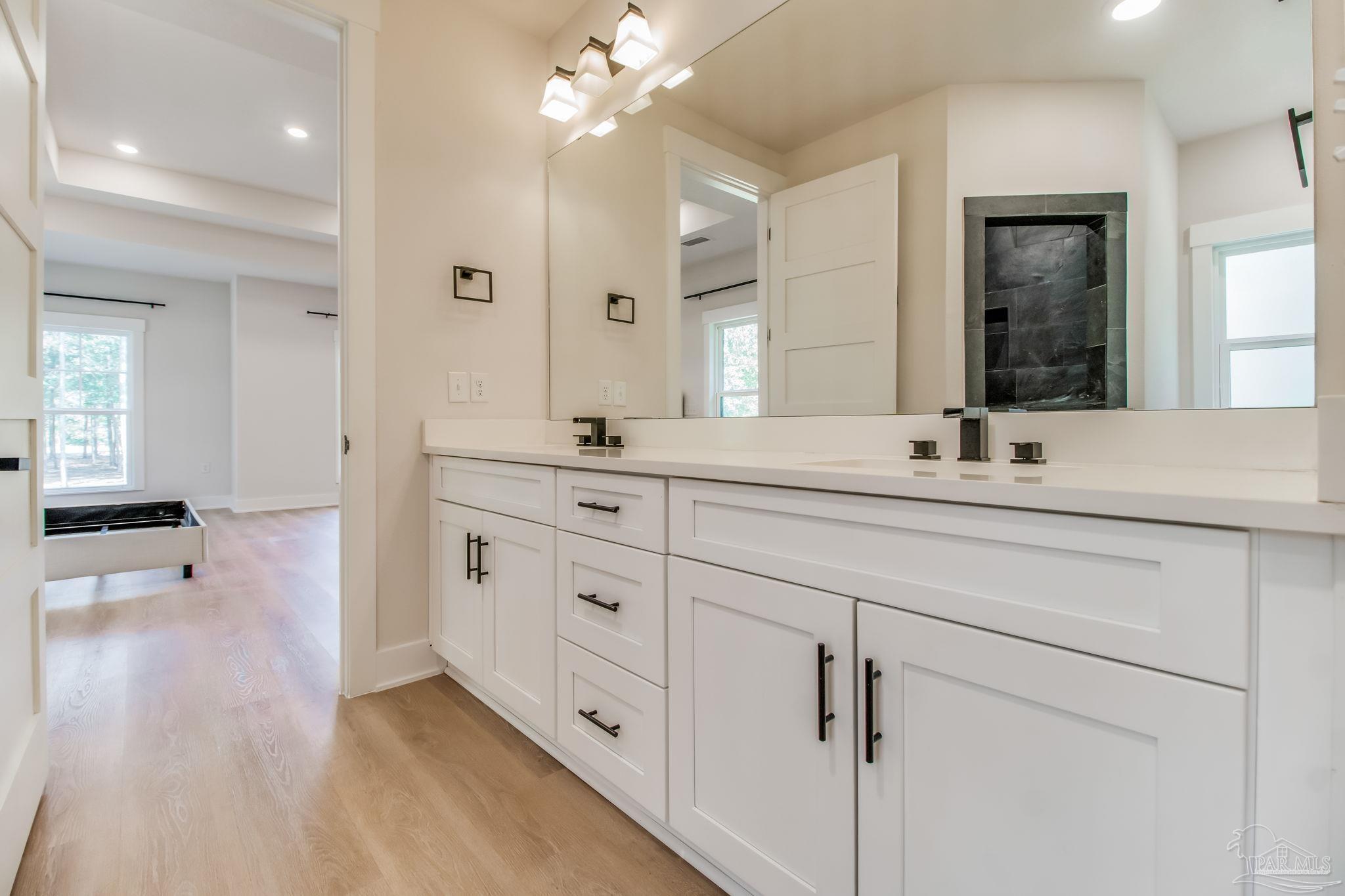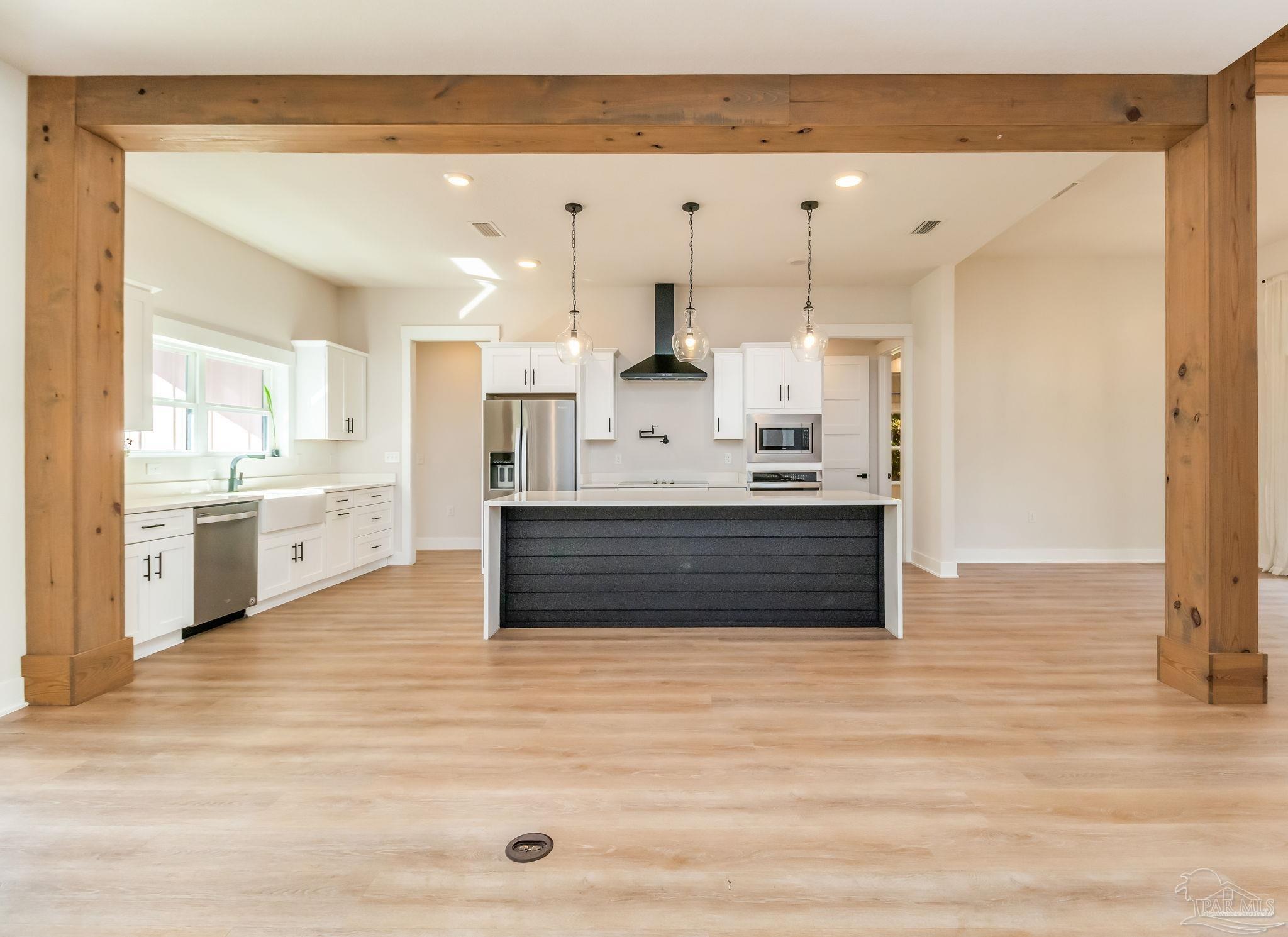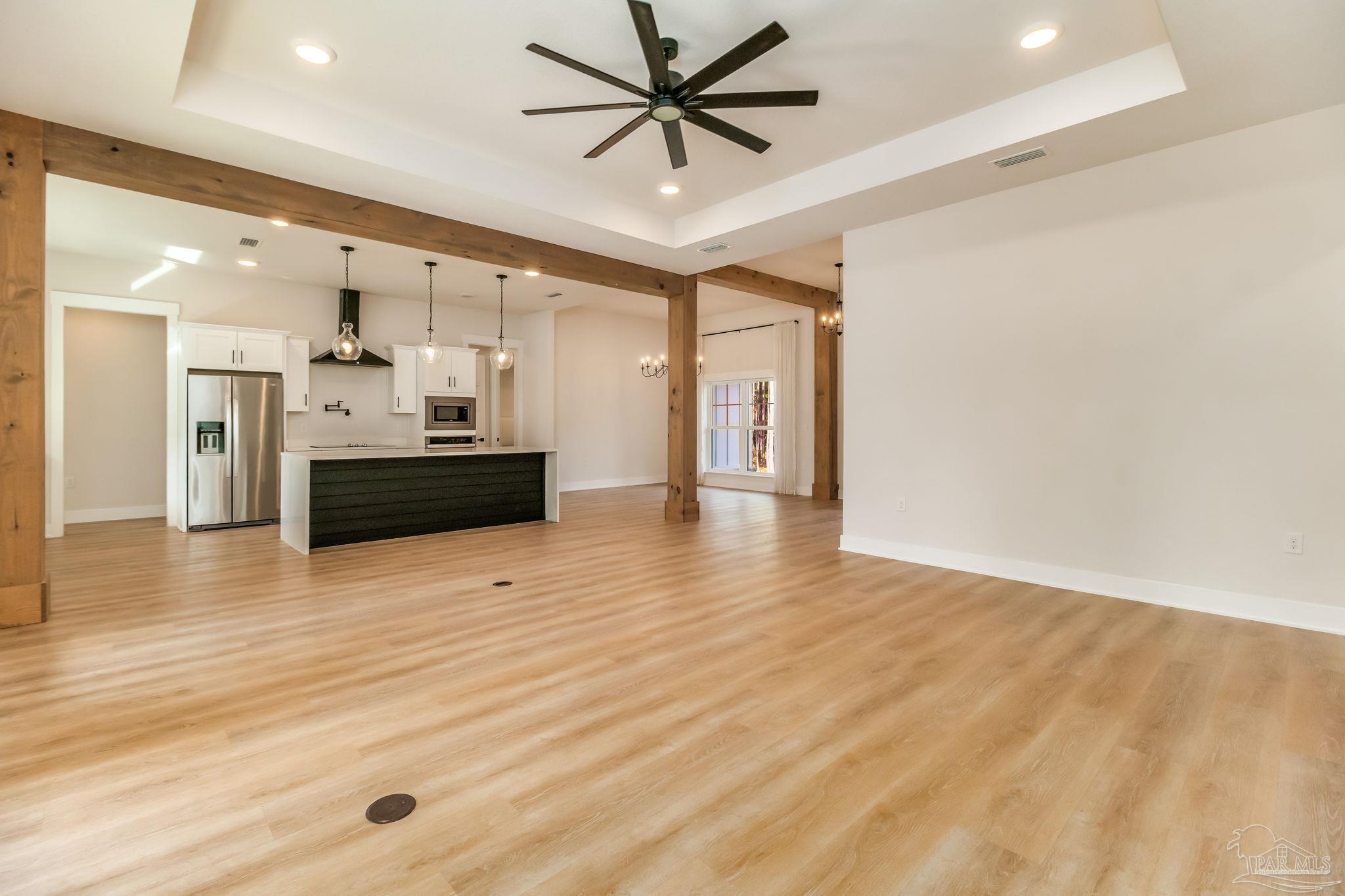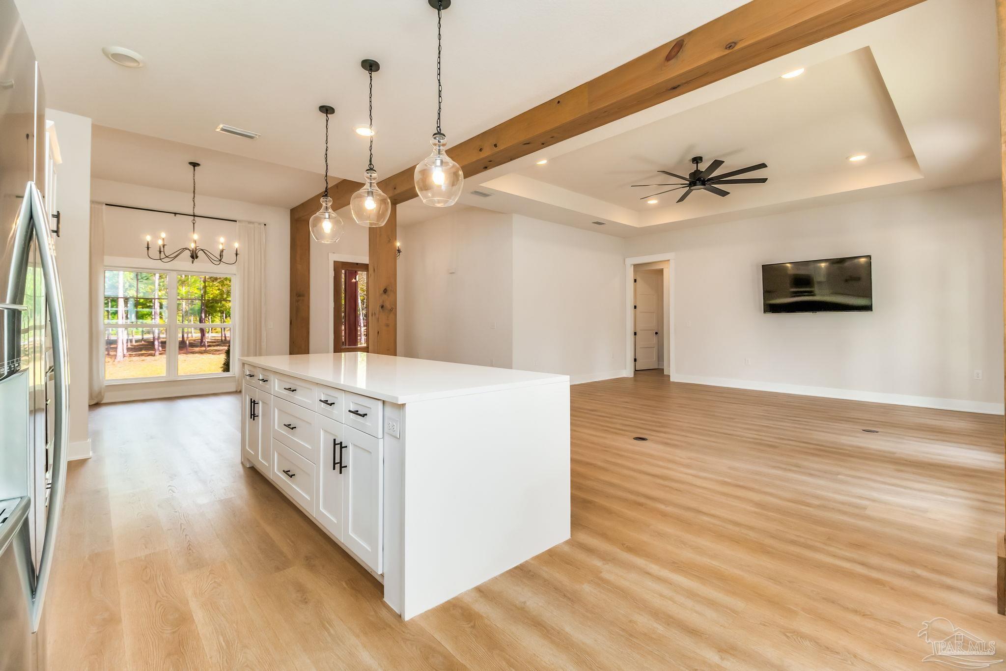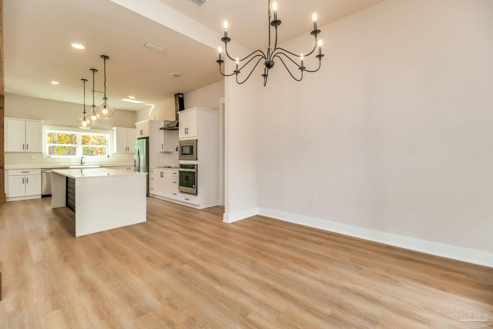 Introducing a stunning custom home on 5.27 acres in the heart of Pace. This newer-construction property offers the perfect blend of modern comfort, timeless finishes, and peaceful country living — all in a centrally located, highly desirable area. Step inside to an open, split floor plan with luxury vinyl plank flooring throughout. The kitchen features quartz countertops, white cabinetry, stainless-steel appliances, and a spacious island overlooking the dining area and living room. The living room is bright and inviting with recessed lighting and a tray ceiling accented by beautiful wood beams. The primary suite is a true retreat with natural light, tray ceiling detail, and an electric fireplace. The spa-like primary bath offers a walk-in tiled shower, separate garden tub, and double vanity. One of the standout features of this home is the oversized master closet with direct access to the laundry room, which also leads straight out to the back porch for everyday convenience. Outside, you’ll find brick and Hardi-plank siding with gutters, along with a large back porch designed for year-round enjoyment. This outdoor living space includes a brick fireplace and outdoor kitchen, creating the perfect spot for entertaining or relaxing after a long day. A 2-car carport sits on the left side of the home, offering convenient access to the back porch, laundry room, and main living area. Additional property features include a private well, septic tank, long winding concrete driveway, beautiful pond, and a 26x36 barn with 14’ eaves, two 12’x10’ roll-up doors, a walk-through door, and gutters. This gorgeous homestead checks every box — privacy, acreage, thoughtful design, and an unbeatable Pace location. A must-see property!