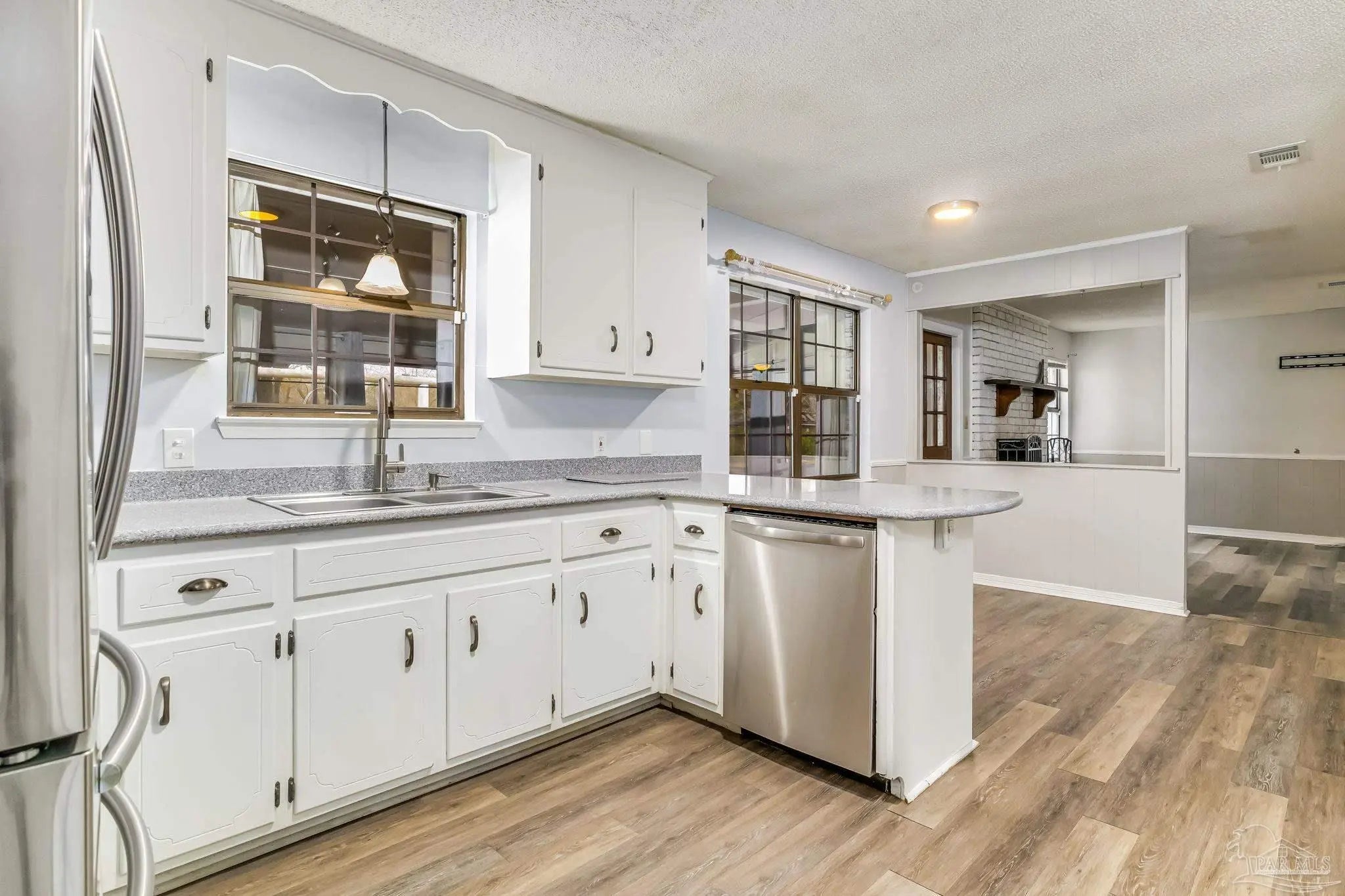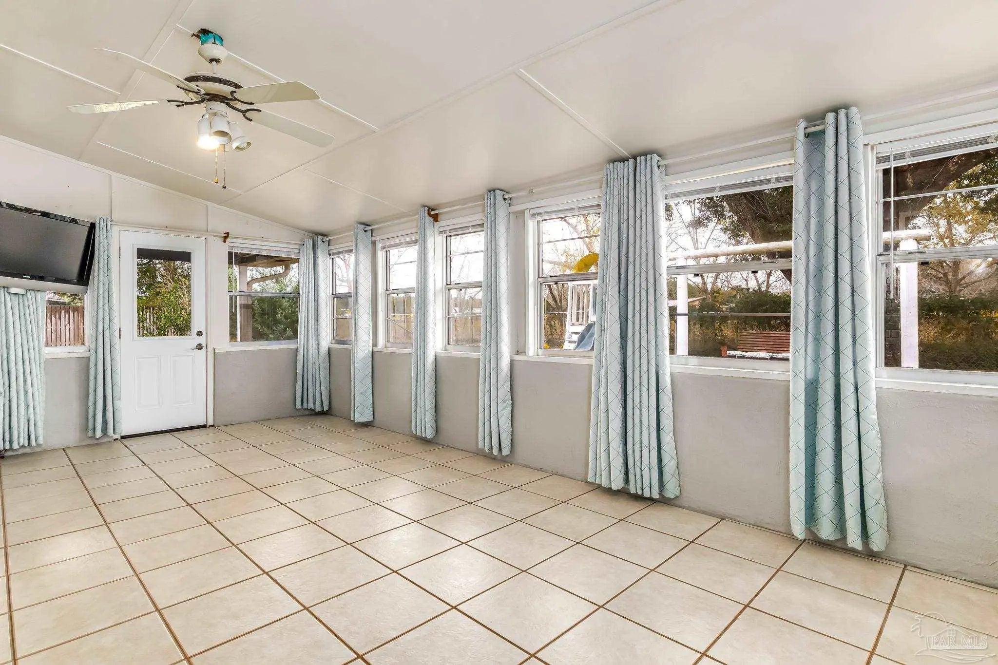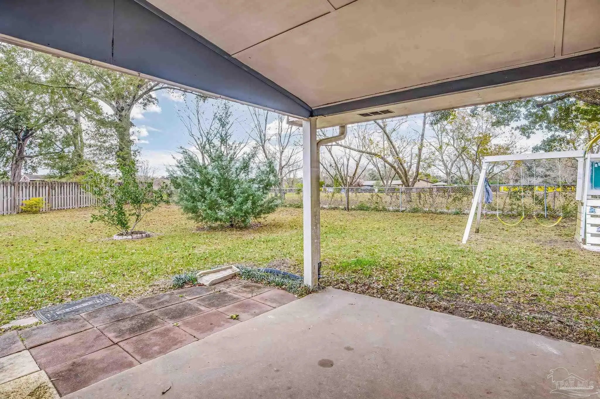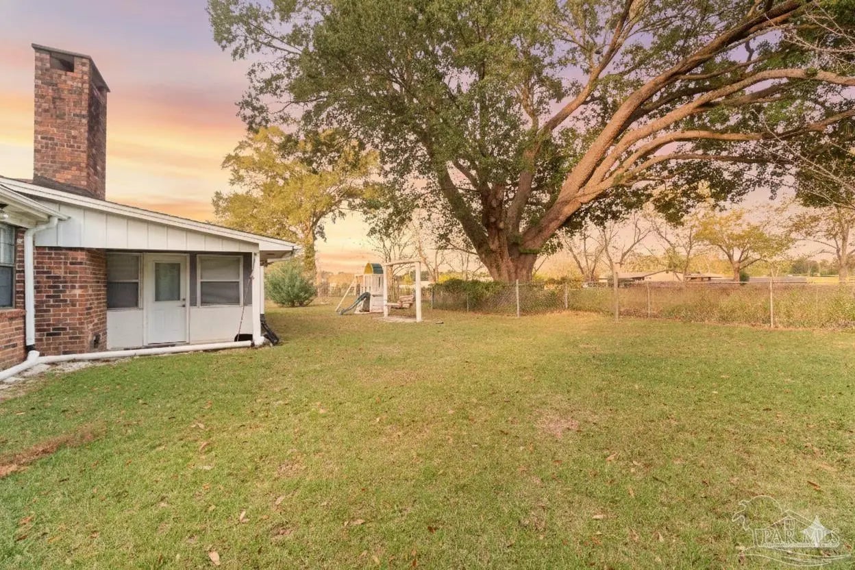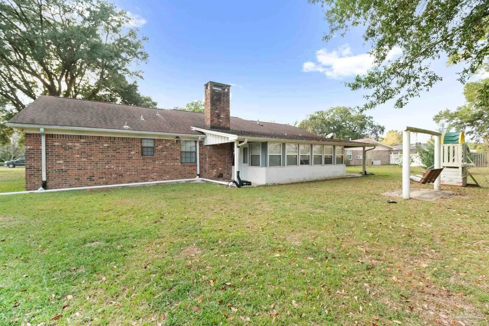 RARE OPPORTUNITY: ASSUMABLE MORTGAGE AVAILABLE At the end of a quiet cul-de-sac, this inviting Pace home sits on nearly half an acre and offers space, charm, and features you do not come across every day. The layout includes two separate living areas, a formal dining room, and a cozy real wood-burning fireplace that creates a warm and welcoming centerpiece. The kitchen has been refreshed with all new appliances, and the laundry room is equipped with custom built-ins for effortless organization. Natural light pours into the expansive Florida room, wrapped in windows and designed to connect the indoors with the outdoors. Step outside to a backyard that feels like your own private orchard. Lining the back fence are mature fruit trees and bushes, including lemon, lime, fig, pear, plum, and blackberry. The outdoor space also features a playset, built-in swing, and two covered porches, making it perfect for relaxing, entertaining, or enjoying the land year-round. This home offers three bedrooms, a two-car garage, an approximately eight-year-old roof, public water and sewer, and natural gas service. All of this in a highly desirable Pace location with the added bonus of an assumable loan for qualified buyers.