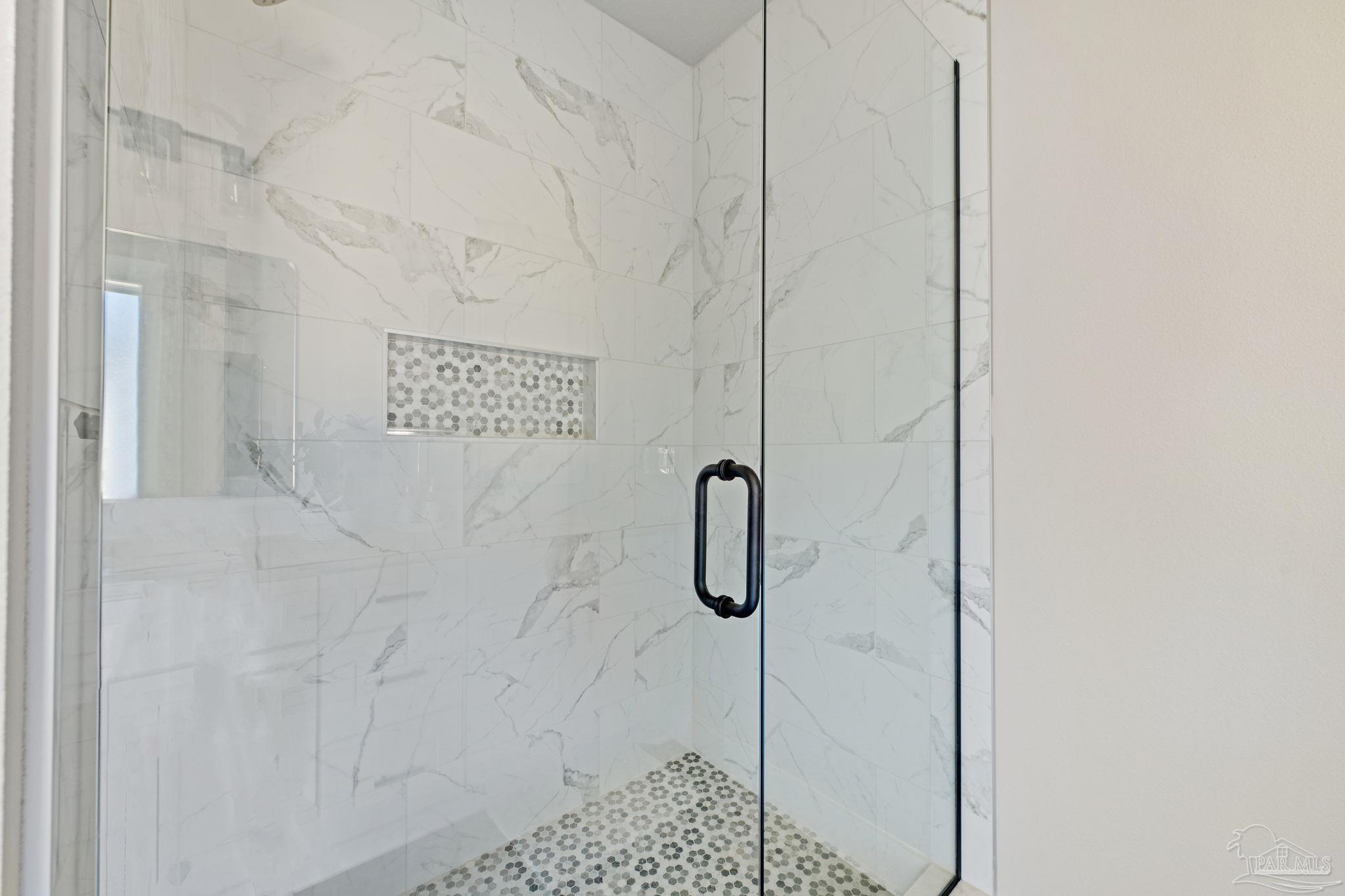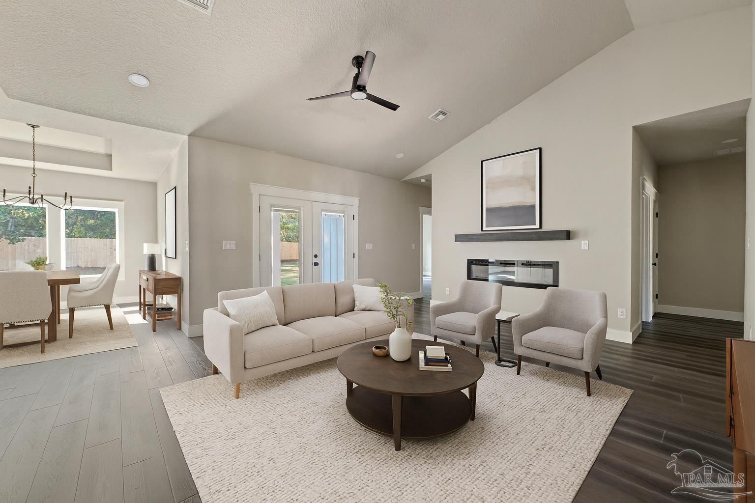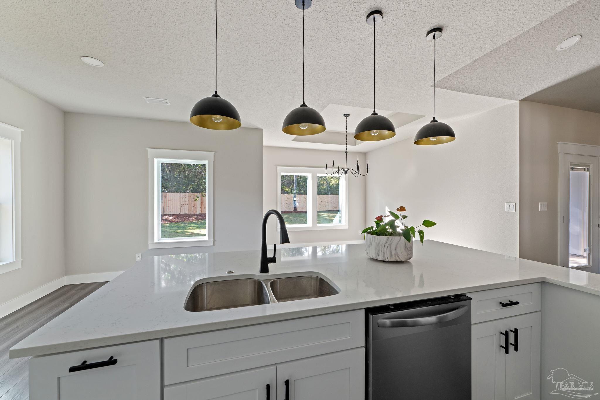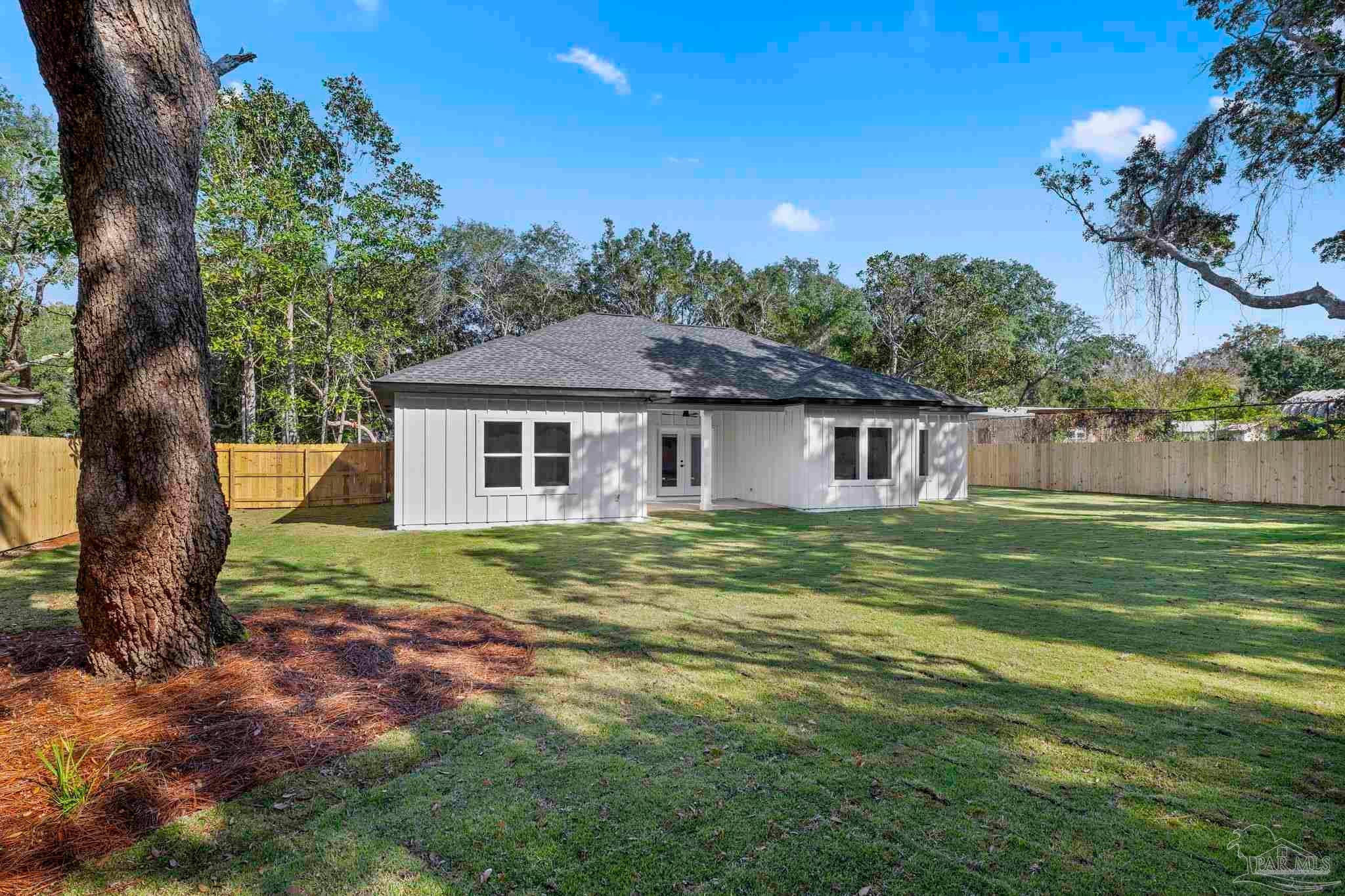 Set on a shaded street across from the bay, this custom-built 3-bedroom, 2-bath home offers an ideal mix of comfort and coastal charm. The open floor plan features a spacious living area centered around an electric fireplace, filled with natural light and complemented by upgraded luxury vinyl plank flooring and custom lighting throughout. The kitchen includes quartz countertops, custom cabinetry, stainless steel appliances, and a gas range. The primary suite provides a relaxing retreat with dual walk-in closets, a soaking tub, separate tiled shower, and double vanities. Two additional bedrooms and a full guest bath offer plenty of room for family or visitors. A large laundry room with built-in cabinetry and desk space adds functionality, while the oversized two-car garage provides ample storage. Outside, the home features a covered front porch and a covered back patio overlooking a fenced backyard with upgraded Zoysia grass and plenty of space to add a pool. Ideally located near shopping, dining, and the area’s sugar-white beaches, this home combines thoughtful design with the best of Gulf Breeze living.