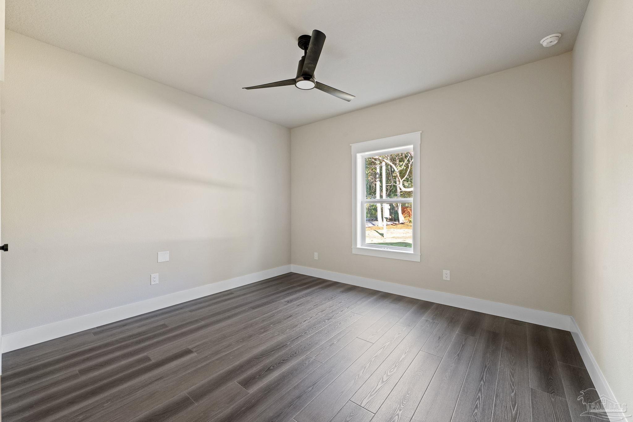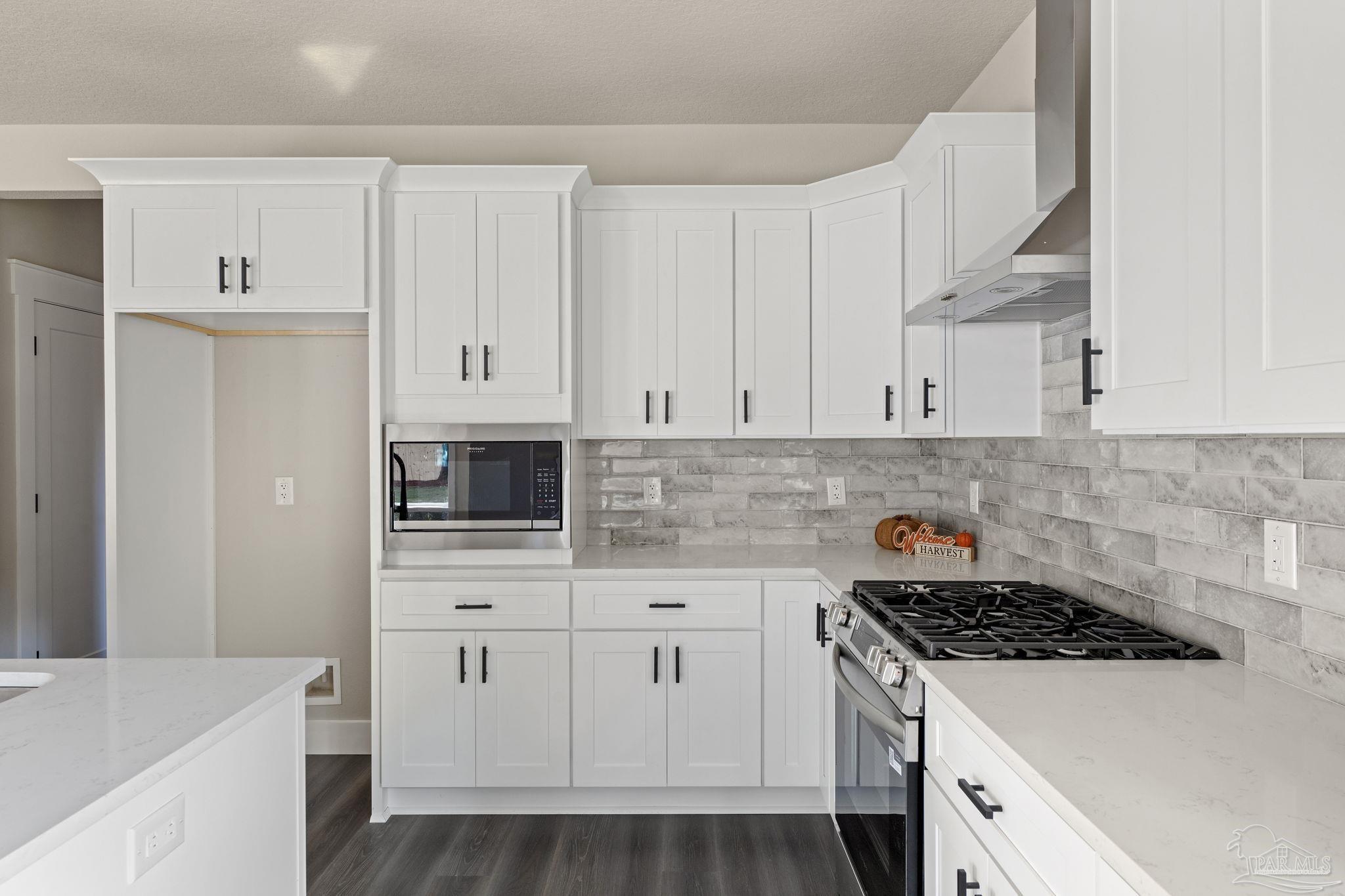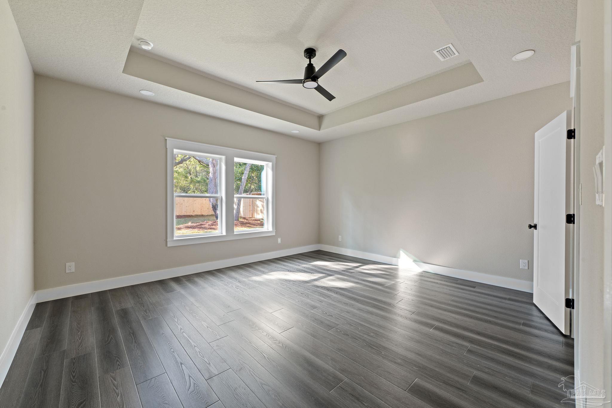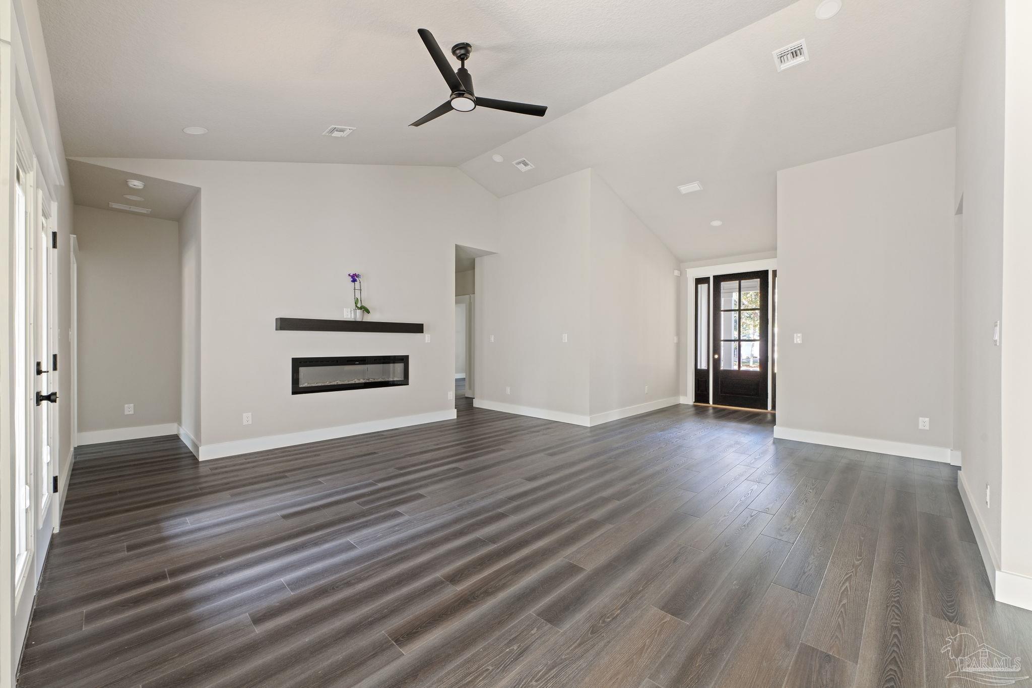 Set on a shaded street across from the bay, this custom-built 3-bedroom, 2-bath home offers an ideal mix of comfort and coastal charm. The open floor plan features a spacious living area centered around an electric fireplace, filled with natural light and complemented by upgraded luxury vinyl plank flooring and custom lighting throughout. The kitchen includes quartz countertops, custom cabinetry, stainless steel appliances, and a gas range. The primary suite provides a relaxing retreat with dual walk-in closets, a soaking tub, separate tiled shower, and double vanities. Two additional bedrooms and a full guest bath offer plenty of room for family or visitors. A large laundry room with built-in cabinetry and desk space adds functionality, while the oversized two-car garage provides ample storage. Outside, the home features a covered front porch and a covered back patio overlooking a fenced backyard with upgraded Zoysia grass and plenty of space to add a pool. Ideally located near shopping, dining, and the area’s sugar-white beaches, this home combines thoughtful design with the best of Gulf Breeze living.