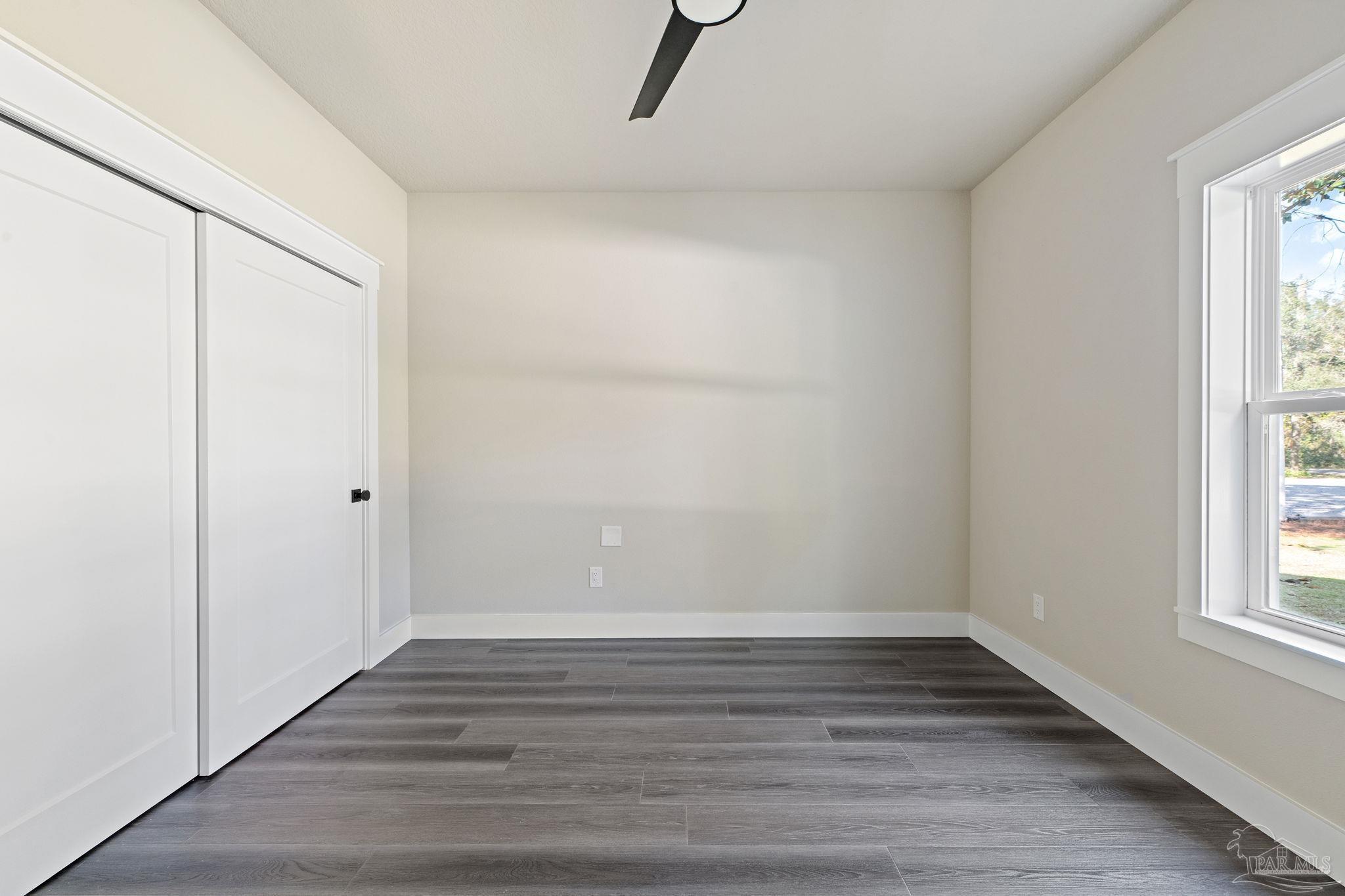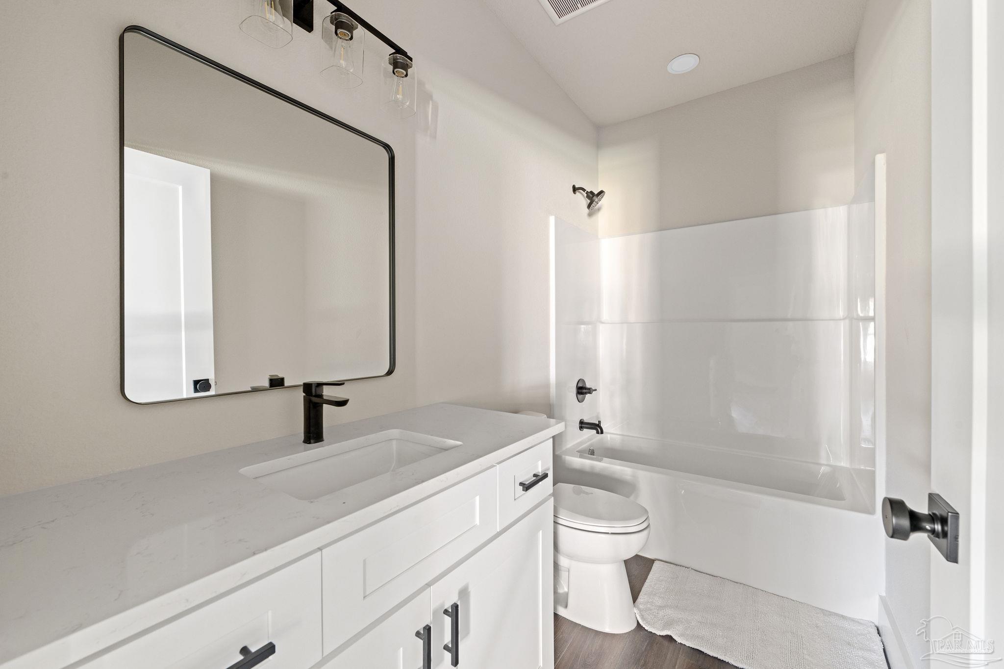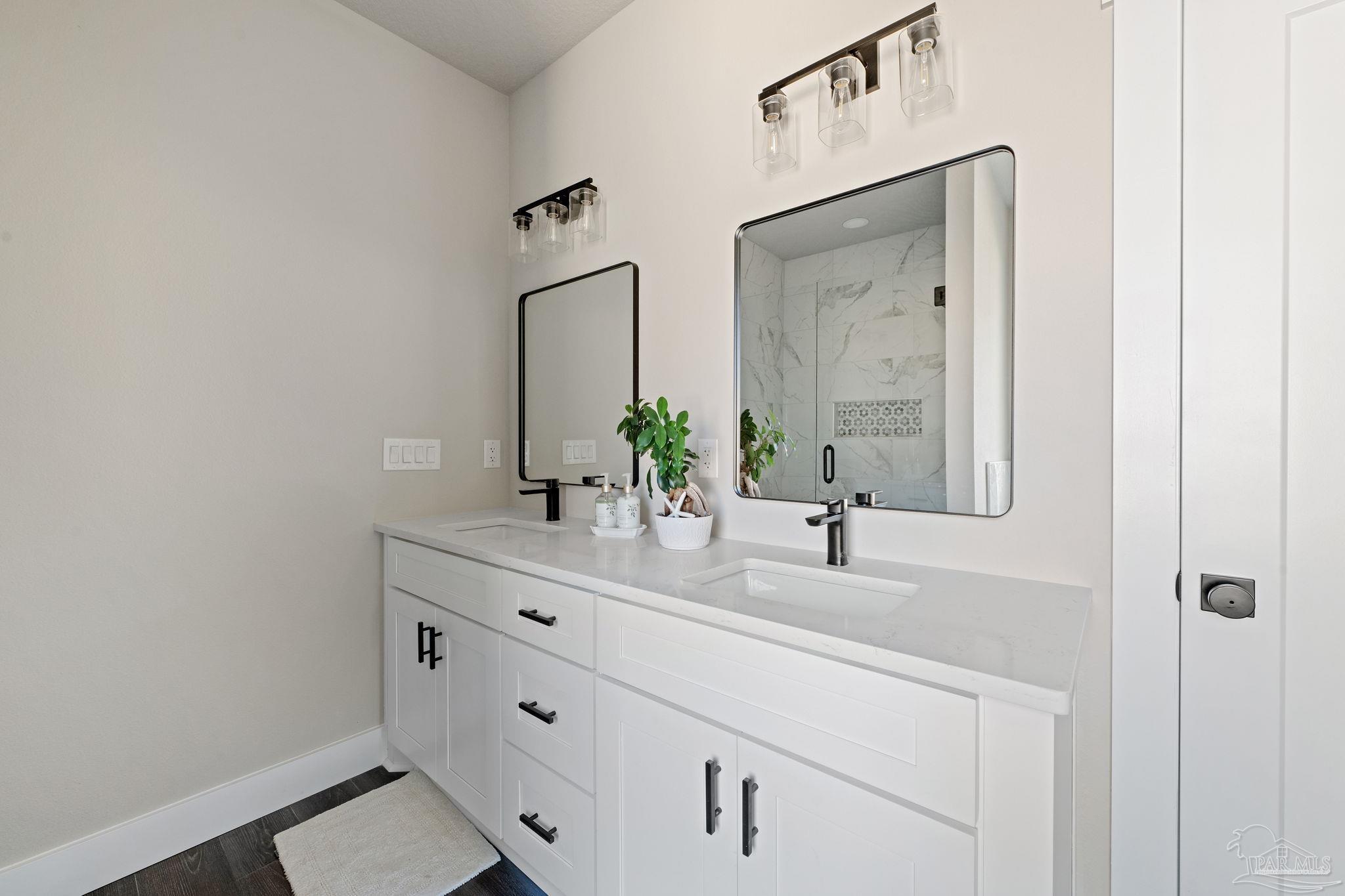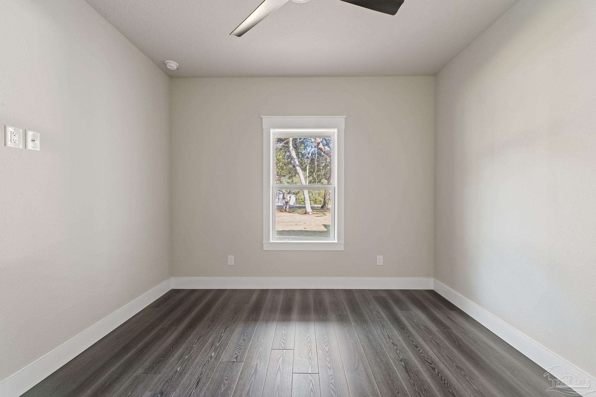 Set on a shaded street across from the bay, this custom-built 3-bedroom, 2-bath home offers an ideal mix of comfort and coastal charm. The open floor plan features a spacious living area centered around an electric fireplace, filled with natural light and complemented by upgraded luxury vinyl plank flooring and custom lighting throughout. The kitchen includes quartz countertops, custom cabinetry, stainless steel appliances, and a gas range. The primary suite provides a relaxing retreat with dual walk-in closets, a soaking tub, separate tiled shower, and double vanities. Two additional bedrooms and a full guest bath offer plenty of room for family or visitors. A large laundry room with built-in cabinetry and desk space adds functionality, while the oversized two-car garage provides ample storage. Outside, the home features a covered front porch and a covered back patio overlooking a fenced backyard with upgraded Zoysia grass and plenty of space to add a pool. Ideally located near shopping, dining, and the area’s sugar-white beaches, this home combines thoughtful design with the best of Gulf Breeze living.