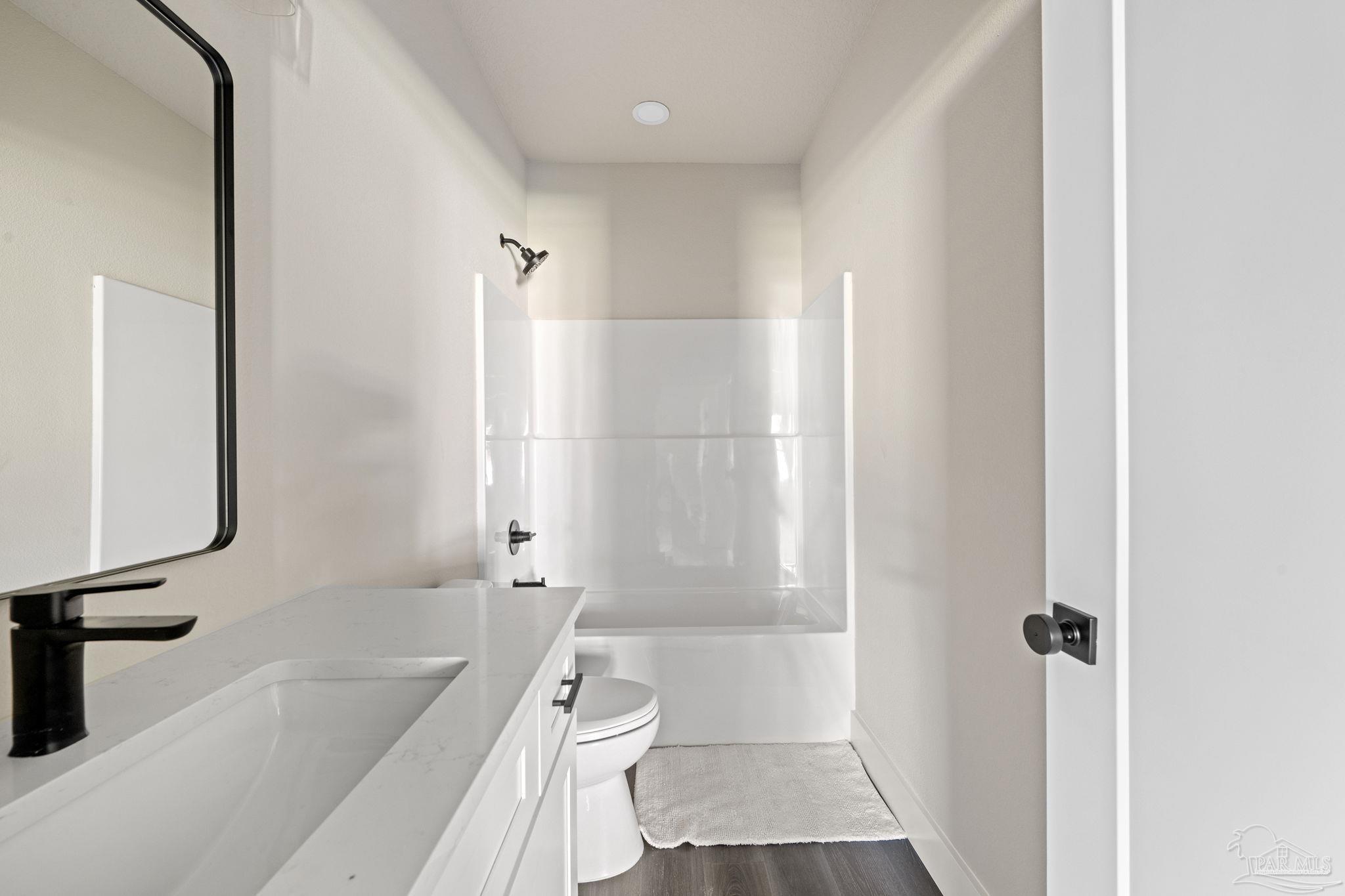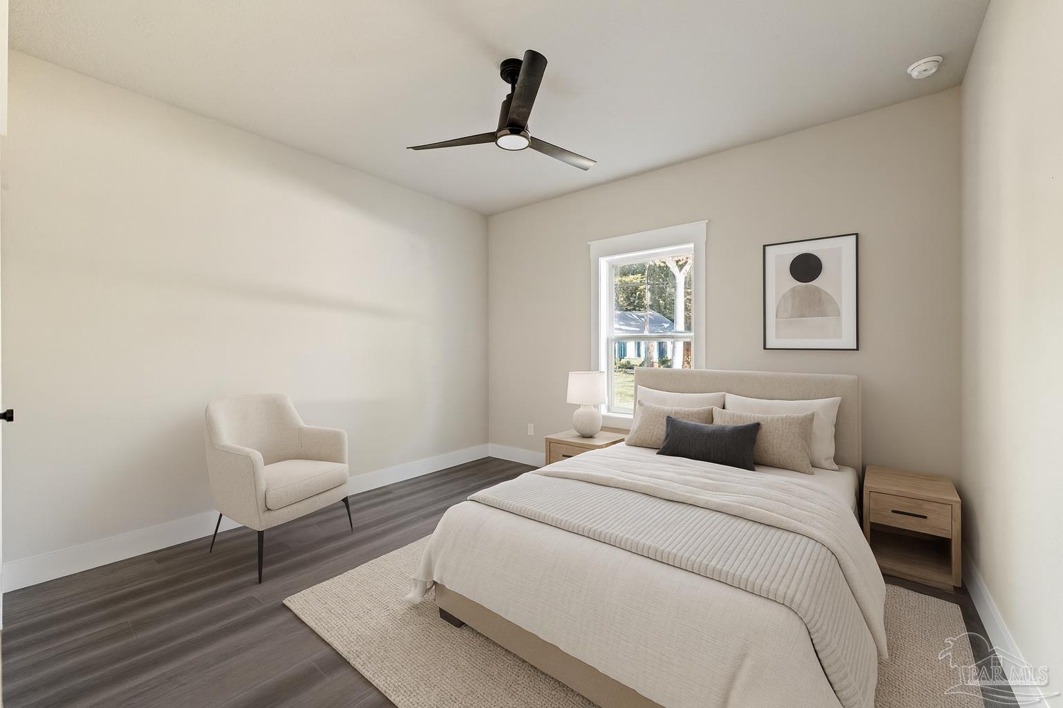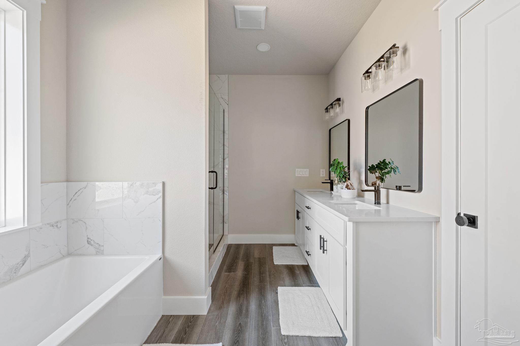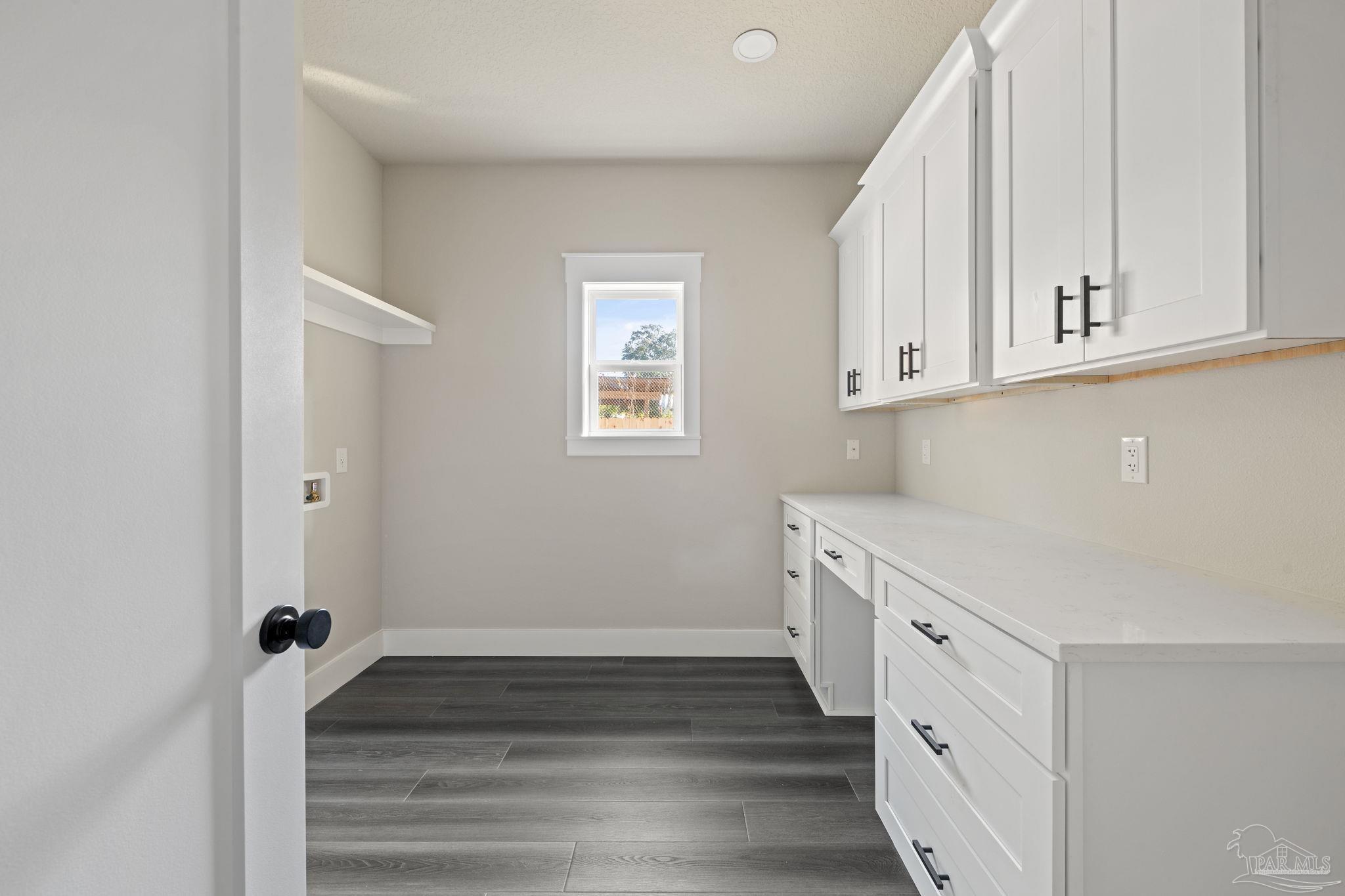 Set on a shaded street across from the bay, this custom-built 3-bedroom, 2-bath home offers an ideal mix of comfort and coastal charm. The open floor plan features a spacious living area centered around an electric fireplace, filled with natural light and complemented by upgraded luxury vinyl plank flooring and custom lighting throughout. The kitchen includes quartz countertops, custom cabinetry, stainless steel appliances, and a gas range. The primary suite provides a relaxing retreat with dual walk-in closets, a soaking tub, separate tiled shower, and double vanities. Two additional bedrooms and a full guest bath offer plenty of room for family or visitors. A large laundry room with built-in cabinetry and desk space adds functionality, while the oversized two-car garage provides ample storage. Outside, the home features a covered front porch and a covered back patio overlooking a fenced backyard with upgraded Zoysia grass and plenty of space to add a pool. Ideally located near shopping, dining, and the area’s sugar-white beaches, this home combines thoughtful design with the best of Gulf Breeze living.