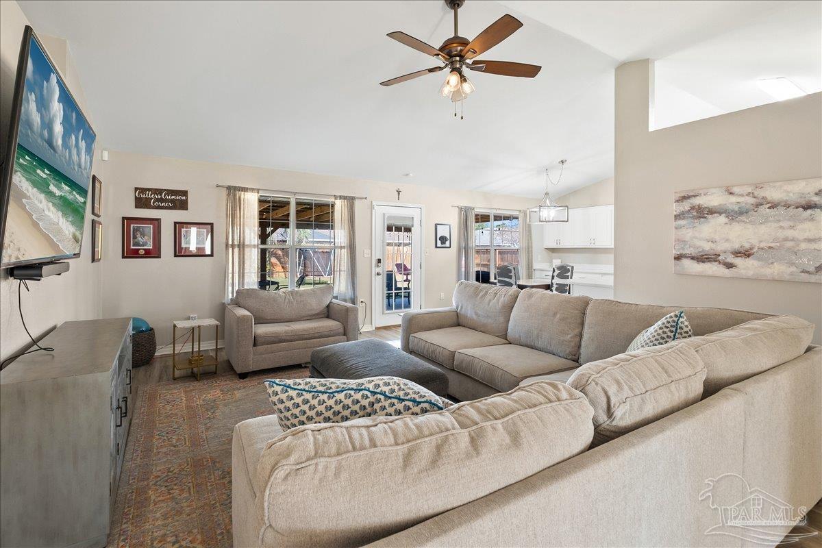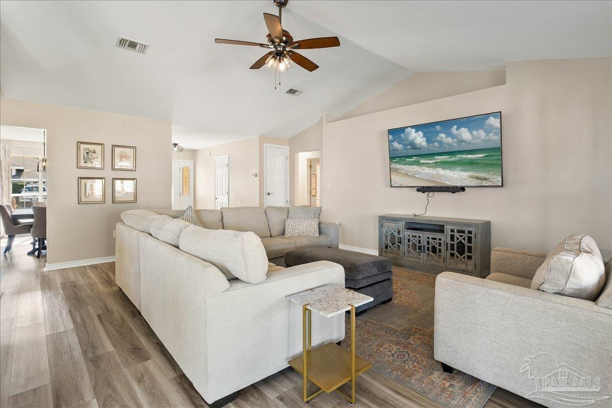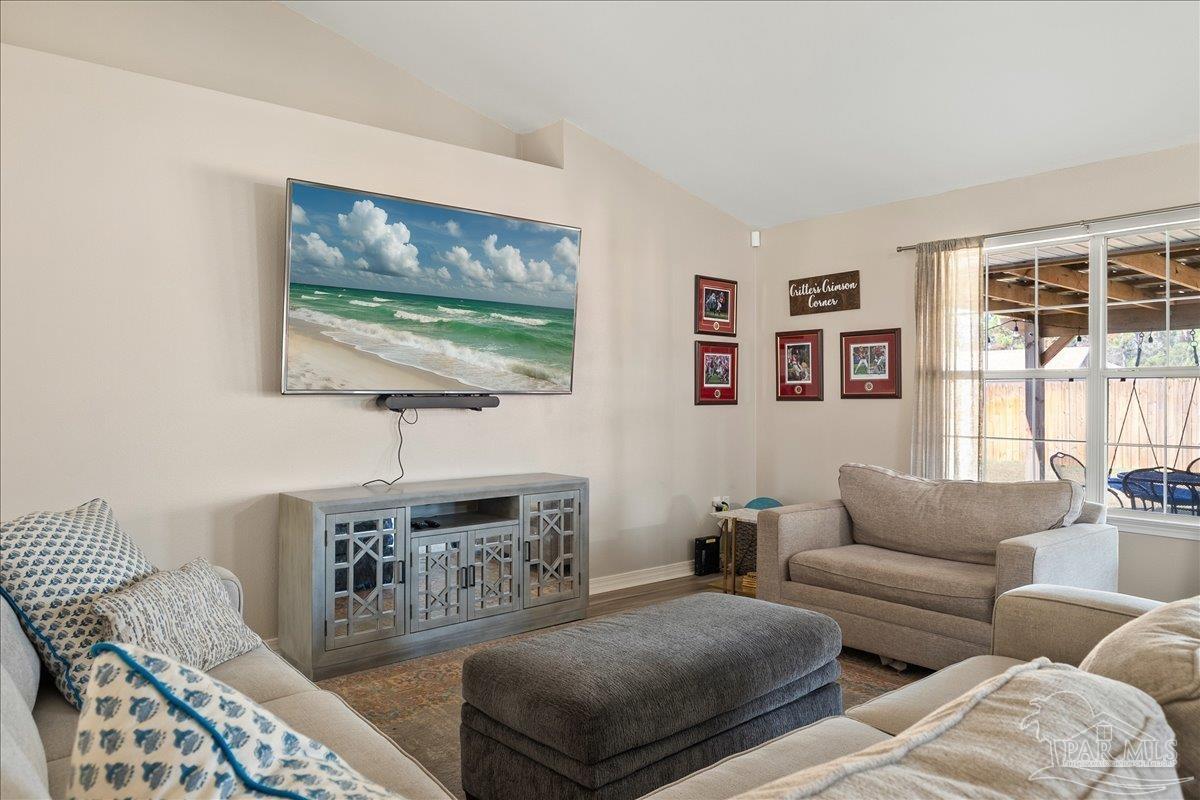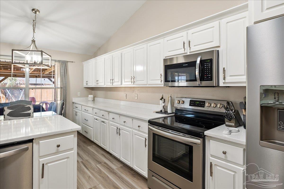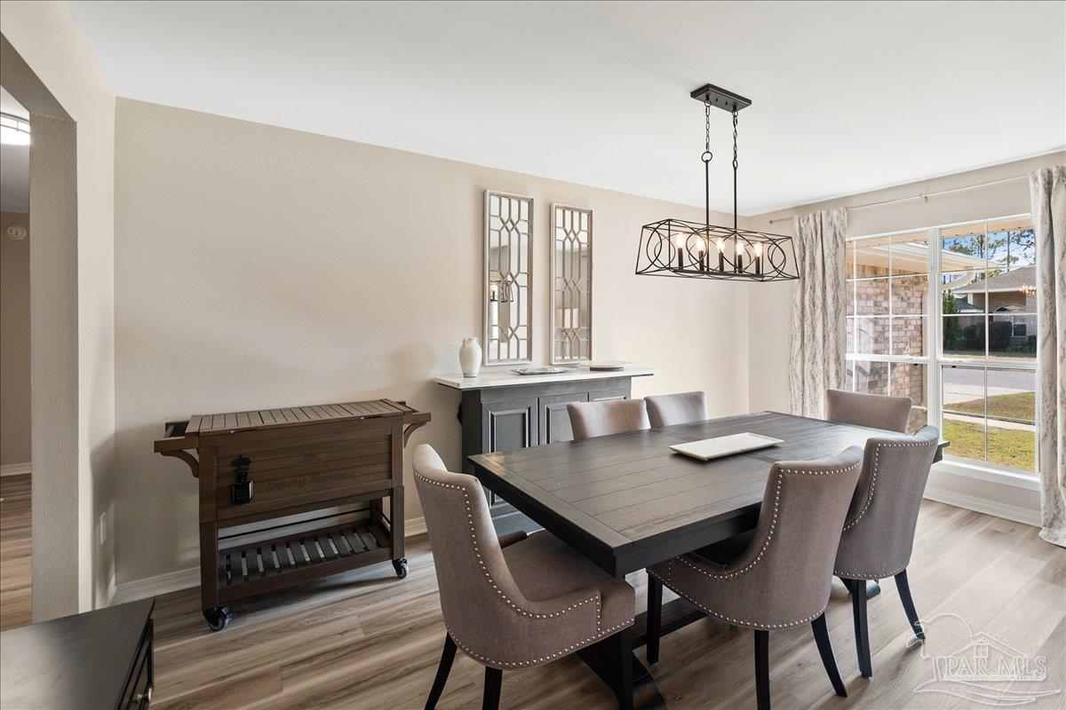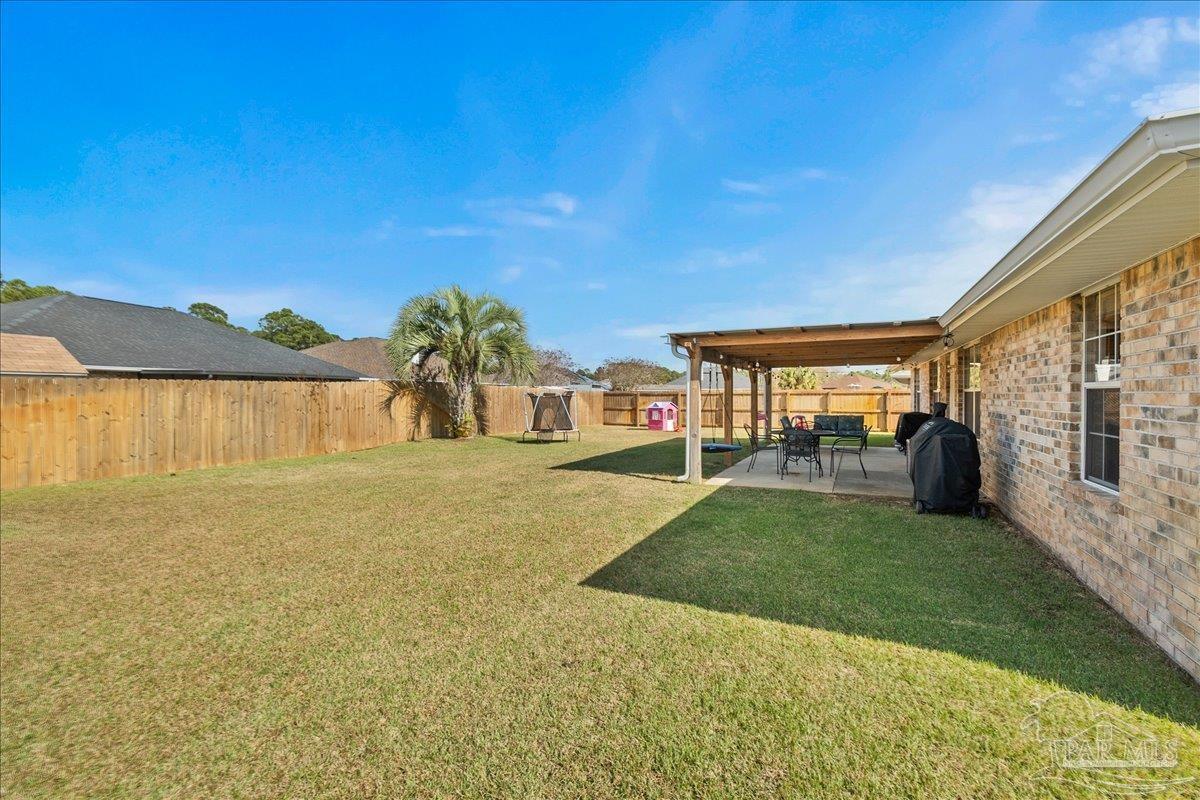 Beautifully Updated East Navarre Home! This all-brick 4-bedroom, 3 bath home features a fenced yard and a lengthy list of 2024 upgrades, including a brand-new roof and renovated kitchen. Luxury vinyl plank flooring extends throughout the main living areas and guest bedrooms for a clean, modern look. The renovated kitchen shines with new quartz countertops, an extended quartz-top buffet cabinet, breakfast bar, new sink and faucet, and newer stainless appliances—including the refrigerator. A pantry adds even more storage. The great room boasts a high cathedral ceiling and has access to the covered patio. A separate dining room offers space for either formal or casual meals. The generous primary suite features a bath with double vanity, garden tub, separate shower, and walk-in closet. Two guest bedrooms share a convenient Jack-and-Jill bath, while the fourth bedroom is adjacent to a full guest bath. Outside, enjoy a large patio and fully fenced yard—perfect for family activities. Additional features include 2024 gutters and downspouts, 2022 Hvac,2021 water heater, 2021 stainless appliances, irrigation system with well, and updated lighting throughout. Newly deep-cleaned and pressure-washed, this home is truly move-in ready. Located close to military bases, shopping, schools, and the sugar-sand beaches and turquoise waters of the Gulf of America, this is an exceptional opportunity to have everything done for you—just turn the key, move in, and head to the beach!