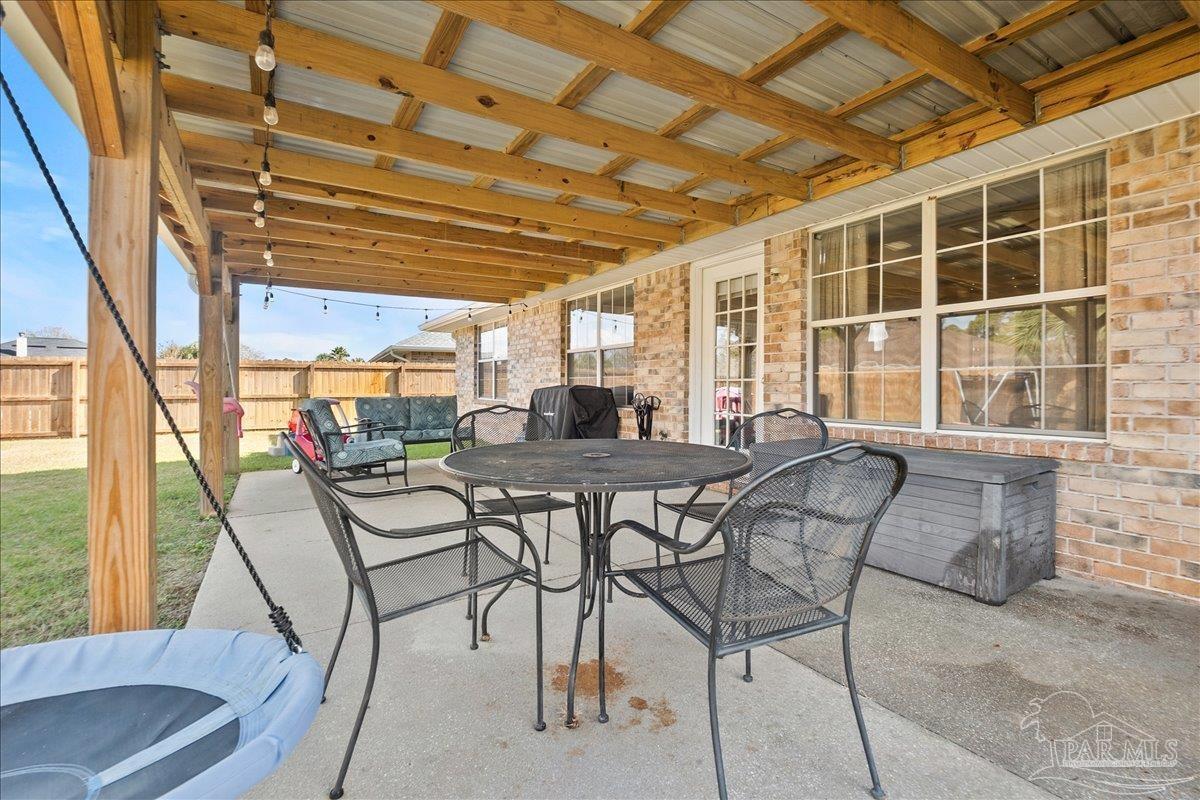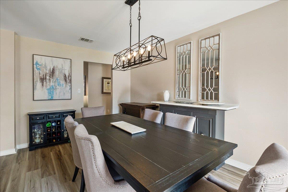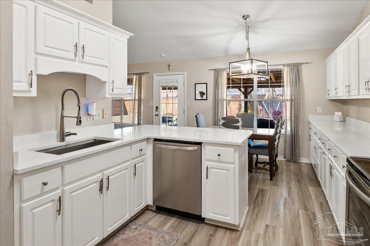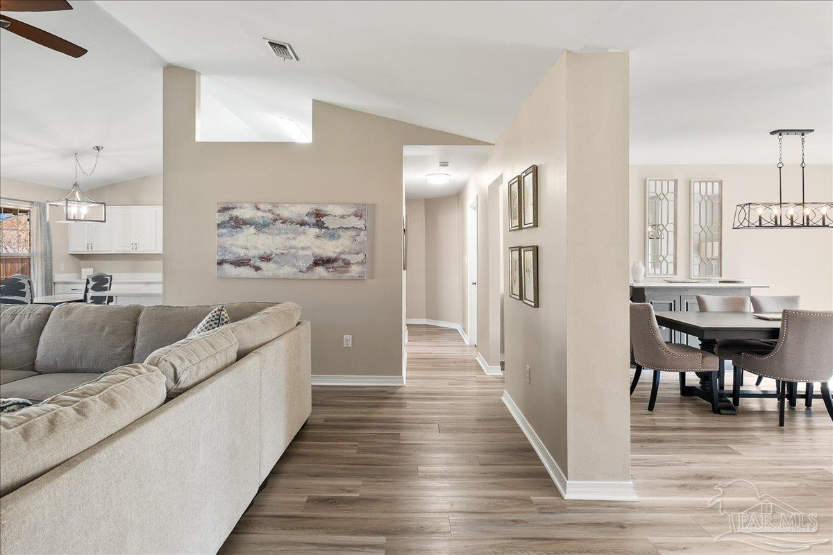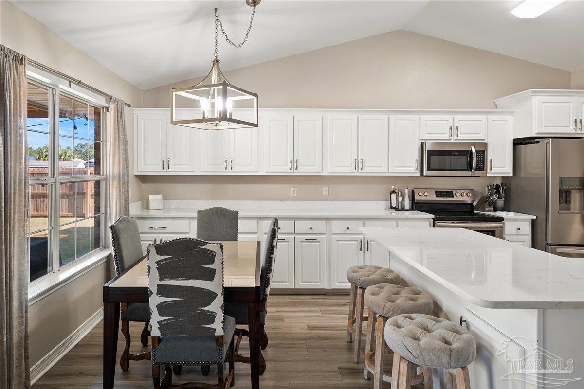 Beautifully Updated East Navarre Home! This all-brick 4-bedroom, 3 bath home features a fenced yard and a lengthy list of 2024 upgrades, including a brand-new roof and renovated kitchen. Luxury vinyl plank flooring extends throughout the main living areas and guest bedrooms for a clean, modern look. The renovated kitchen shines with new quartz countertops, an extended quartz-top buffet cabinet, breakfast bar, new sink and faucet, and newer stainless appliances—including the refrigerator. A pantry adds even more storage. The great room boasts a high cathedral ceiling and has access to the covered patio. A separate dining room offers space for either formal or casual meals. The generous primary suite features a bath with double vanity, garden tub, separate shower, and walk-in closet. Two guest bedrooms share a convenient Jack-and-Jill bath, while the fourth bedroom is adjacent to a full guest bath. Outside, enjoy a large patio and fully fenced yard—perfect for family activities. Additional features include 2024 gutters and downspouts, 2022 Hvac,2021 water heater, 2021 stainless appliances, irrigation system with well, and updated lighting throughout. Newly deep-cleaned and pressure-washed, this home is truly move-in ready. Located close to military bases, shopping, schools, and the sugar-sand beaches and turquoise waters of the Gulf of America, this is an exceptional opportunity to have everything done for you—just turn the key, move in, and head to the beach!