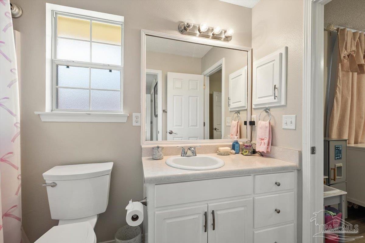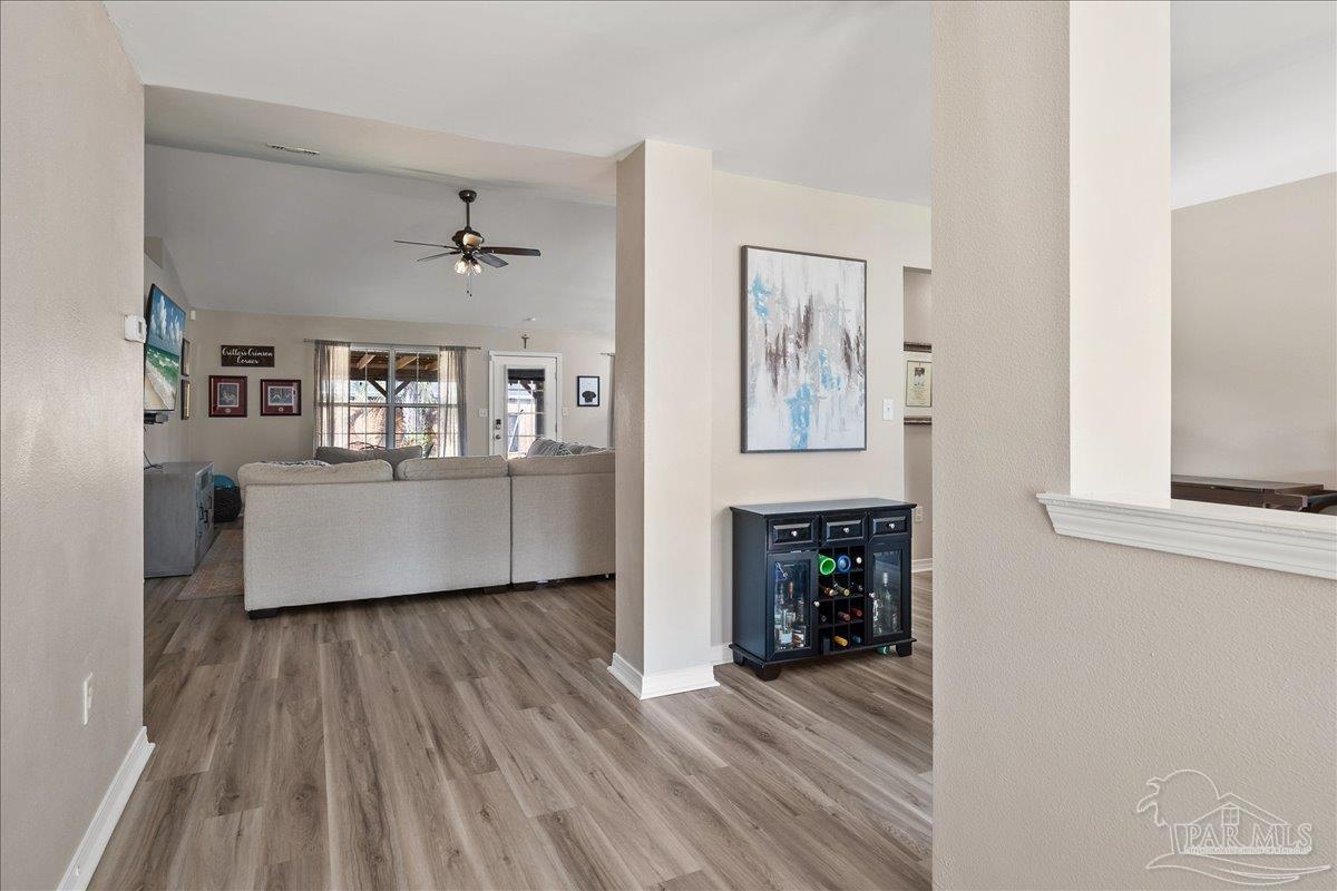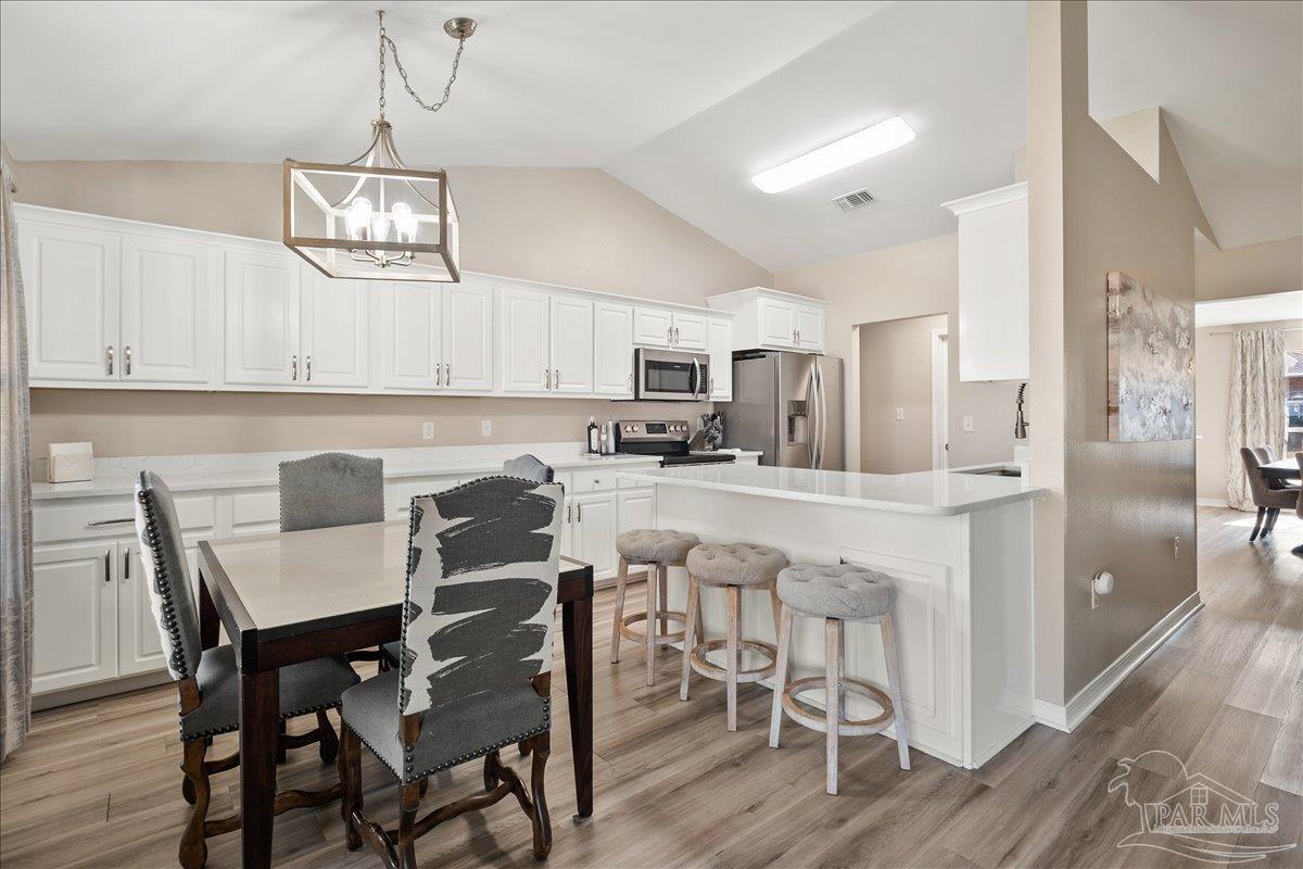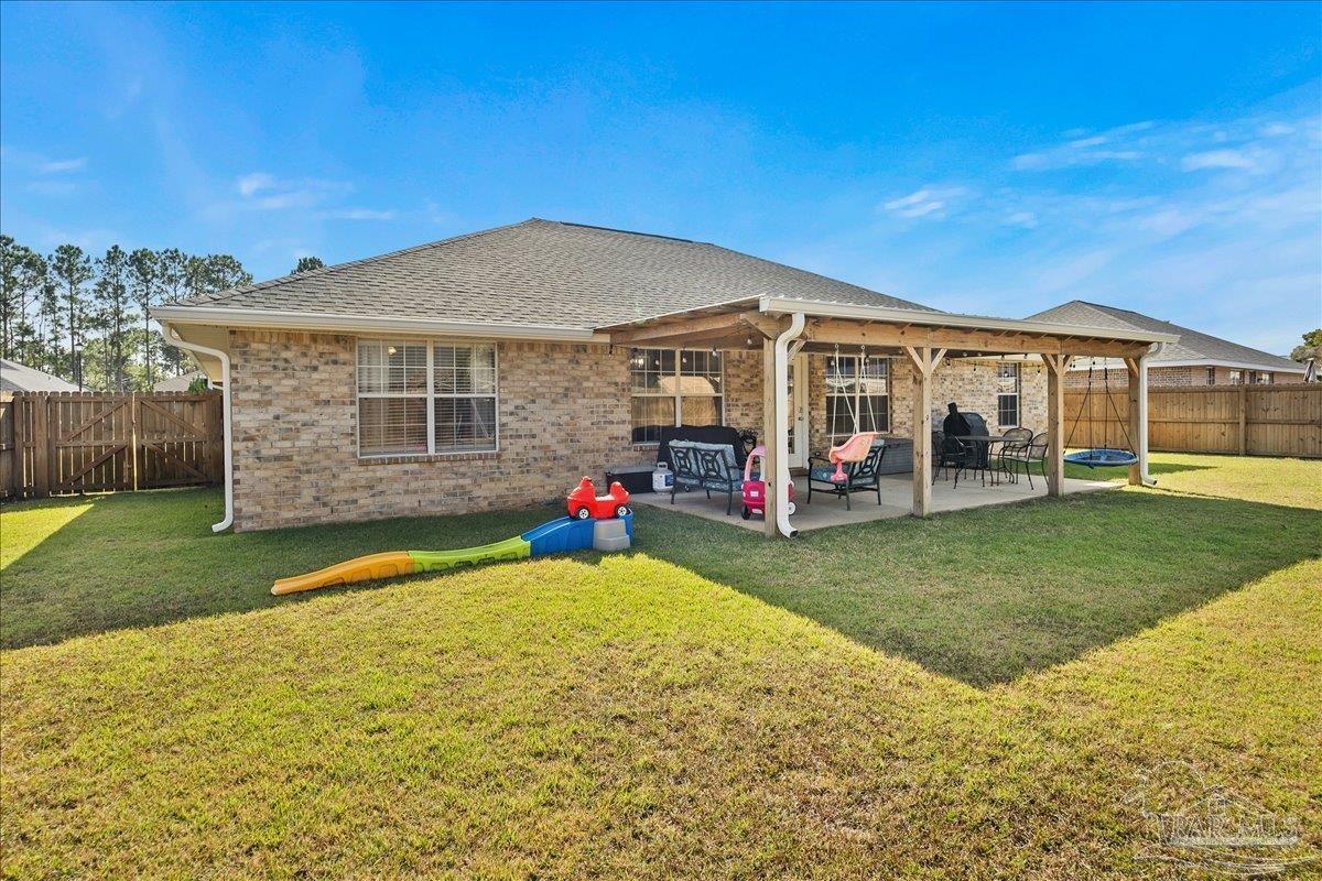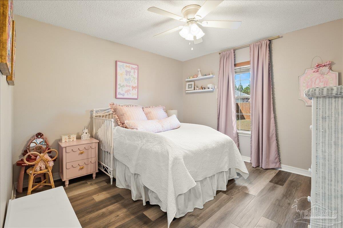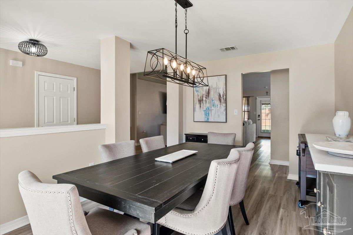 Beautifully Updated East Navarre Home! This all-brick 4-bedroom, 3 bath home features a fenced yard and a lengthy list of 2024 upgrades, including a brand-new roof and renovated kitchen. Luxury vinyl plank flooring extends throughout the main living areas and guest bedrooms for a clean, modern look. The renovated kitchen shines with new quartz countertops, an extended quartz-top buffet cabinet, breakfast bar, new sink and faucet, and newer stainless appliances—including the refrigerator. A pantry adds even more storage. The great room boasts a high cathedral ceiling and has access to the covered patio. A separate dining room offers space for either formal or casual meals. The generous primary suite features a bath with double vanity, garden tub, separate shower, and walk-in closet. Two guest bedrooms share a convenient Jack-and-Jill bath, while the fourth bedroom is adjacent to a full guest bath. Outside, enjoy a large patio and fully fenced yard—perfect for family activities. Additional features include 2024 gutters and downspouts, 2022 Hvac,2021 water heater, 2021 stainless appliances, irrigation system with well, and updated lighting throughout. Newly deep-cleaned and pressure-washed, this home is truly move-in ready. Located close to military bases, shopping, schools, and the sugar-sand beaches and turquoise waters of the Gulf of America, this is an exceptional opportunity to have everything done for you—just turn the key, move in, and head to the beach!