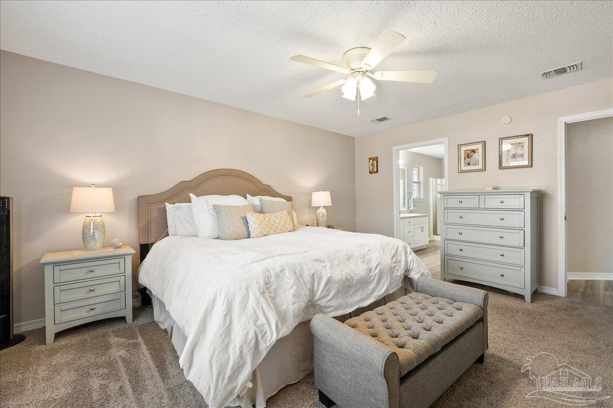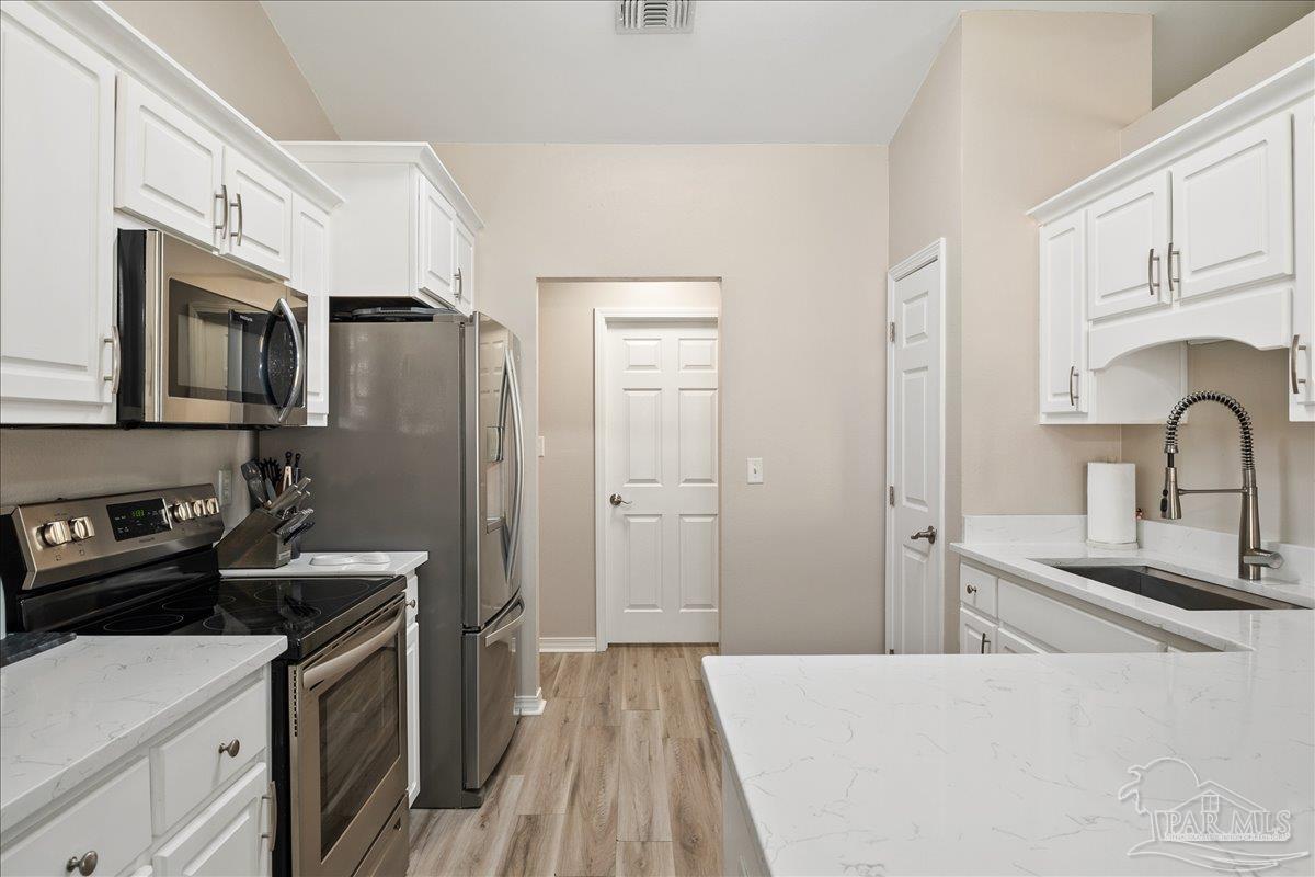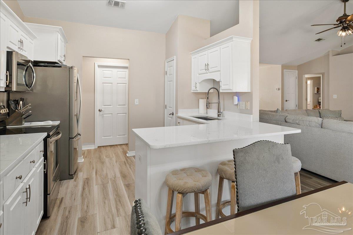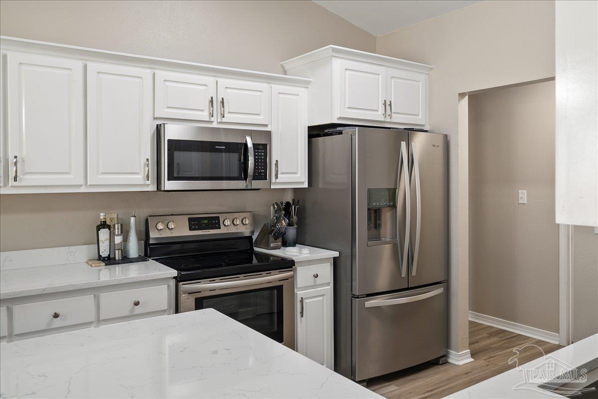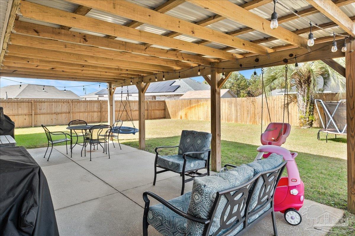 Beautifully Updated East Navarre Home! This all-brick 4-bedroom, 3 bath home features a fenced yard and a lengthy list of 2024 upgrades, including a brand-new roof and renovated kitchen. Luxury vinyl plank flooring extends throughout the main living areas and guest bedrooms for a clean, modern look. The renovated kitchen shines with new quartz countertops, an extended quartz-top buffet cabinet, breakfast bar, new sink and faucet, and newer stainless appliances—including the refrigerator. A pantry adds even more storage. The great room boasts a high cathedral ceiling and has access to the covered patio. A separate dining room offers space for either formal or casual meals. The generous primary suite features a bath with double vanity, garden tub, separate shower, and walk-in closet. Two guest bedrooms share a convenient Jack-and-Jill bath, while the fourth bedroom is adjacent to a full guest bath. Outside, enjoy a large patio and fully fenced yard—perfect for family activities. Additional features include 2024 gutters and downspouts, 2022 Hvac,2021 water heater, 2021 stainless appliances, irrigation system with well, and updated lighting throughout. Newly deep-cleaned and pressure-washed, this home is truly move-in ready. Located close to military bases, shopping, schools, and the sugar-sand beaches and turquoise waters of the Gulf of America, this is an exceptional opportunity to have everything done for you—just turn the key, move in, and head to the beach!