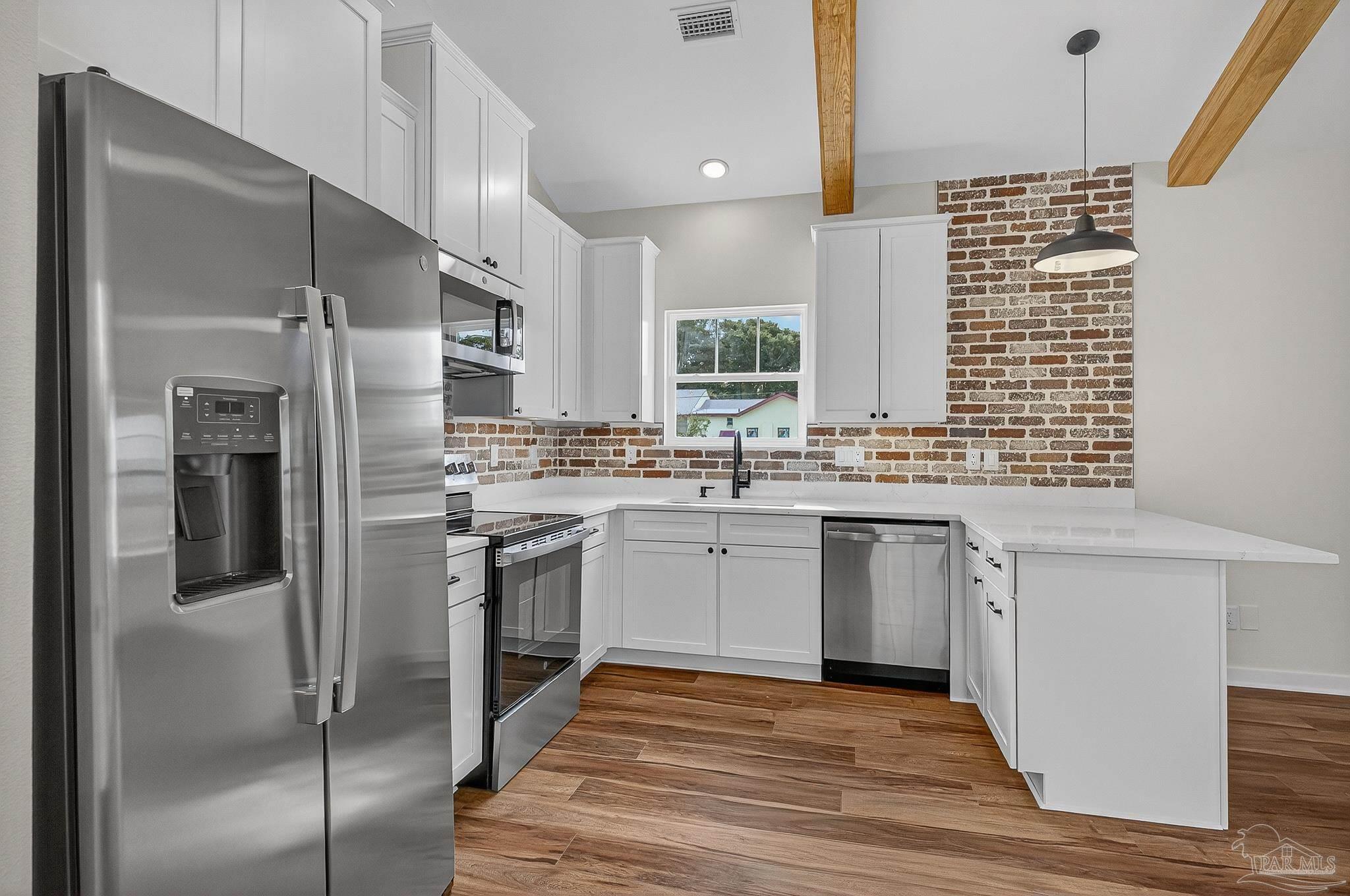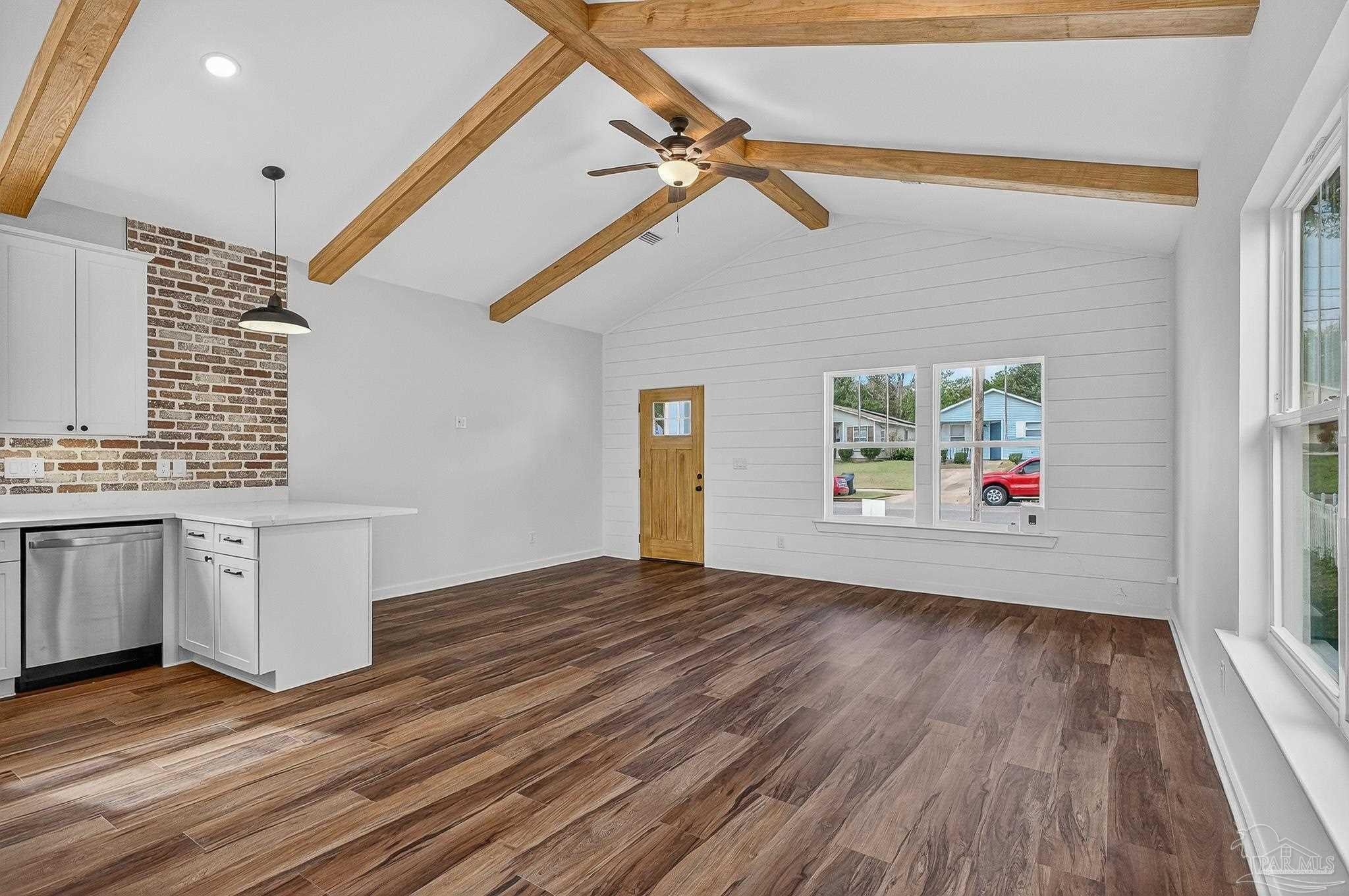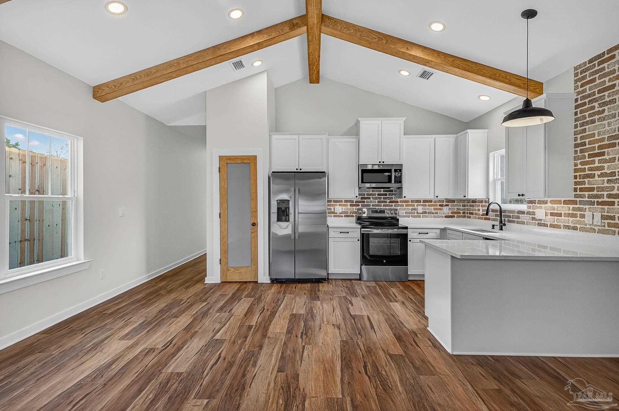 Welcome to this beautifully crafted custom 1,330 sq/ft new build—where modern finishes meet classic Southern charm. This 3 bedroom, 2 bathroom home offers an inviting open-concept layout highlighted by wood ceiling beams and gorgeous LVP flooring throughout. The kitchen is a true showpiece with quartz countertops, a spacious island, under-cabinet lighting, and sleek stainless-steel touches—perfect for both everyday living and entertaining. The living room features charming shiplap accents, adding warmth and character to the space. Retreat to a serene primary suite complete with a tiled walk-in shower, while both bathrooms include beautiful shiplap detailing for a custom, elevated feel. Enjoy your mornings and evenings on either the front or back porch, offering peaceful spaces to relax. Located just minutes from downtown with no HOA, you’ll have the convenience you want and the freedom you deserve. This thoughtfully designed home blends style, comfort, and location—ready for you to move in and make it your own.