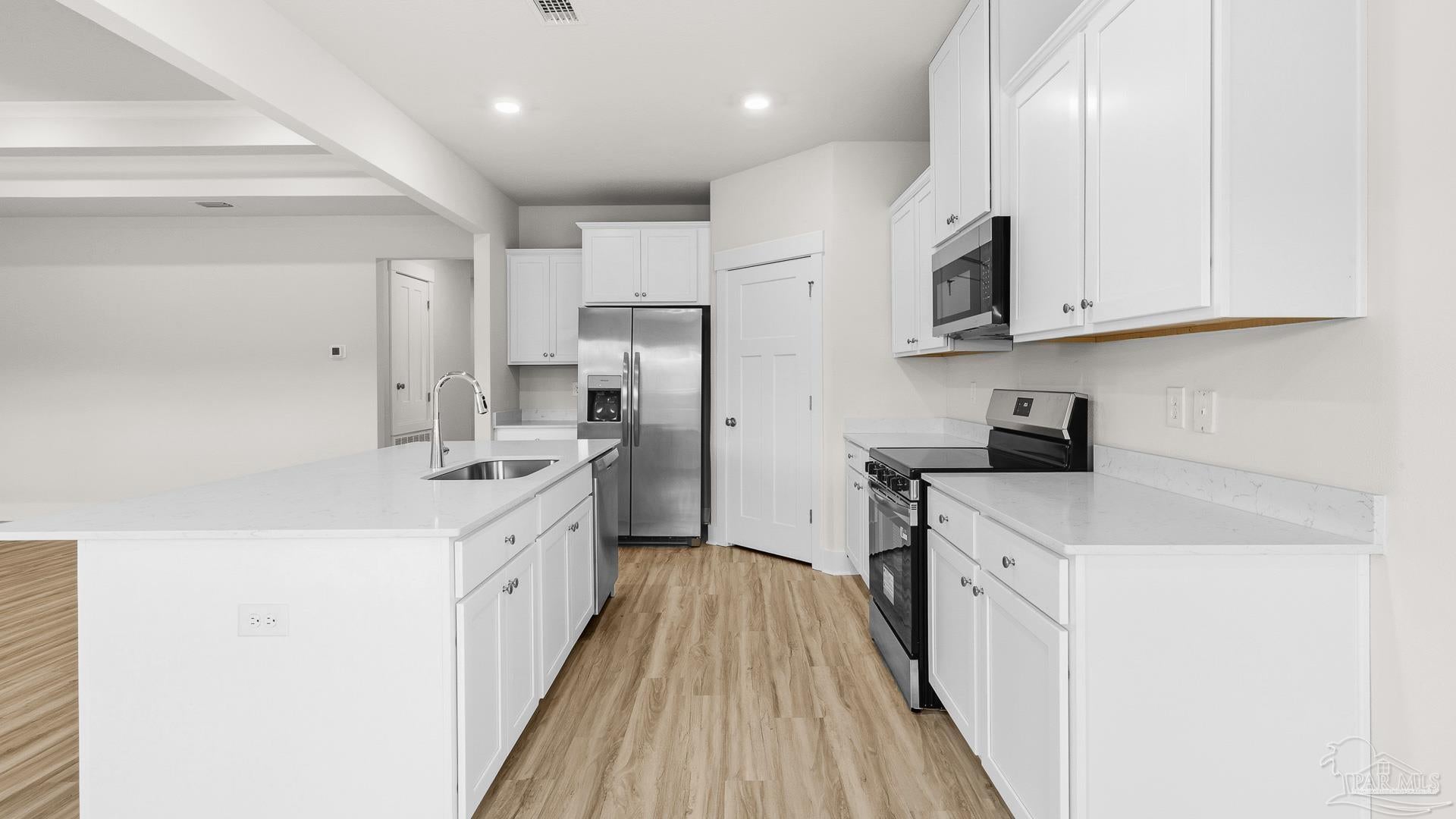 Welcome to the Madison Plan in the Grove at Berryhill community in Milton, FL! This 4-bedroom, 3-bath home offers just under 2,000 sq ft of thoughtfully designed space with tray ceilings and a bright, open layout. The kitchen features quartz countertops, stainless steel appliances, and a central island that flows into the spacious living and dining areas—perfect for entertaining. The private primary suite offers a luxurious retreat with a soaking tub, walk-in shower, double vanity, and generous walk-in closet. Two front bedrooms share a full bath, while a separate fourth bedroom with its own ensuite provides the perfect setup for guests or a home office. Additional highlights include a 3-car garage, a dedicated laundry room with storage, and covered back patio. Situated in a quiet, family-friendly neighborhood, the Grove at Berryhill offers easy access to local schools, parks, and all the charm of downtown Milton.