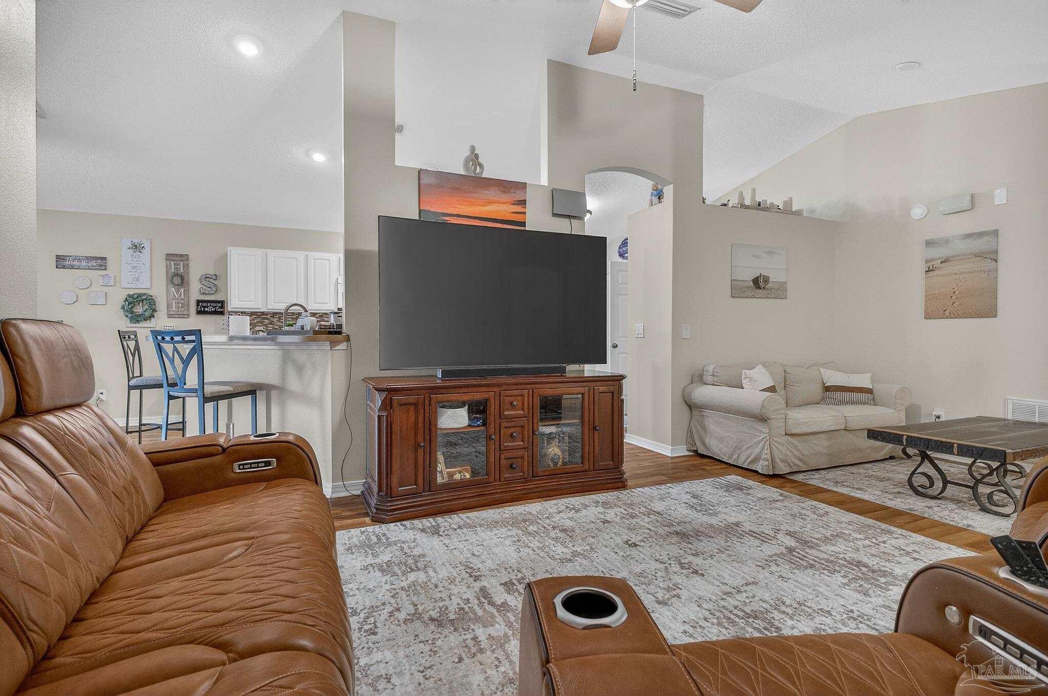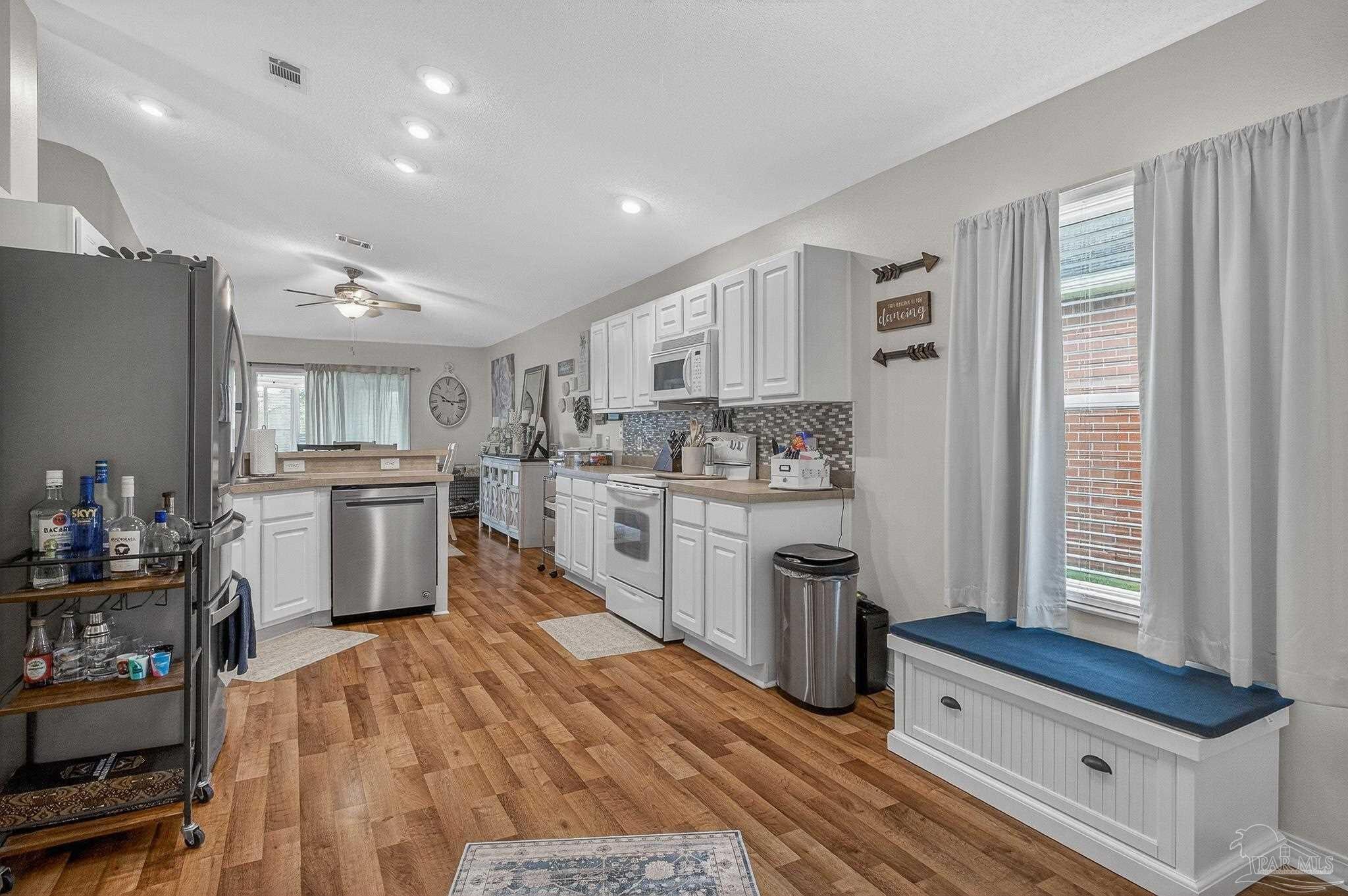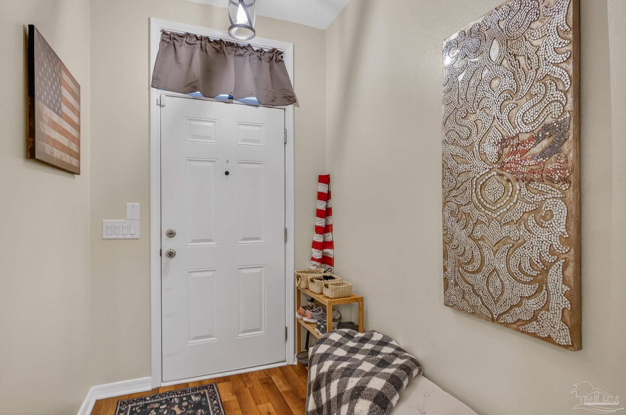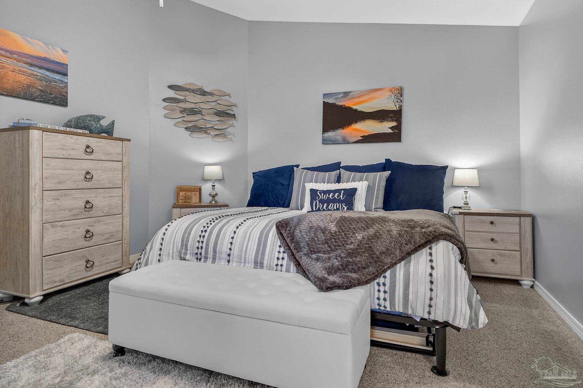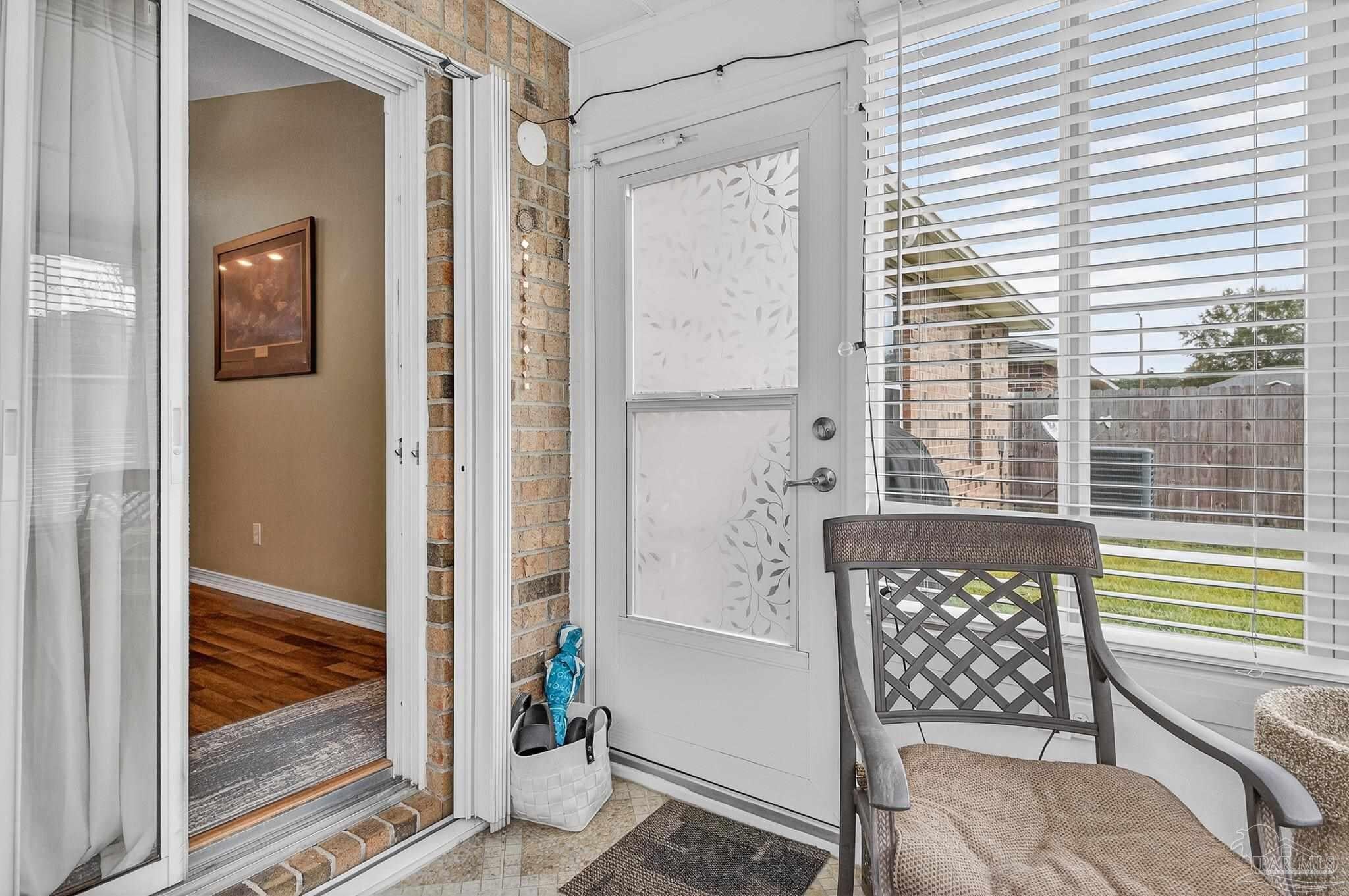Come experience the charm of Tiburon West, conveniently located off Pace Patriot Boulevard in Pace, Florida, between Jernigan Road and Chumuckla Highway. This home is close to the Pace Fire District, Library, Pace High School, and S.S. Dixon Elementary School. As you step onto the slate-tiled covered porch, you’ll be greeted by the wood flooring of the foyer, which flows throughout the main areas of the home. This three-bedroom, two-bathroom patio-style home with low-maintenance brick siding features an open concept and a split floor plan that offers privacy for everyone. The primary suite, with a private bathroom, walk-in closet, garden tub, and separate shower, is tucked away in the back. The additional bedrooms are off the living room, providing easy access to the guest bathroom. The living room features high ceilings, plant ledges, and cathedral ceilings, while the kitchen boasts a divided-sink with a pull-down faucet, breakfast bar, stainless steel appliances, and plenty of space to store all your kitchen gadgets in the abundant cabinets and large pantry. The formal dining room overlooks the sunroom and the kitchen. The sunroom offers an extended living area perfect for entertaining, reading, or simply relaxing. Other features include 2” white blinds, a sprinkler system, security system, a transfer switch for a portable generator, new windows in 2016, a fenced-in backyard, a low-maintenance yard, gutters, and hurricane shutters. Schedule your private tour today and discover what this home has to offer!